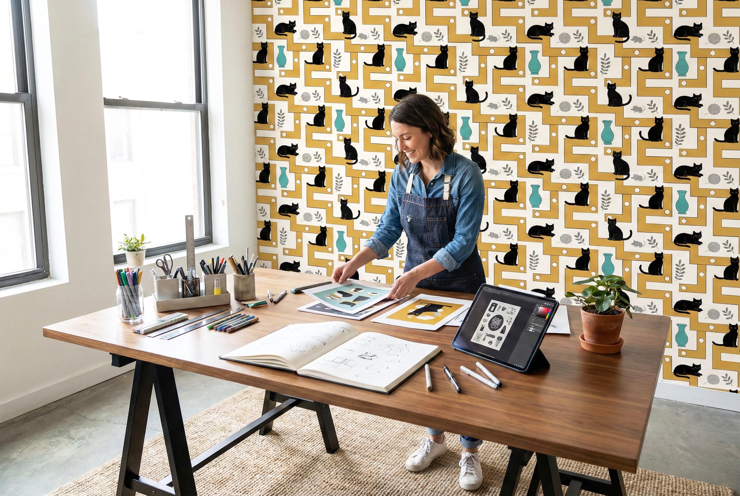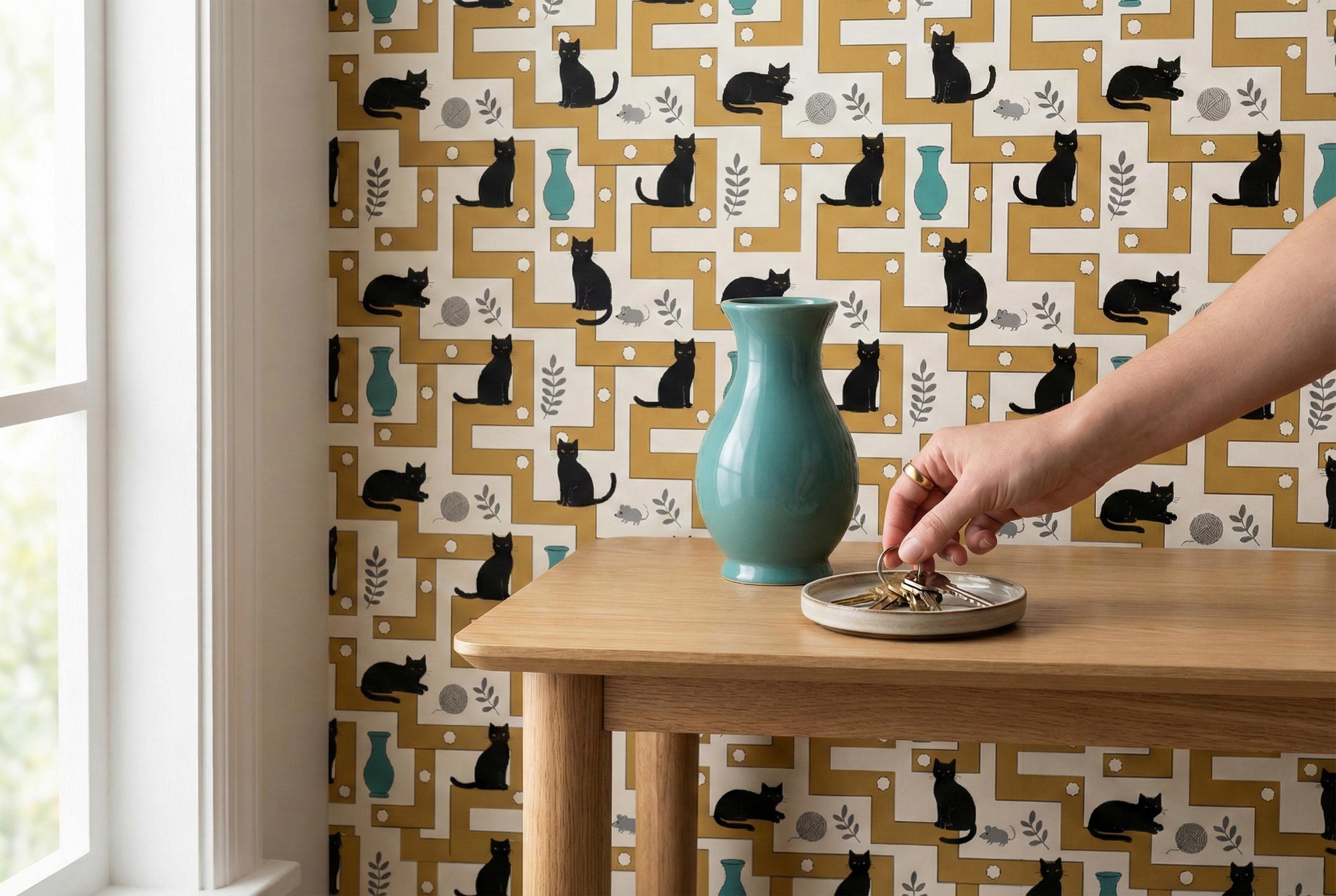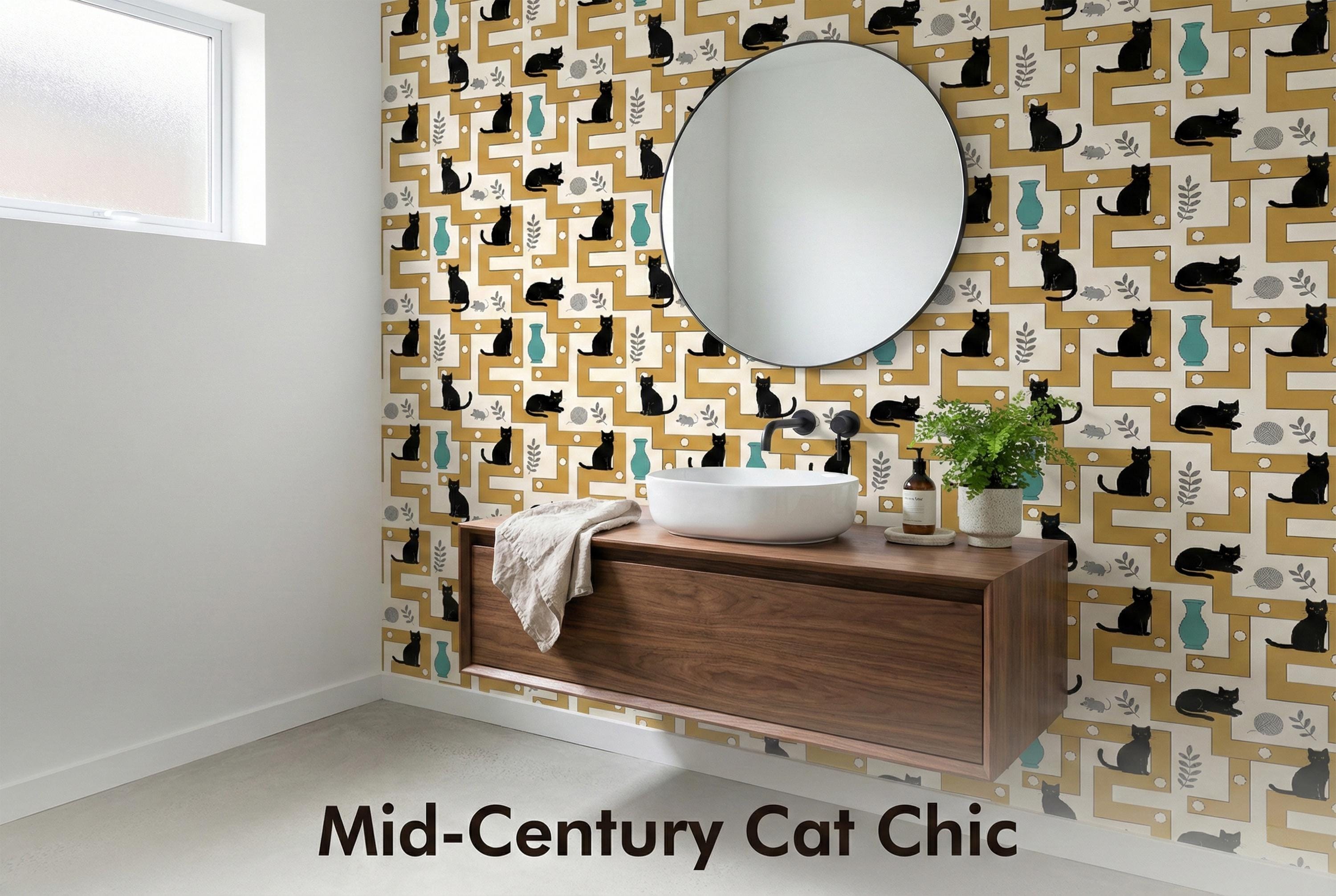 Redefine your interior with a sophisticated blend of mid-century geometry and playful charm. This premium wall mural features a labyrinth of warm mustard gold paths where sleek black cats lounge in effortless style. Complemented by deep teal accents and whimsical motifs, it’s the perfect balance of professional polish and artistic personality.