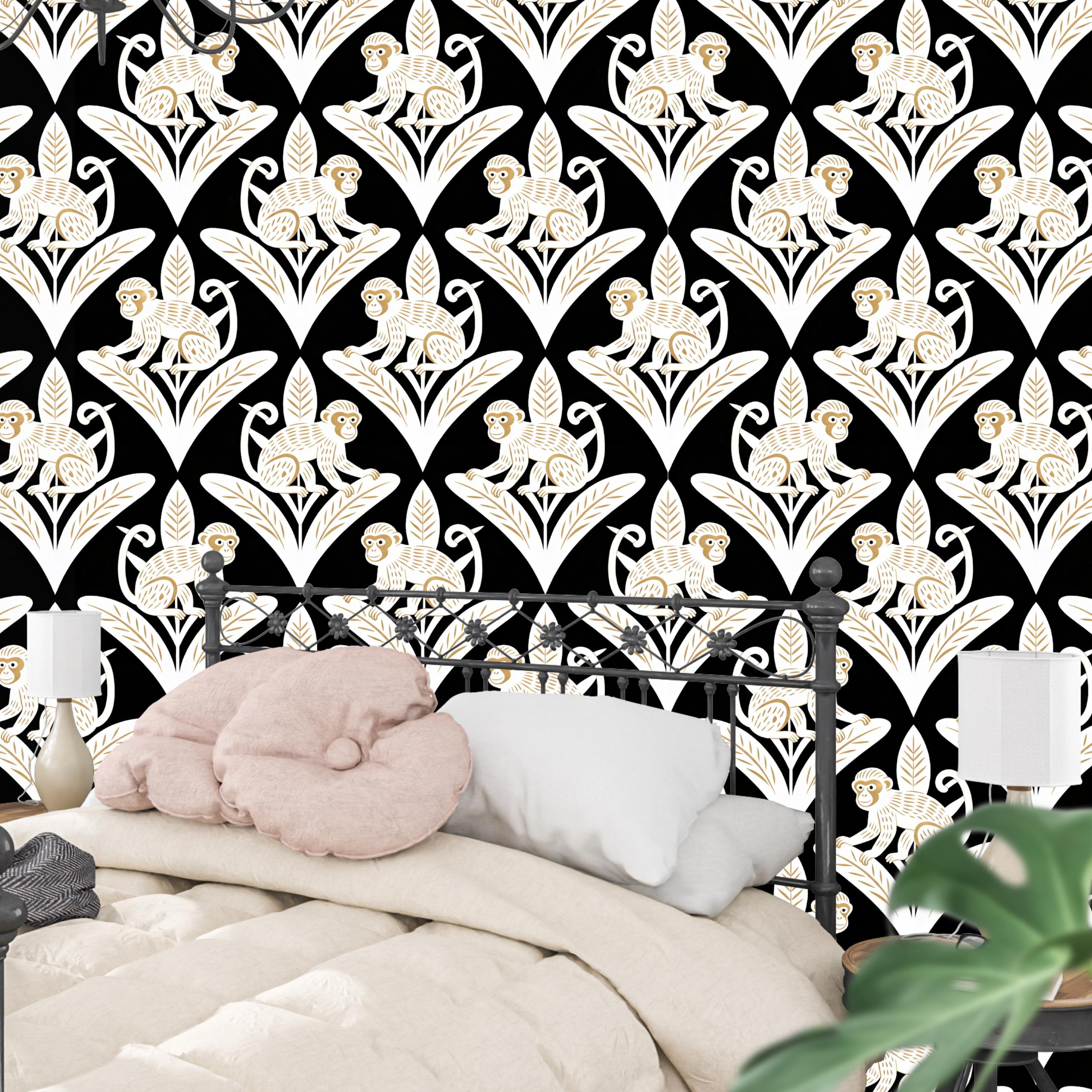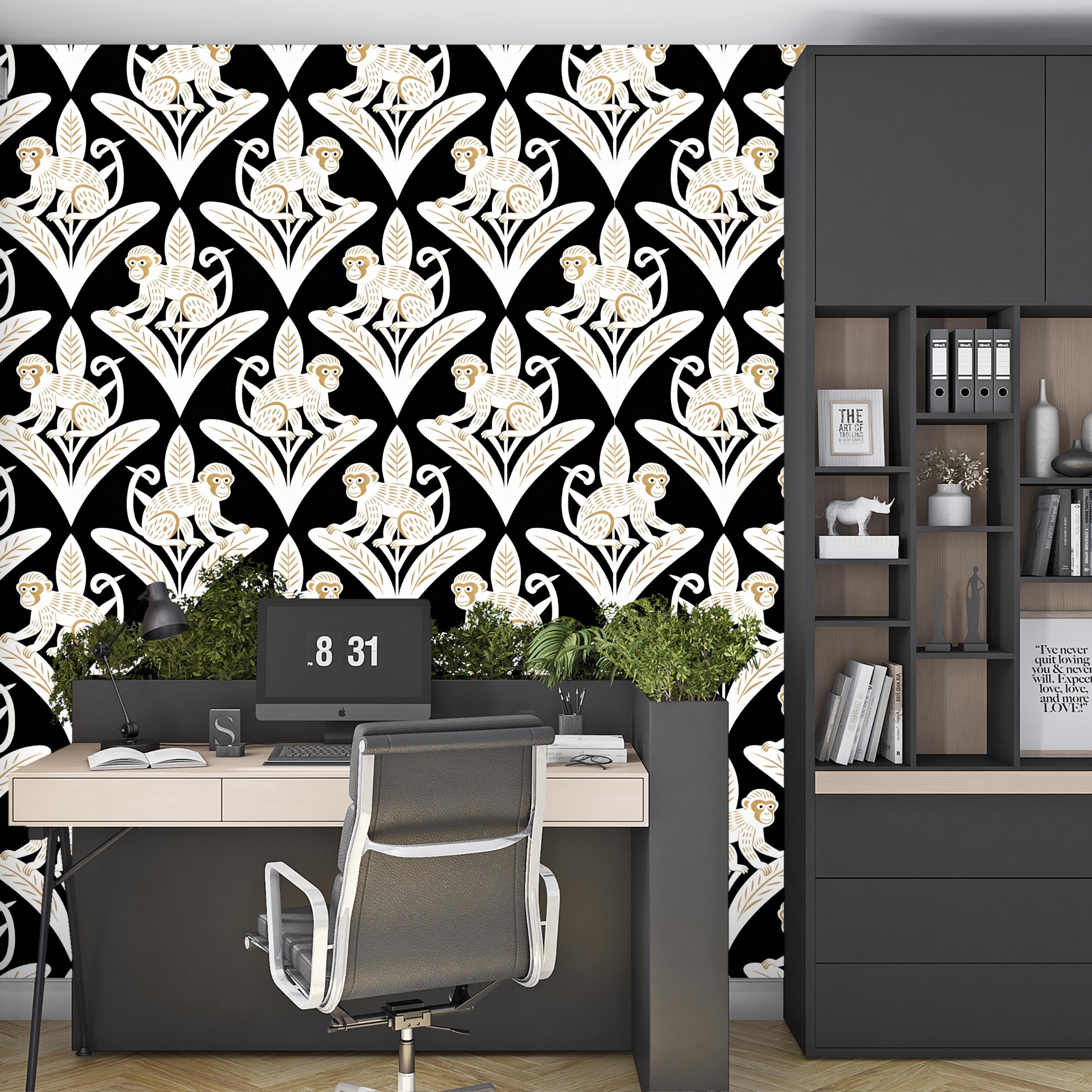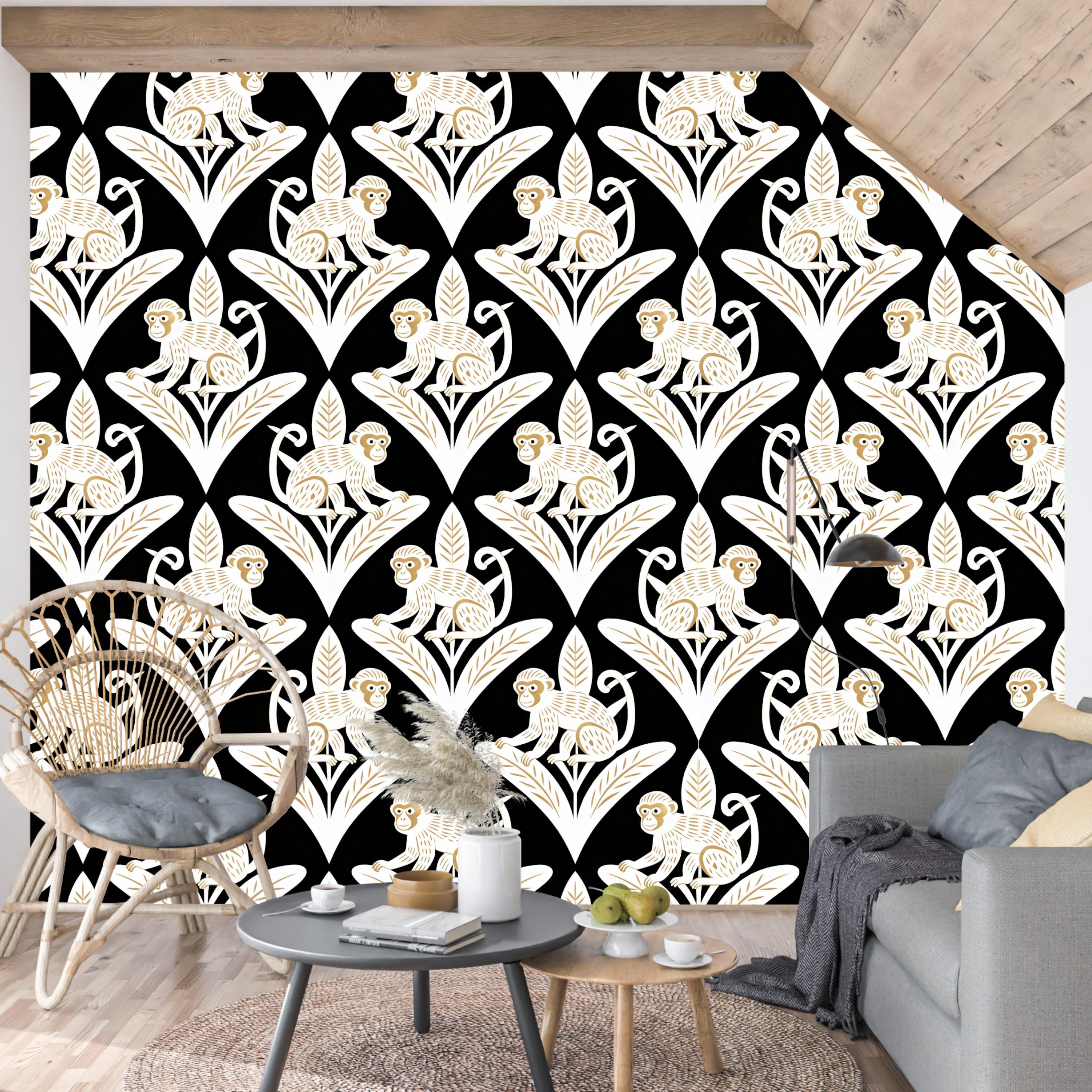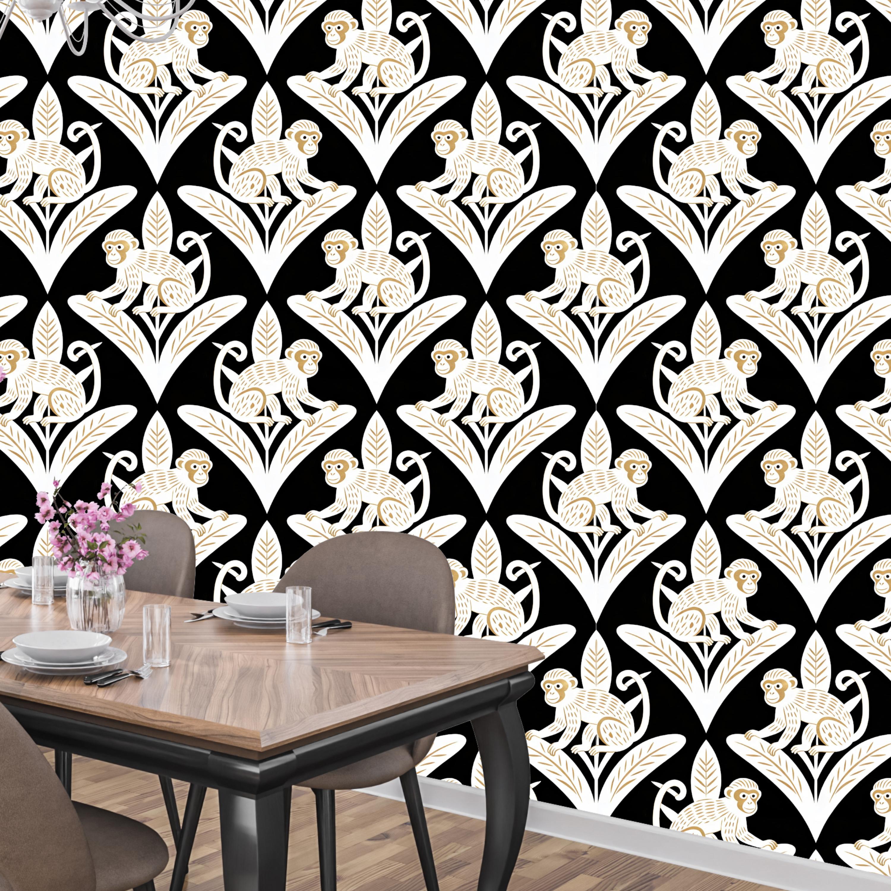 Step away from the ordinary and embrace the bold with this captivating Art Deco inspired monkey wallpaper. This design is a luxurious jungle fantasy brought to life, where mischievous white monkeys, detailed with elegant golden tones, perch atop stylized geometric leaves against a dramatic, pitch-black backdrop.