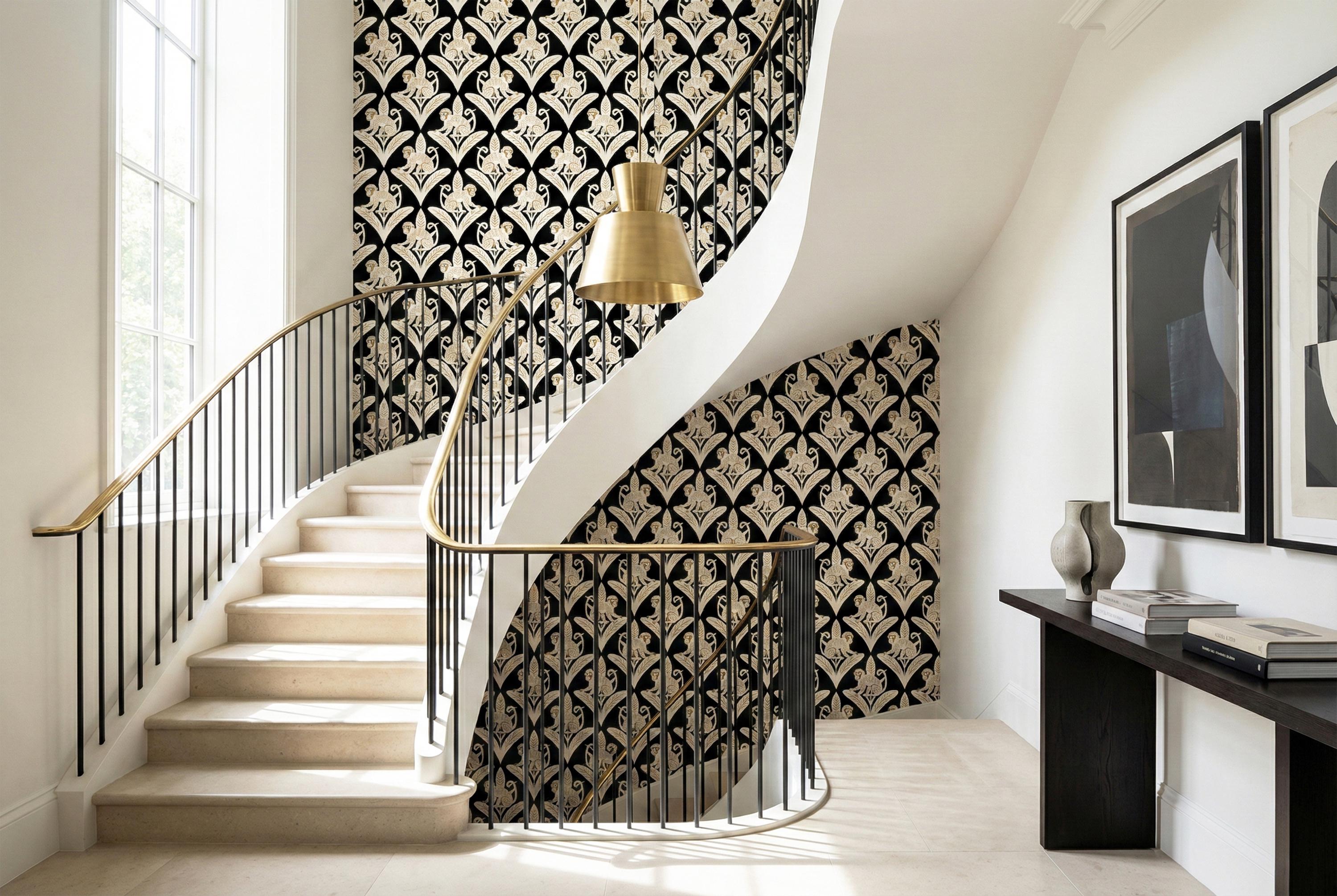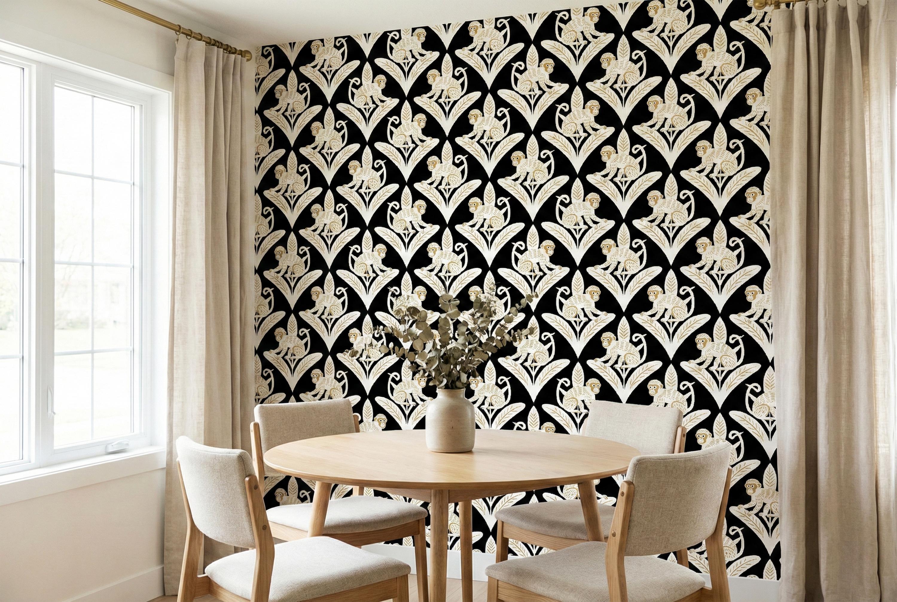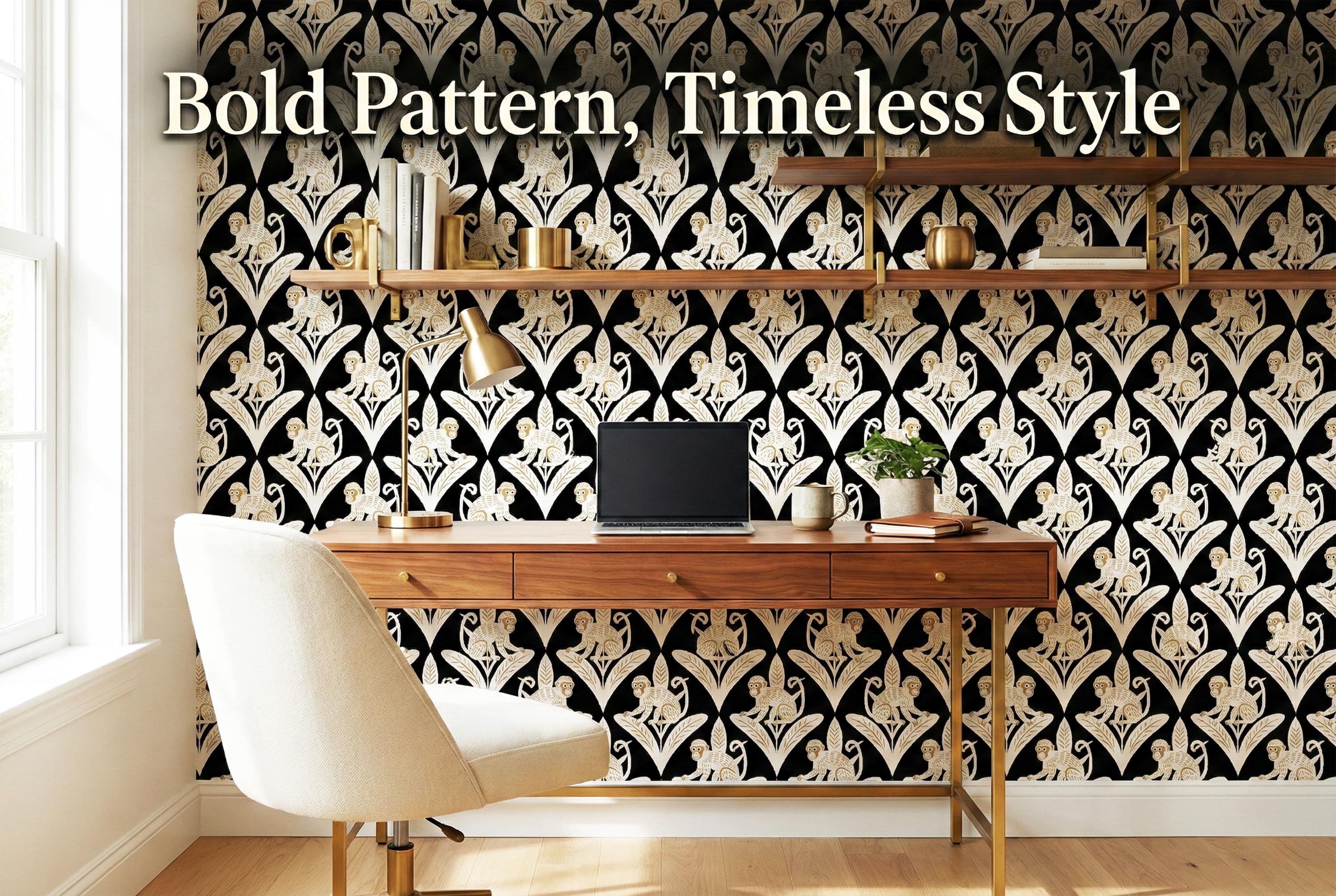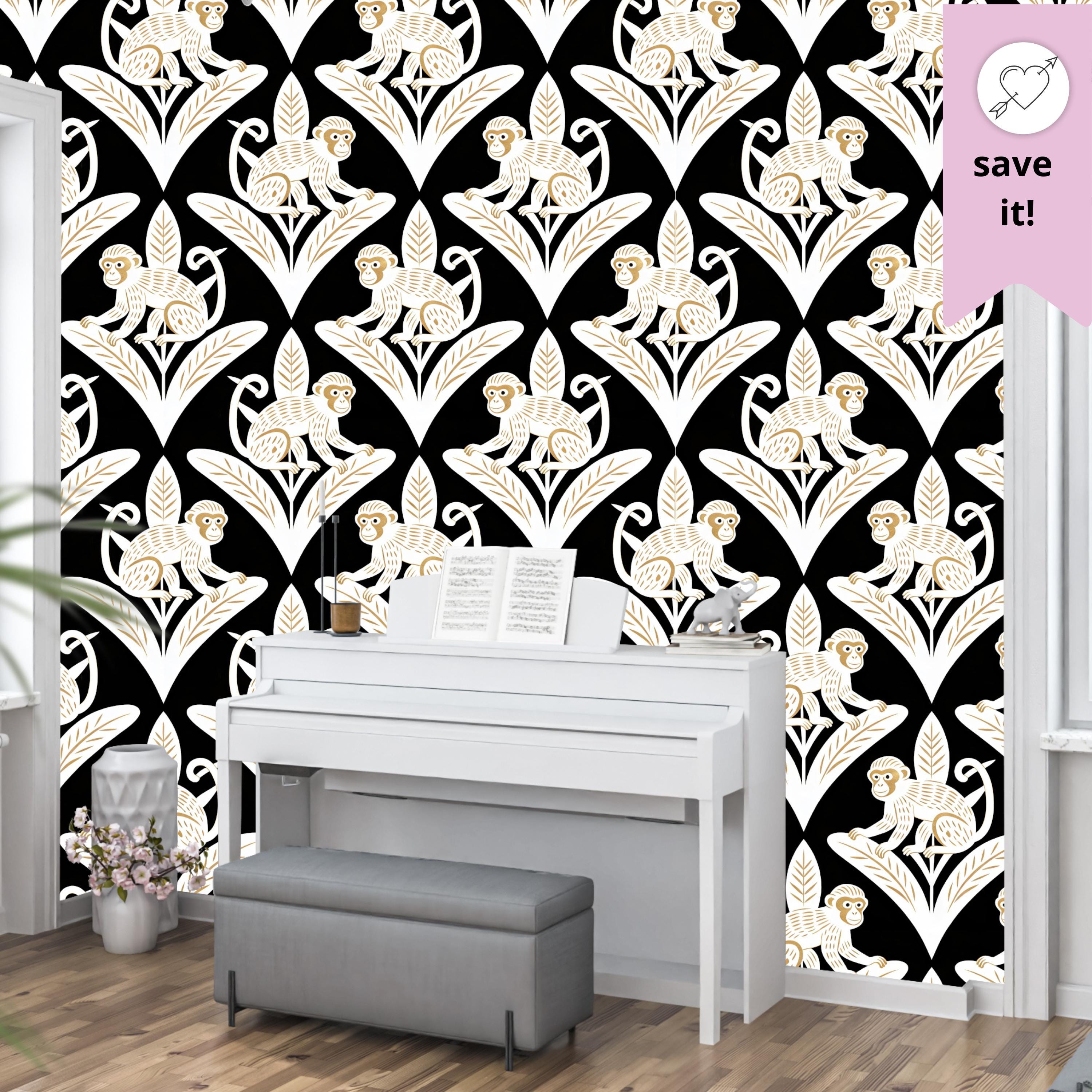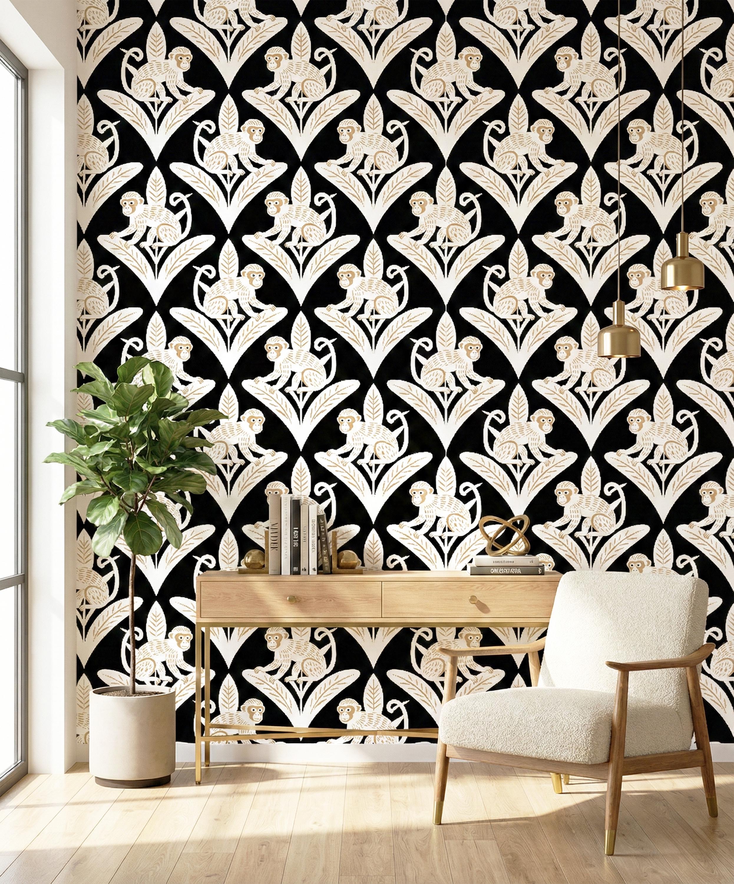 Step away from the ordinary and embrace the bold with this captivating Art Deco inspired monkey wallpaper. This design is a luxurious jungle fantasy brought to life, where mischievous white monkeys, detailed with elegant golden tones, perch atop stylized geometric leaves against a dramatic, pitch-black backdrop.