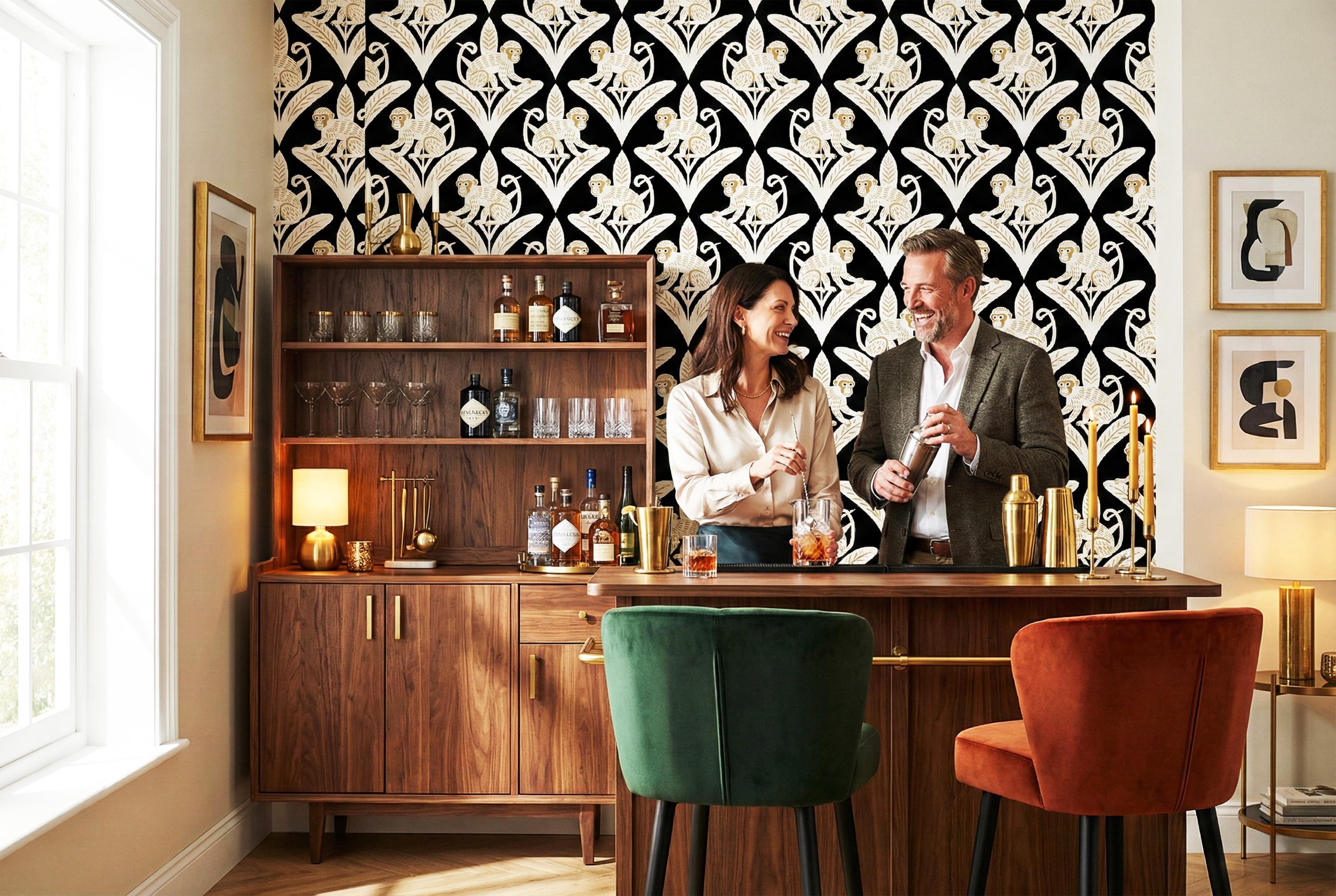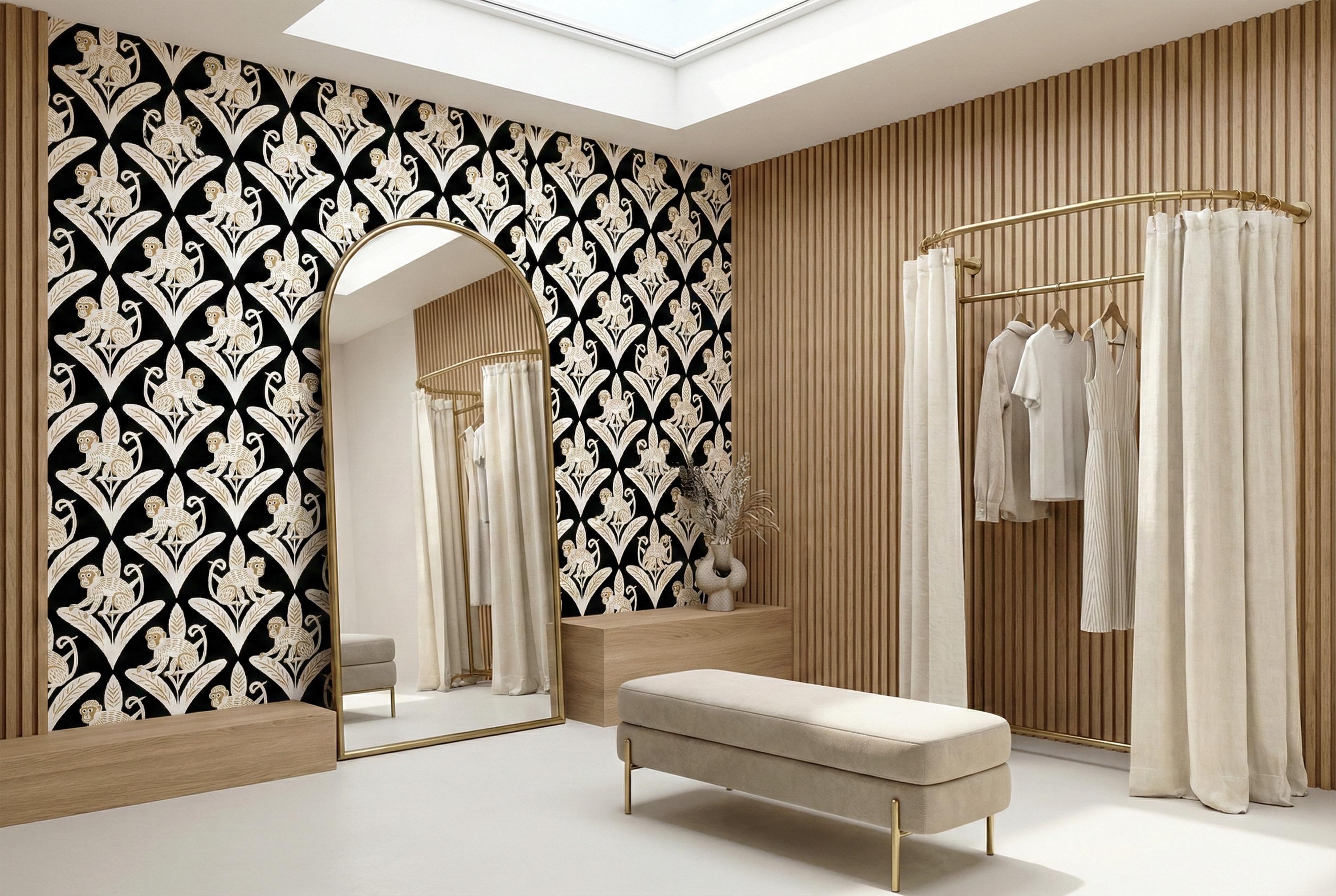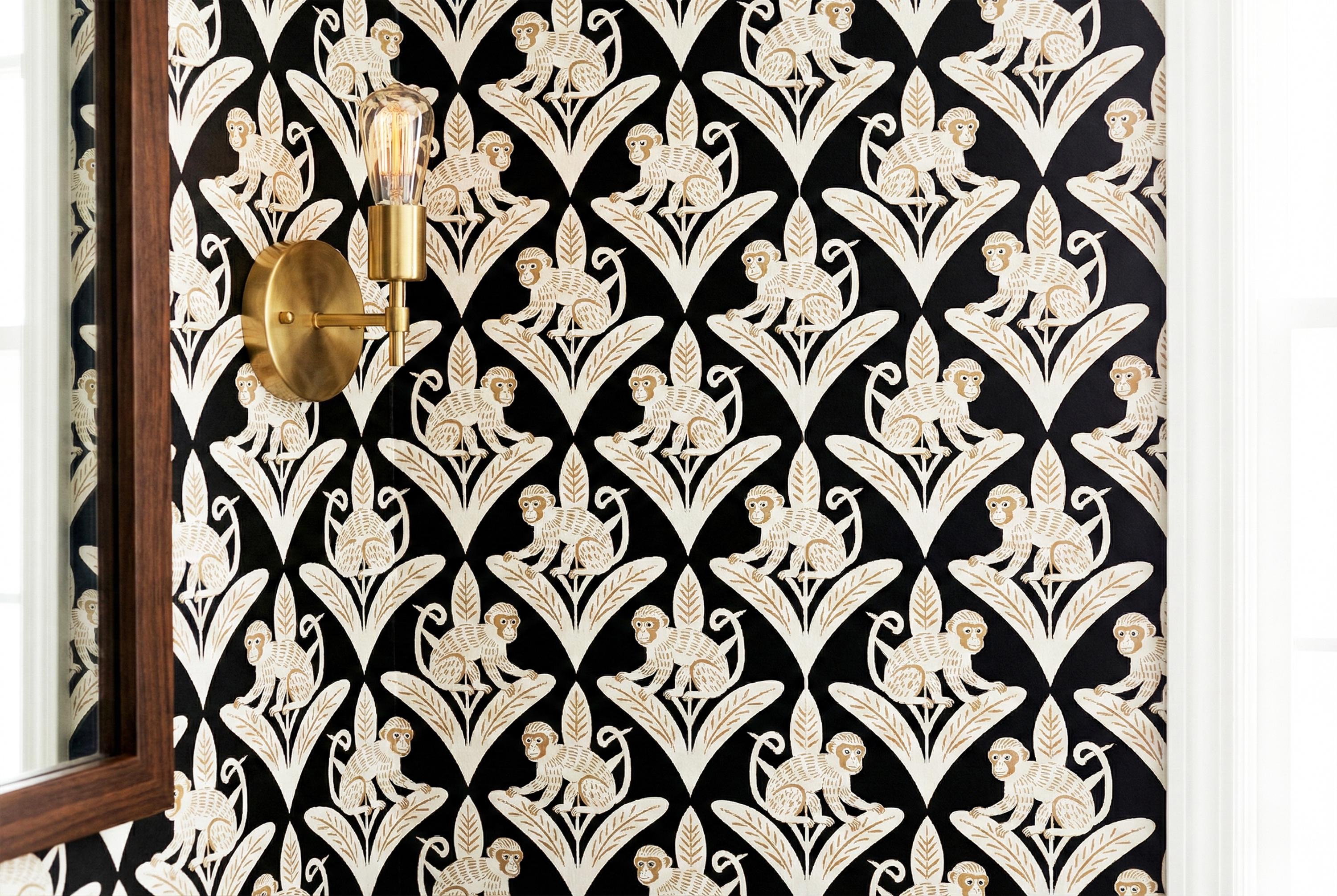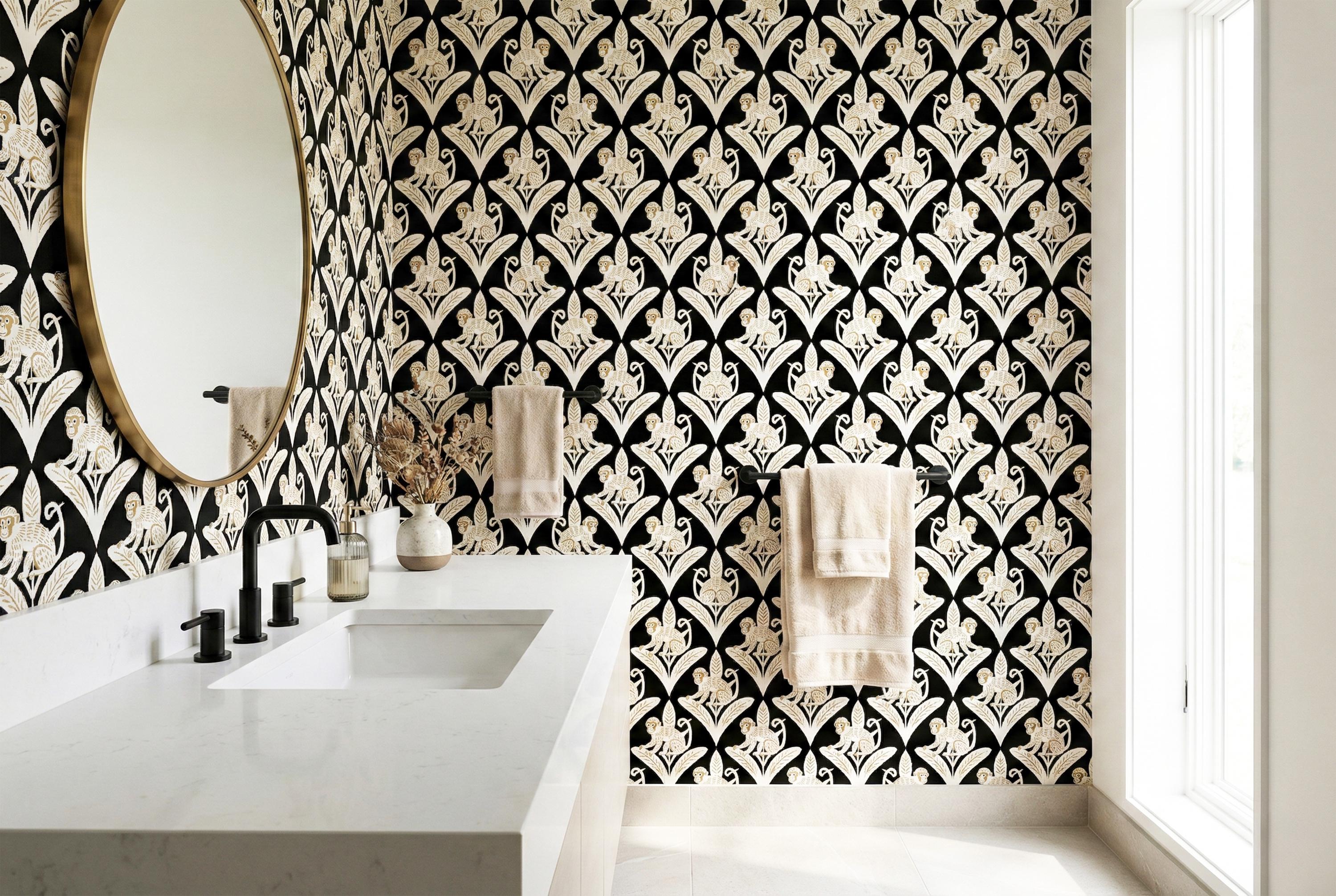 Step away from the ordinary and embrace the bold with this captivating Art Deco inspired monkey wallpaper. This design is a luxurious jungle fantasy brought to life, where mischievous white monkeys, detailed with elegant golden tones, perch atop stylized geometric leaves against a dramatic, pitch-black backdrop.