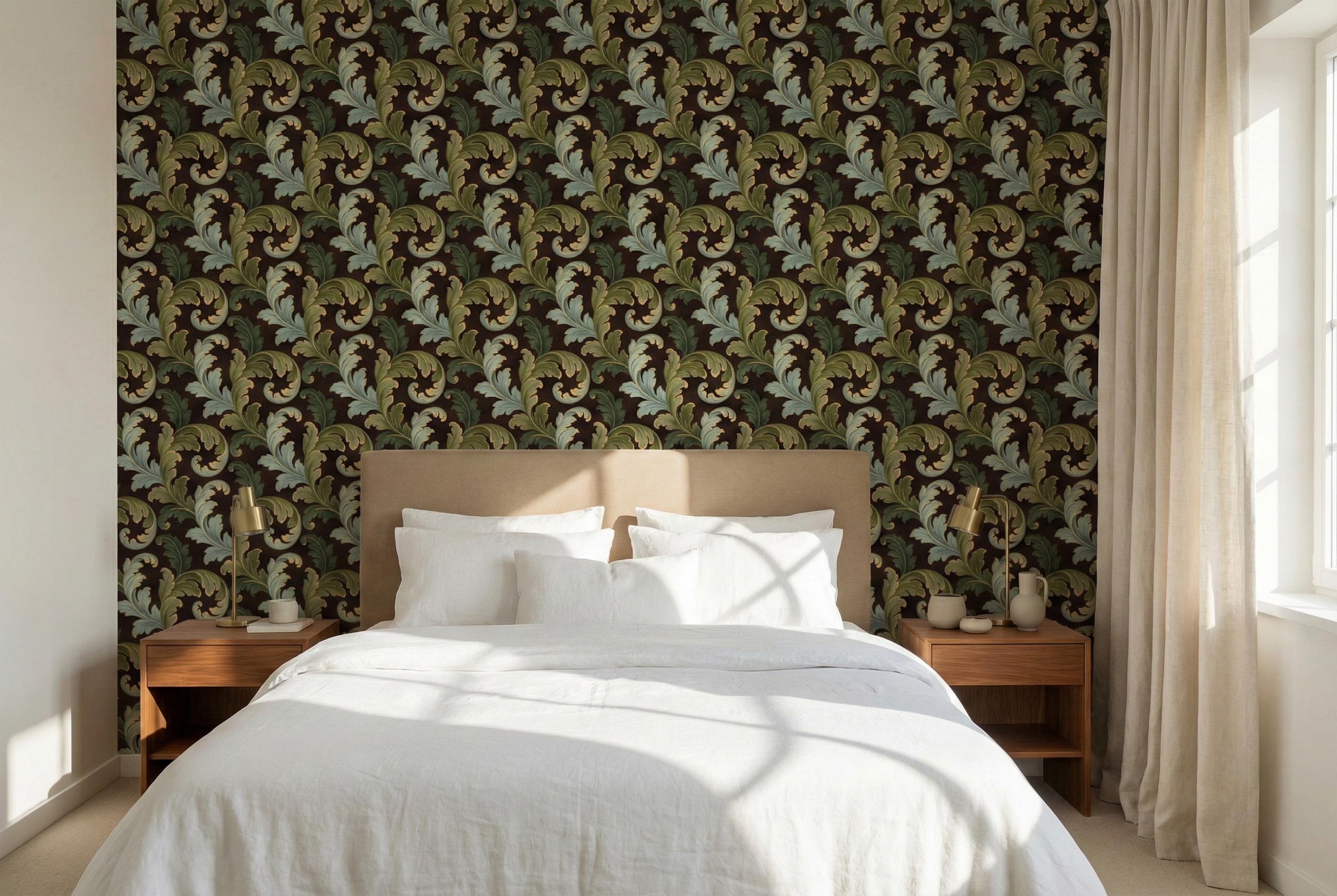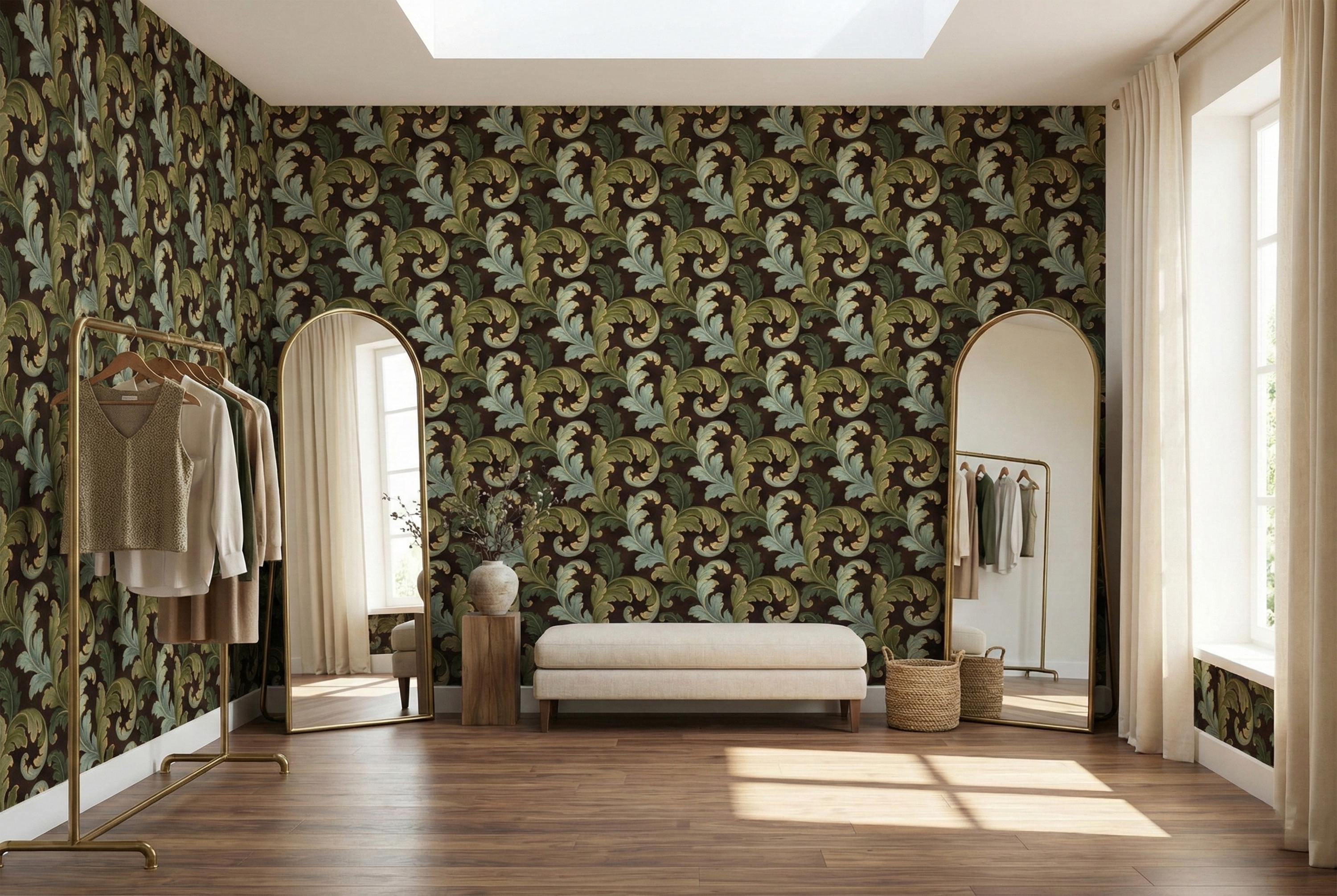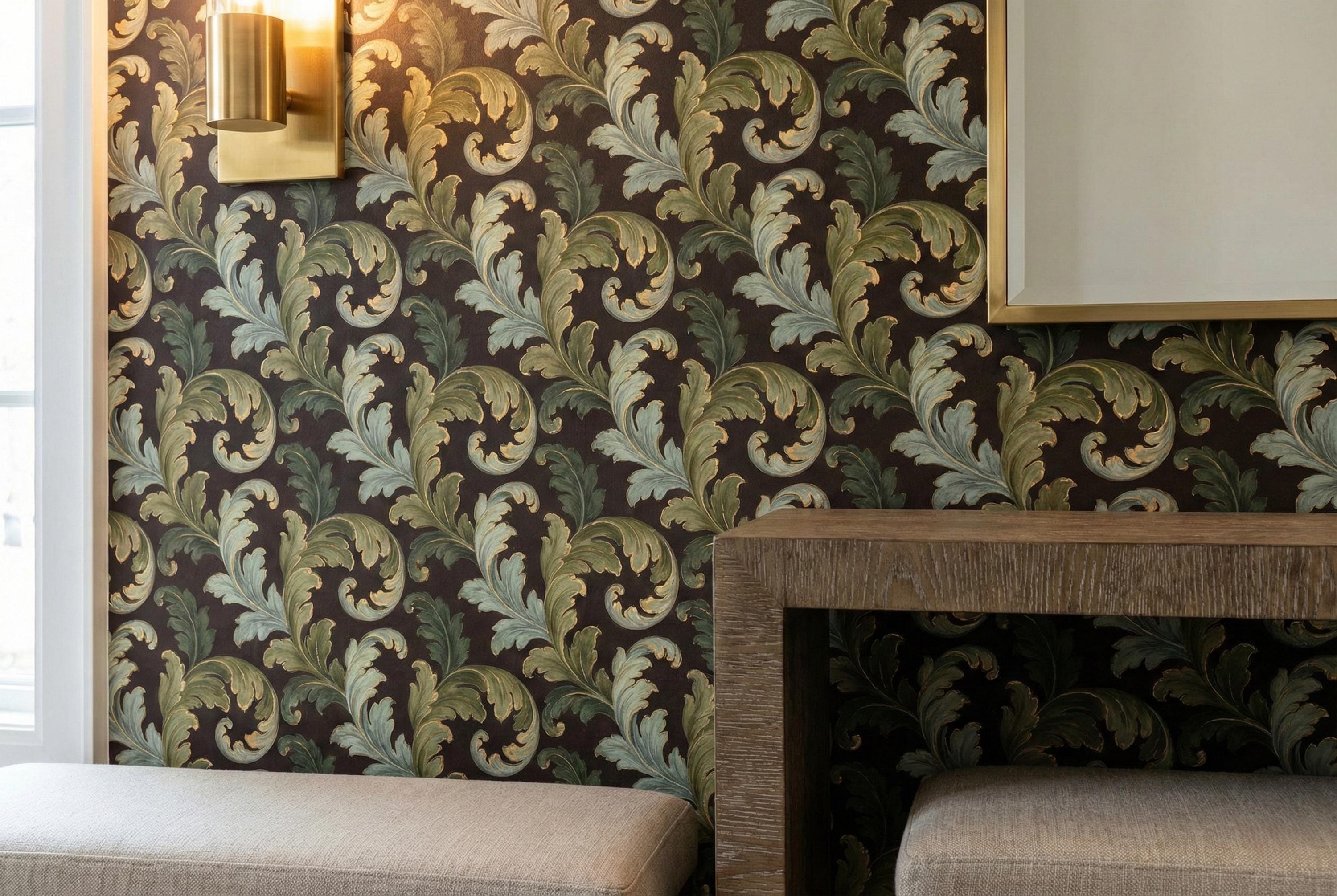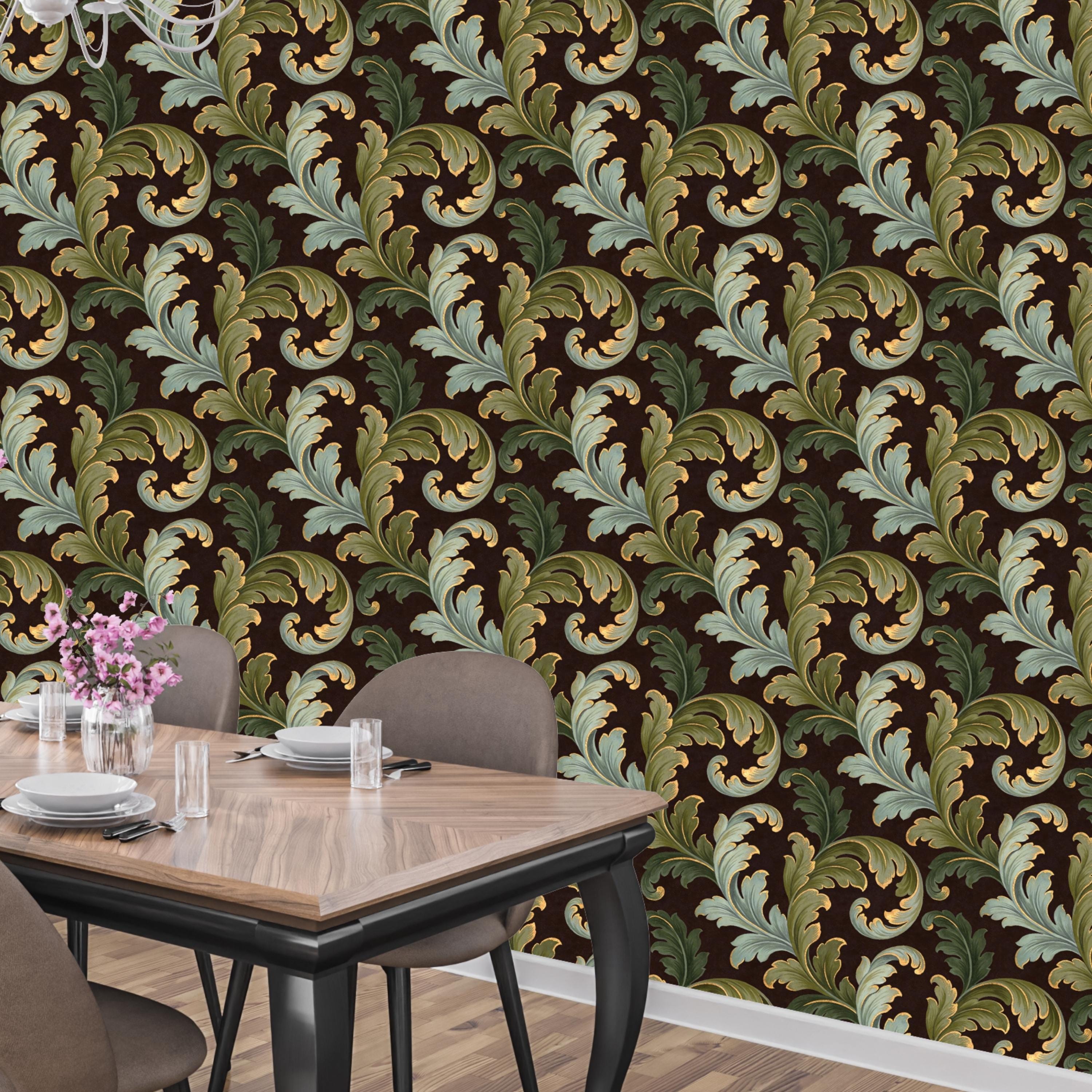 Swirling, scrolling acanthus leaves in rich shades of sage and olive green unfurl across a deep, moody brown backdrop. Each leaf is delicately outlined in shimmering gold, adding a touch of regal elegance that catches the light and creates a stunning sense of depth. The result is a wall covering that is both commanding and inviting.