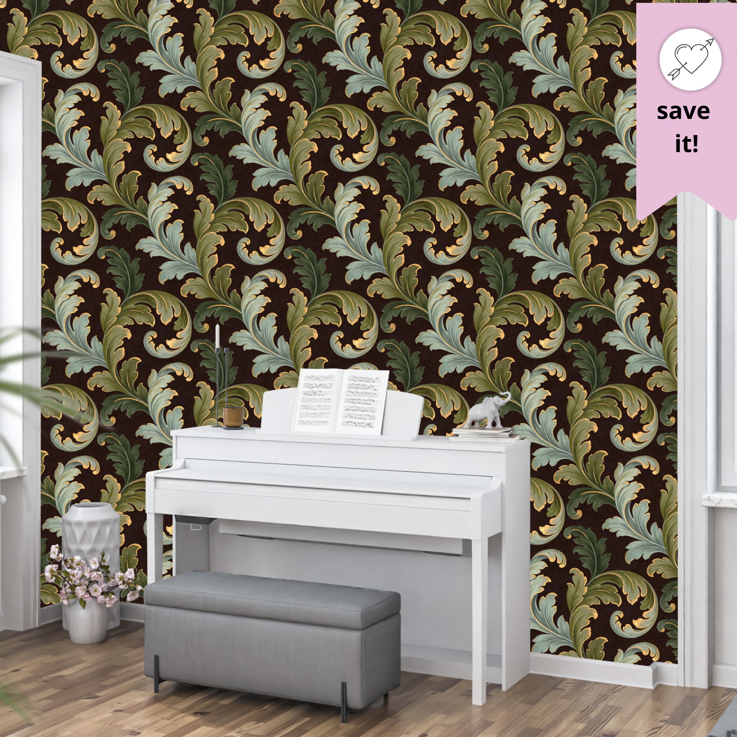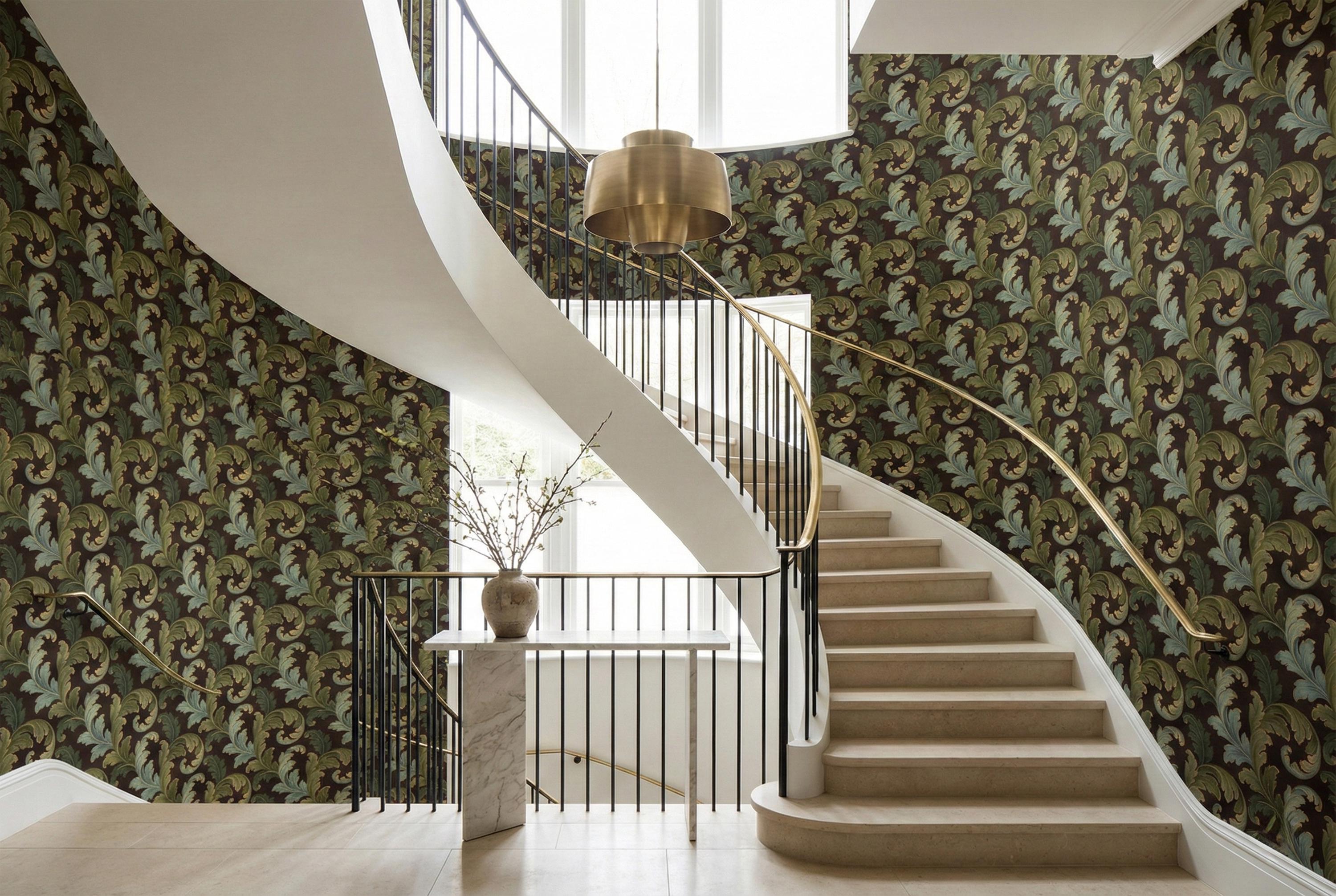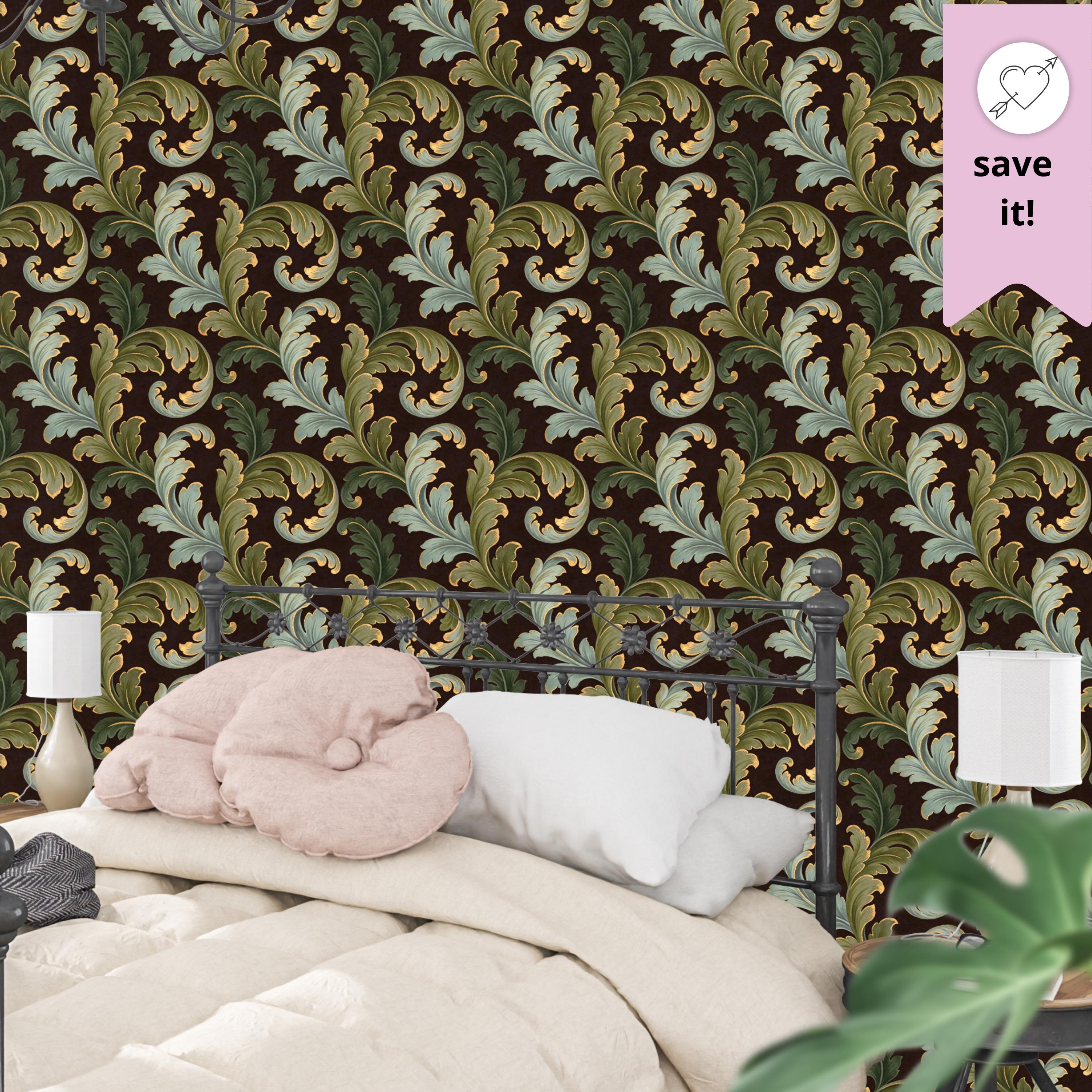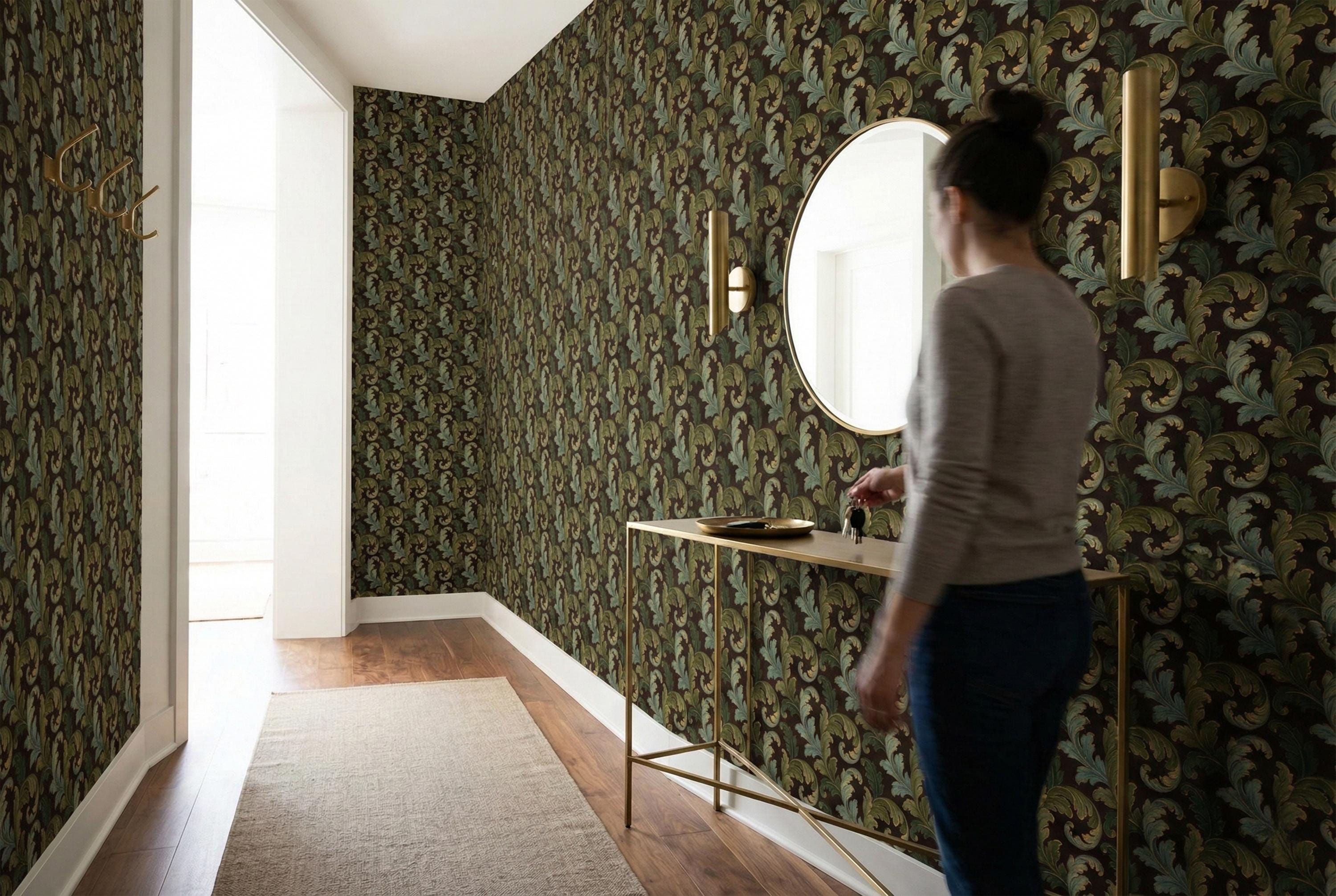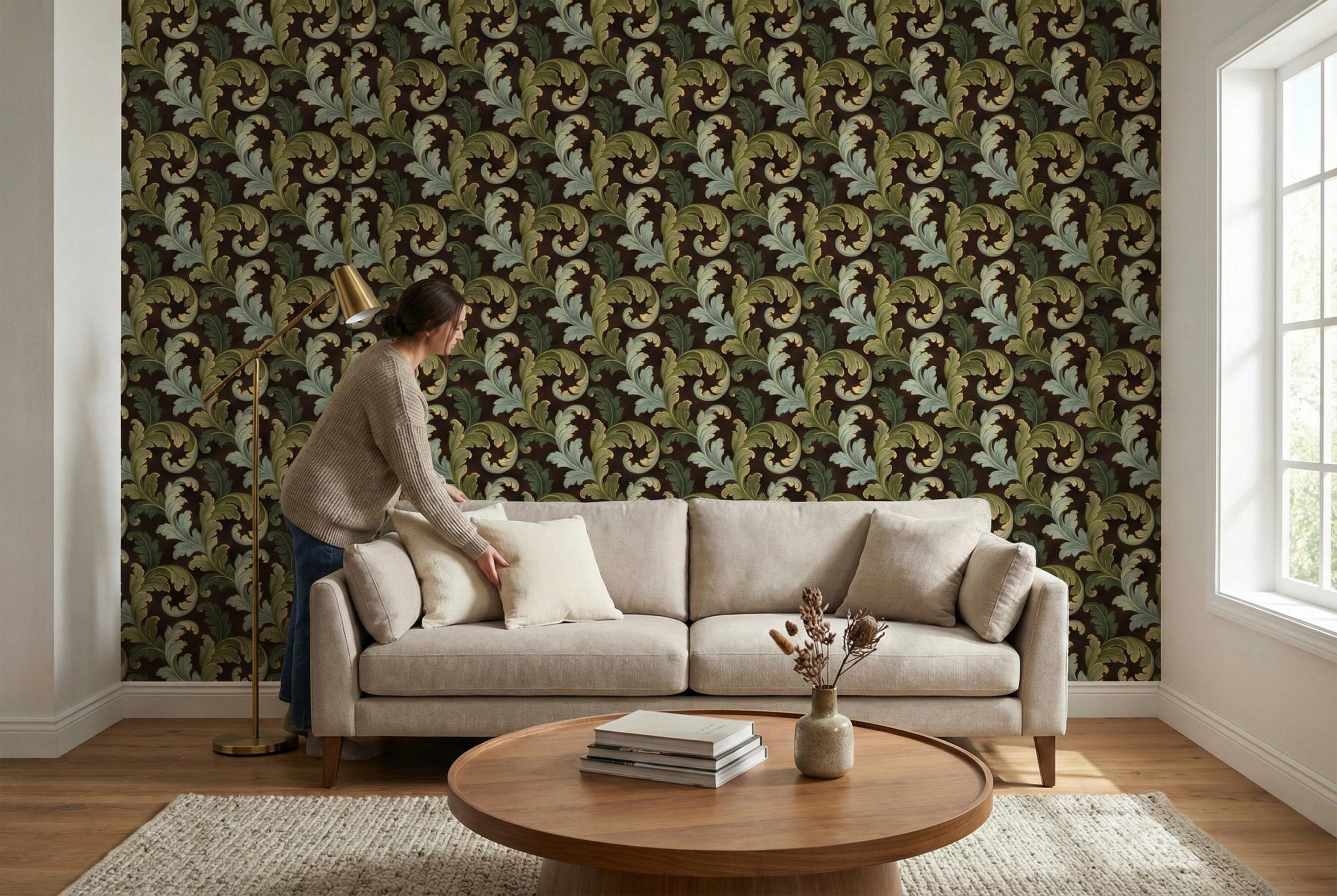 Swirling, scrolling acanthus leaves in rich shades of sage and olive green unfurl across a deep, moody brown backdrop. Each leaf is delicately outlined in shimmering gold, adding a touch of regal elegance that catches the light and creates a stunning sense of depth. The result is a wall covering that is both commanding and inviting.