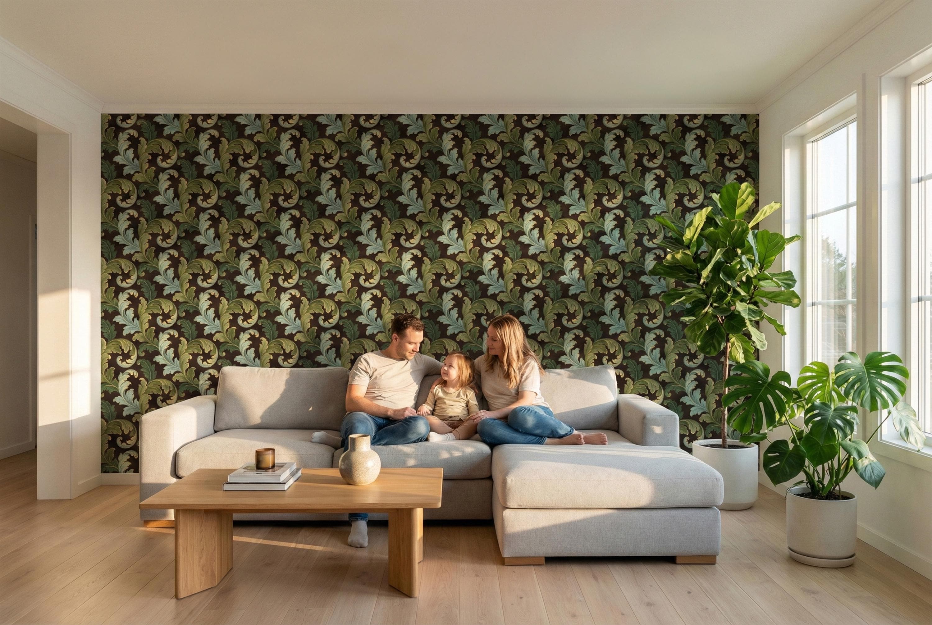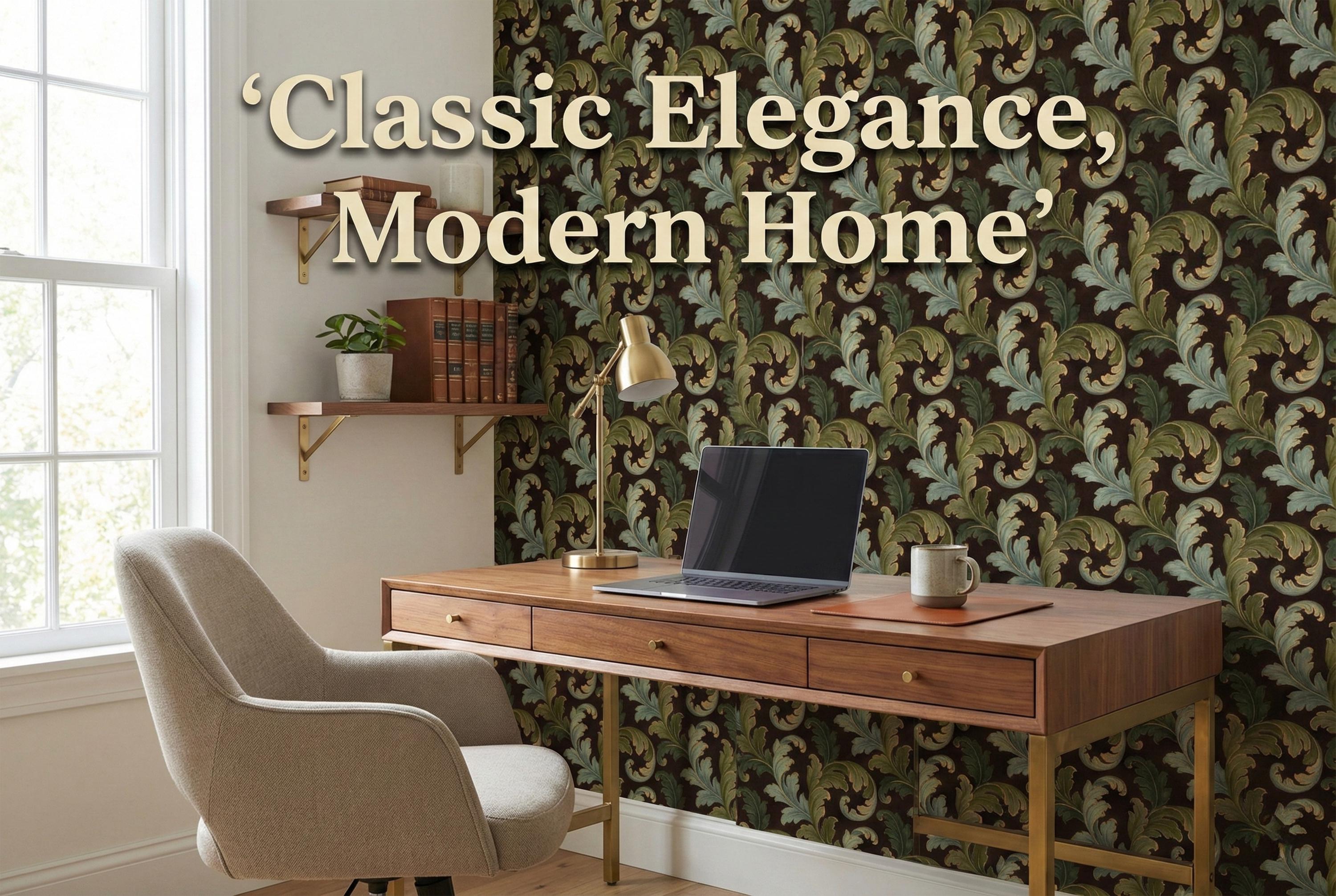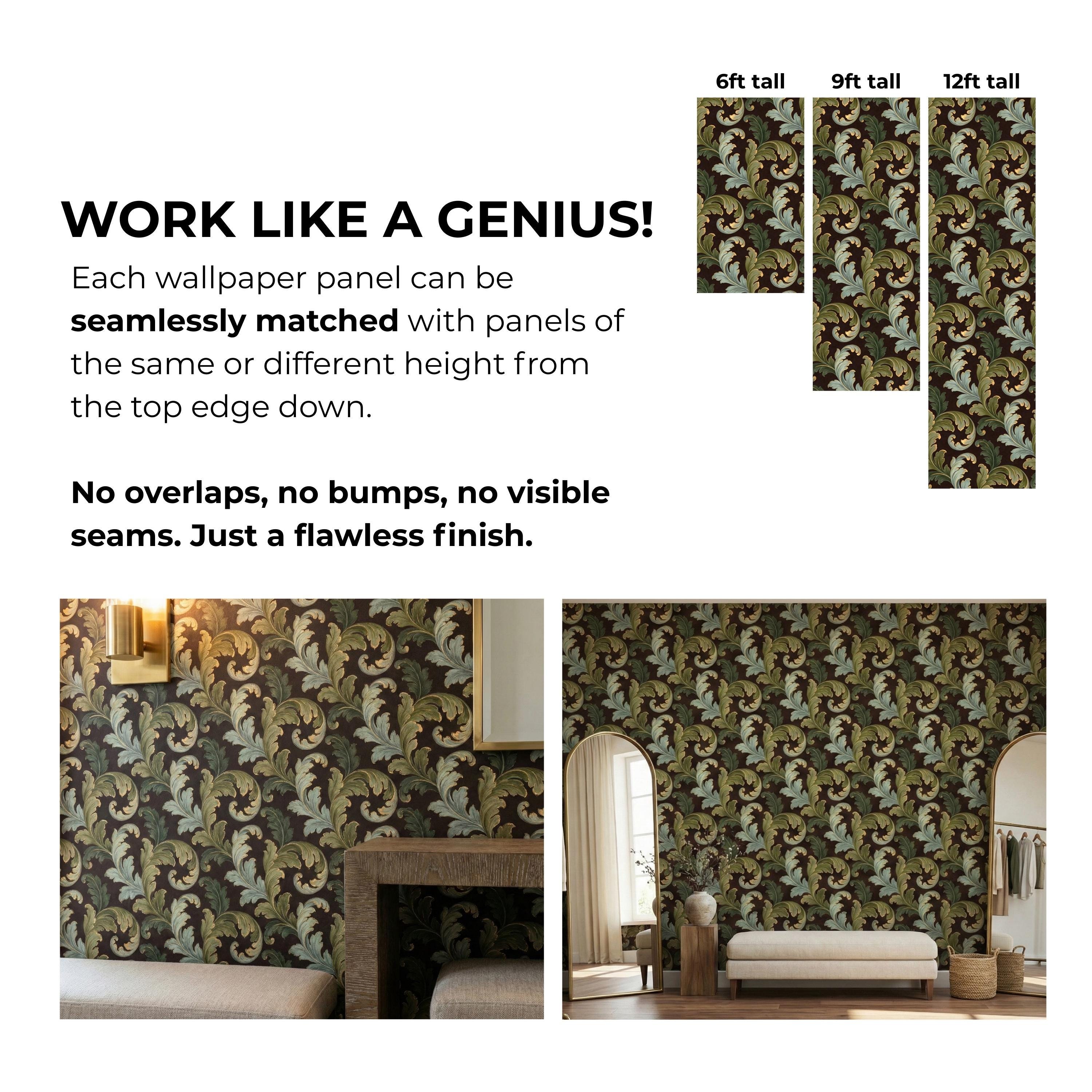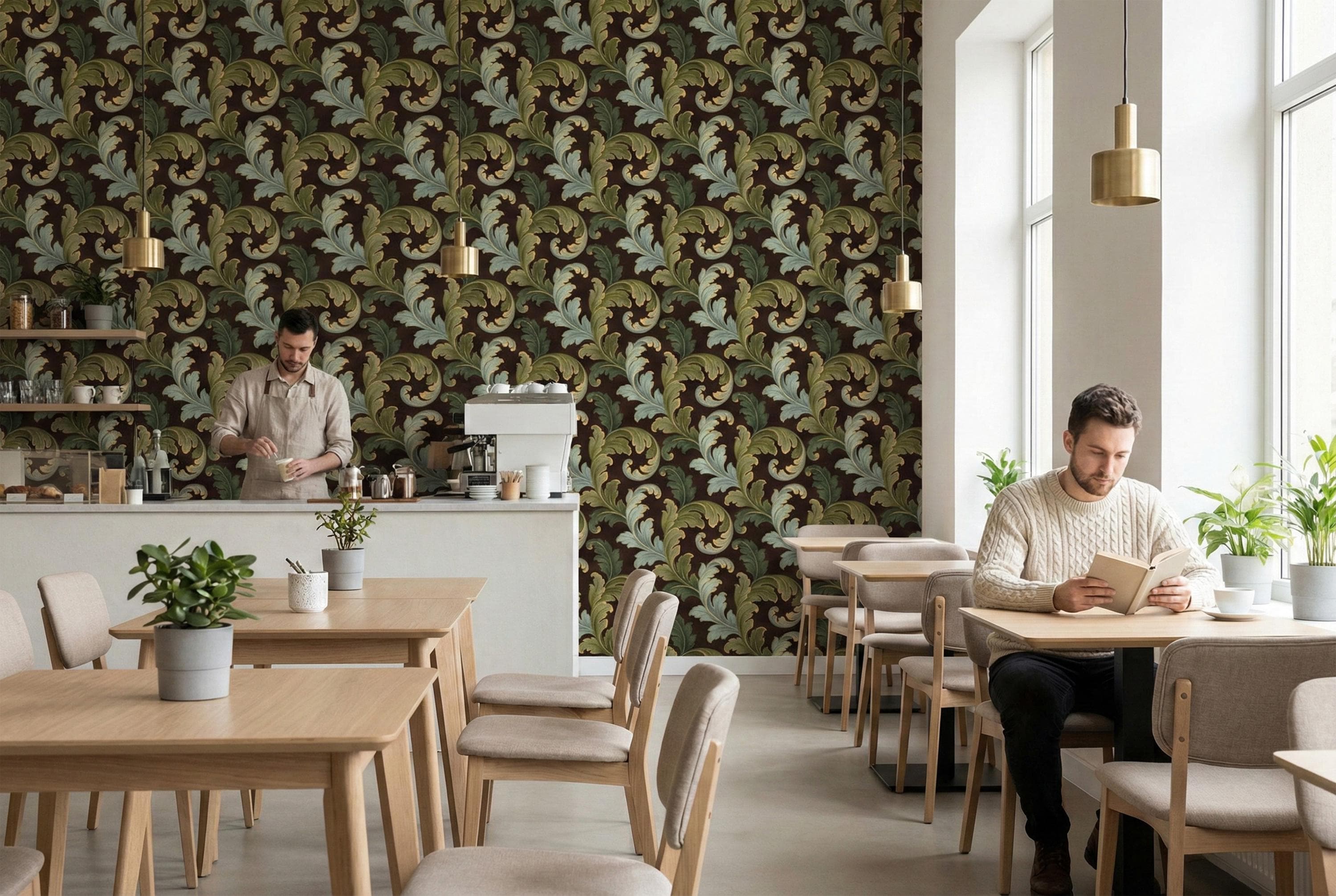 Swirling, scrolling acanthus leaves in rich shades of sage and olive green unfurl across a deep, moody brown backdrop. Each leaf is delicately outlined in shimmering gold, adding a touch of regal elegance that catches the light and creates a stunning sense of depth. The result is a wall covering that is both commanding and inviting.