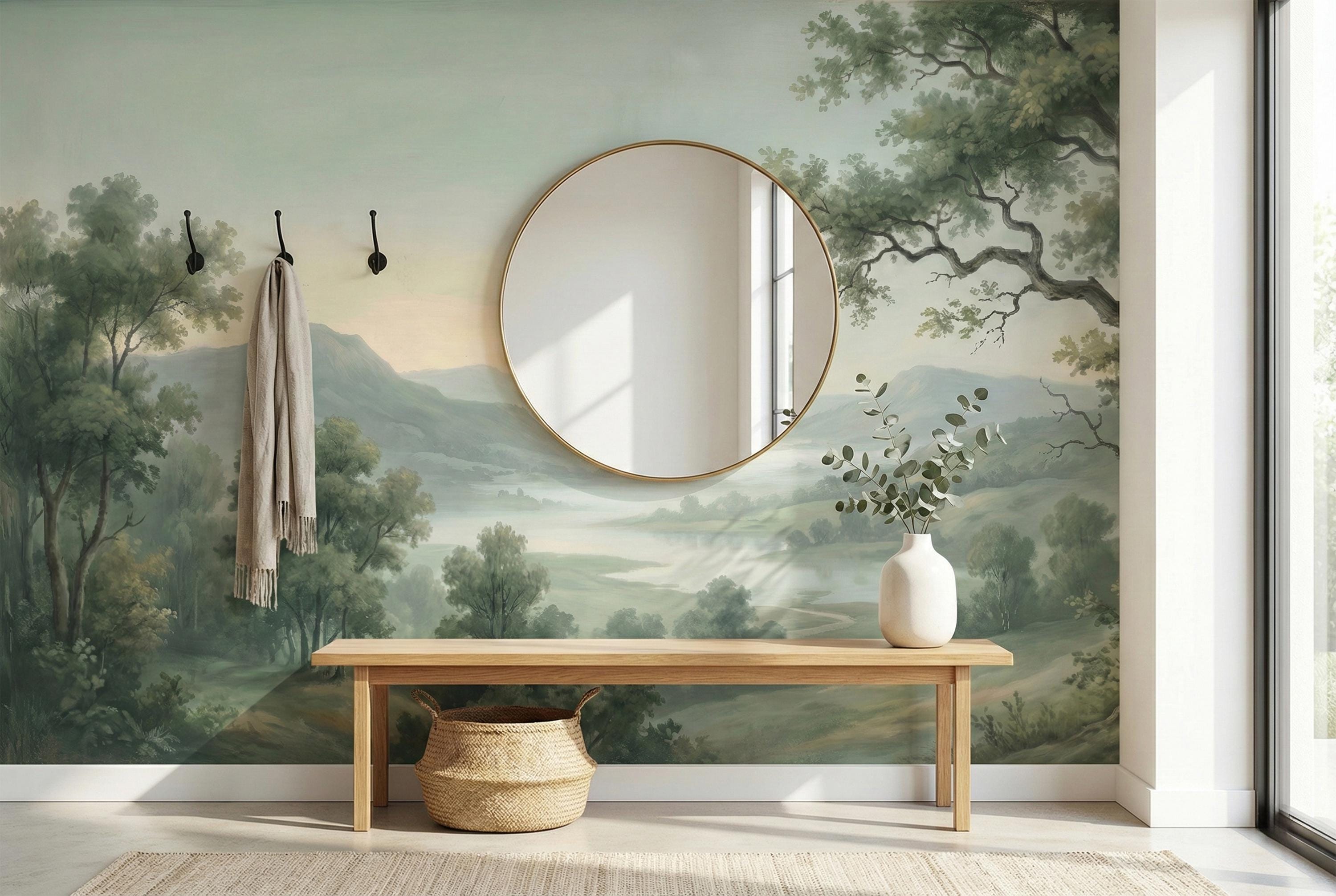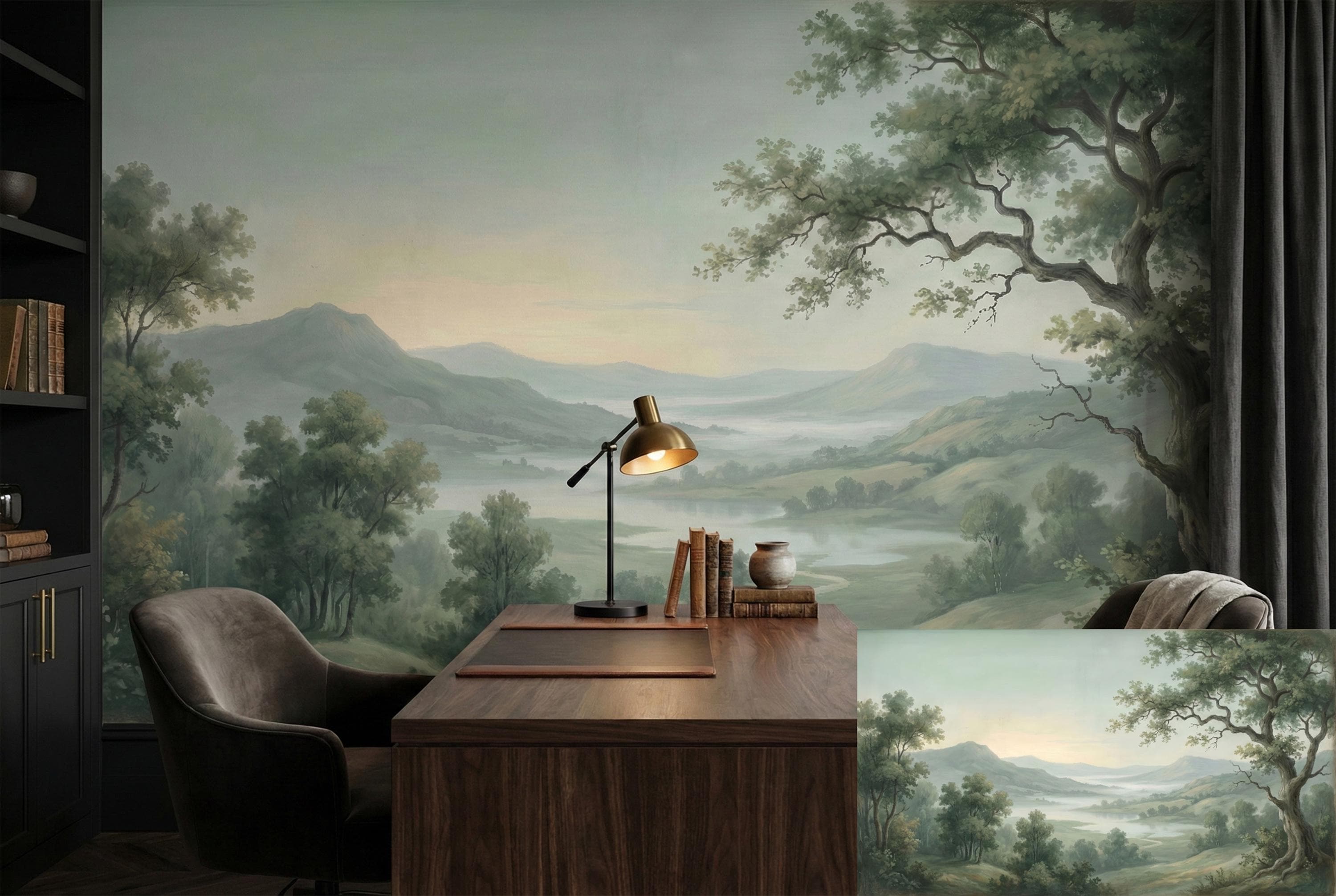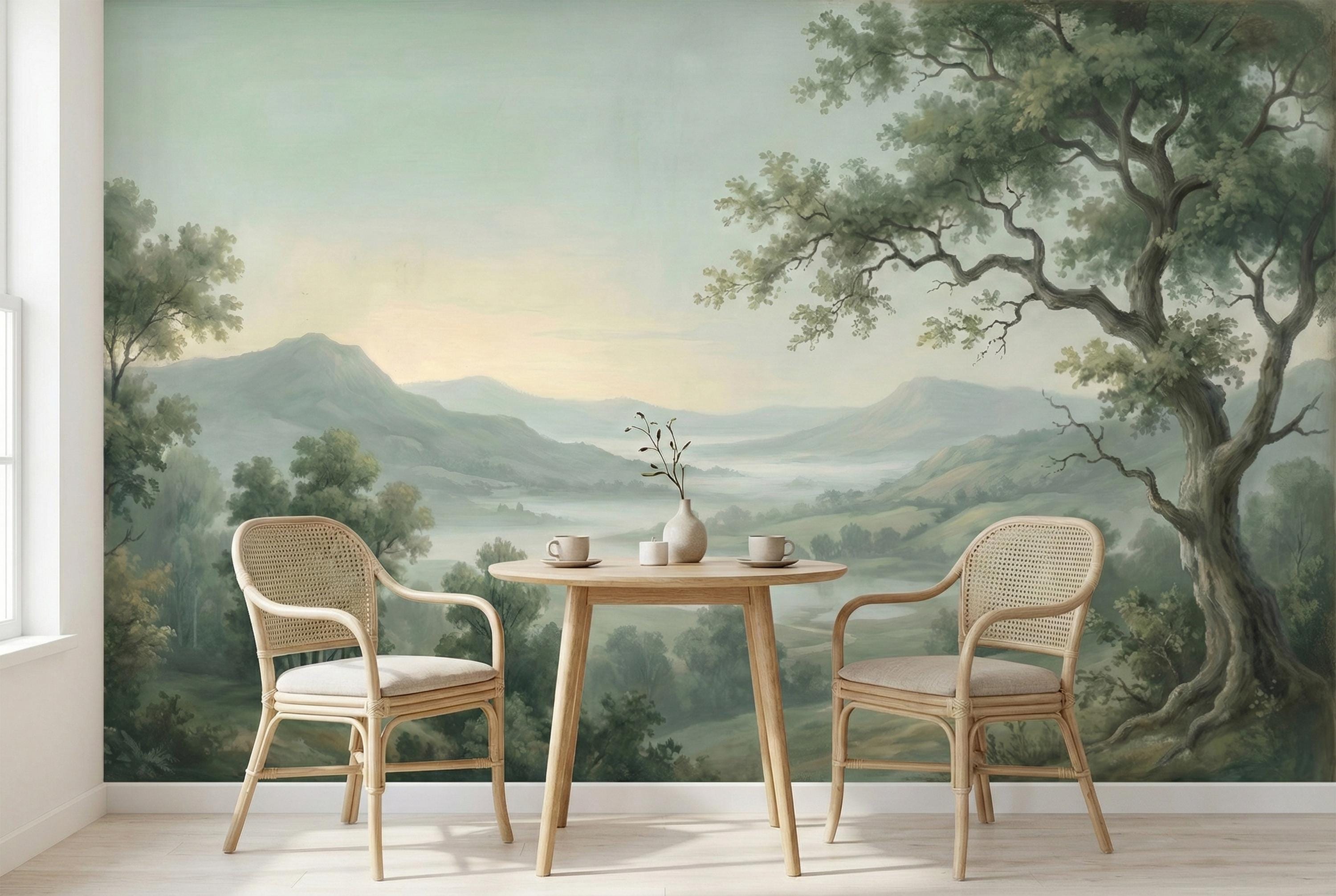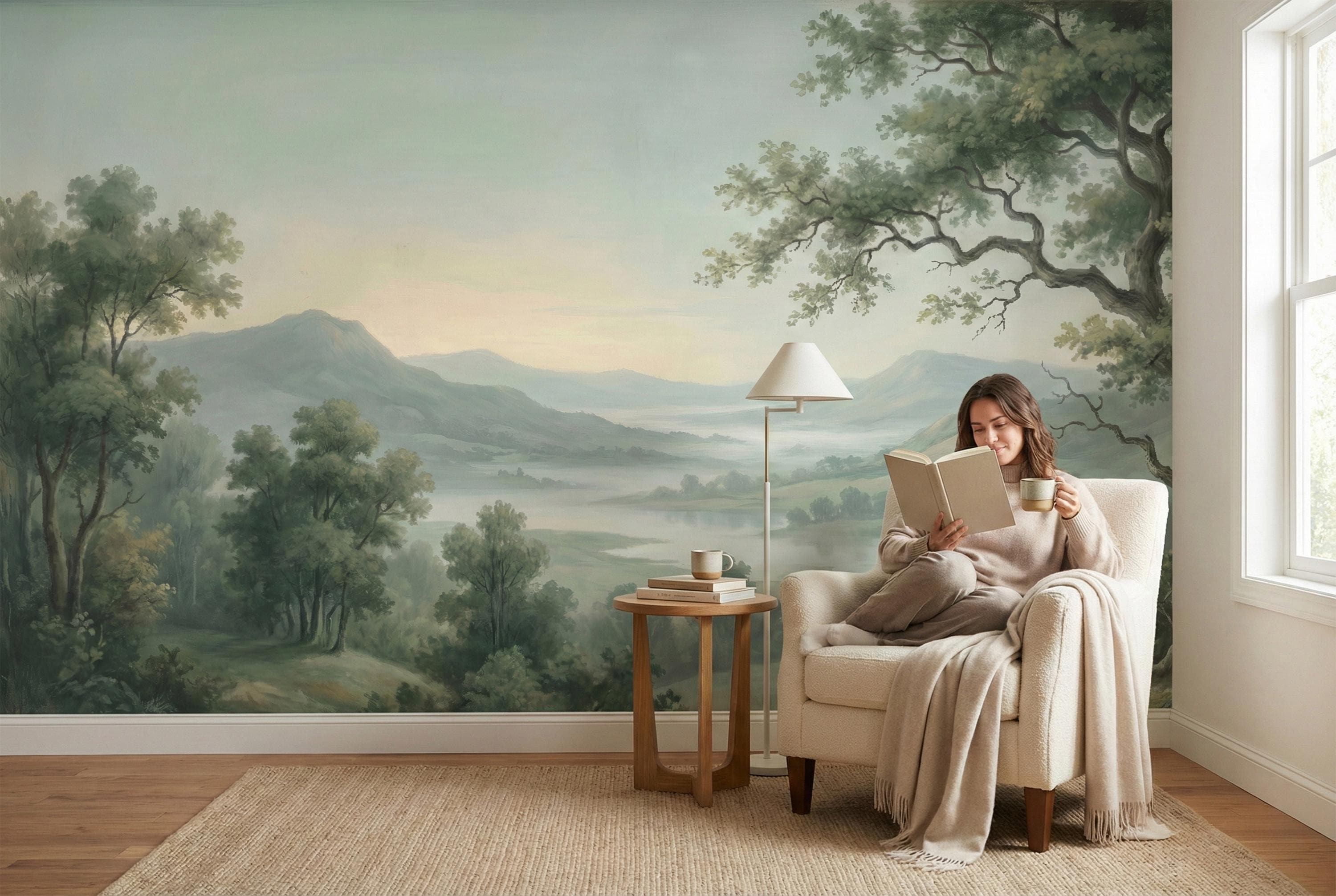 Inspired by vintage European landscape paintings, this mural blends muted greens and gentle atmospheric haze to create a peaceful, expansive effect — perfect for modern living rooms, bedrooms, or home offices.