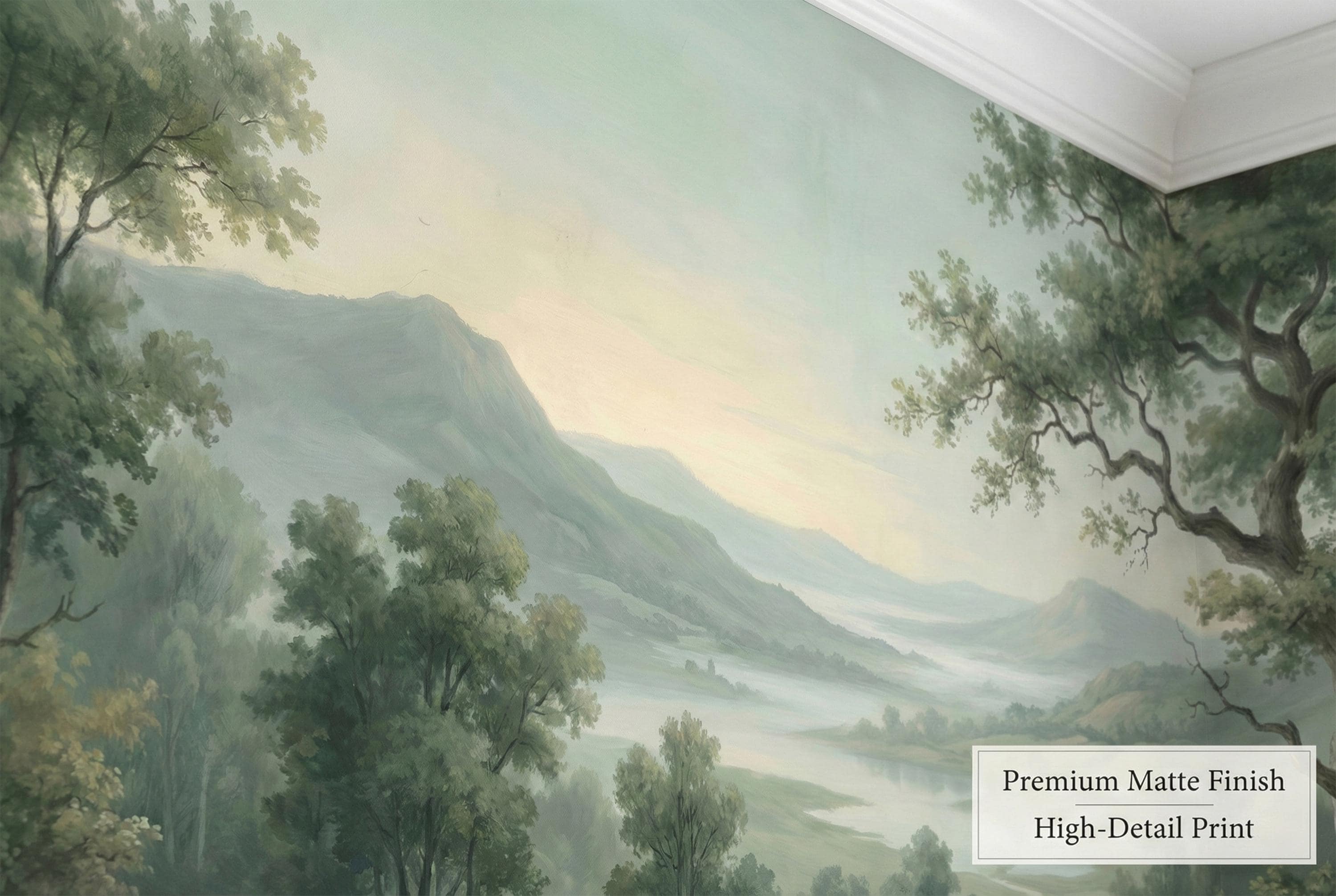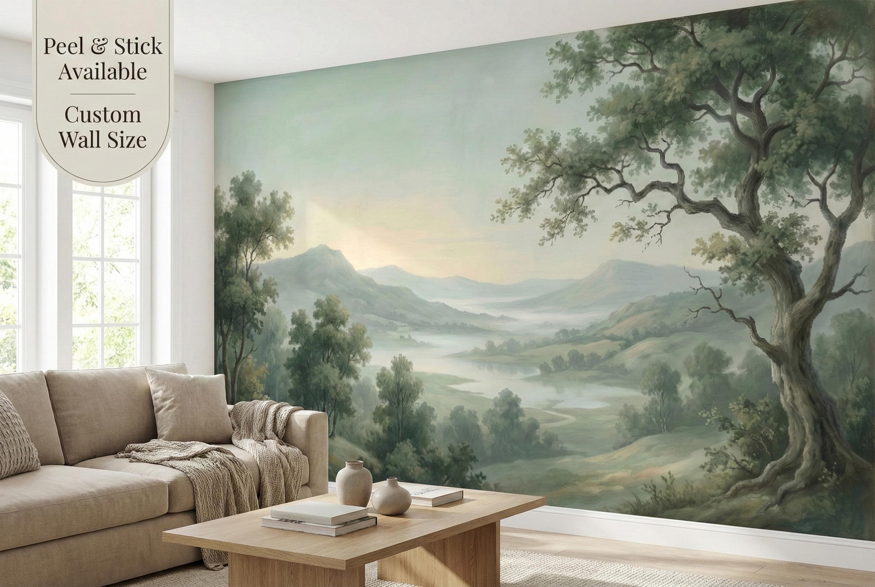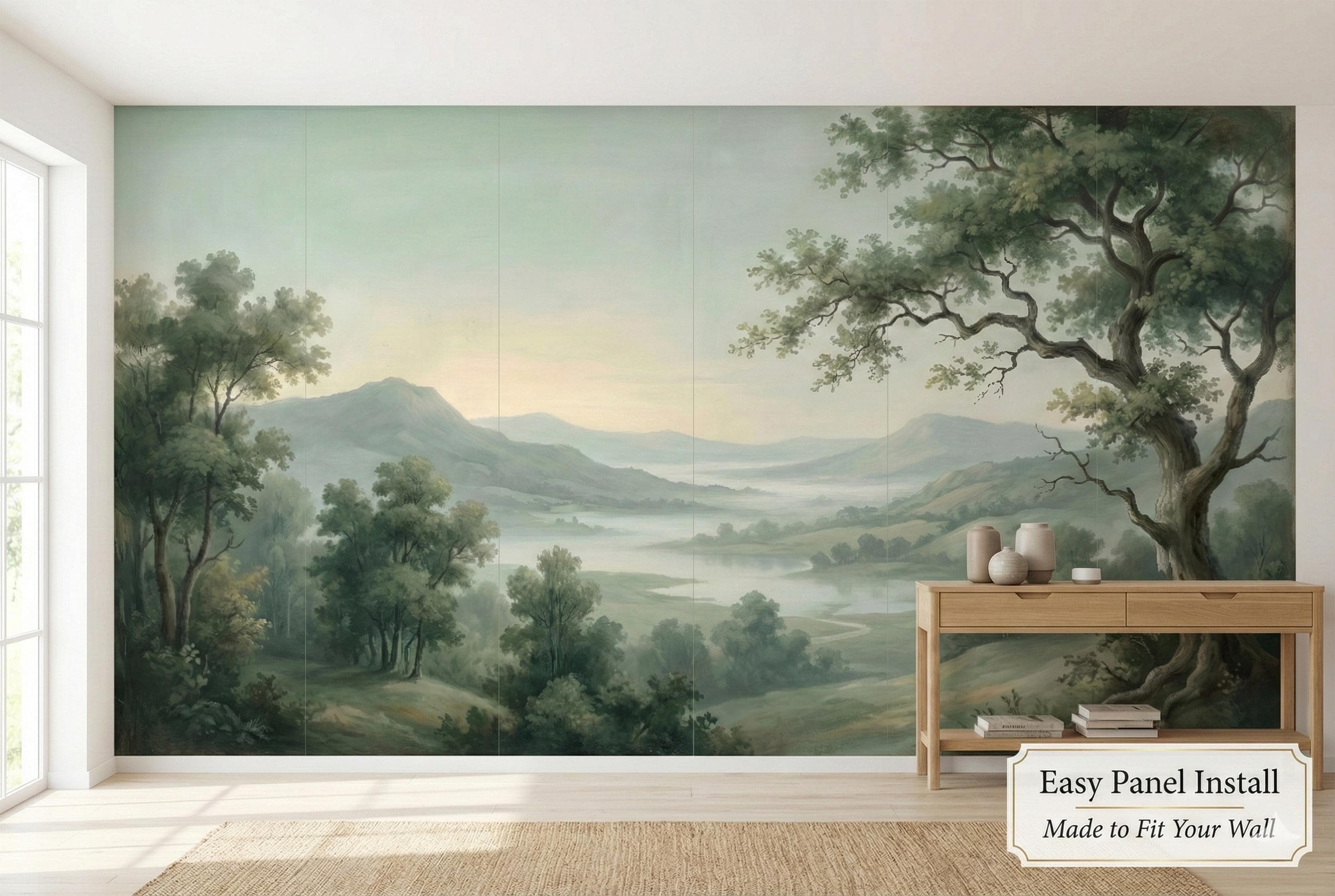 Inspired by vintage European landscape paintings, this mural blends muted greens and gentle atmospheric haze to create a peaceful, expansive effect — perfect for modern living rooms, bedrooms, or home offices.