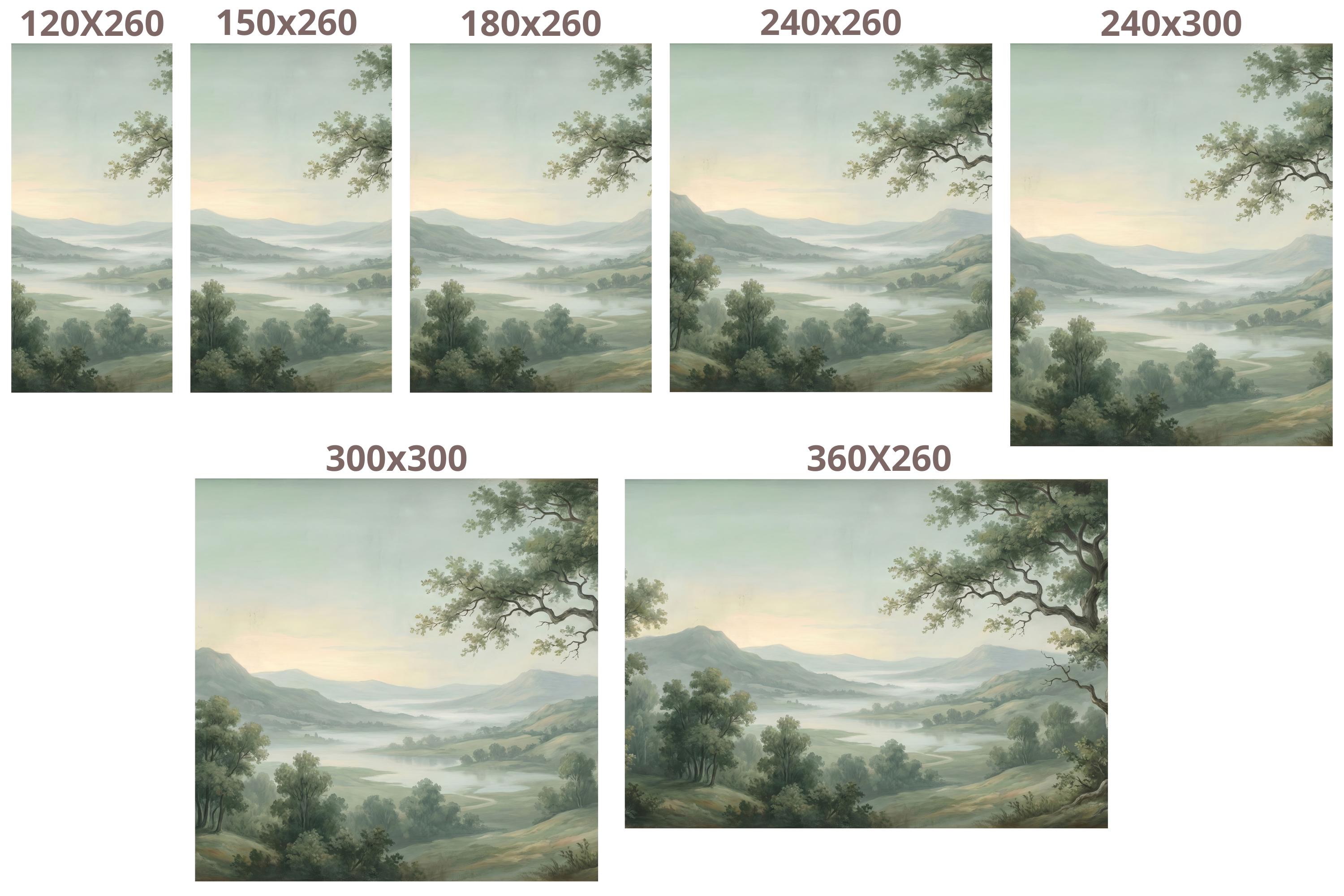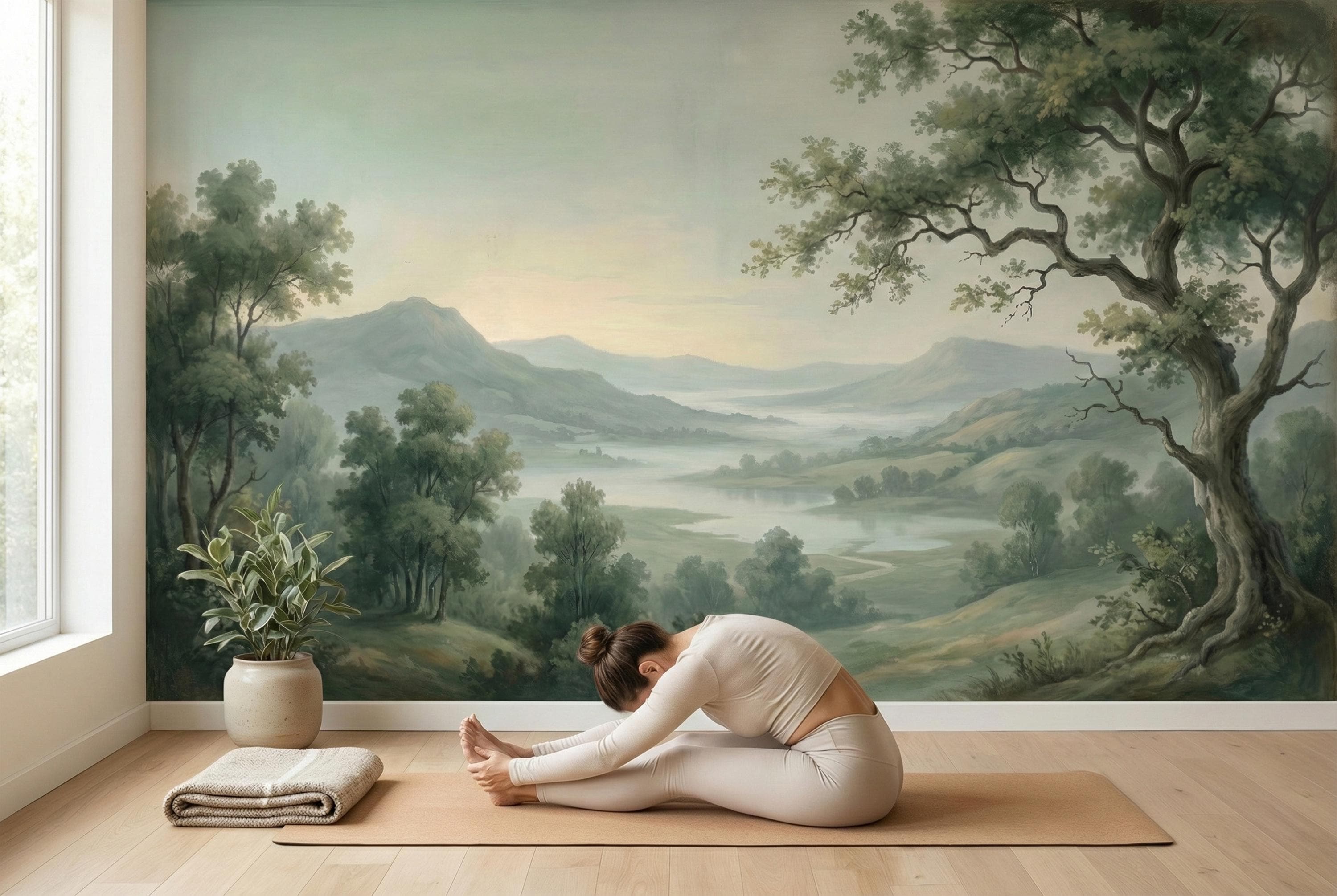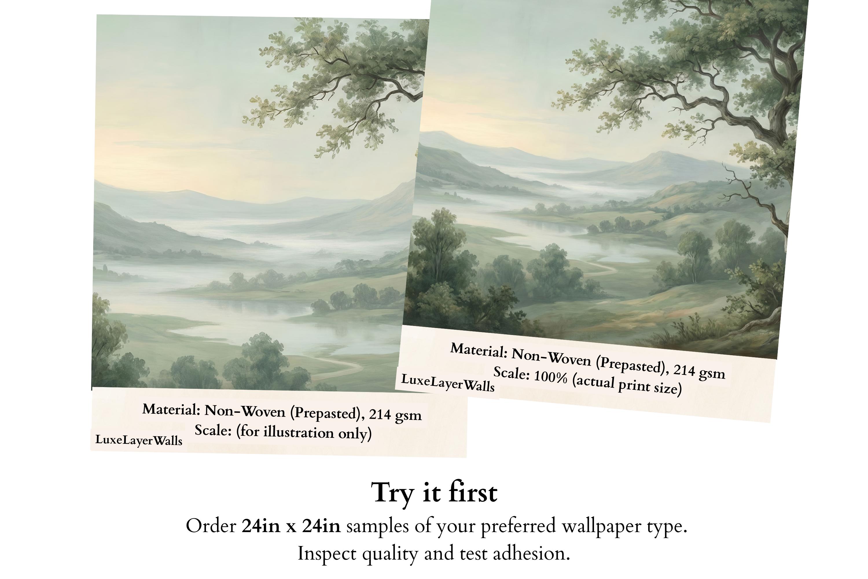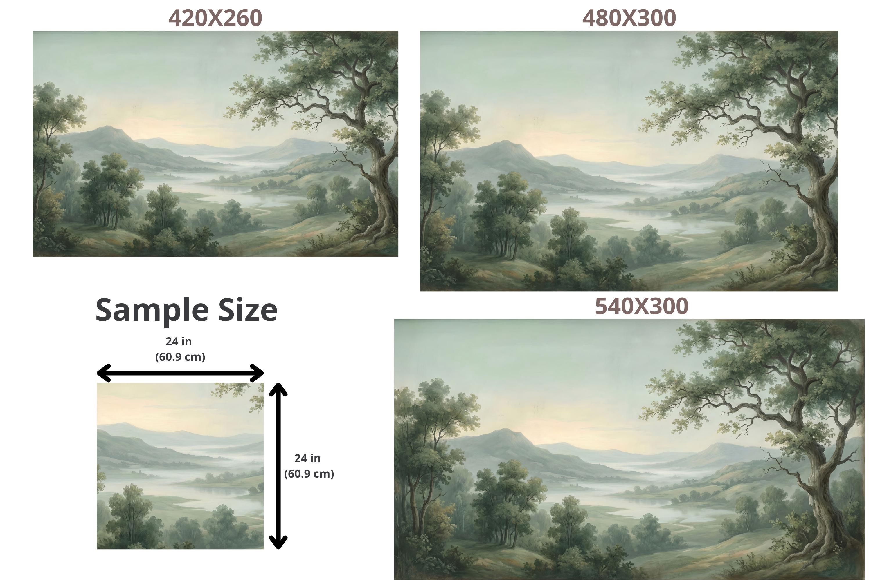 Inspired by vintage European landscape paintings, this mural blends muted greens and gentle atmospheric haze to create a peaceful, expansive effect — perfect for modern living rooms, bedrooms, or home offices.