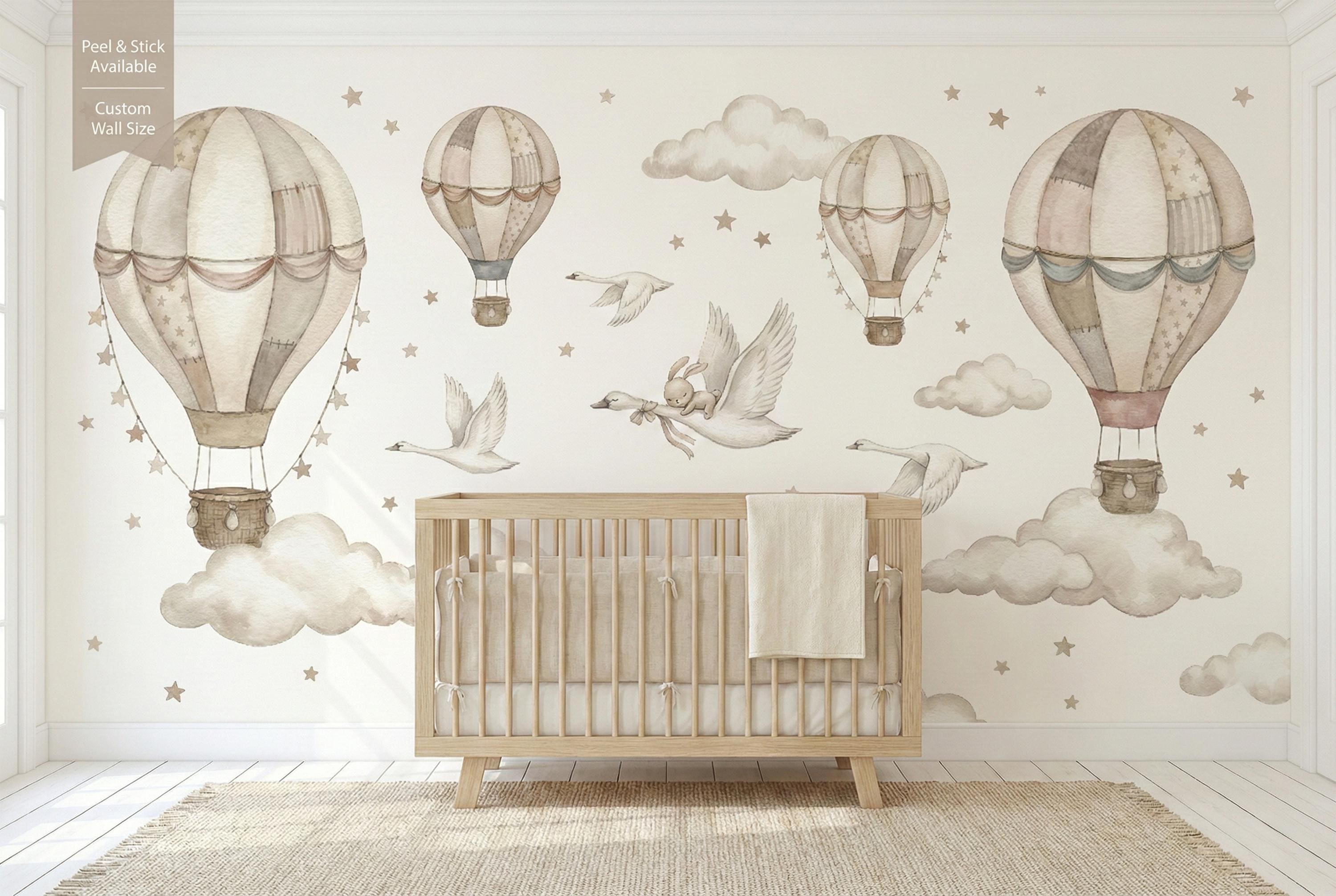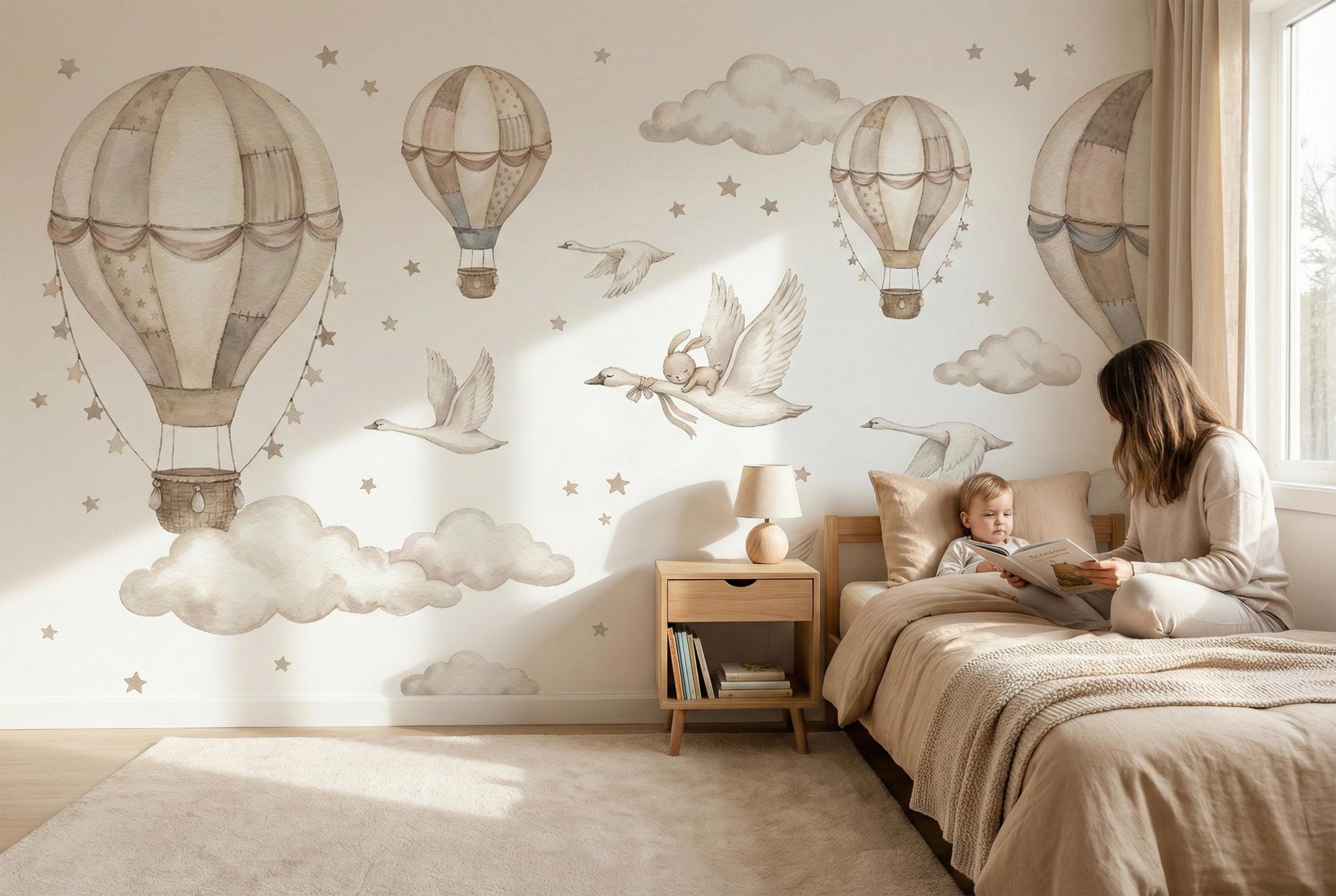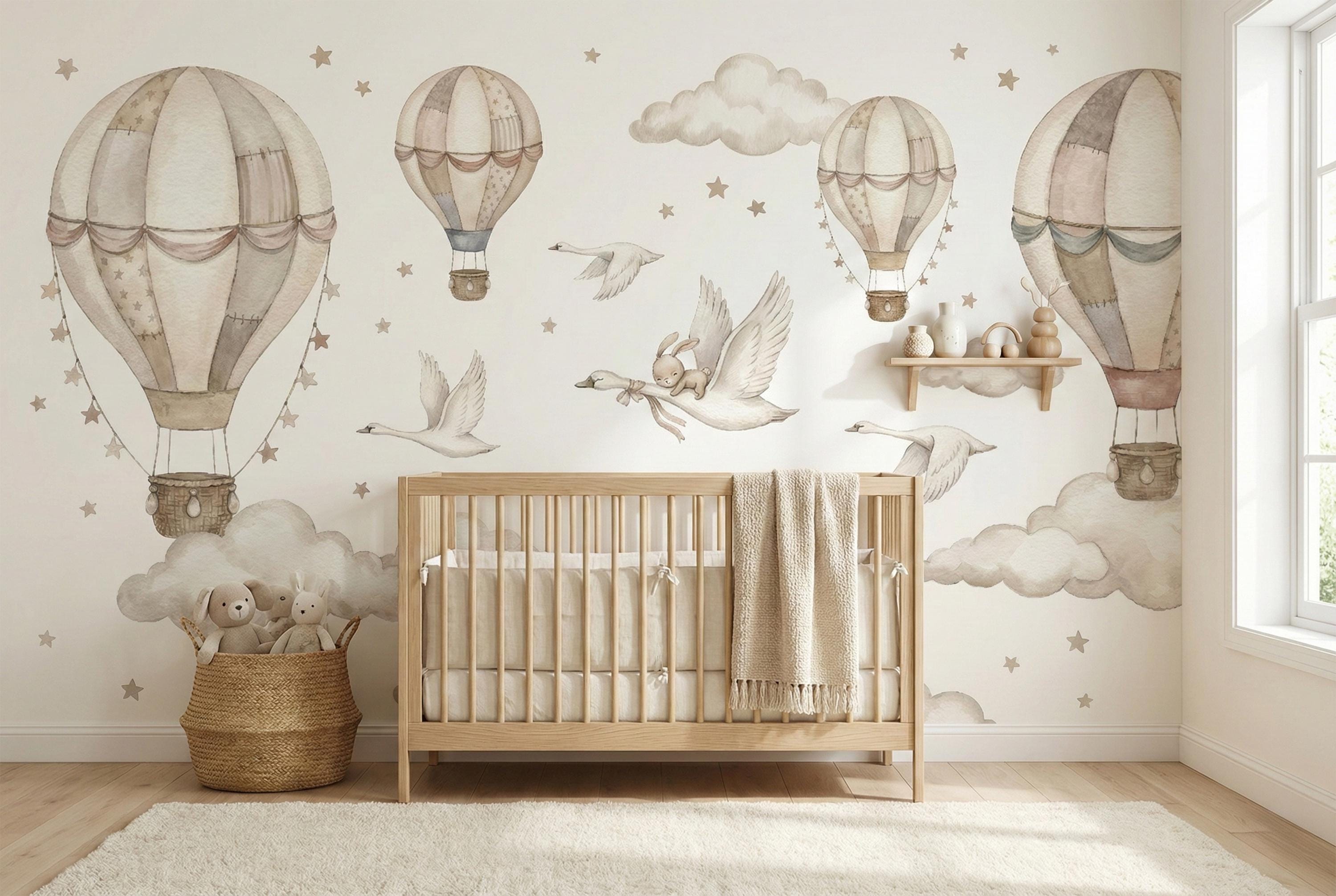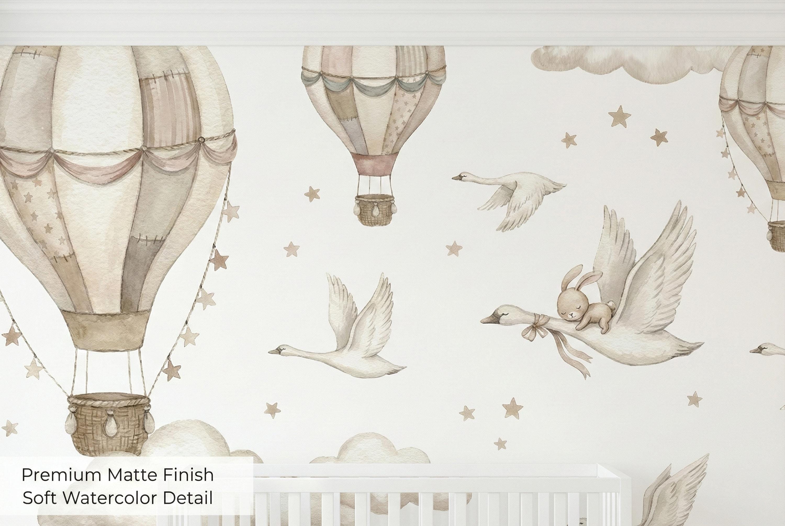 Soft watercolor hot air balloons, clouds, and star confetti keep the room light and calming, while the swan and bunny detail adds storybook charm.