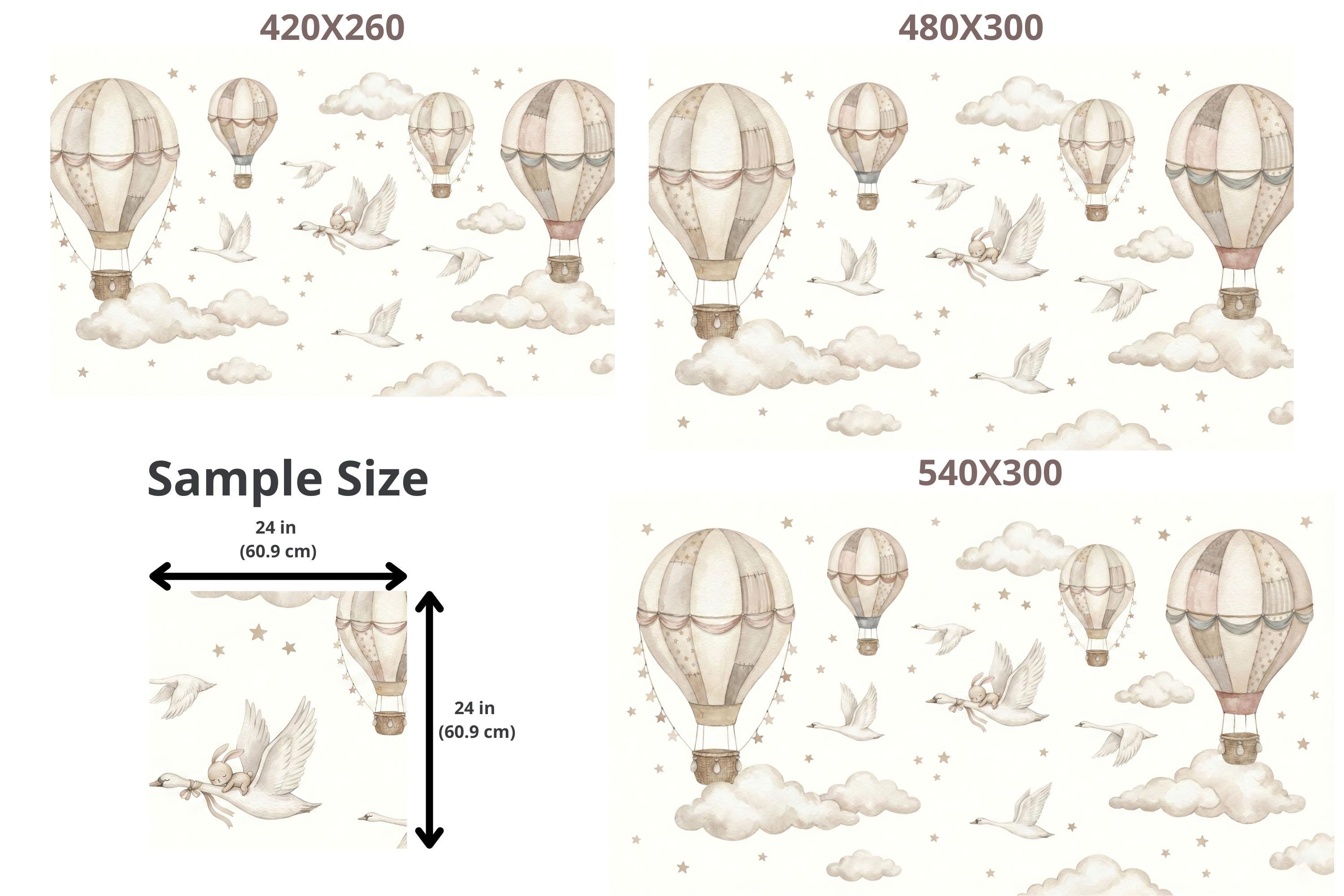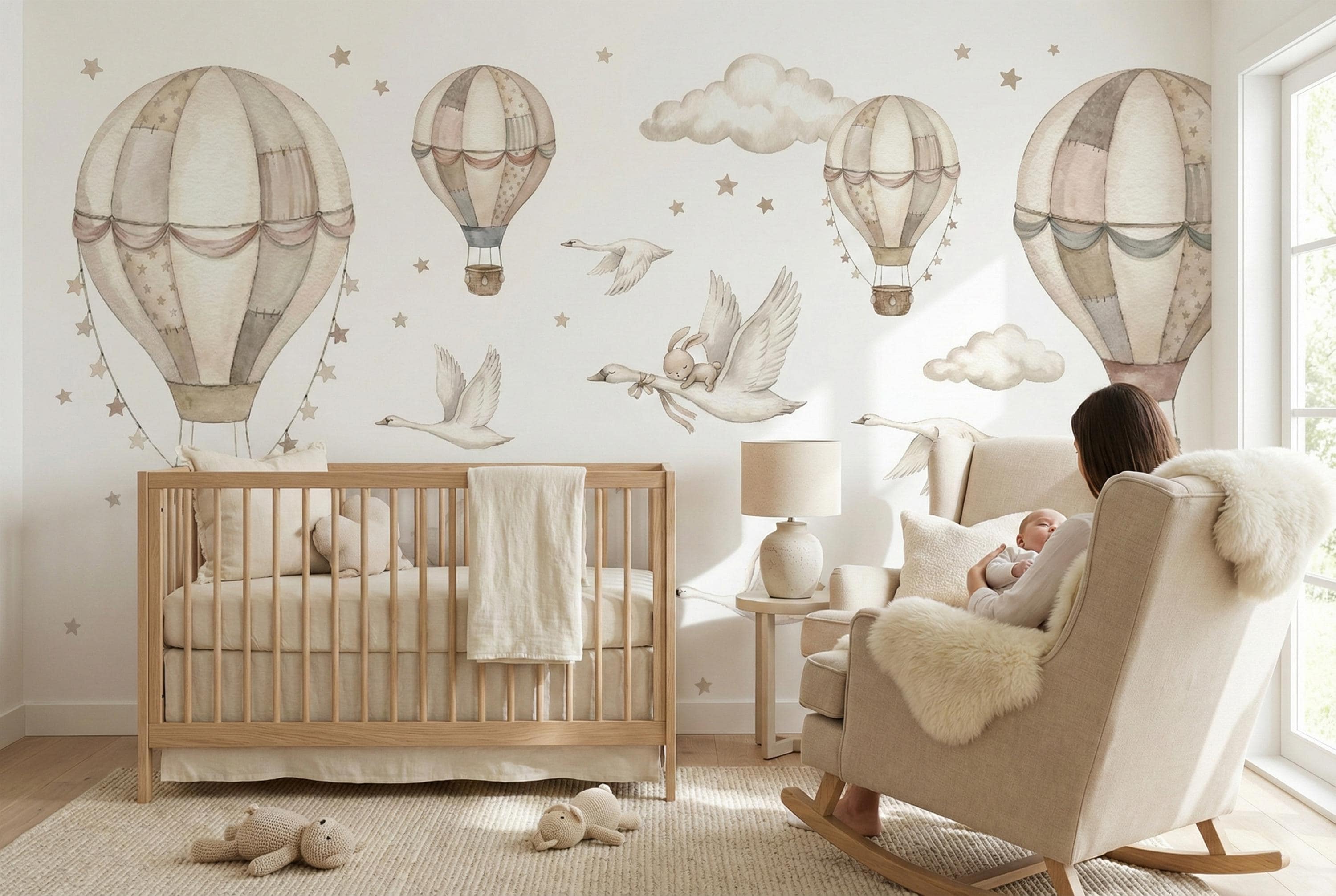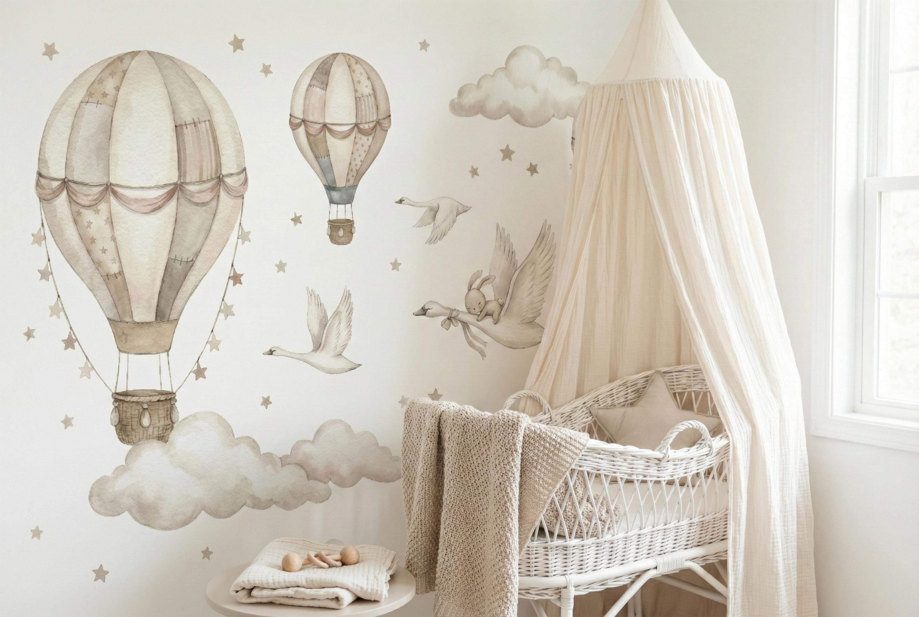 Soft watercolor hot air balloons, clouds, and star confetti keep the room light and calming, while the swan and bunny detail adds storybook charm.