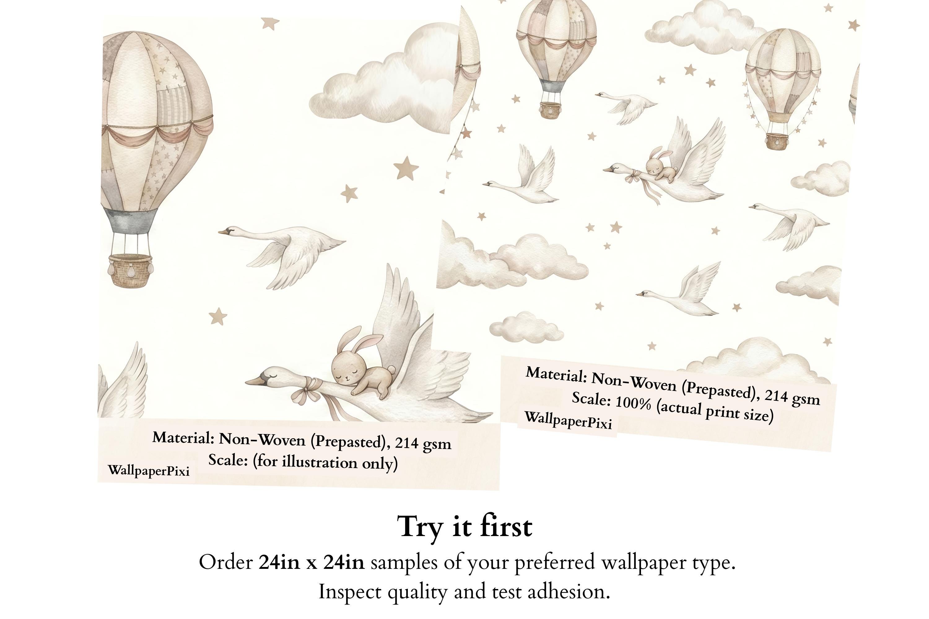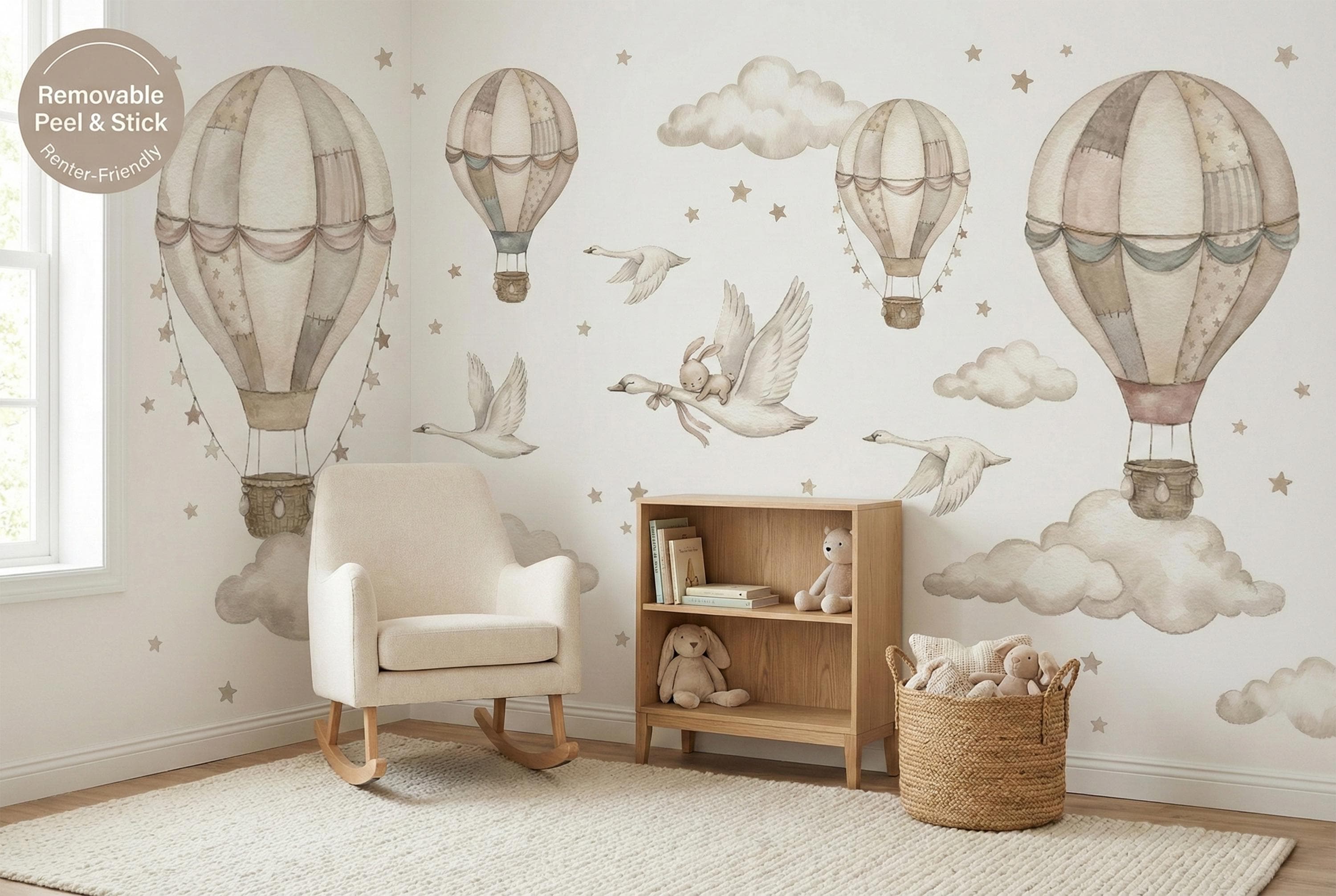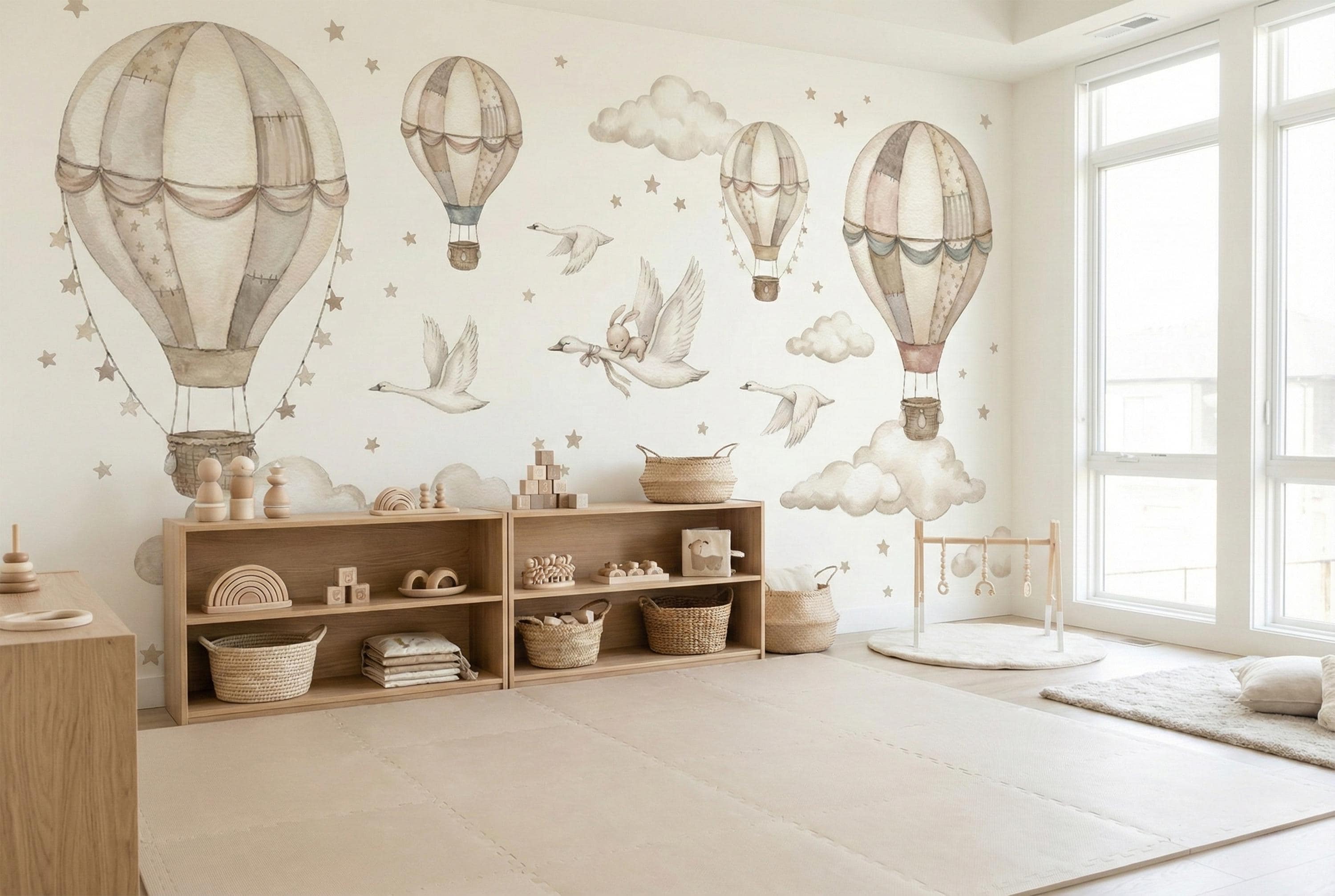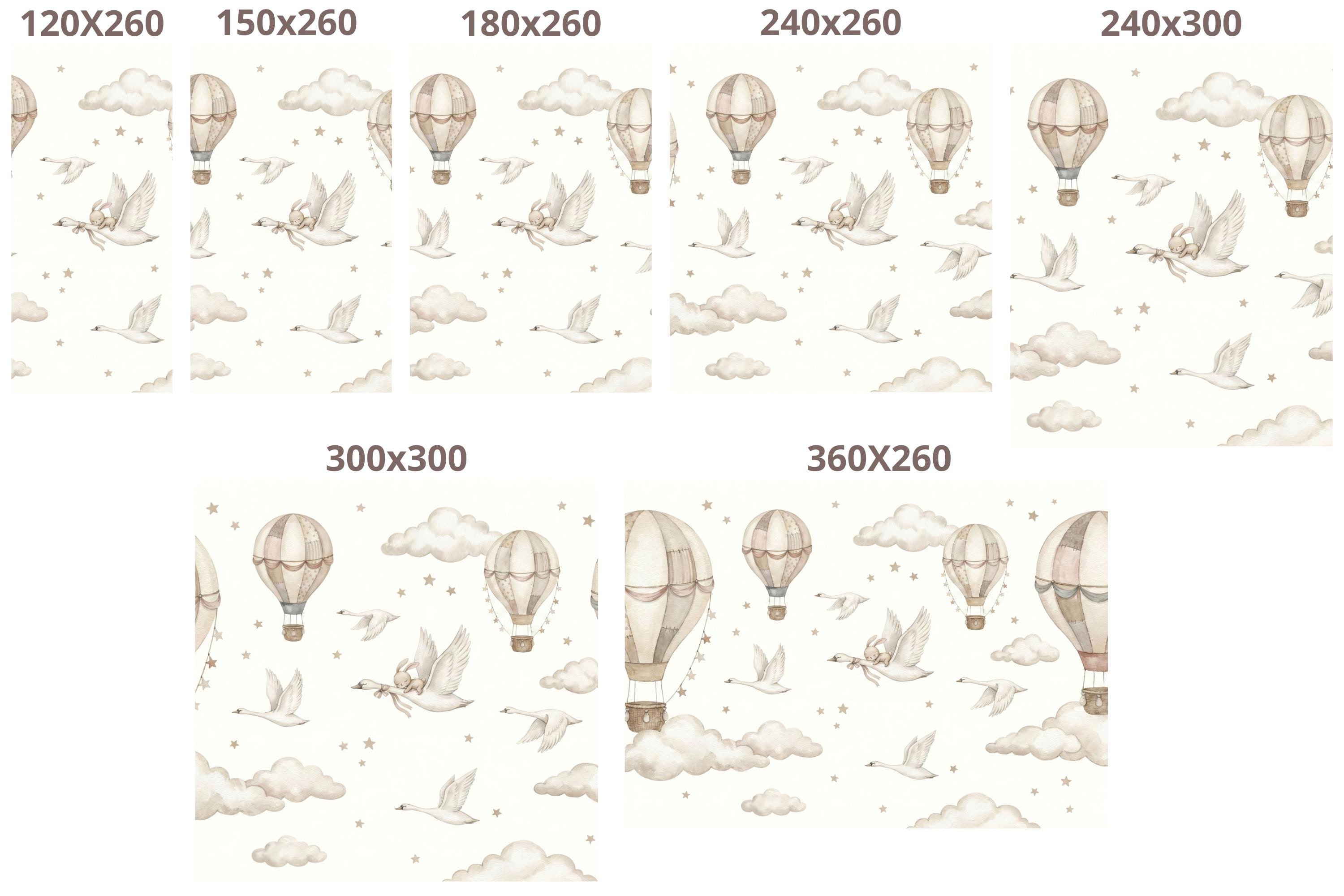 Soft watercolor hot air balloons, clouds, and star confetti keep the room light and calming, while the swan and bunny detail adds storybook charm.