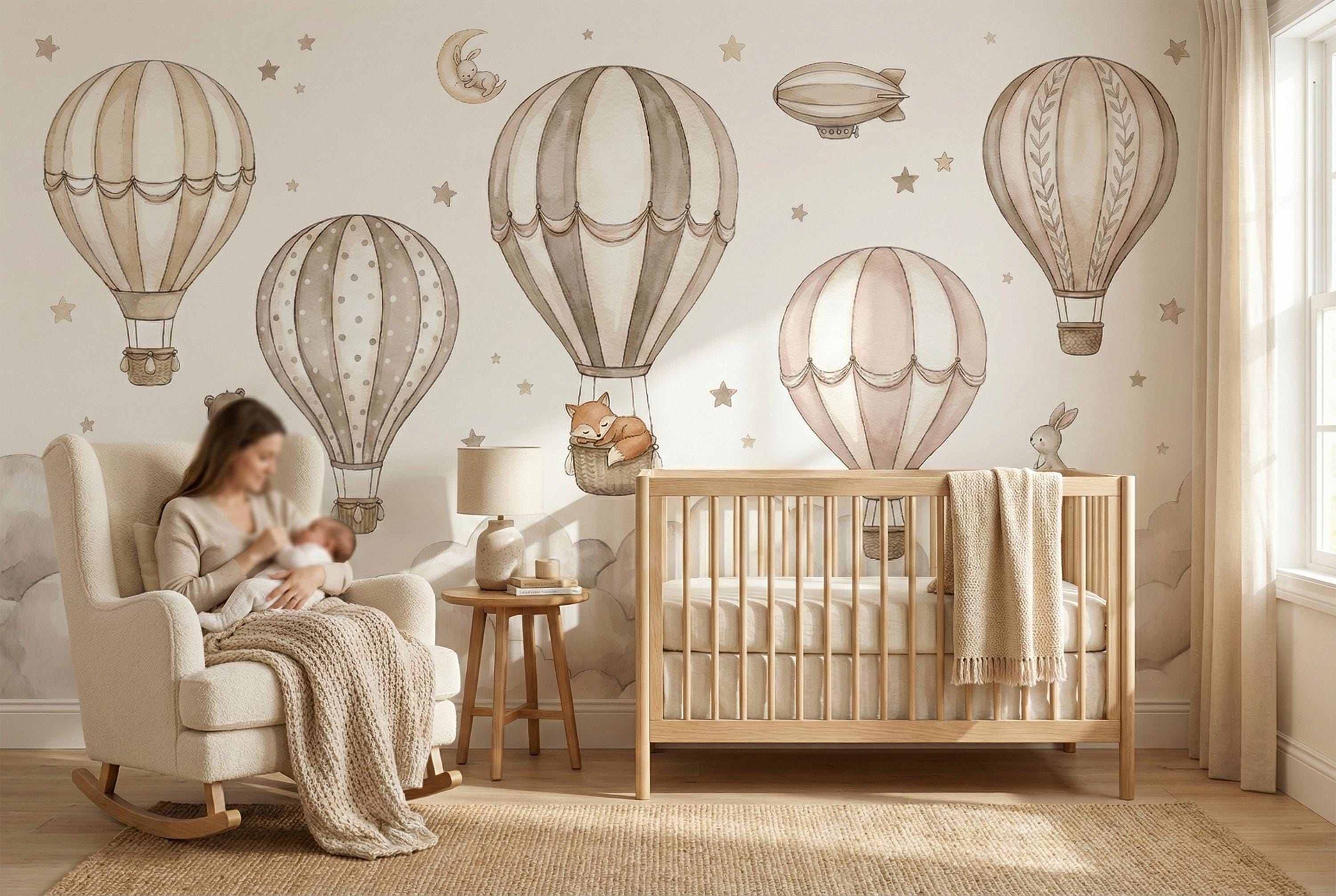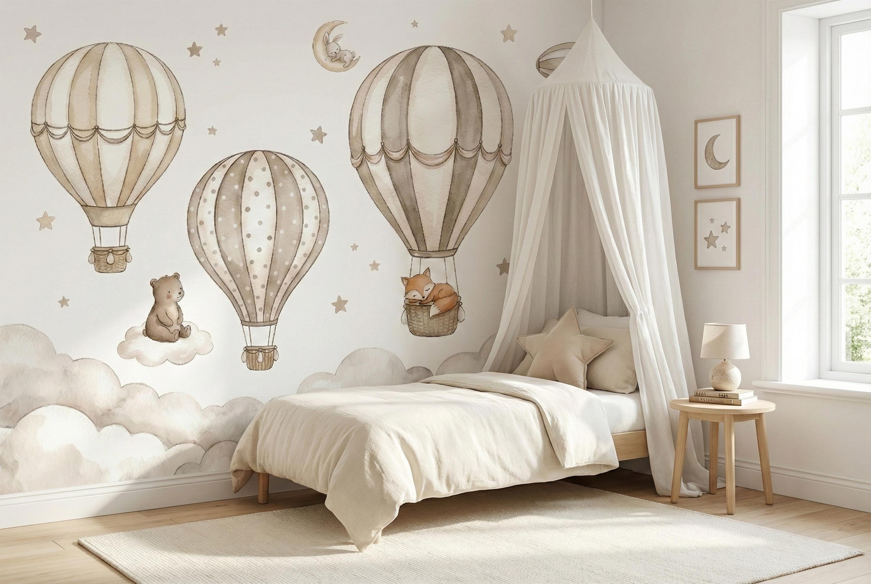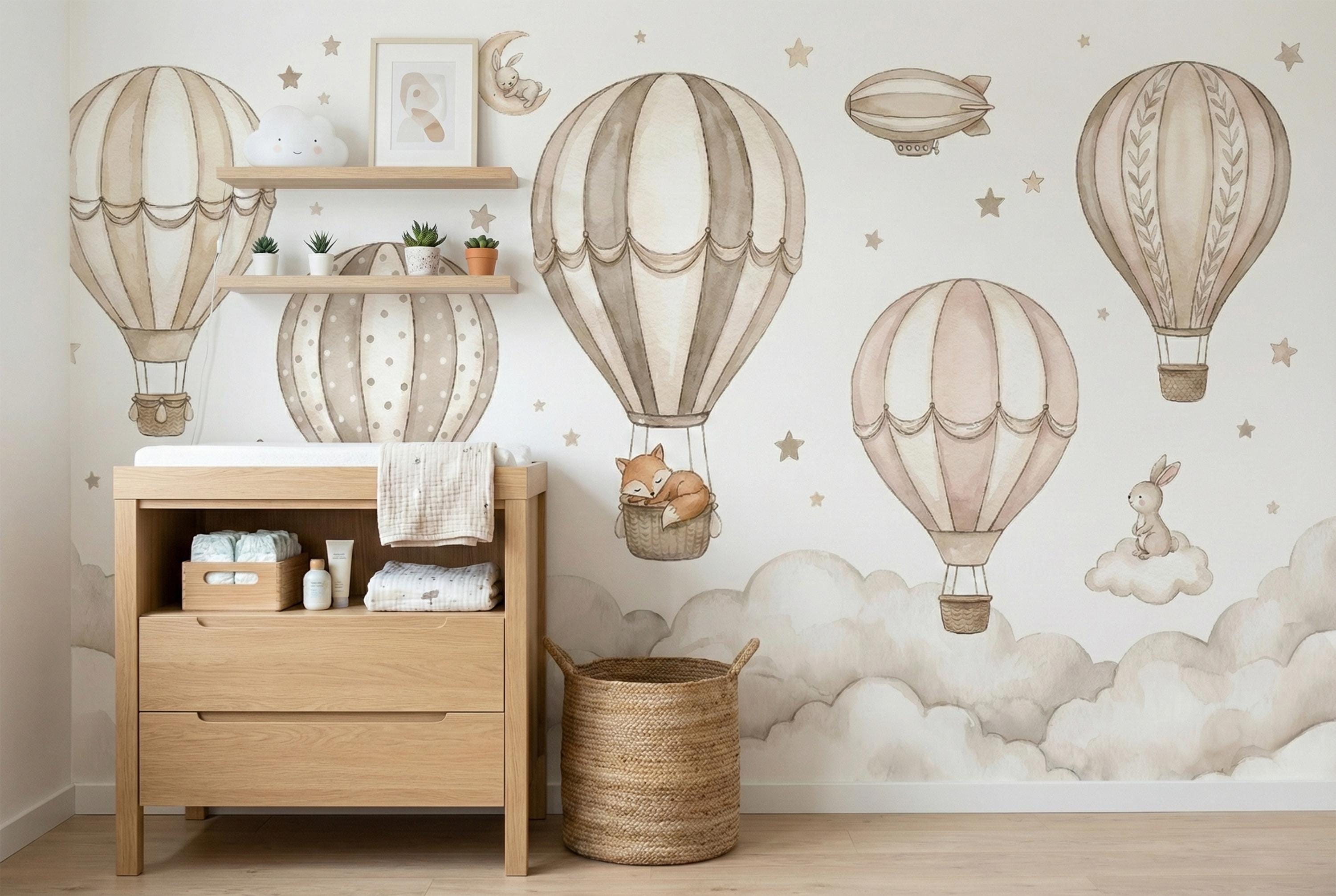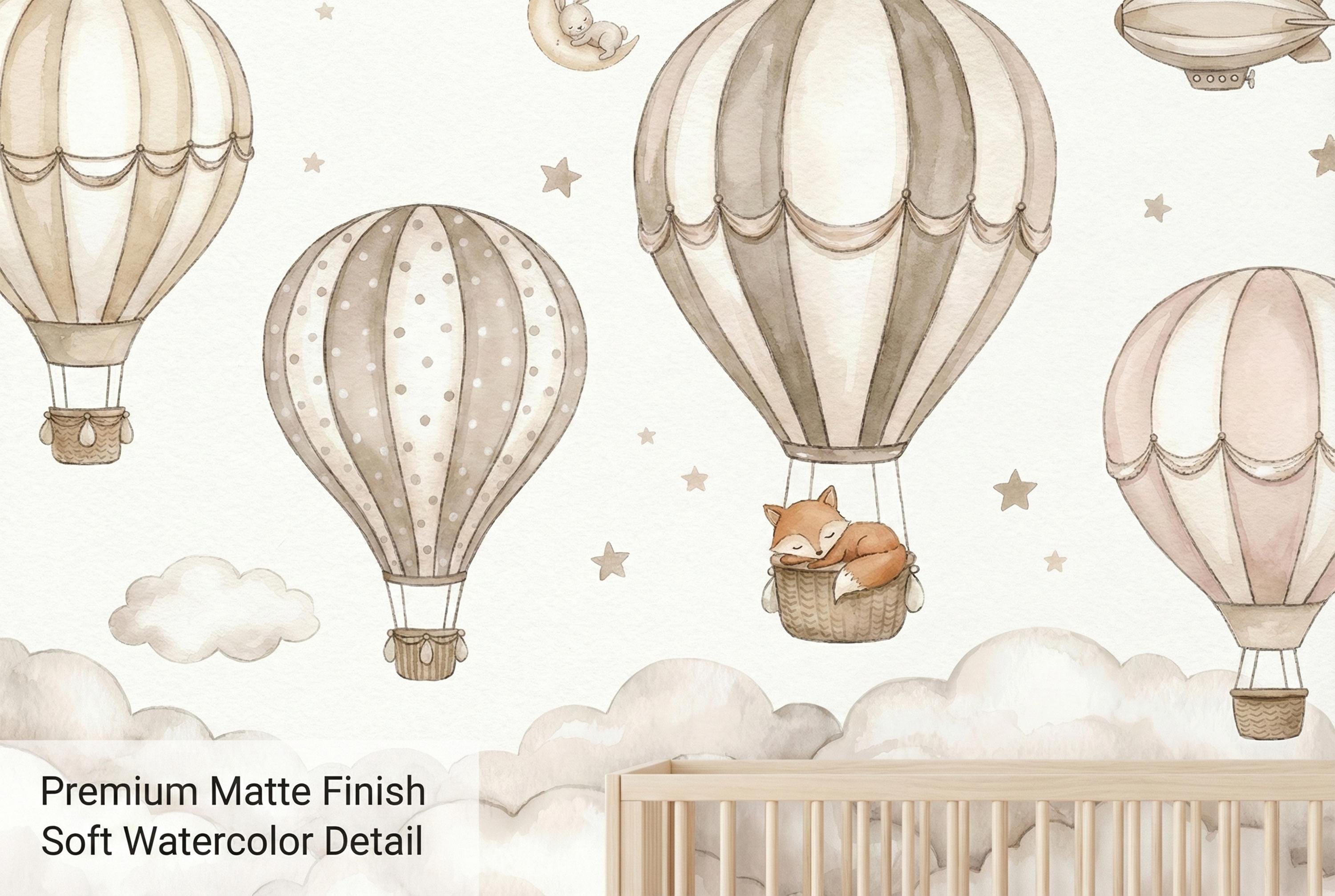Create a soft, storybook nursery with this neutral hot air balloon nursery wallpaper designed for modern baby spaces. This custom wall mural features watercolor air balloons floating above fluffy clouds with sweet woodland animals, perfect for a calm and cozy baby room wallpaper setup.