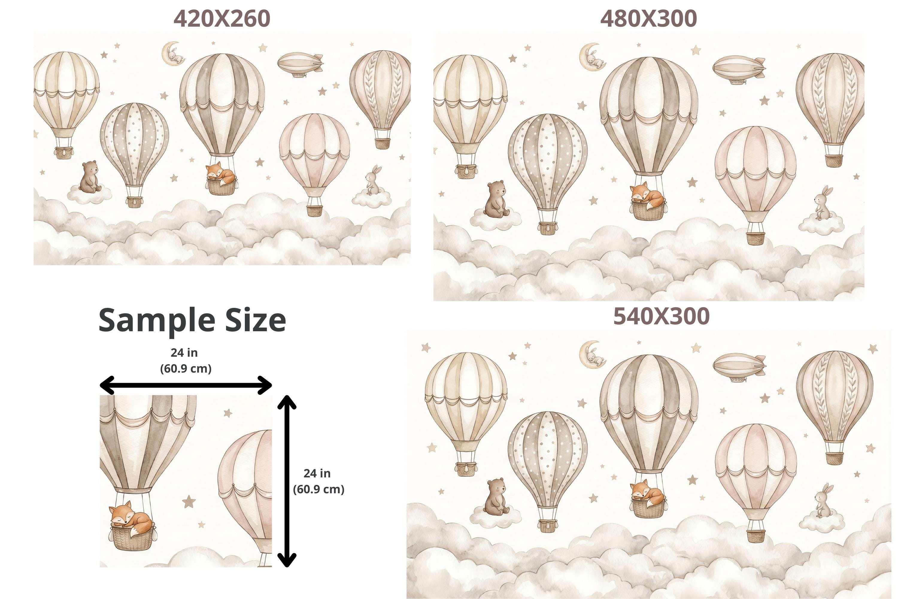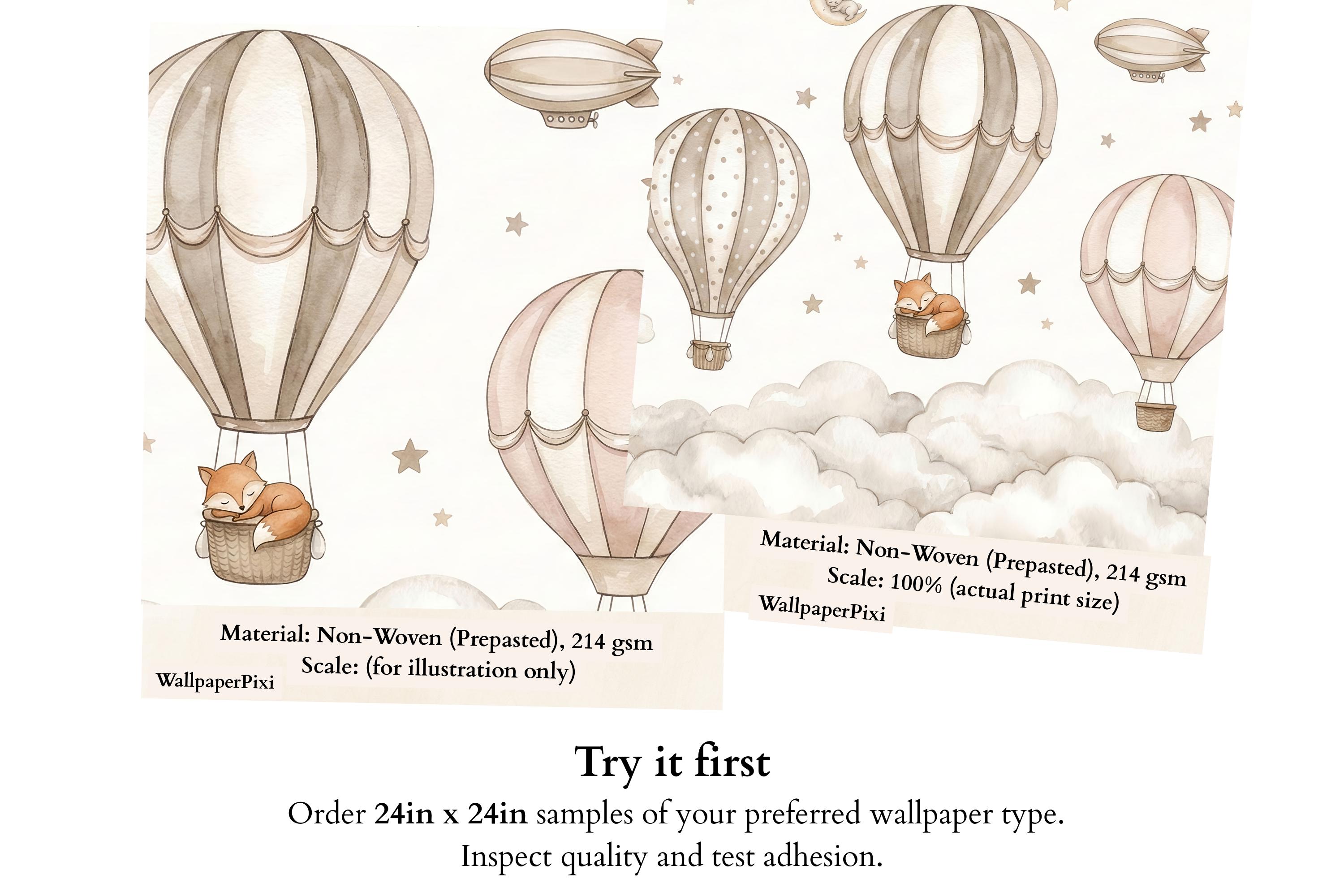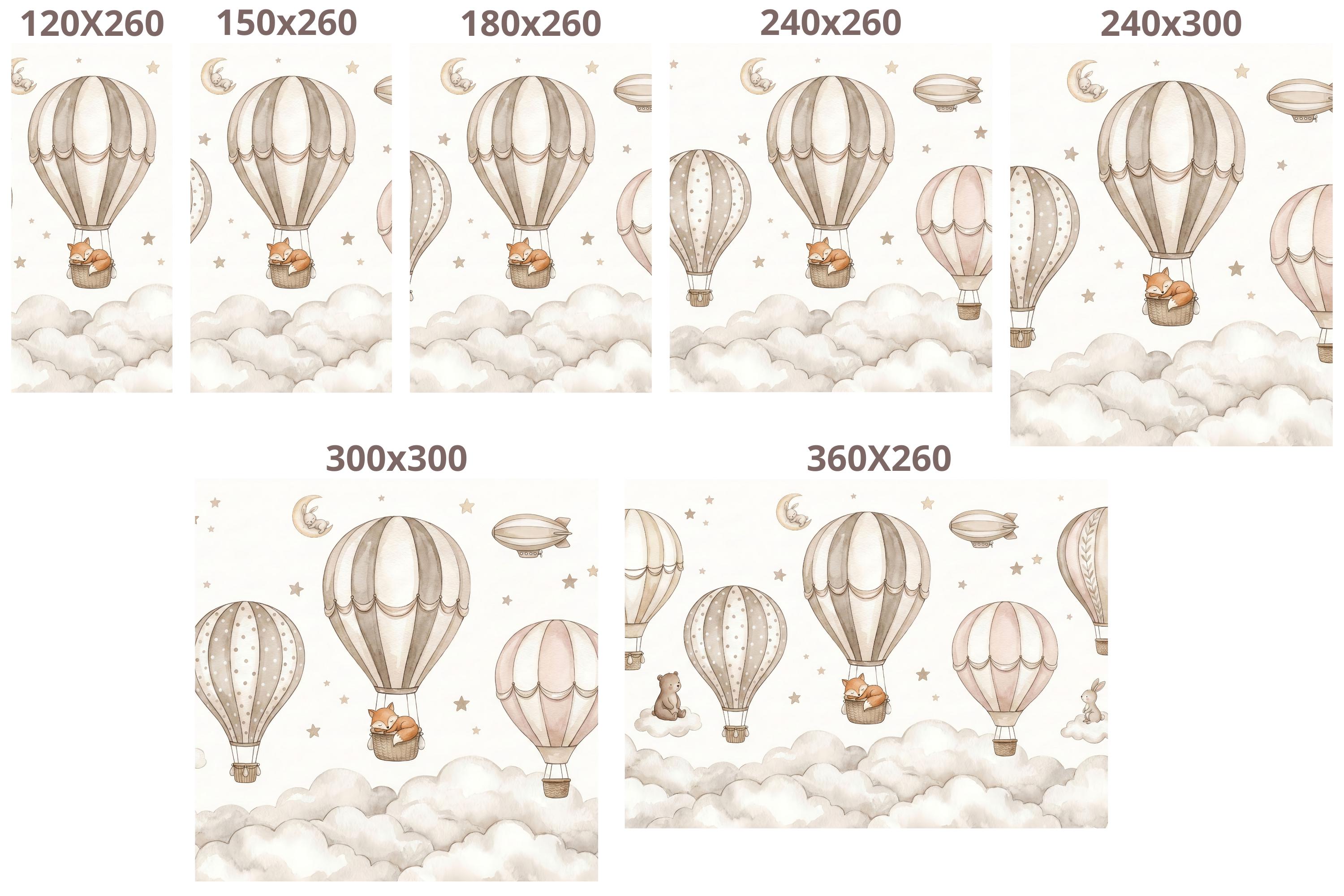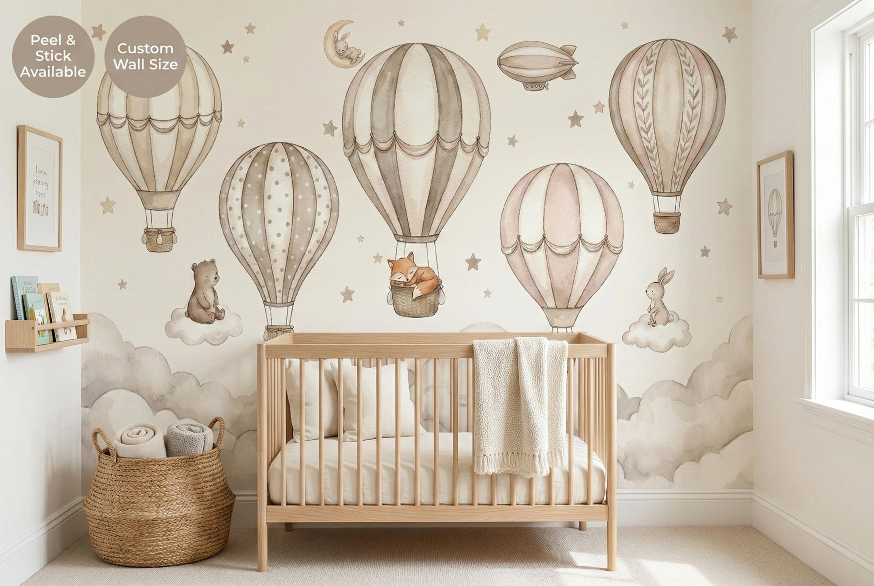 Create a soft, storybook nursery with this neutral hot air balloon nursery wallpaper designed for modern baby spaces. This custom wall mural features watercolor air balloons floating above fluffy clouds with sweet woodland animals, perfect for a calm and cozy baby room wallpaper setup.