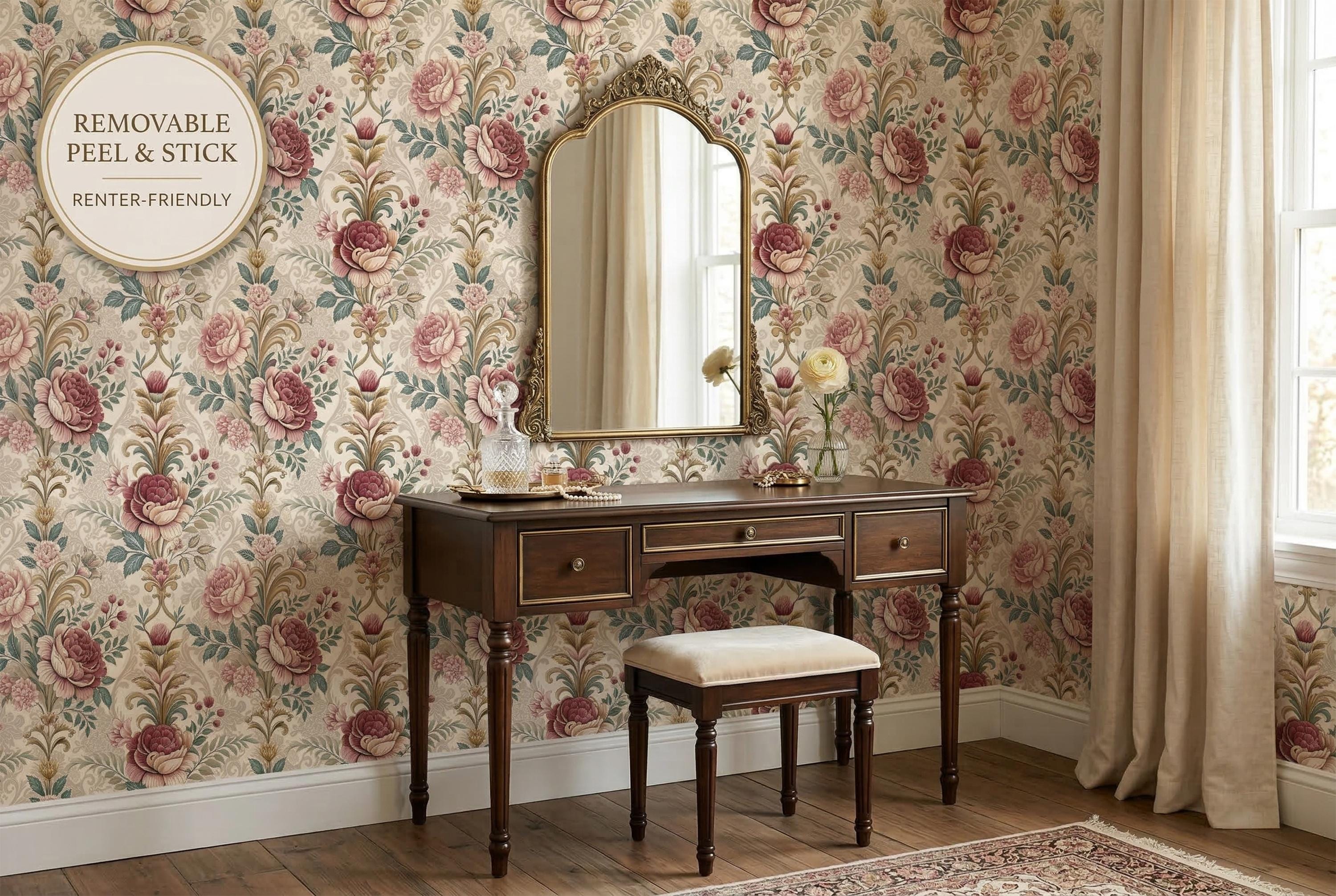 Bring timeless elegance to your home with this vintage peony damask wallpaper. Large blush and dusty rose peonies with rich burgundy accents bloom over a soft beige damask background, finished with refined gold scroll details for a classic, luxurious look.