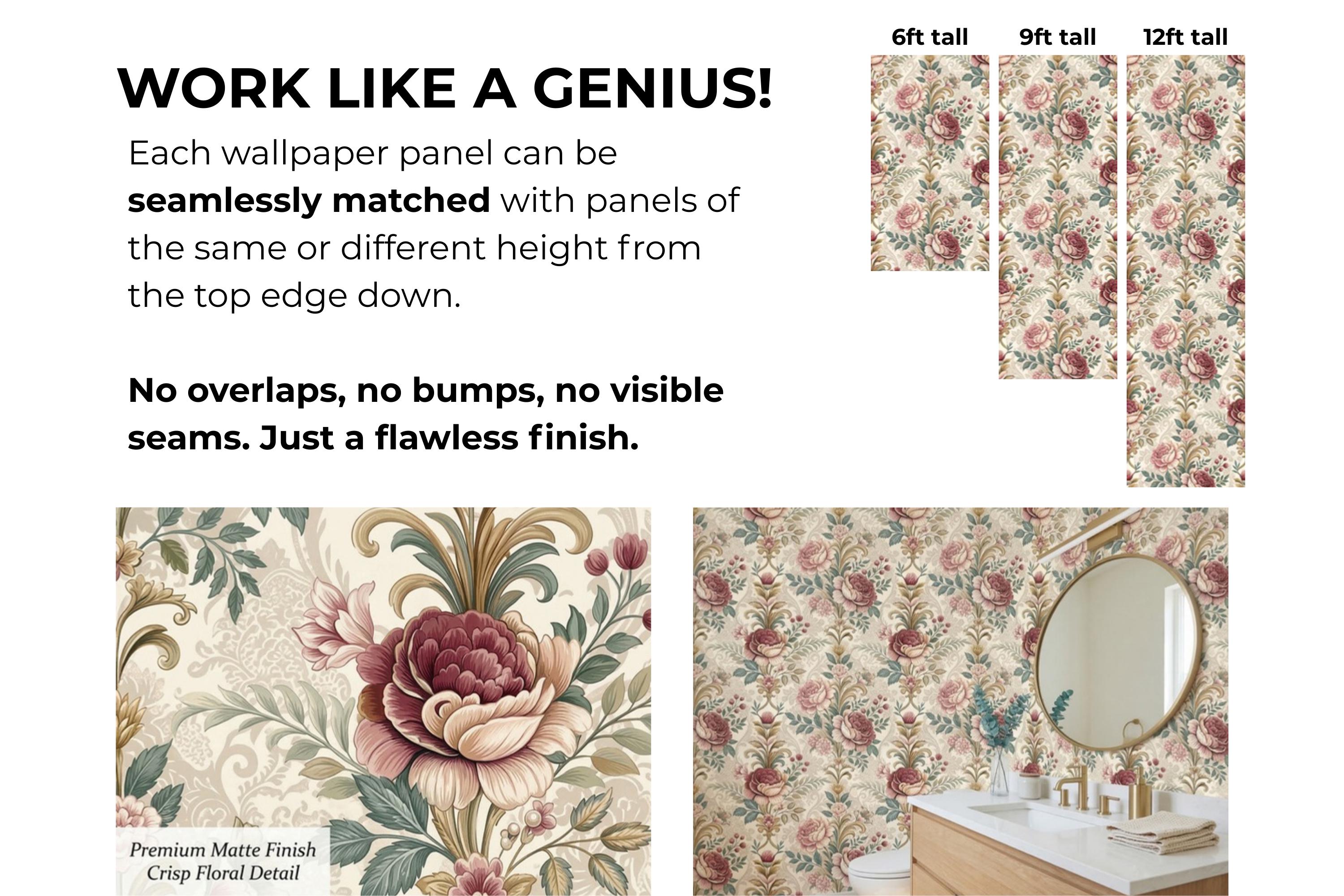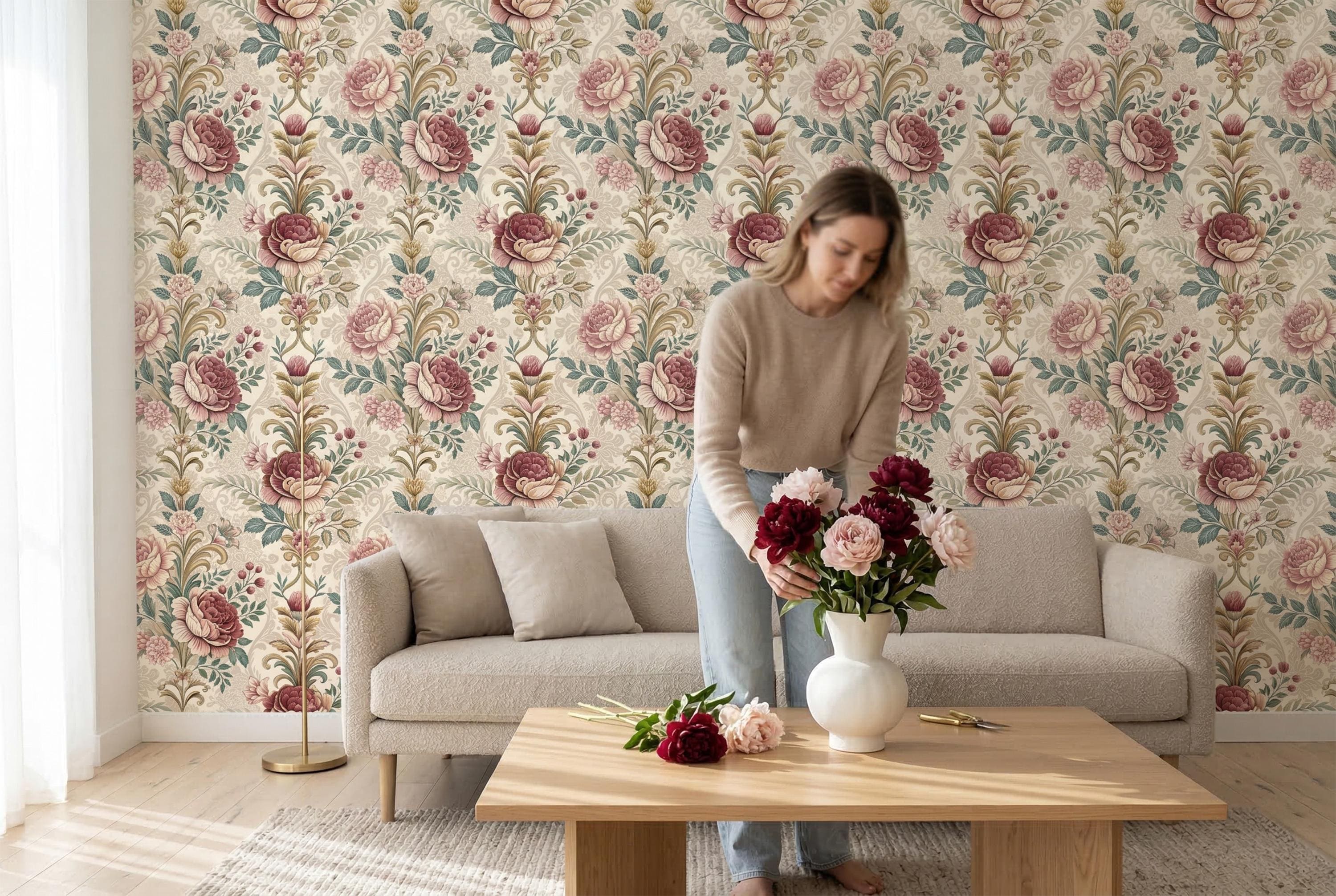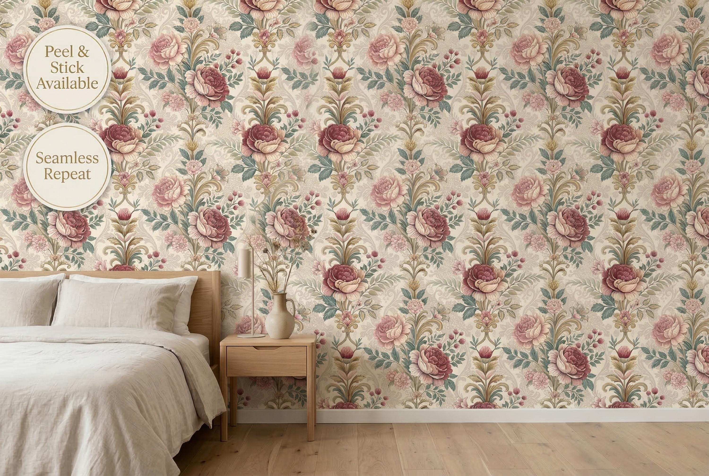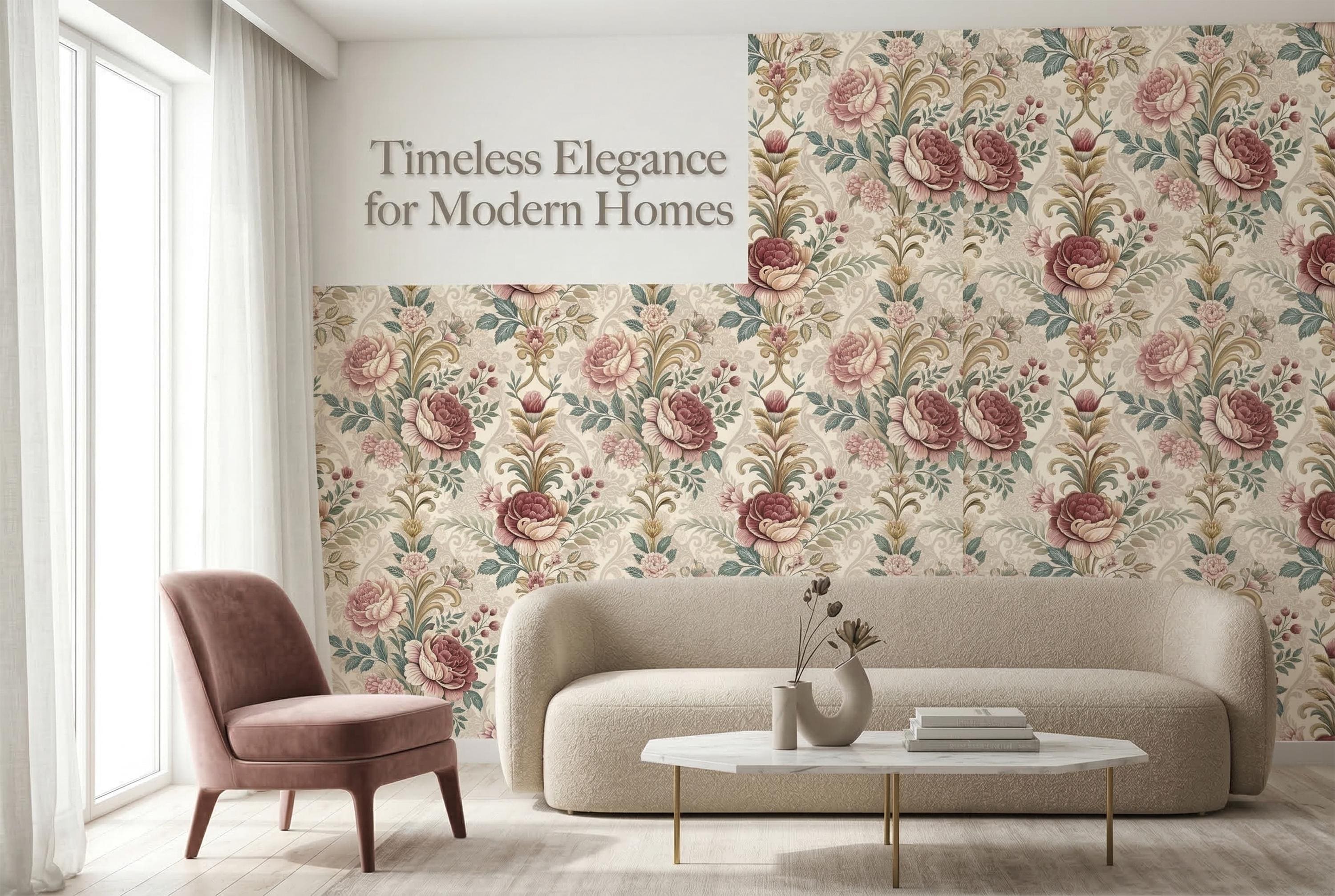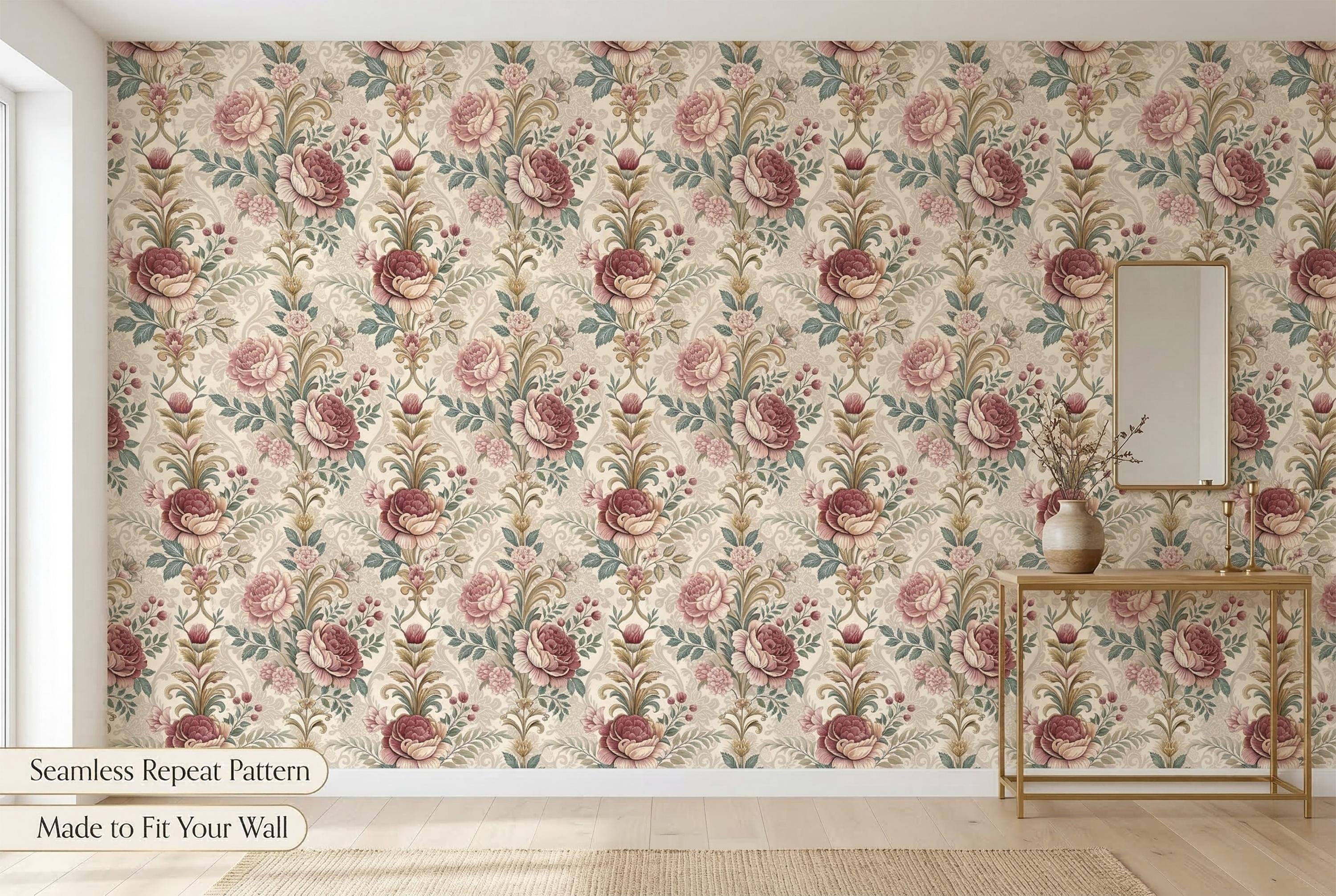Designed as a seamless repeating pattern, it creates a continuous statement wall that feels romantic and sophisticated without overwhelming the space. The warm neutral palette pairs beautifully with cream textiles, brass accents, natural wood furniture, and modern classic or vintage interiors.
