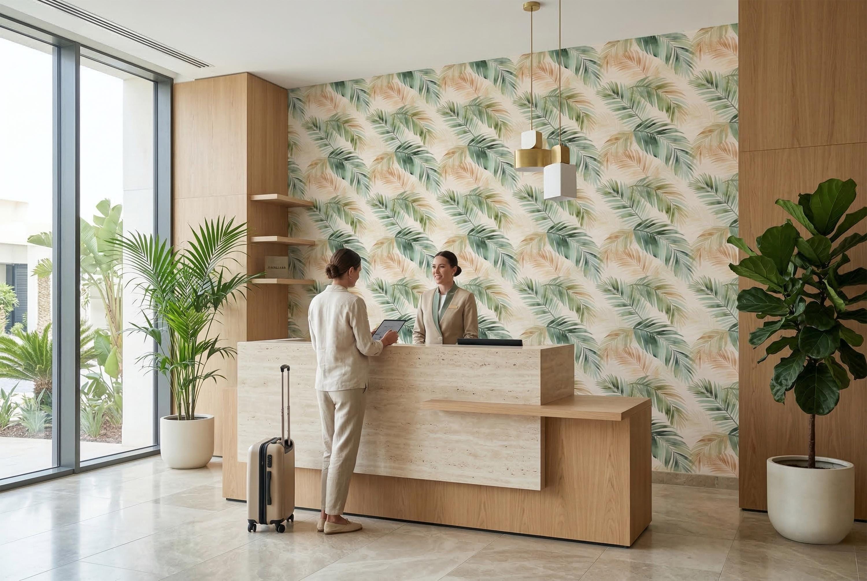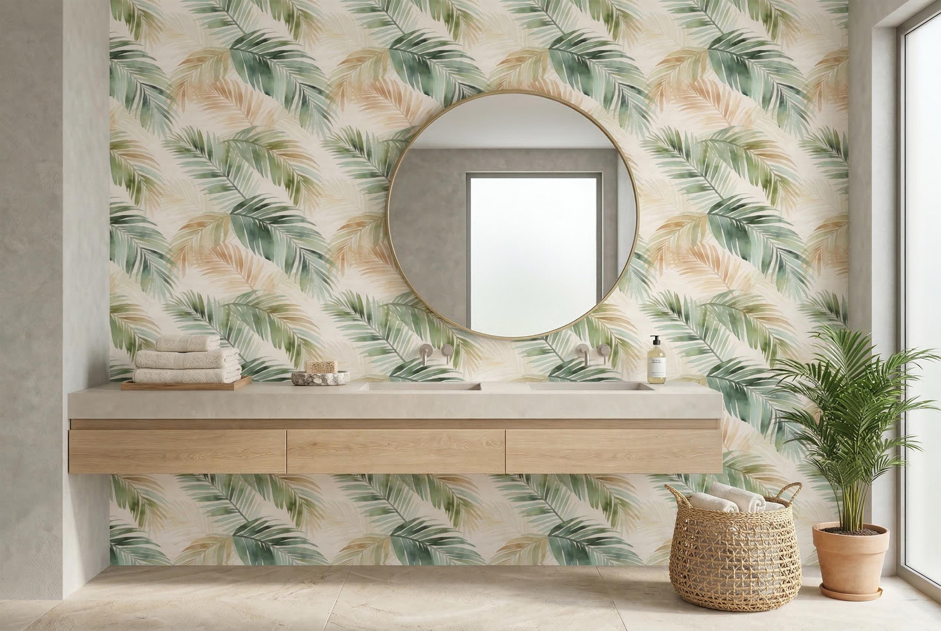 This is the wallpaper that interior stylists reach for when they want a space to feel simultaneously relaxed and refined. It's organic without being rustic. Tropical without being loud. It transforms a bedroom into a retreat, a bathroom into a spa, a living room into a place you never want to leave.