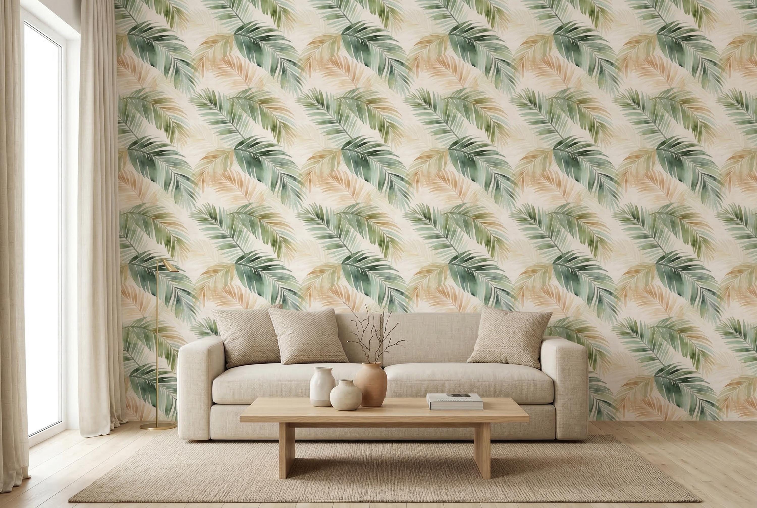 Bring the calm of a sun-drenched tropical morning into your home with this breathtaking Watercolor Palm Leaf Wallpaper Mural by WallpaperPixi. Oversized palm fronds in layered sage green, dusty terracotta, and warm golden beige drift across a soft ivory background β loose, painterly, and alive with the quiet energy of nature.