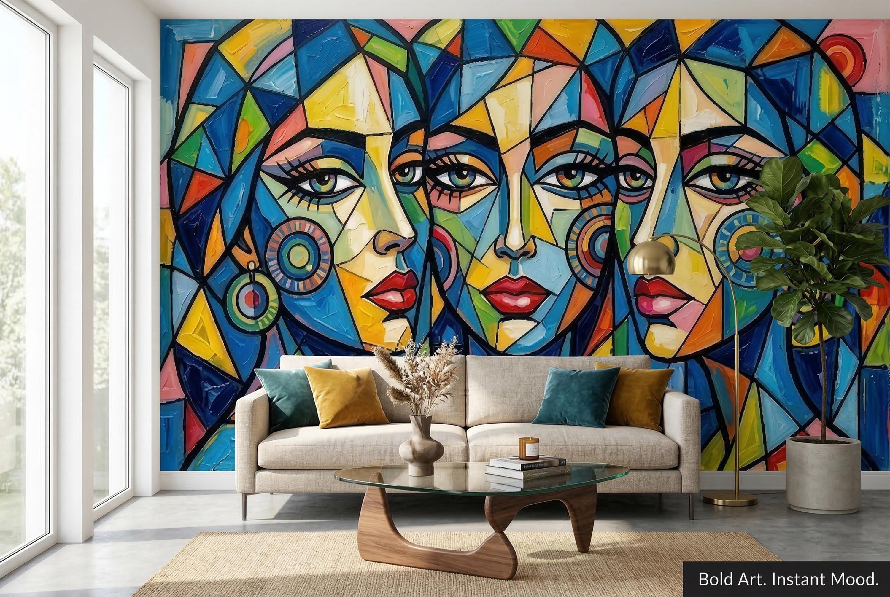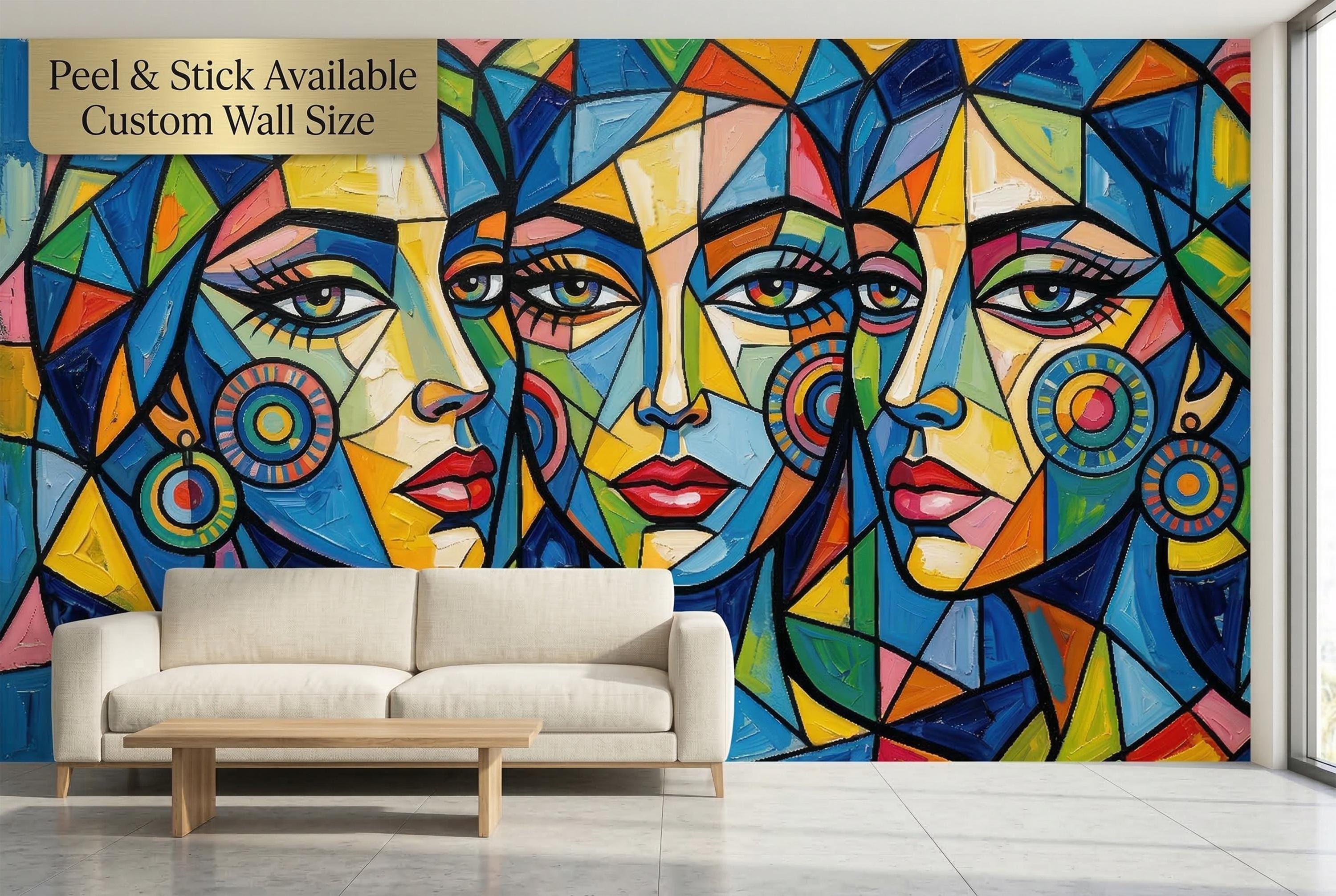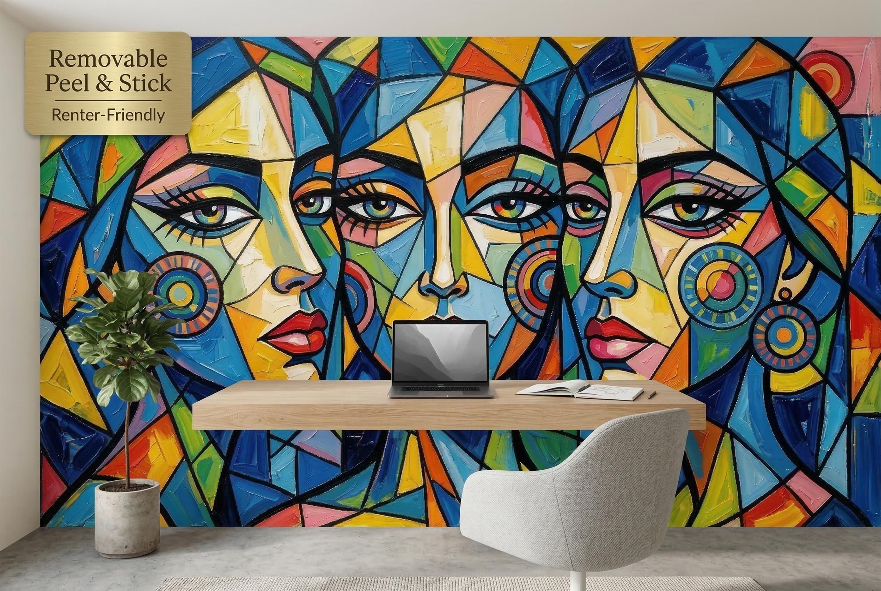 🎨 Cubist Abstract Women Face Peel & Stick Wallpaper — Bold Colorful Art Mural