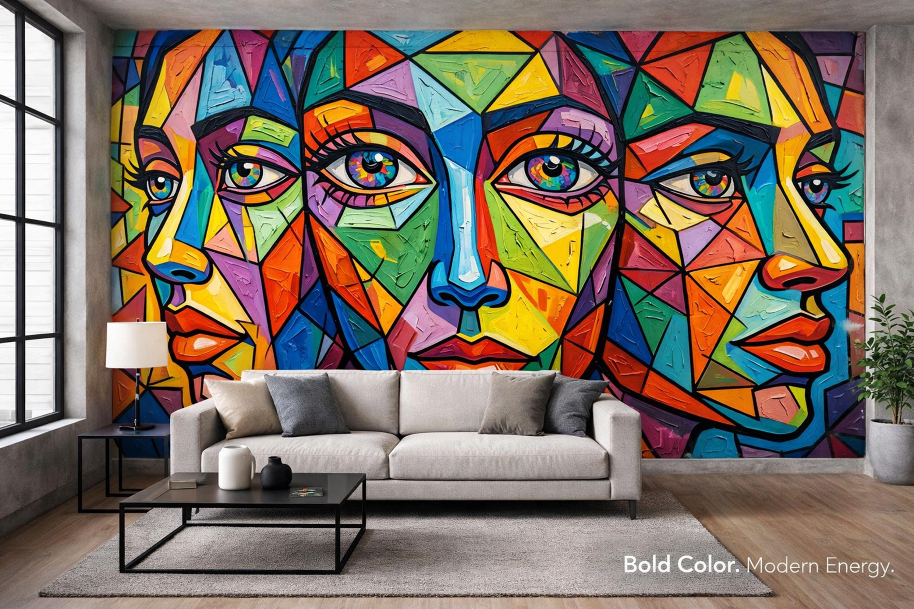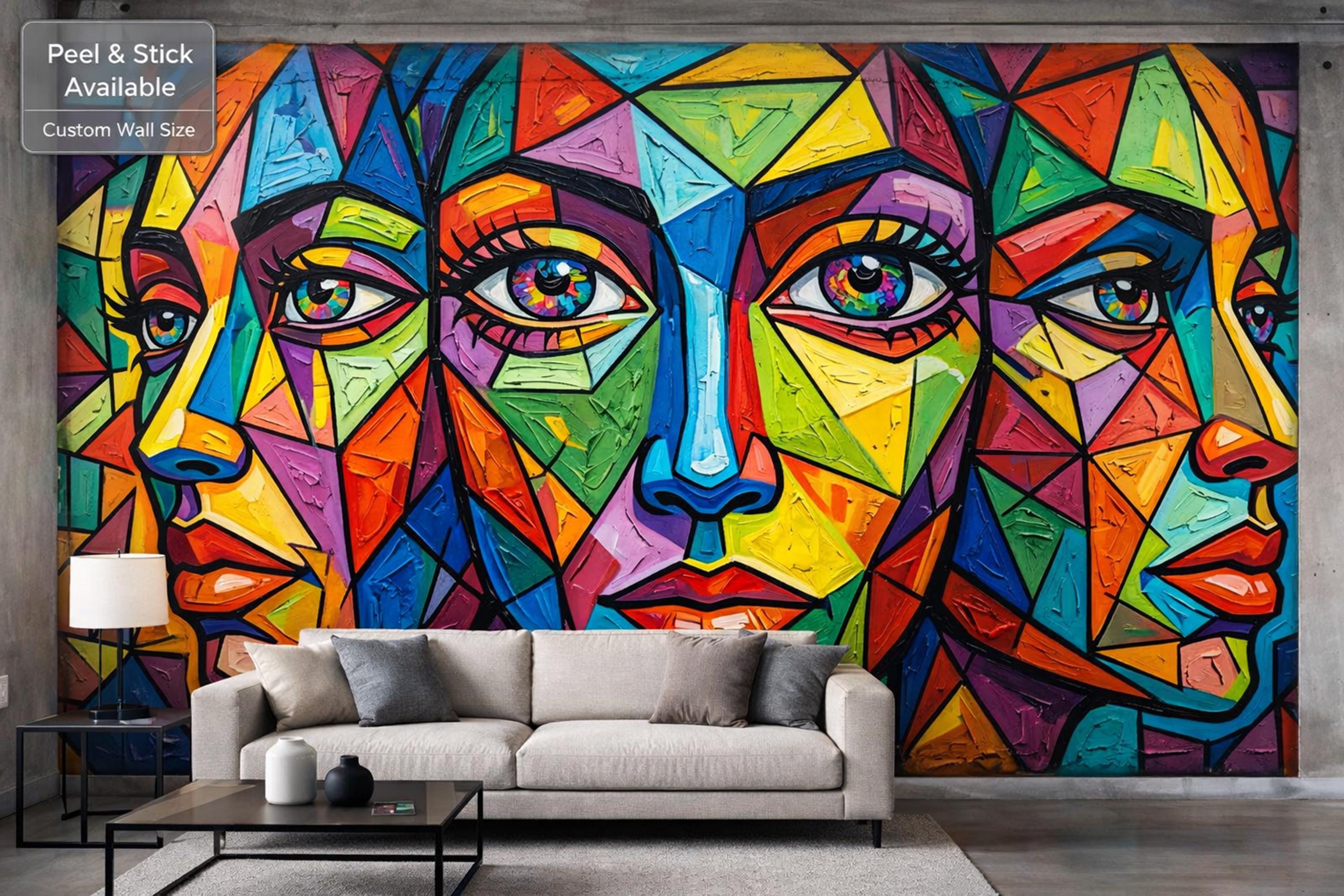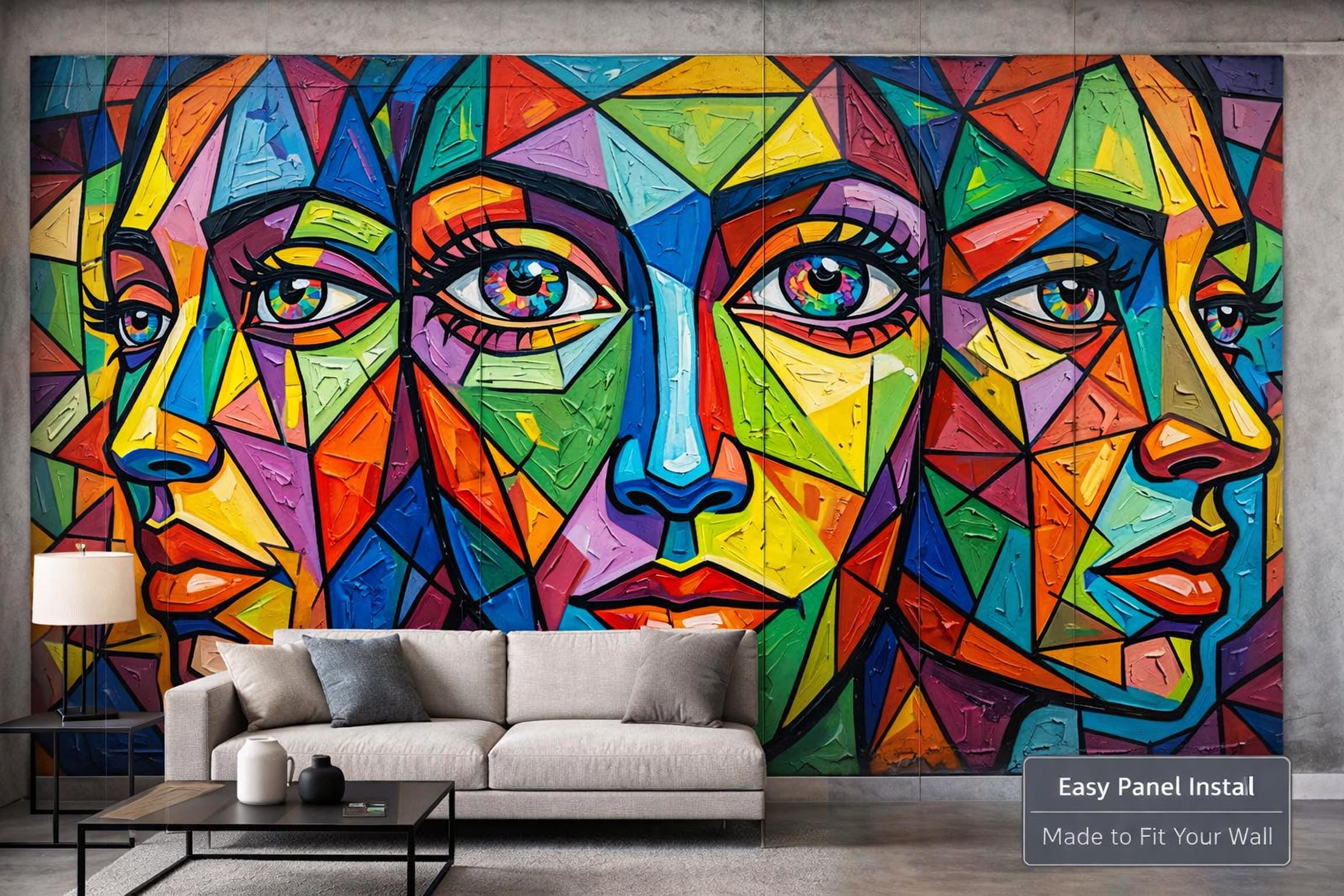 This is what happens when the most electric corner of a world-class city comes home with you. This breathtaking Street Art Geometric Women Face Wallpaper Mural by WallpaperPixi delivers the full impact of large-scale urban mural art β three monumental female faces, each fragmented into a blazing mosaic of geometric colour planes, stare out from the wall with eyes that contain entire kaleidoscopes: swirling rings of teal, green, blue, red, and yellow that feel like looking into something alive and infinite.