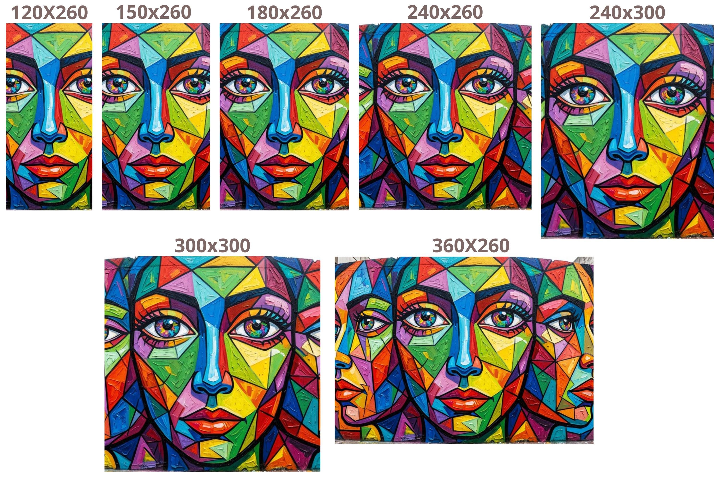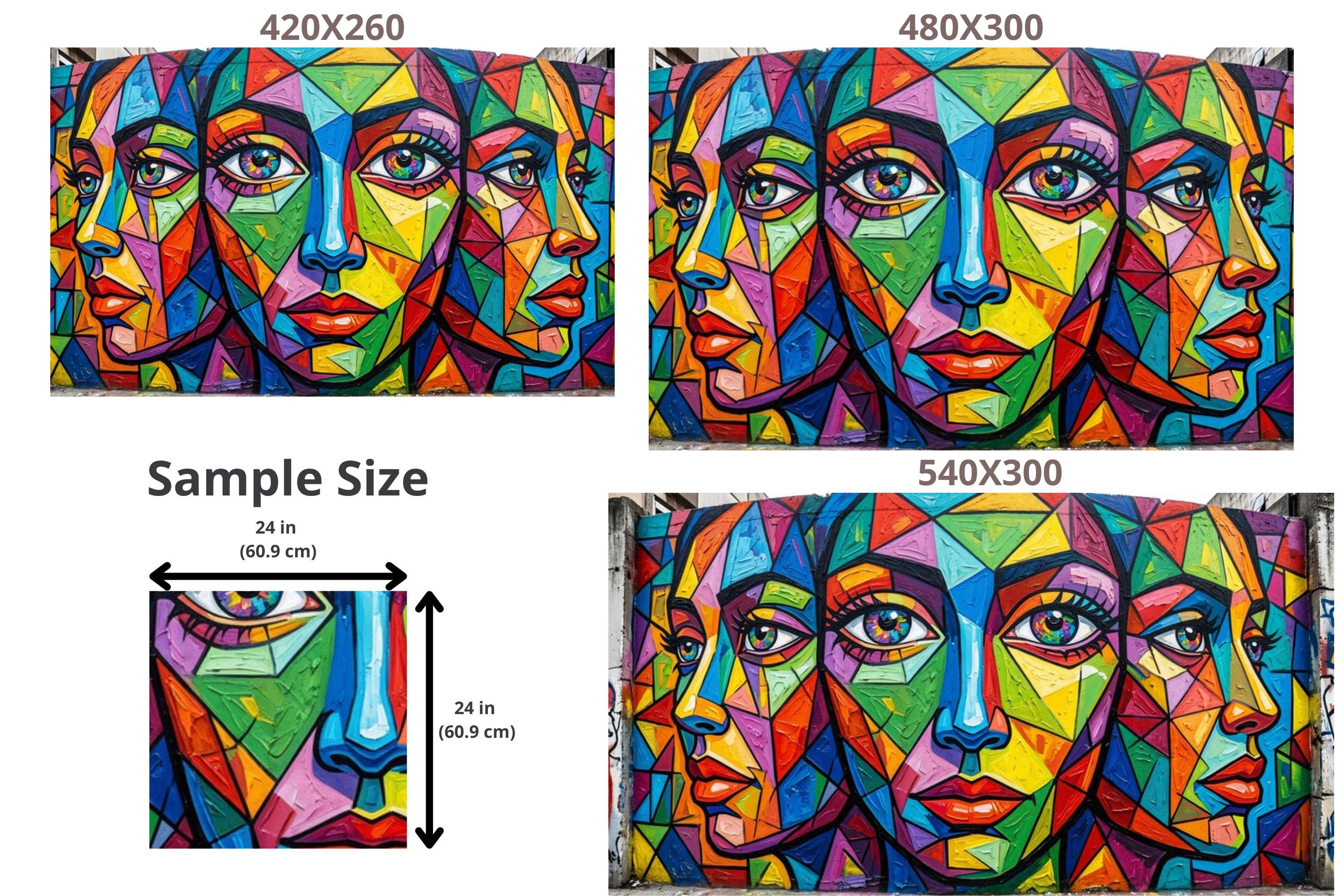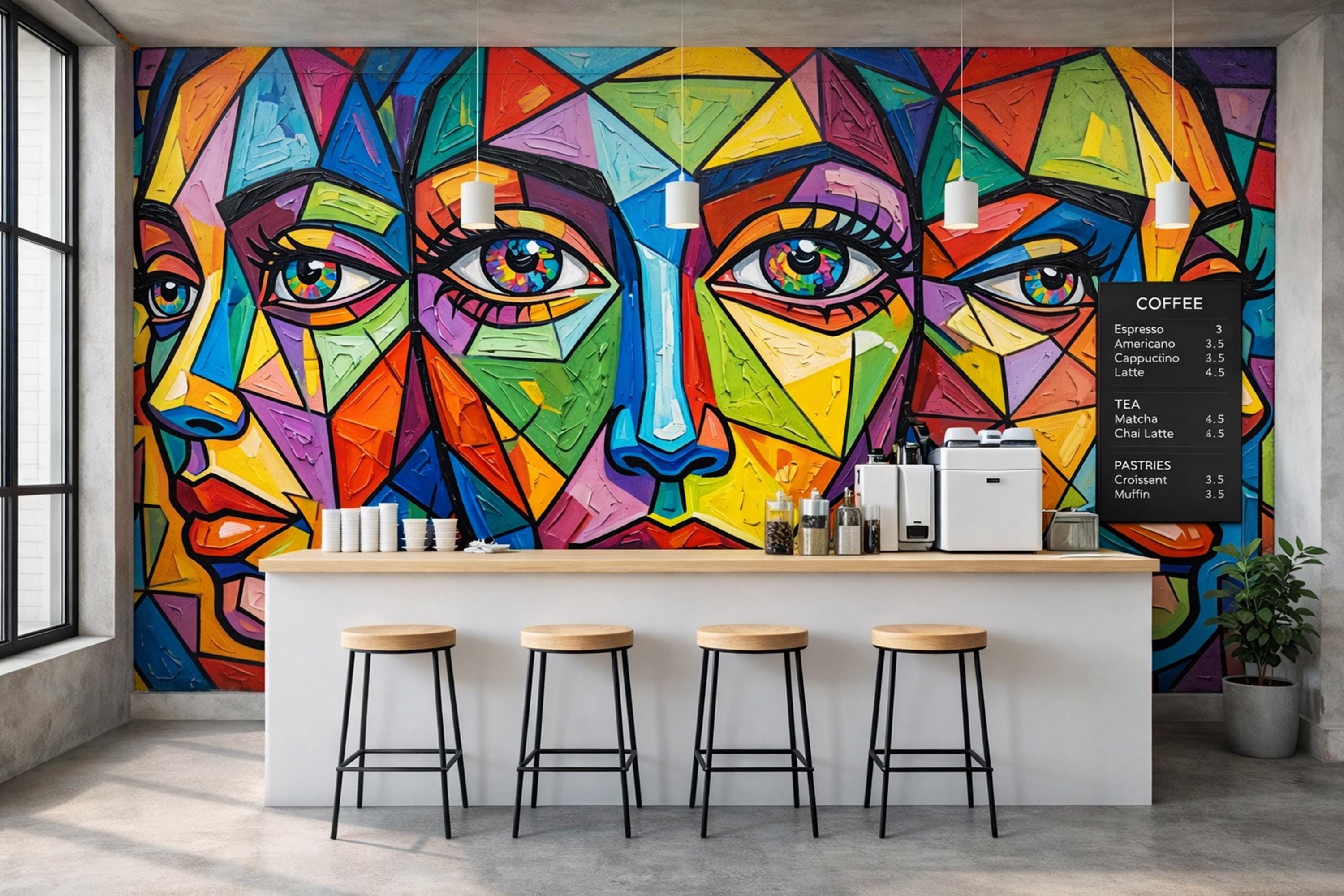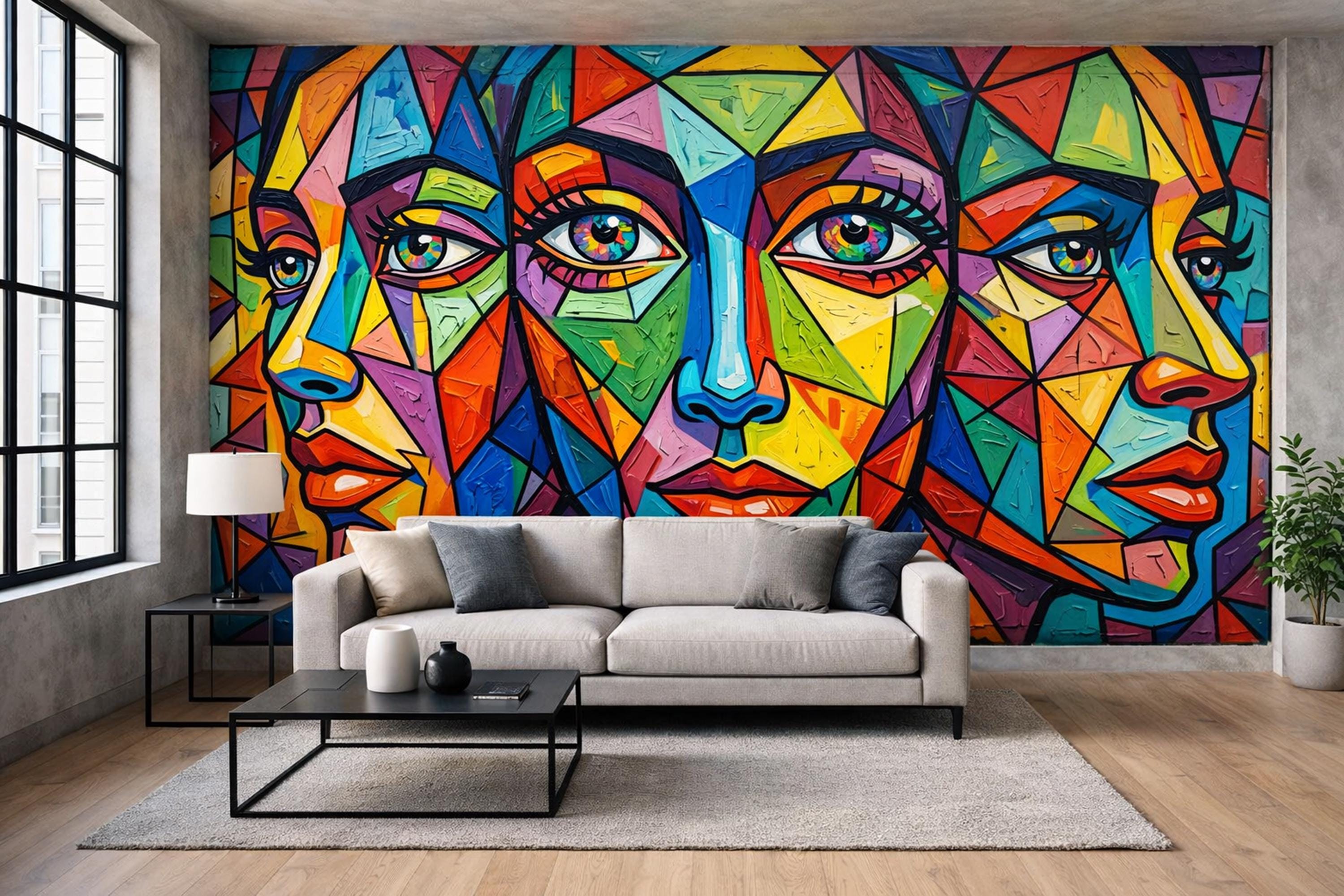 This is what happens when the most electric corner of a world-class city comes home with you. This breathtaking Street Art Geometric Women Face Wallpaper Mural by WallpaperPixi delivers the full impact of large-scale urban mural art β three monumental female faces, each fragmented into a blazing mosaic of geometric colour planes, stare out from the wall with eyes that contain entire kaleidoscopes: swirling rings of teal, green, blue, red, and yellow that feel like looking into something alive and infinite.