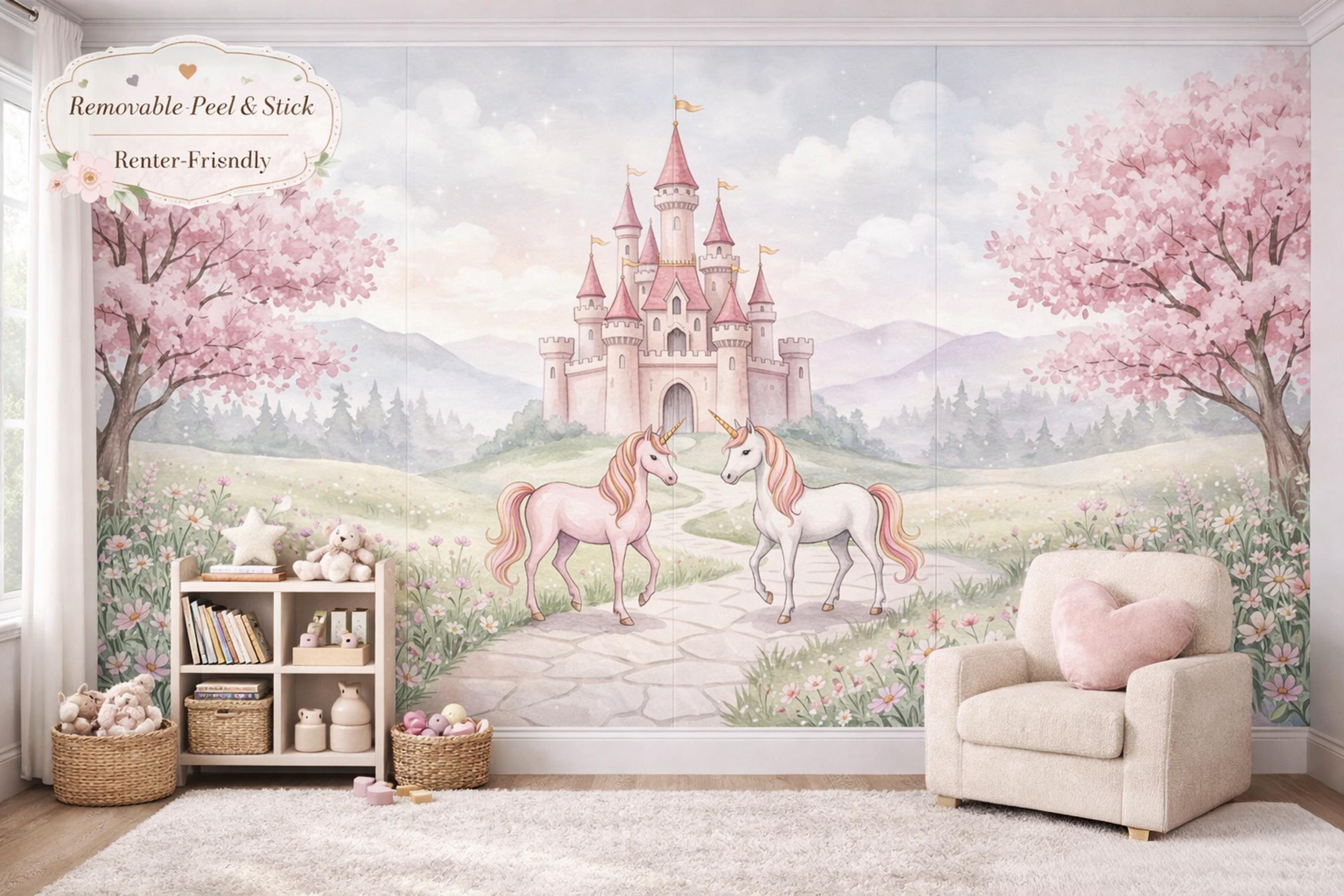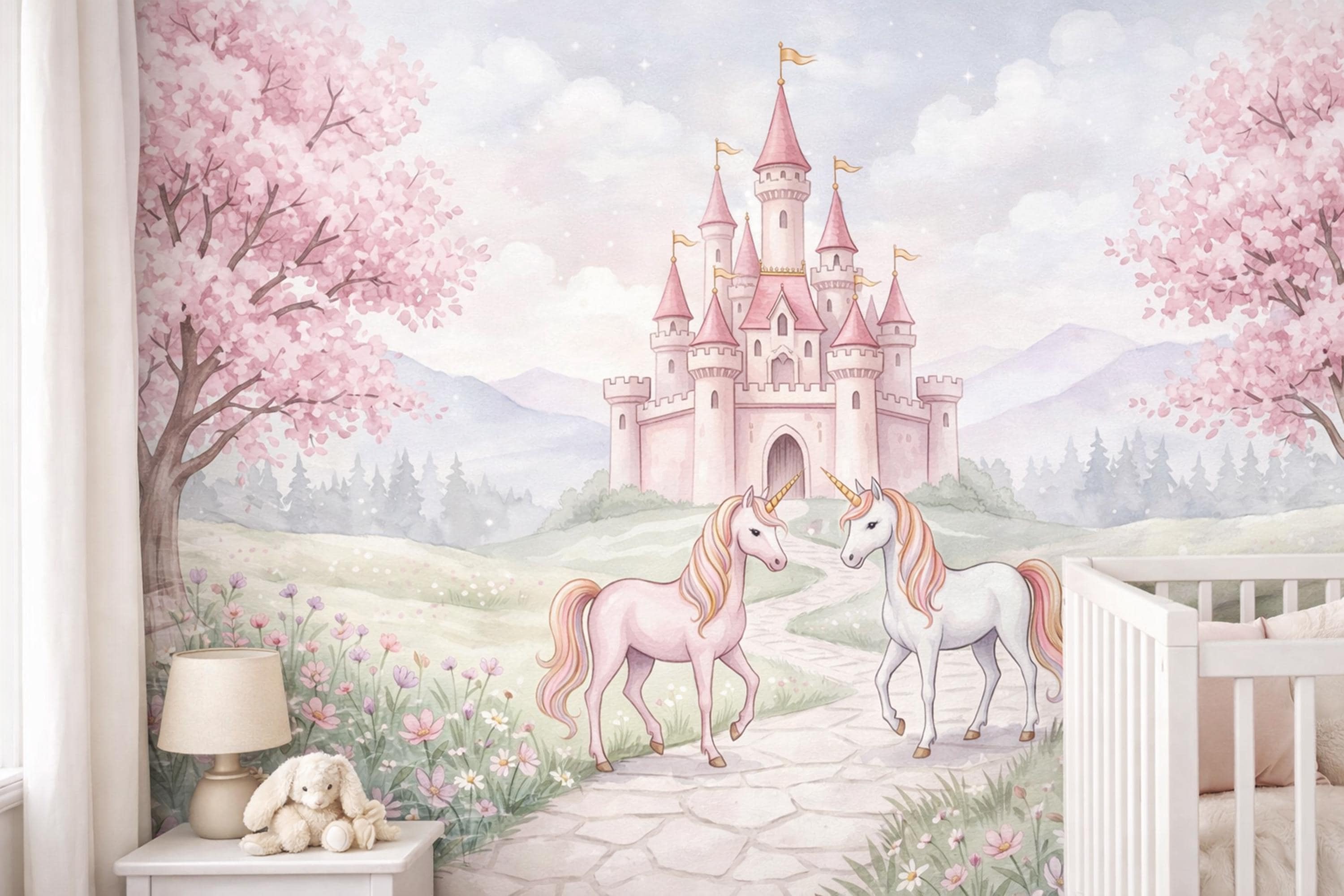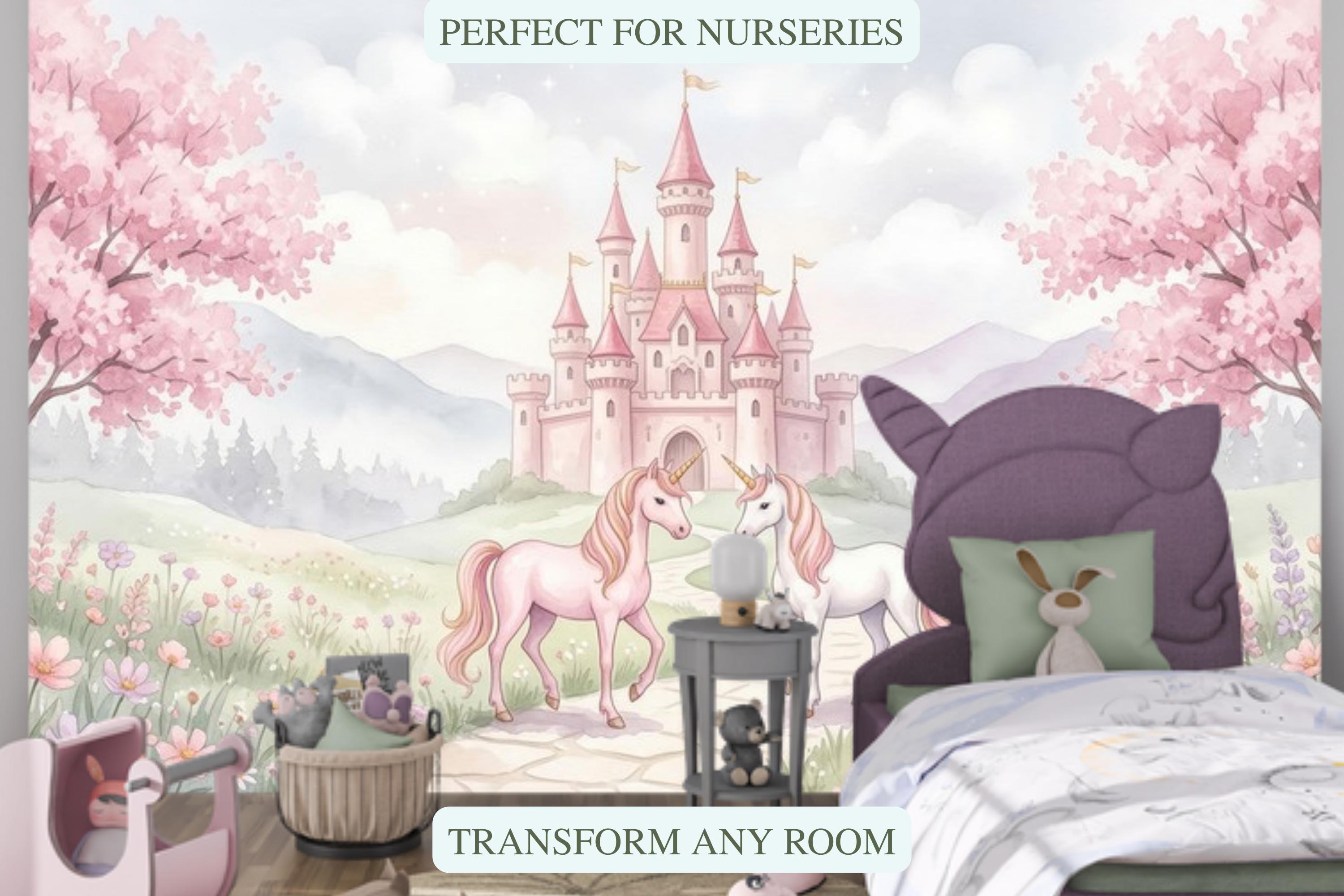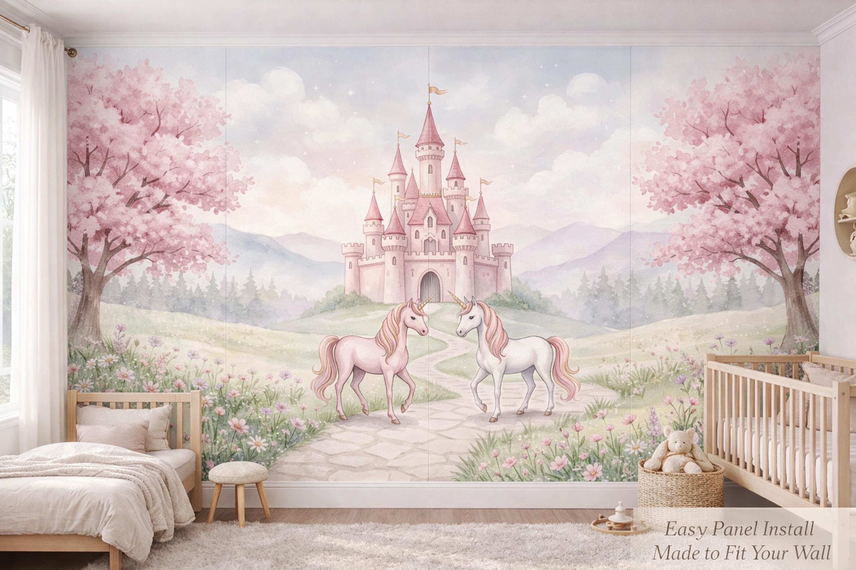 Transform your child's nursery into a whimsical fairy tale with our Unicorn Princess Castle Peel & Stick Watercolor Wallpaper. Designed to create a dreamy, enchanting space, this mural features a soft pastel palette of pinks, lavenders, and blush tones that evoke a sense of magic and serenity. Two elegant unicorns stand amidst a lush cherry blossom garden on a winding stone path, bringing a touch of whimsy and wonder to any wall.