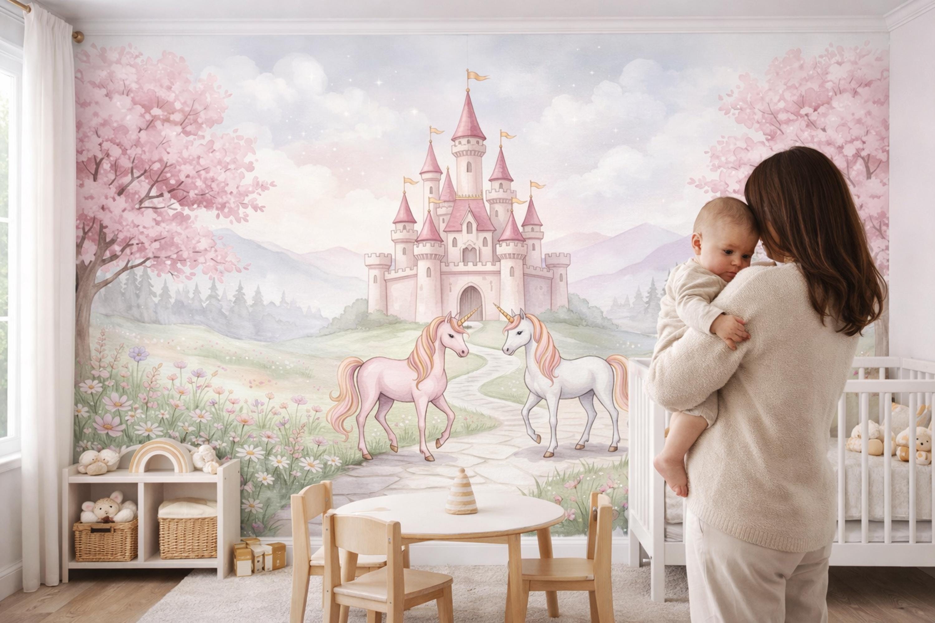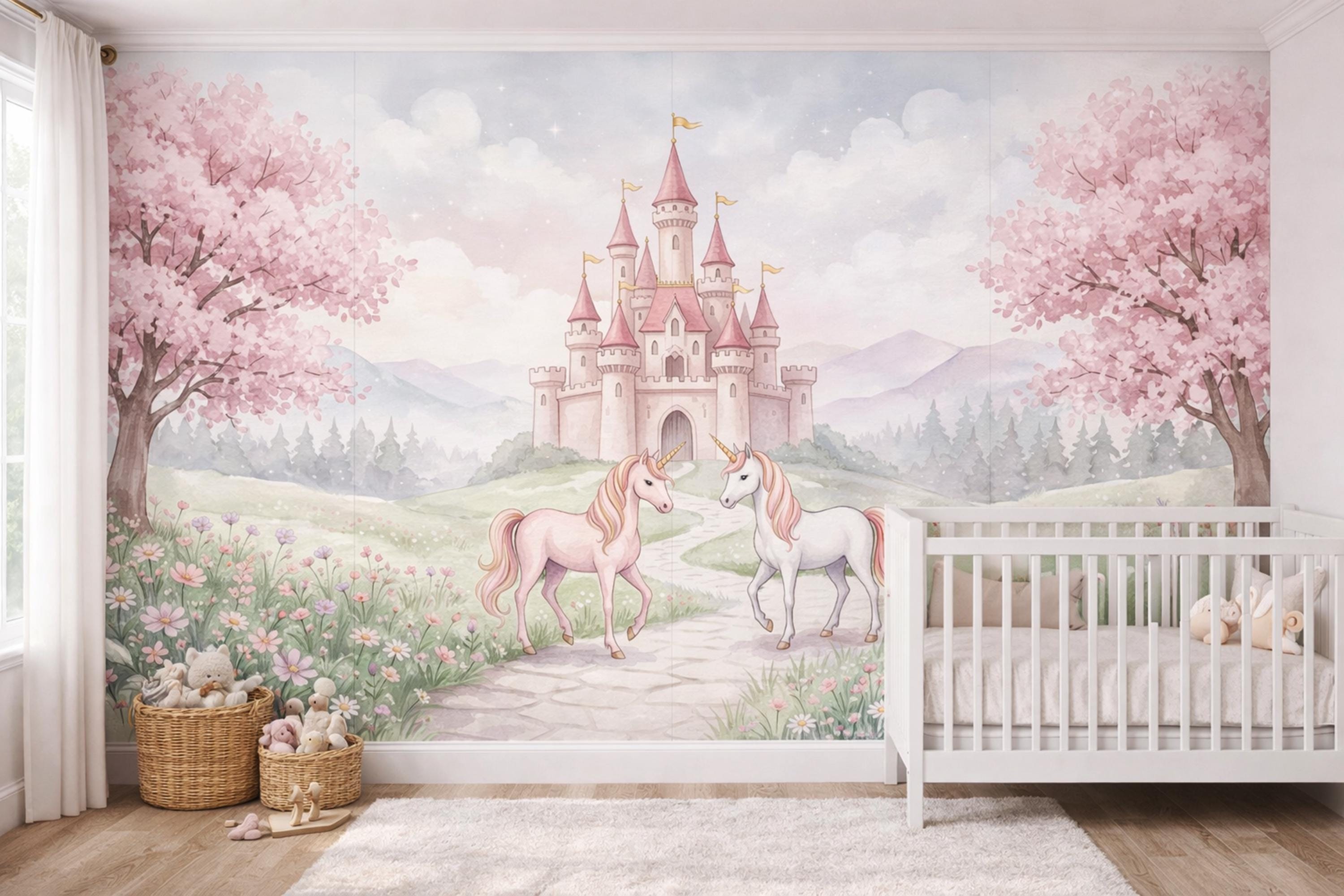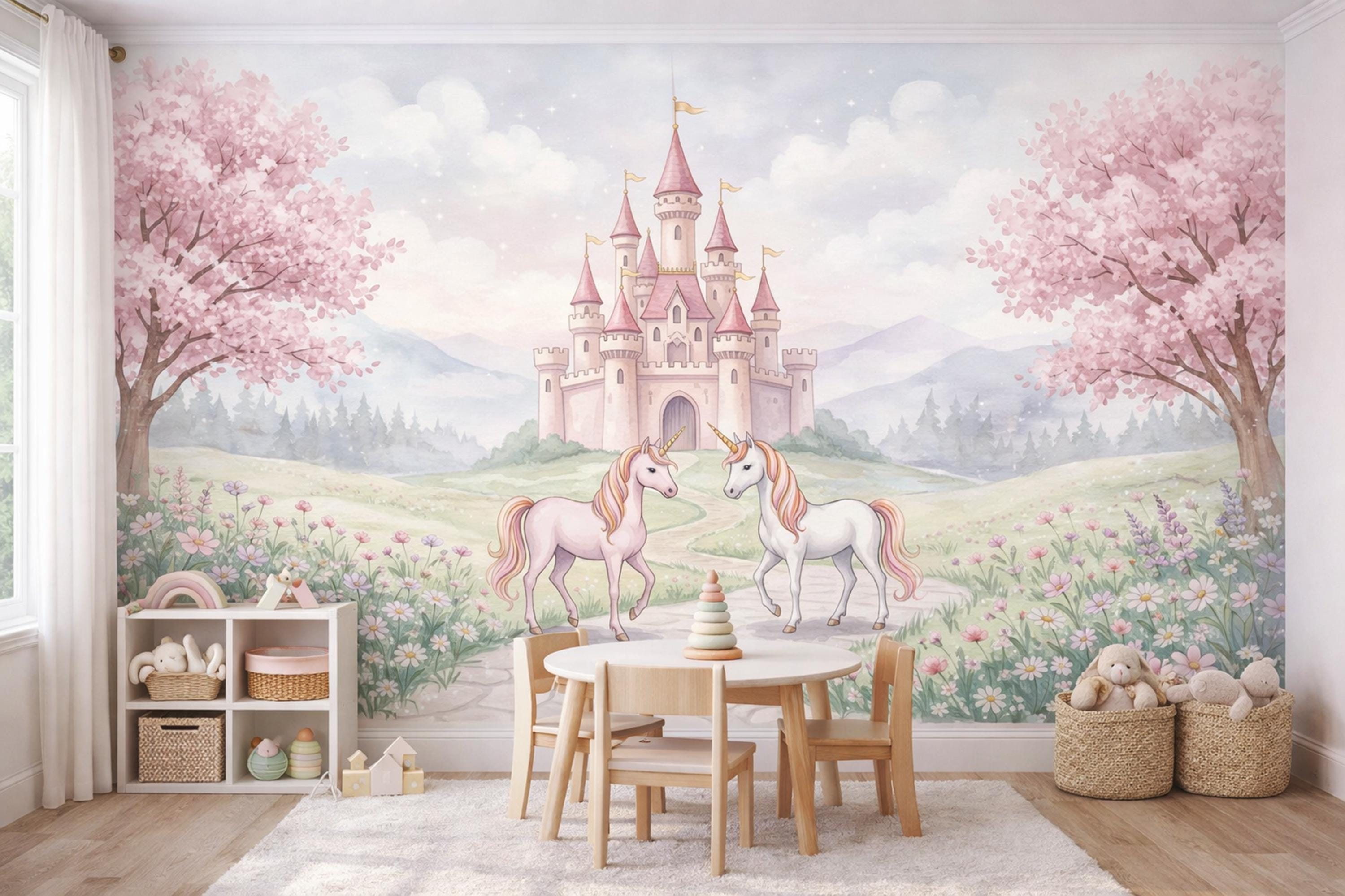 Transform your child's nursery into a whimsical fairy tale with our Unicorn Princess Castle Peel & Stick Watercolor Wallpaper. Designed to create a dreamy, enchanting space, this mural features a soft pastel palette of pinks, lavenders, and blush tones that evoke a sense of magic and serenity. Two elegant unicorns stand amidst a lush cherry blossom garden on a winding stone path, bringing a touch of whimsy and wonder to any wall.