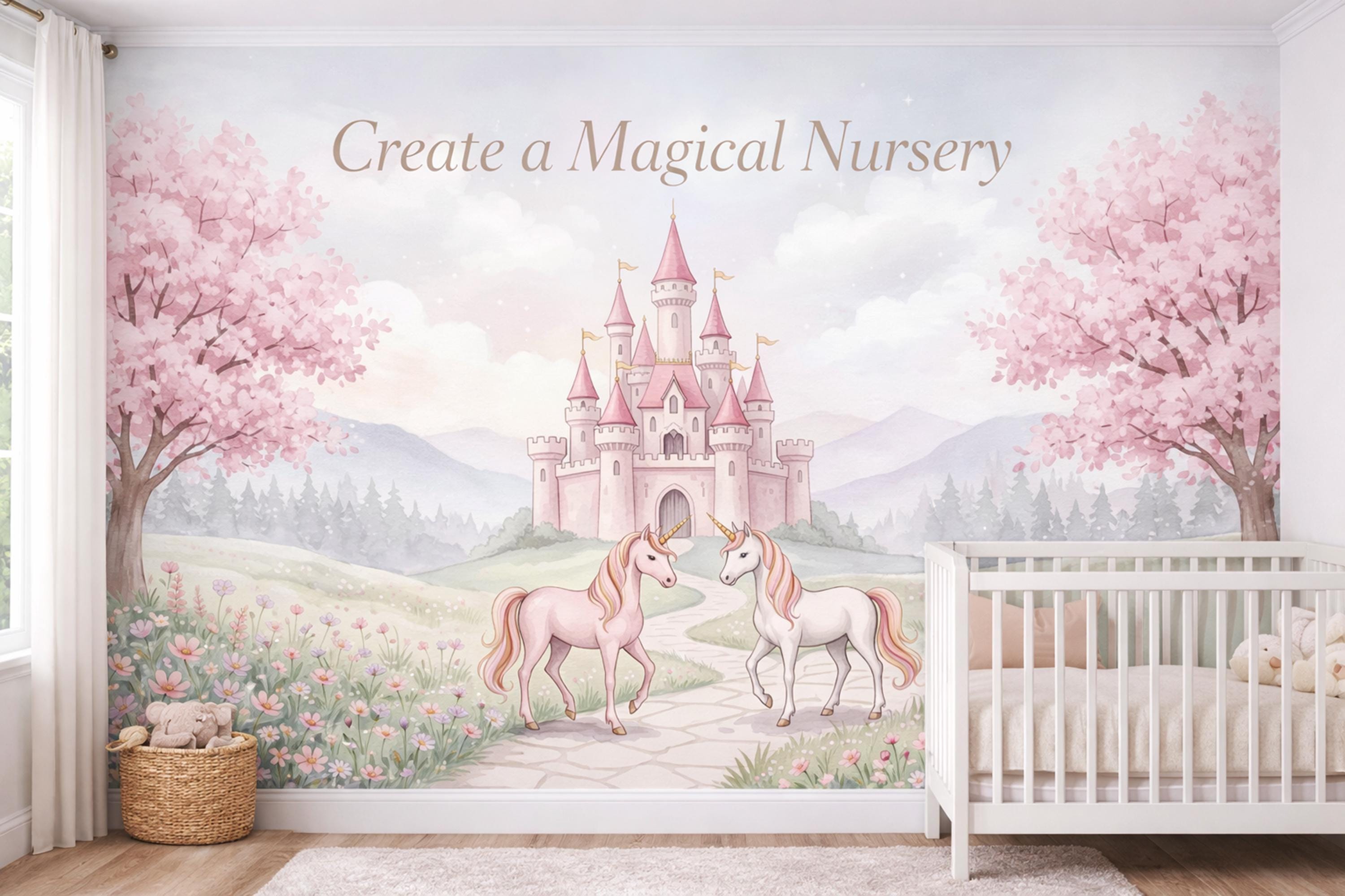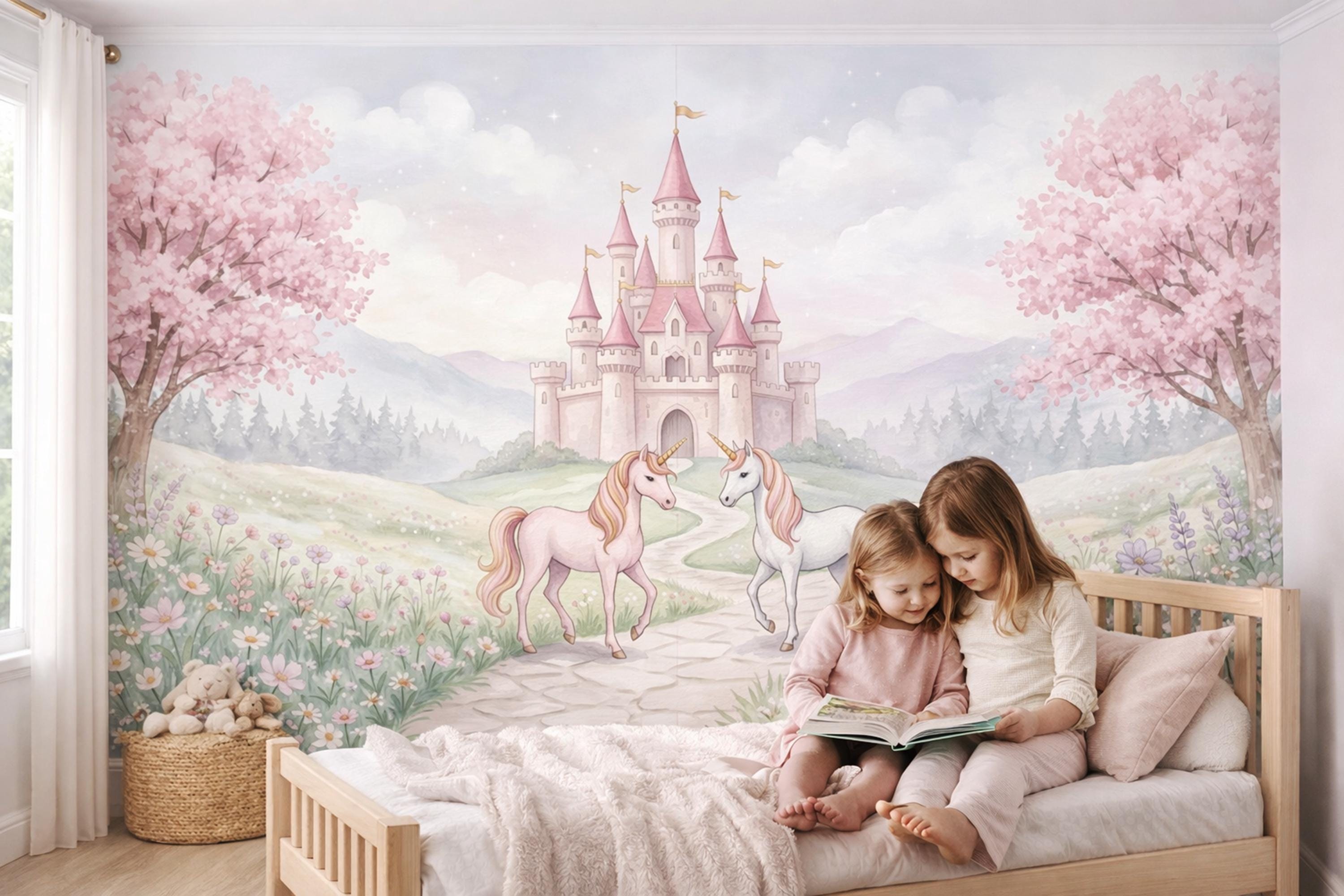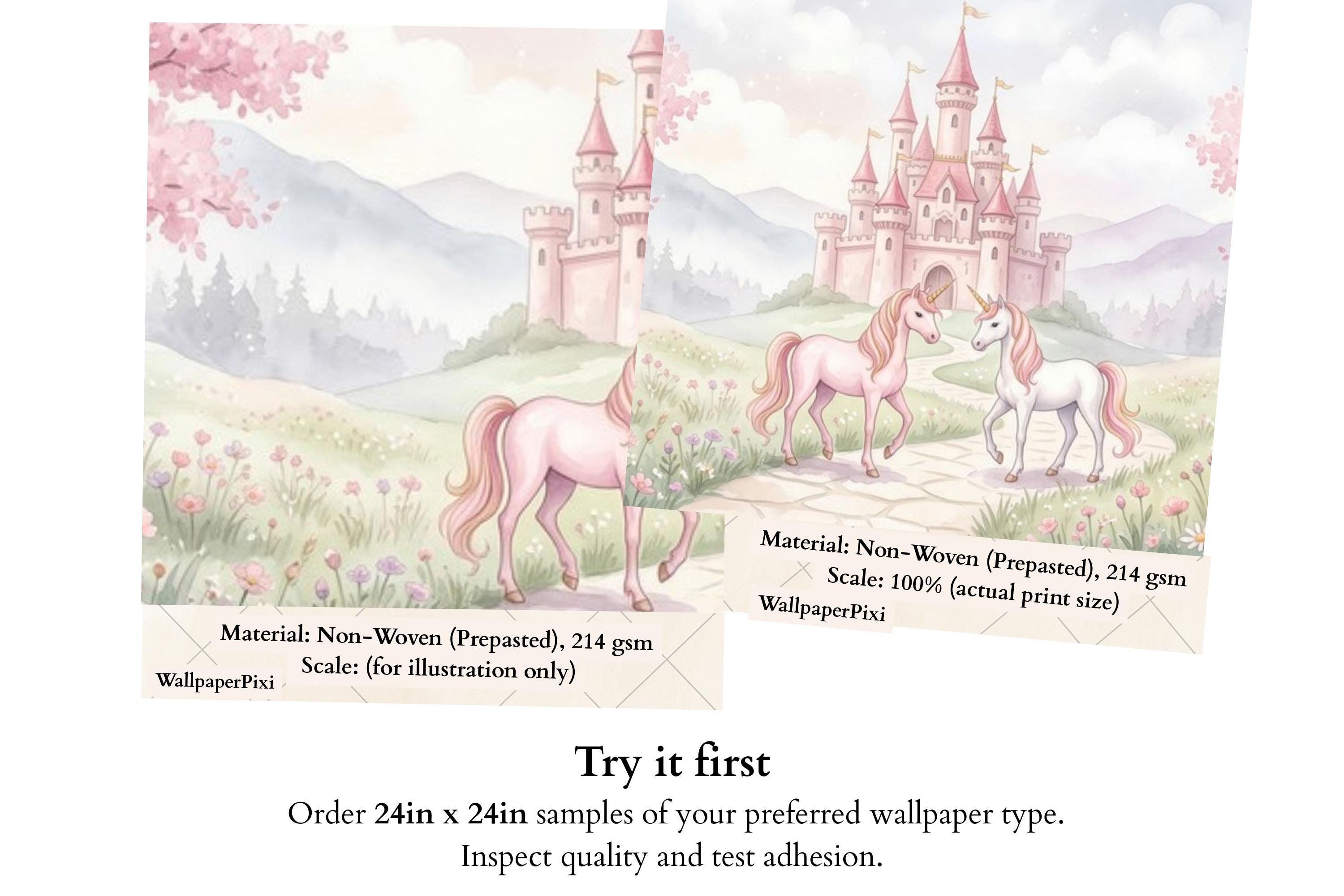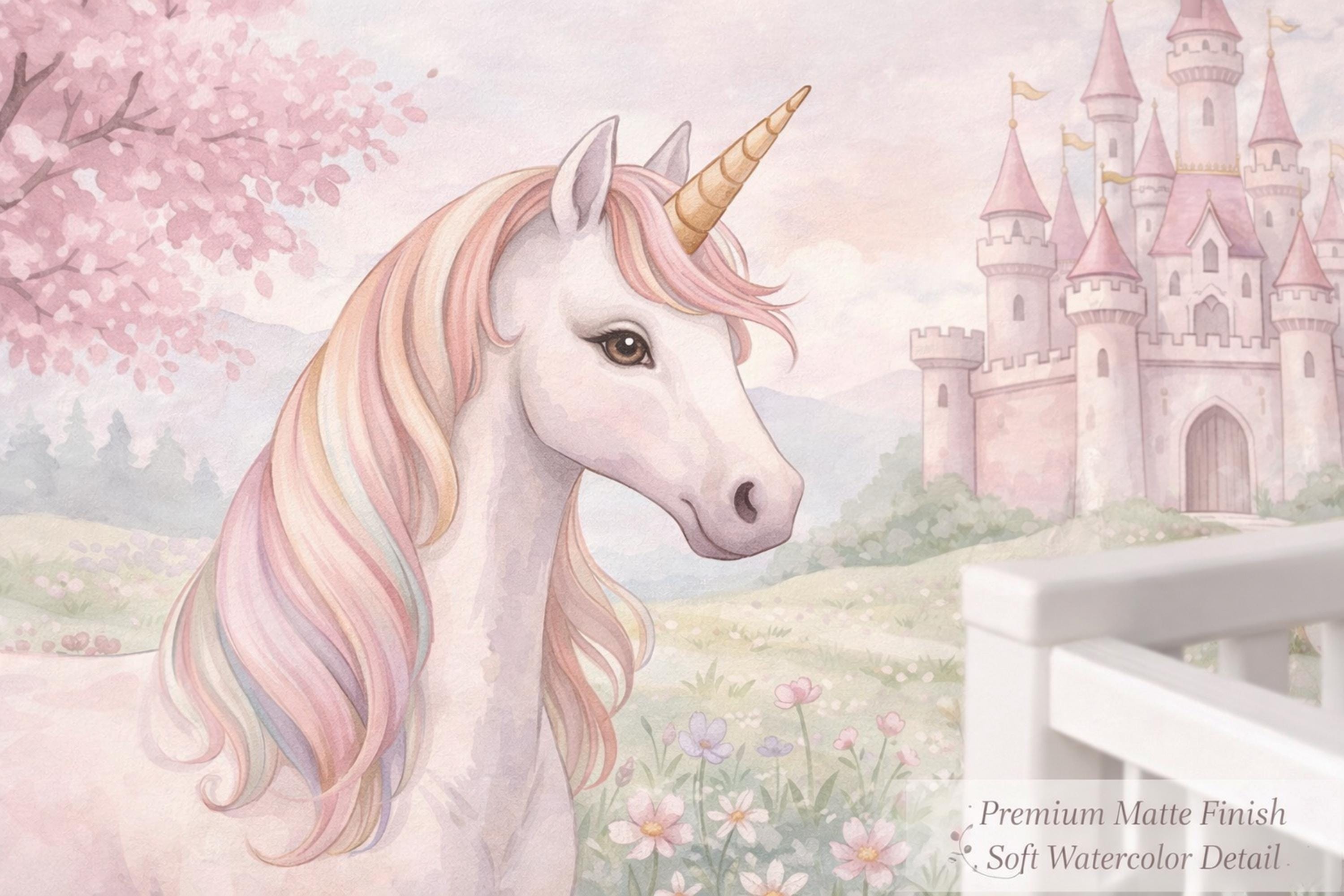 Transform your child's nursery into a whimsical fairy tale with our Unicorn Princess Castle Peel & Stick Watercolor Wallpaper. Designed to create a dreamy, enchanting space, this mural features a soft pastel palette of pinks, lavenders, and blush tones that evoke a sense of magic and serenity. Two elegant unicorns stand amidst a lush cherry blossom garden on a winding stone path, bringing a touch of whimsy and wonder to any wall.