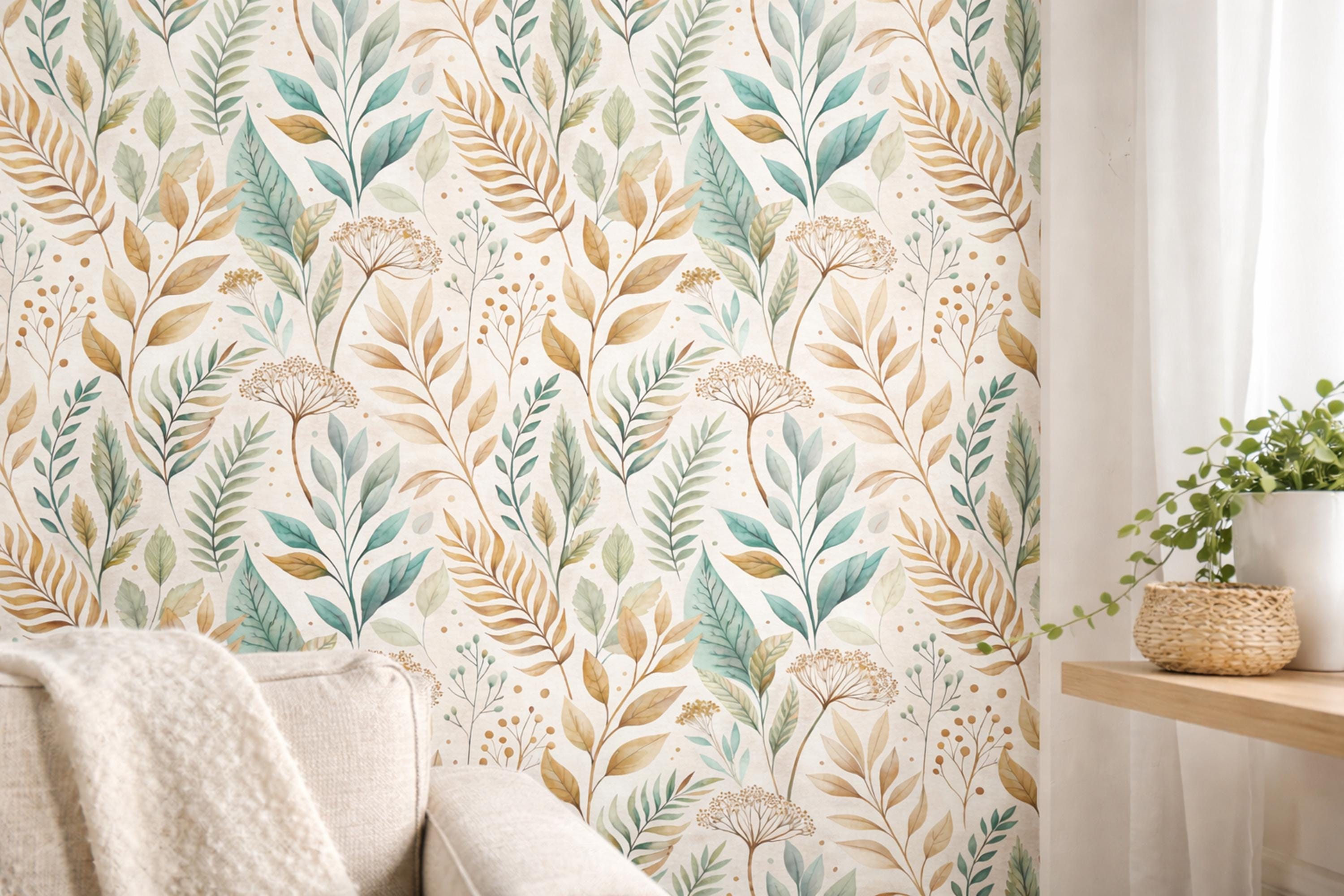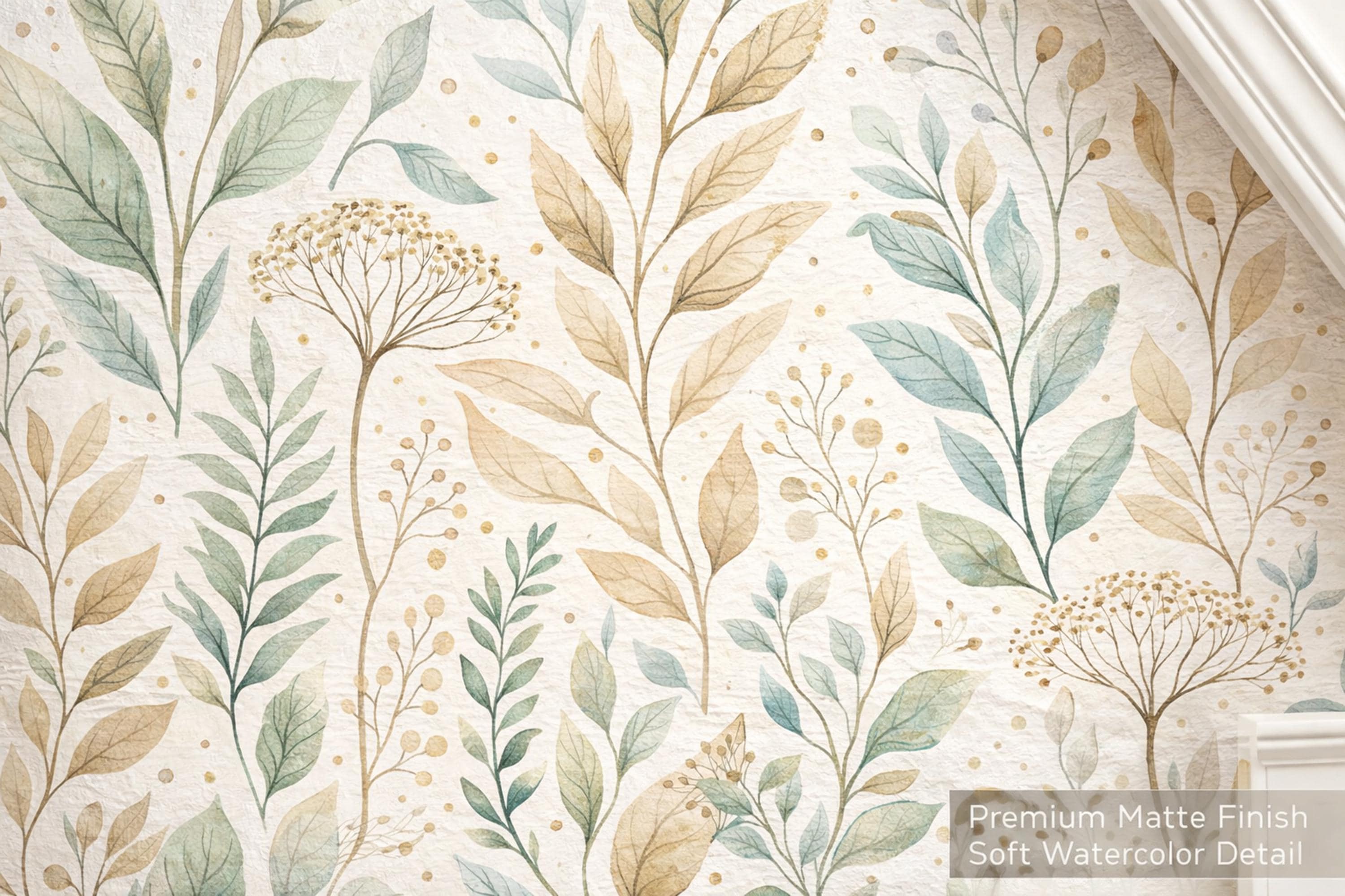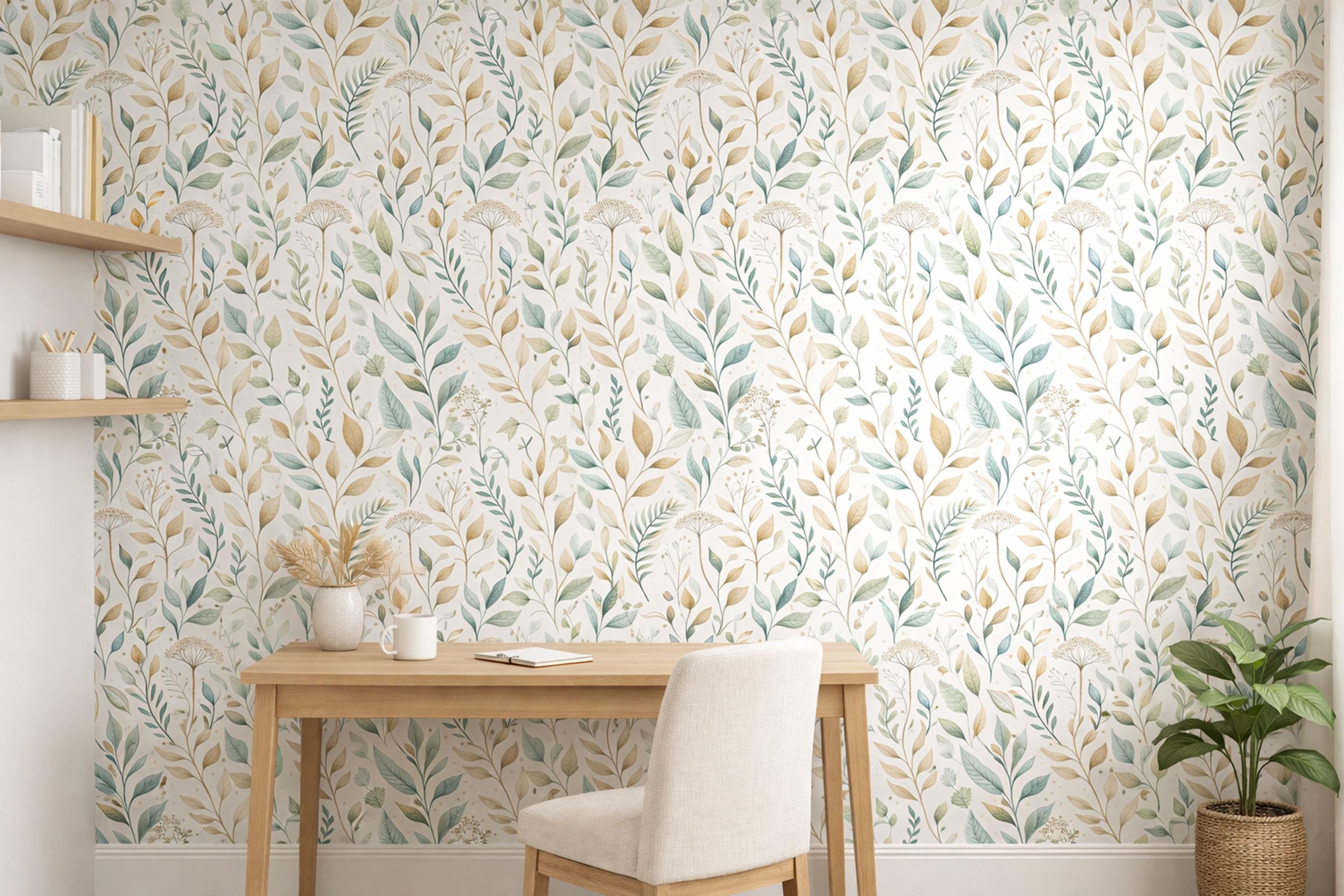 This Watercolor Botanical Leaf Wallpaper Mural by WallpaperPixi is effortless, organic elegance in repeat. Sage green, teal, and warm golden-beige leaves rise on slender stems across a soft cream background, joined by delicate wildflower umbels, berry sprigs, and scattered gold dots. The loose watercolour brushwork gives every leaf its own personality โ no two feel identical, making the pattern feel handpainted rather than printed.