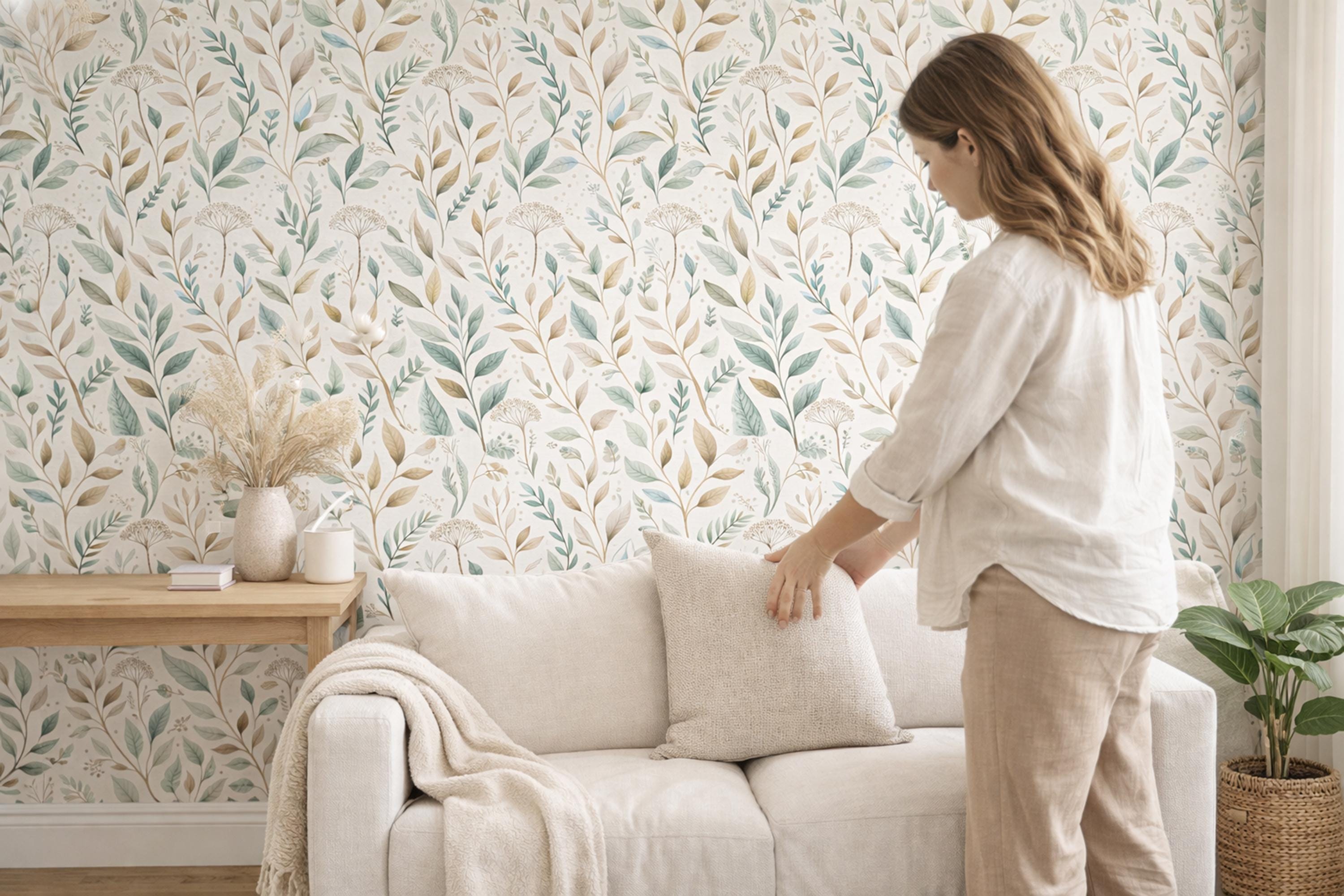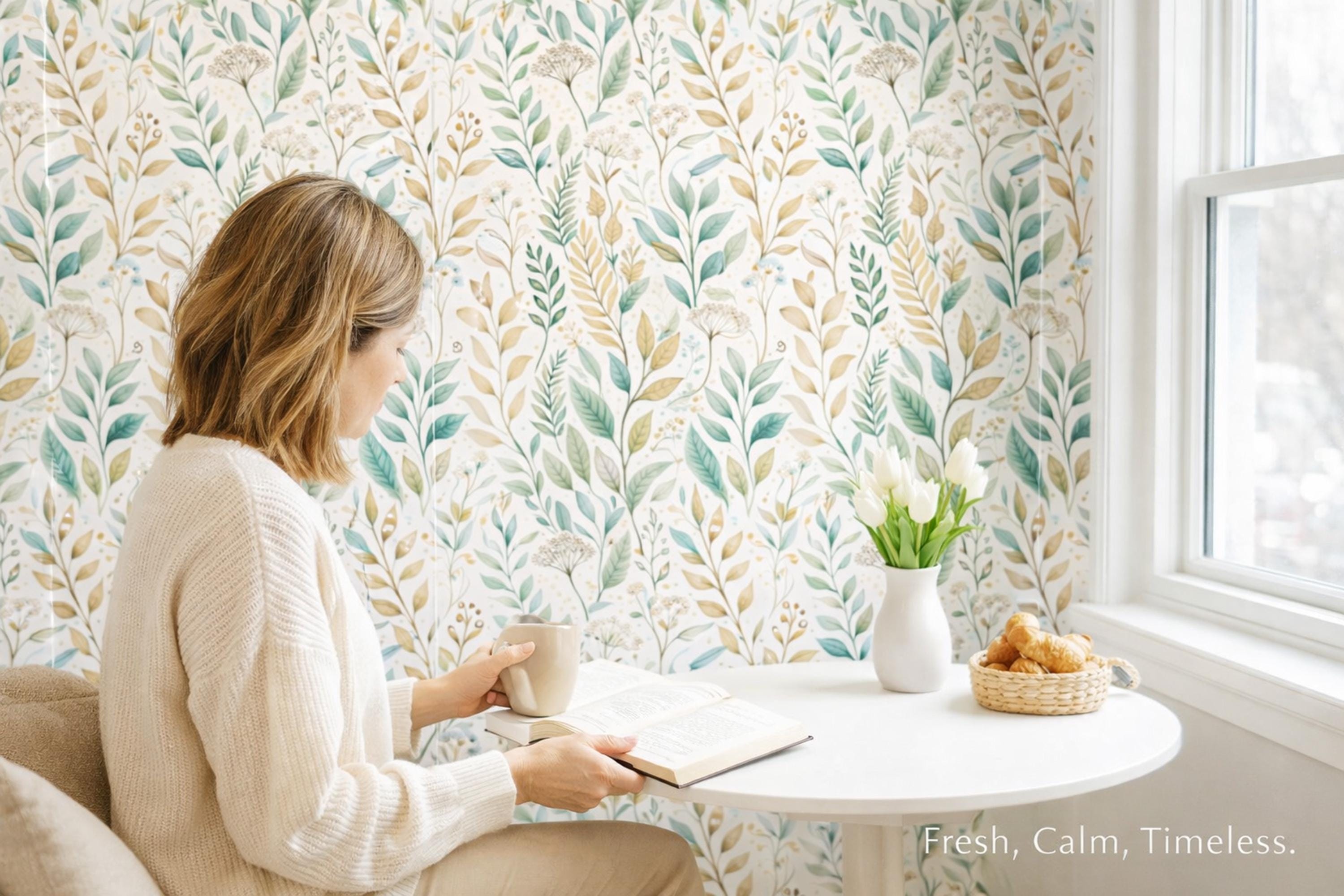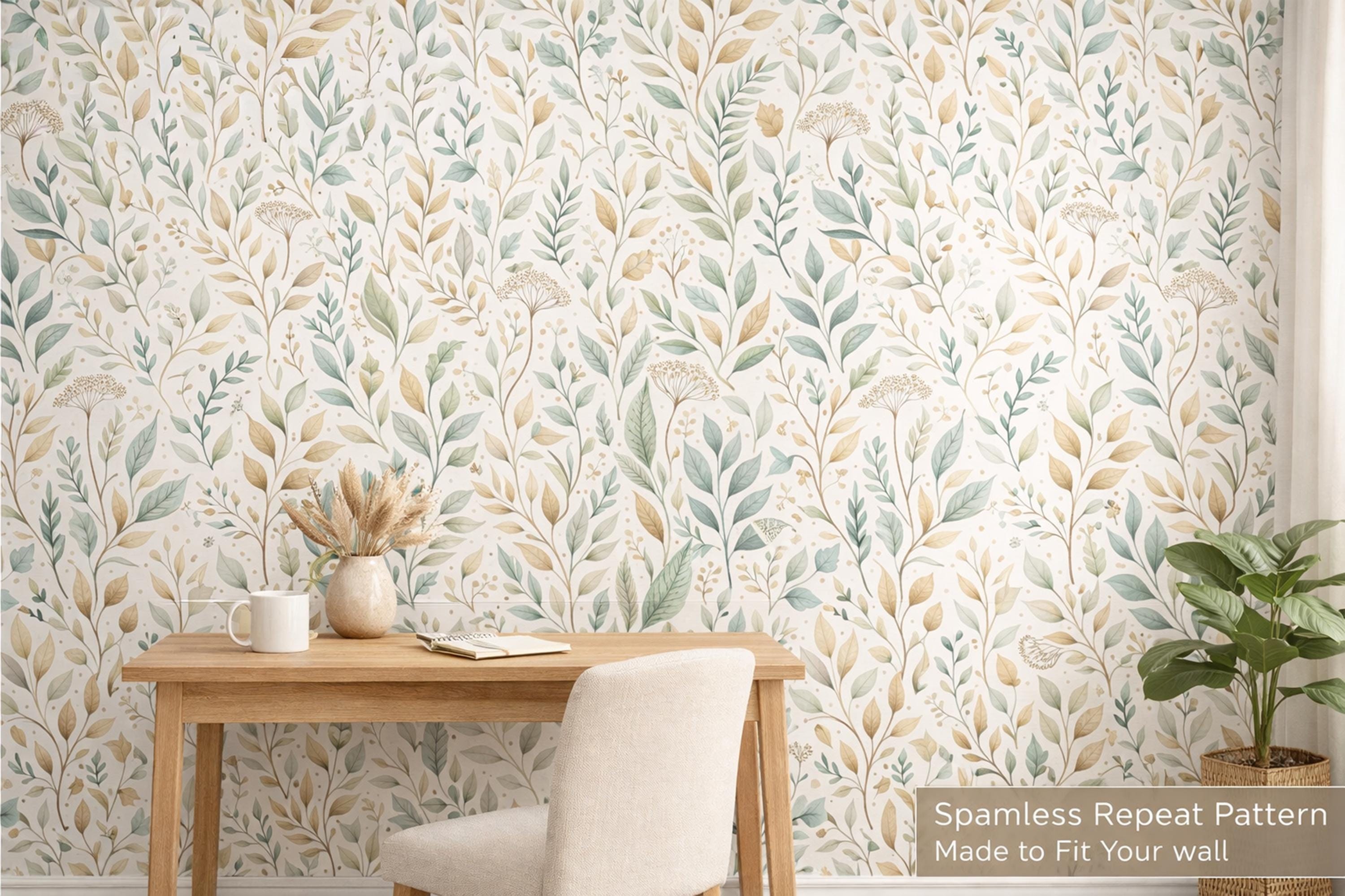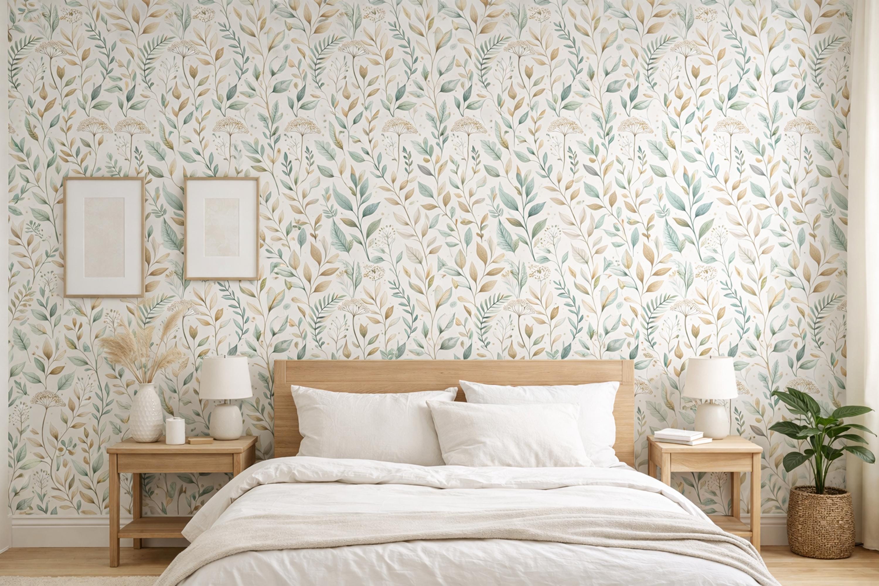 This Watercolor Botanical Leaf Wallpaper Mural by WallpaperPixi is effortless, organic elegance in repeat. Sage green, teal, and warm golden-beige leaves rise on slender stems across a soft cream background, joined by delicate wildflower umbels, berry sprigs, and scattered gold dots. The loose watercolour brushwork gives every leaf its own personality โ no two feel identical, making the pattern feel handpainted rather than printed.