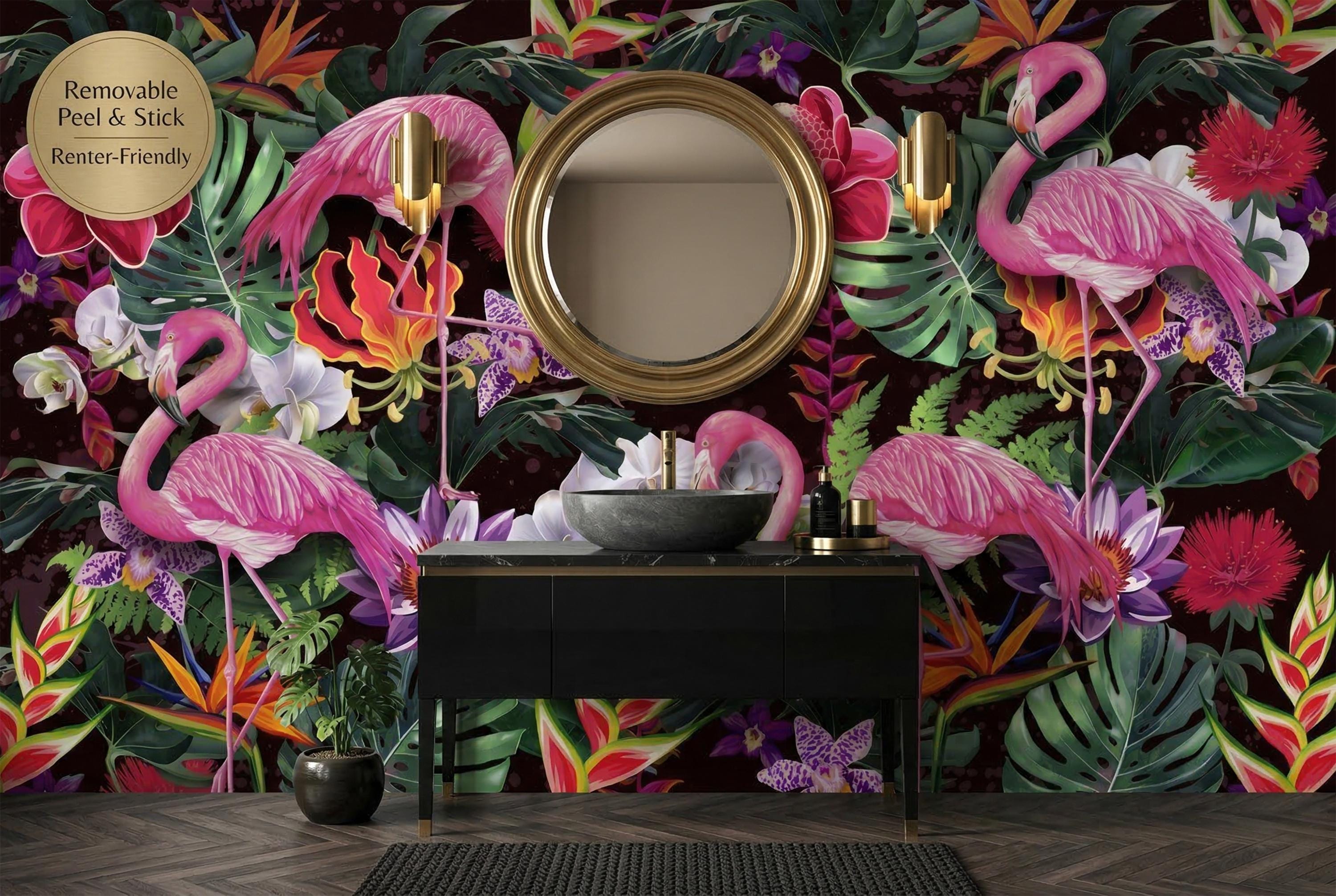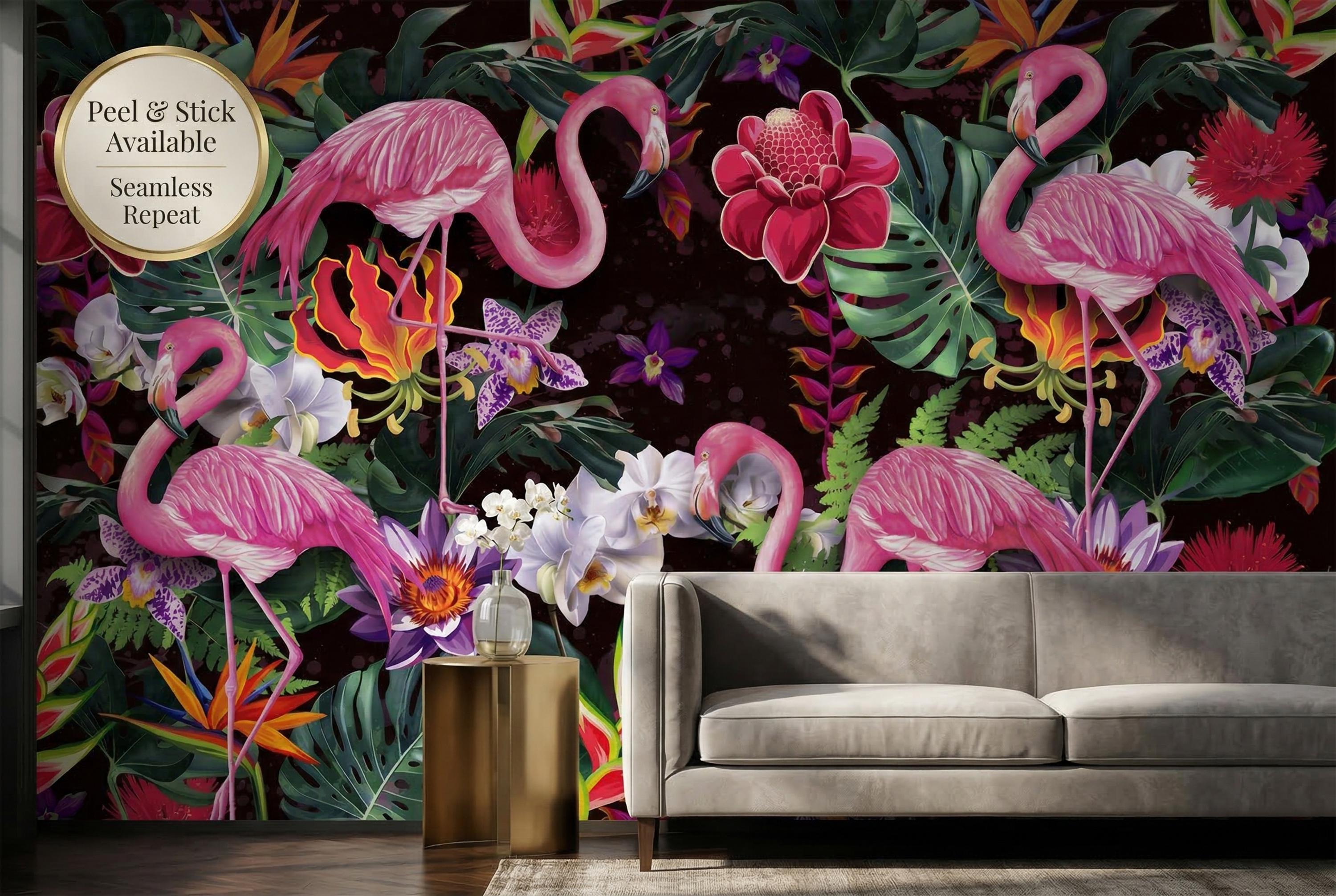 This flamingo tropical peel and stick wallpaper mural by WallpaperPixi is bold, lush, and completely unforgettable. Five brilliantly pink flamingos move through an explosion of tropical botanicals — monstera, bird of paradise, heliconia, torch ginger, white orchids, purple lotus, and cascading ferns — all set against a deep near-black background that makes every pink and green pop with extraordinary intensity.