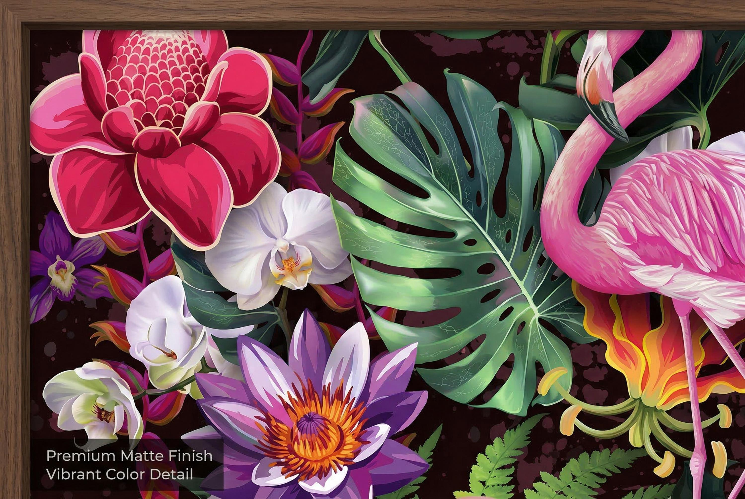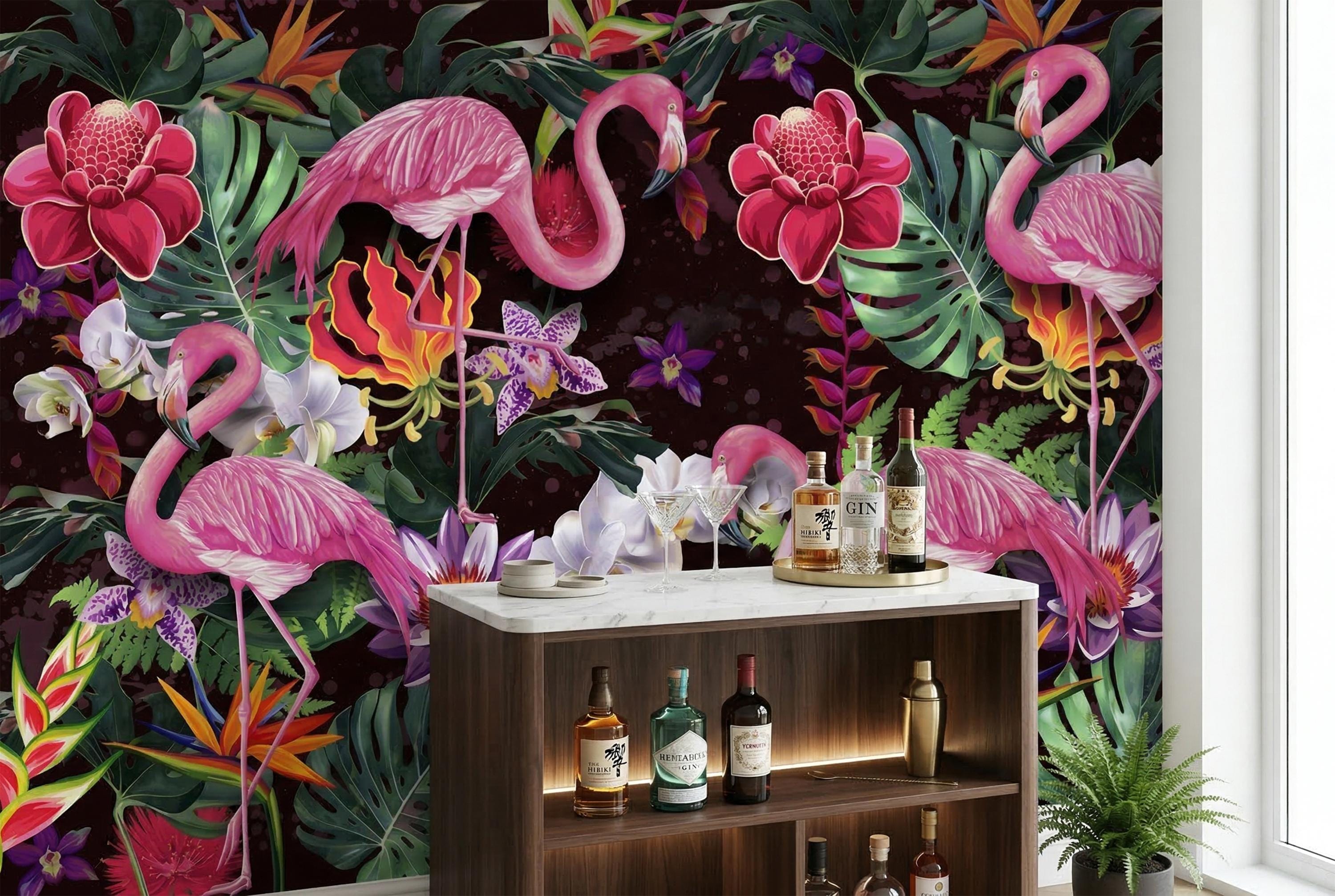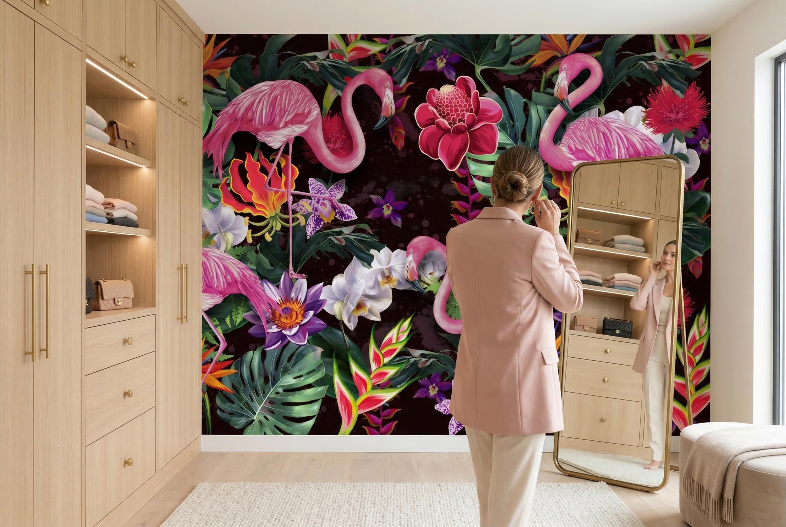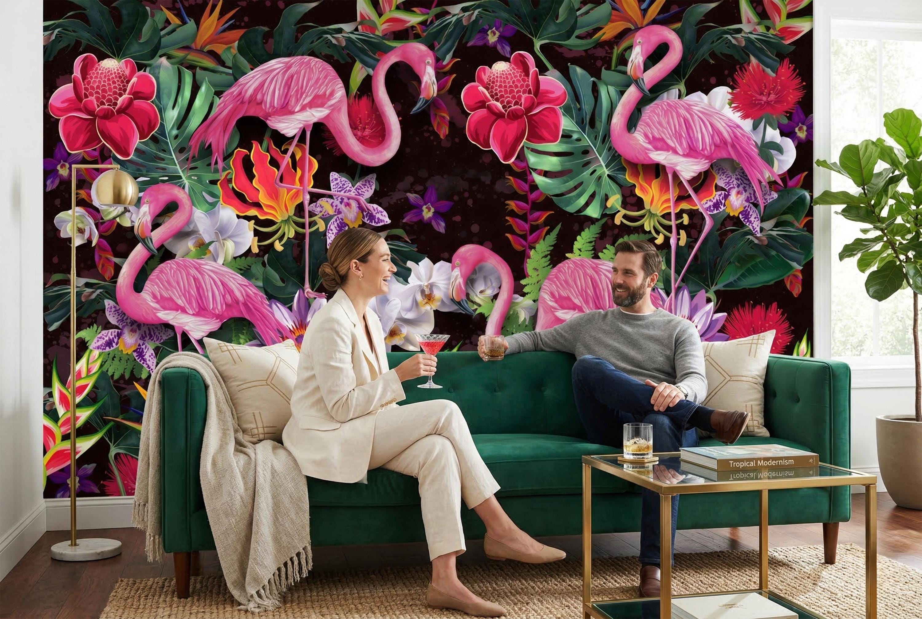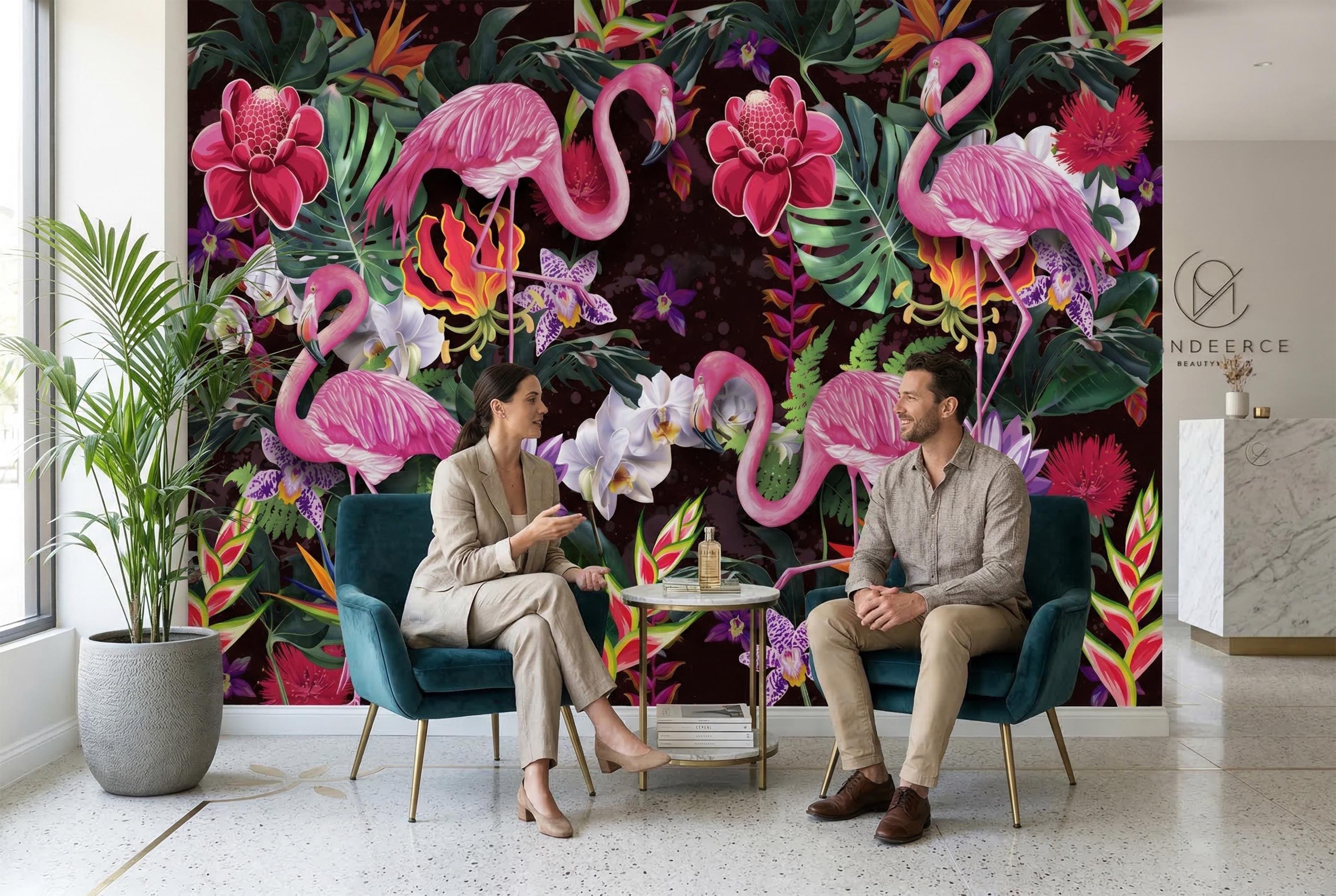 This dark jungle botanical mural delivers the energy of a tropical garden and the sophistication of high-end interior design in a single wall. A pink flamingo wall decor statement like no other — it transforms living rooms, bedrooms, bathrooms, hotels, bars, and restaurants instantly.
