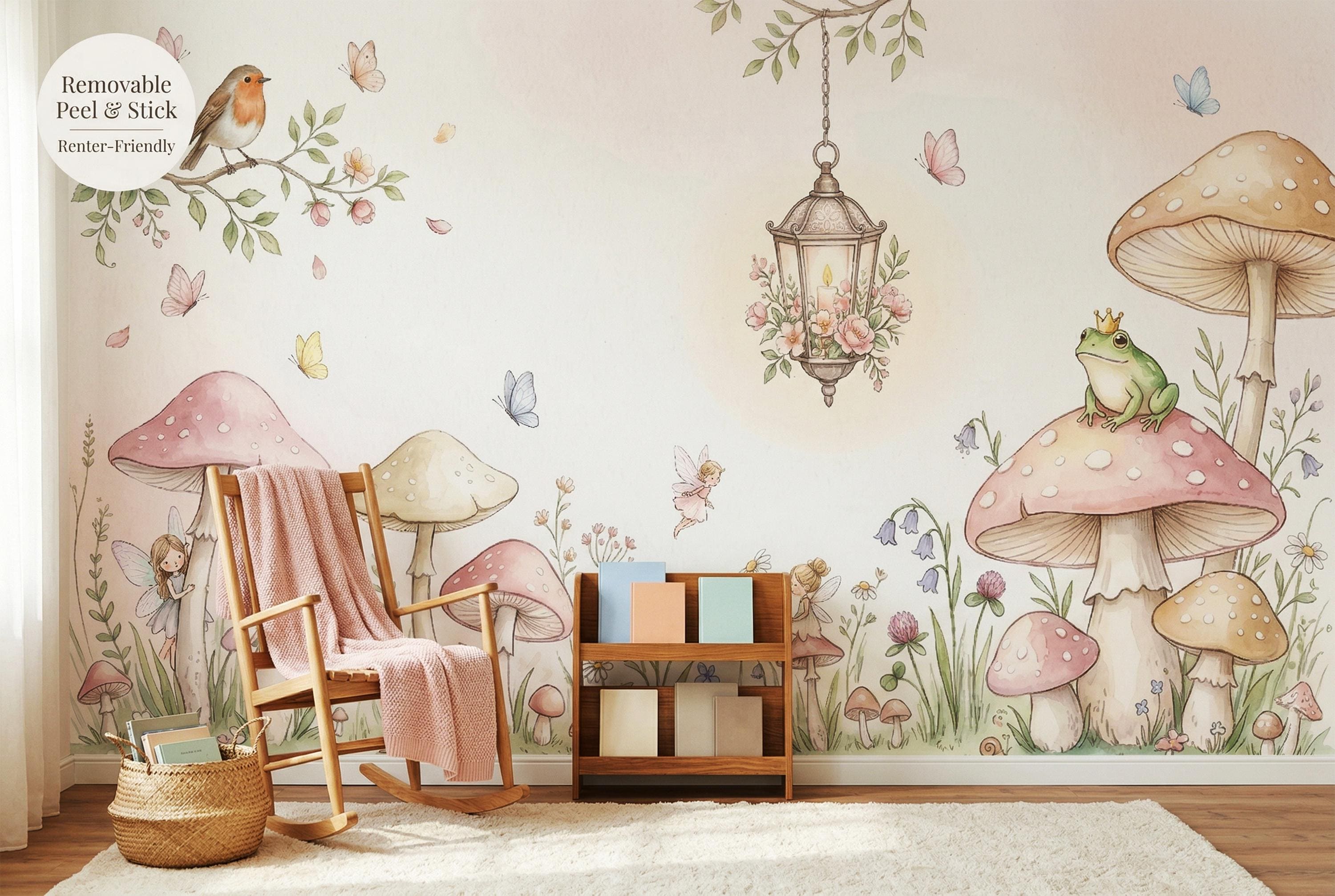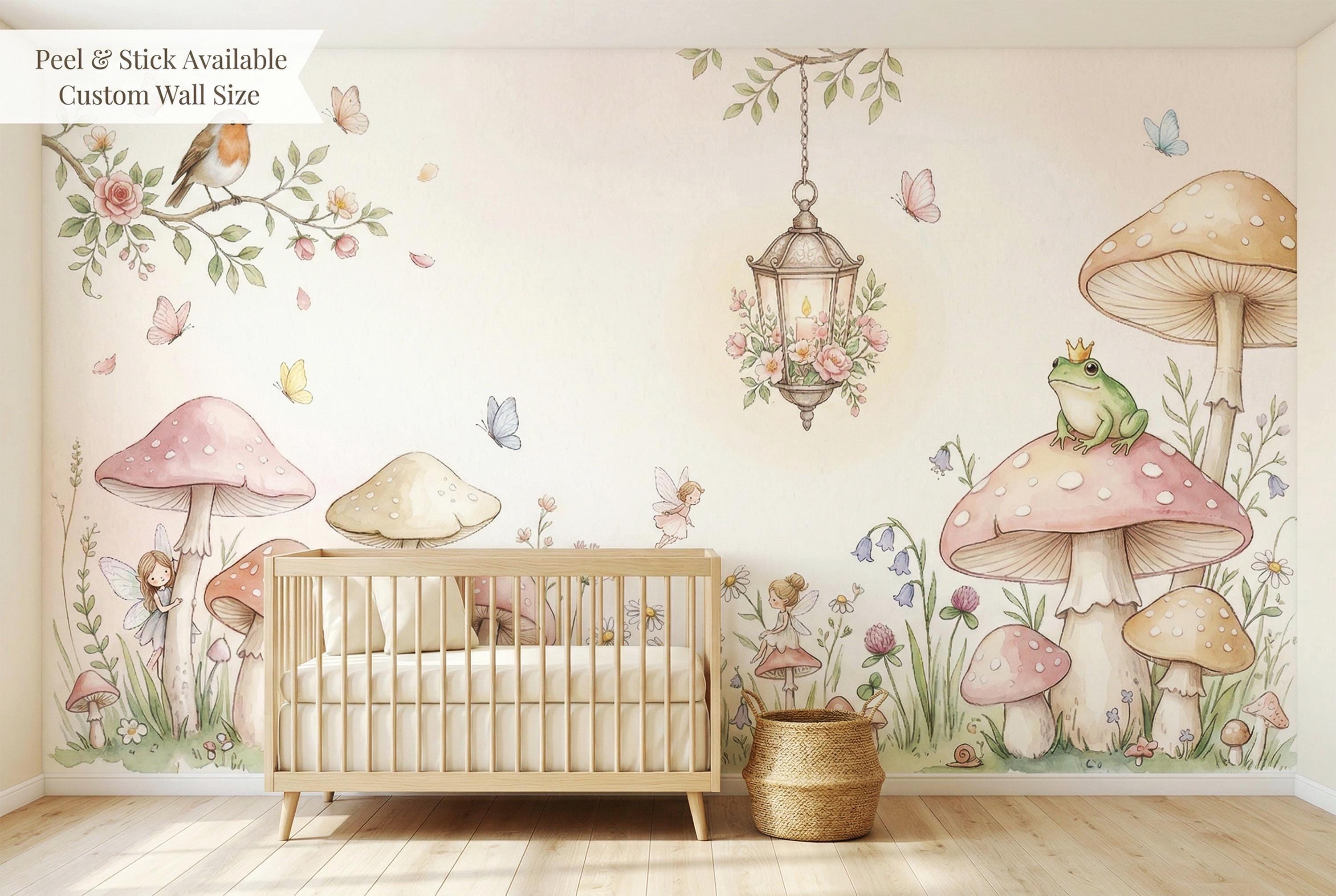 This fairy mushroom meadow peel and stick mural by WallpaperPixi is the most enchantingly detailed cottage nursery design we have ever created.
