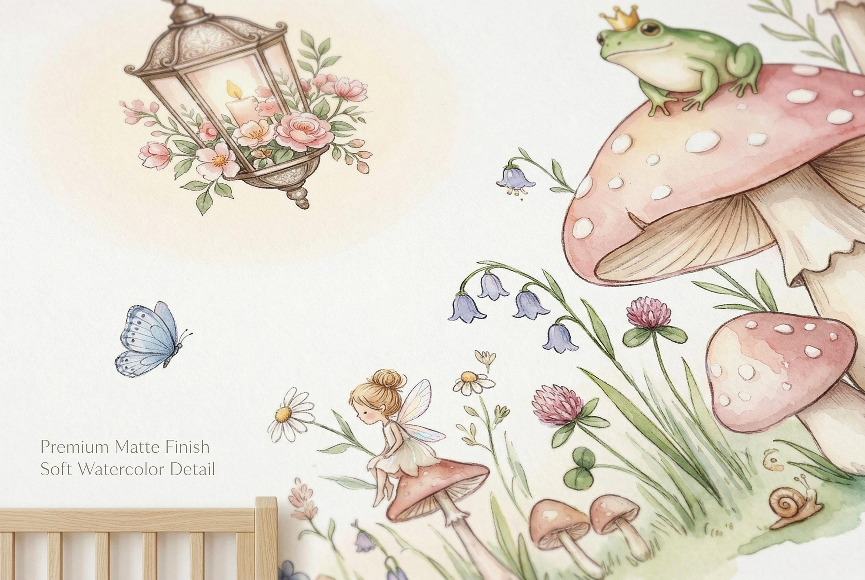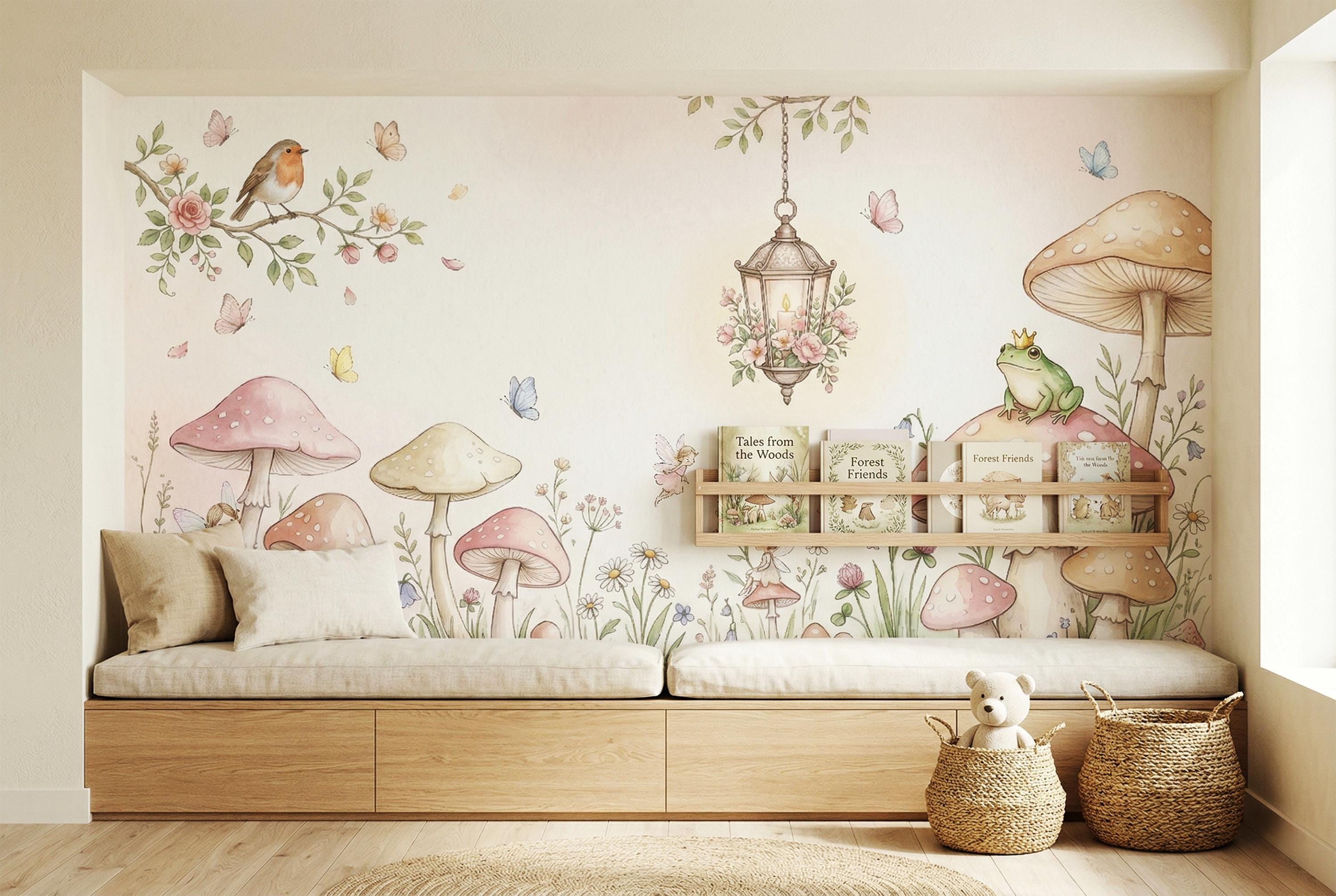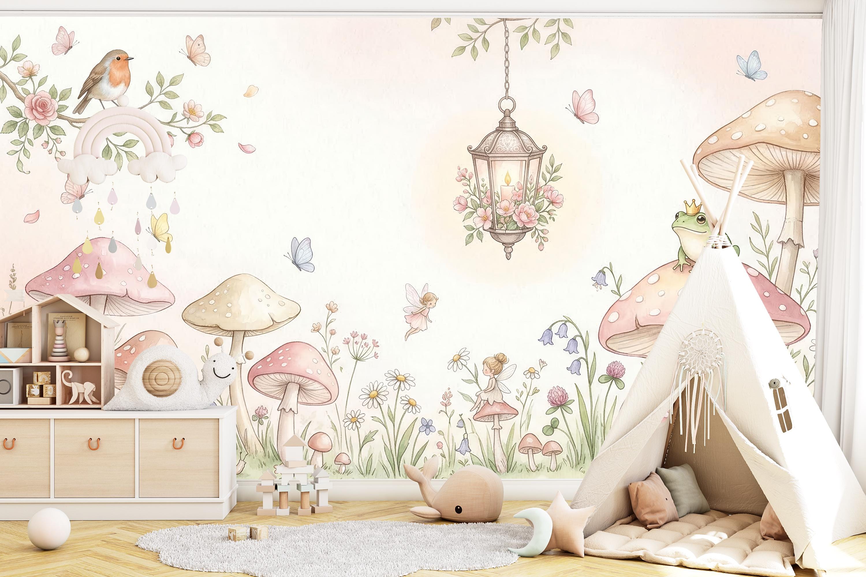 This cottage fairy wallpaper is drawn in the most tender, precise watercolour style — every petal, every wing vein, every mushroom spot rendered with storybook care. As a fairy woods wallpaper it captures the magic of a secret woodland clearing at the exact moment when everything in it is quietly, perfectly alive. As a whimsical baby nursery wallpaper it is unmatched for detail, warmth, and the ability to make a child believe — truly believe — that the world behind the wall is real.