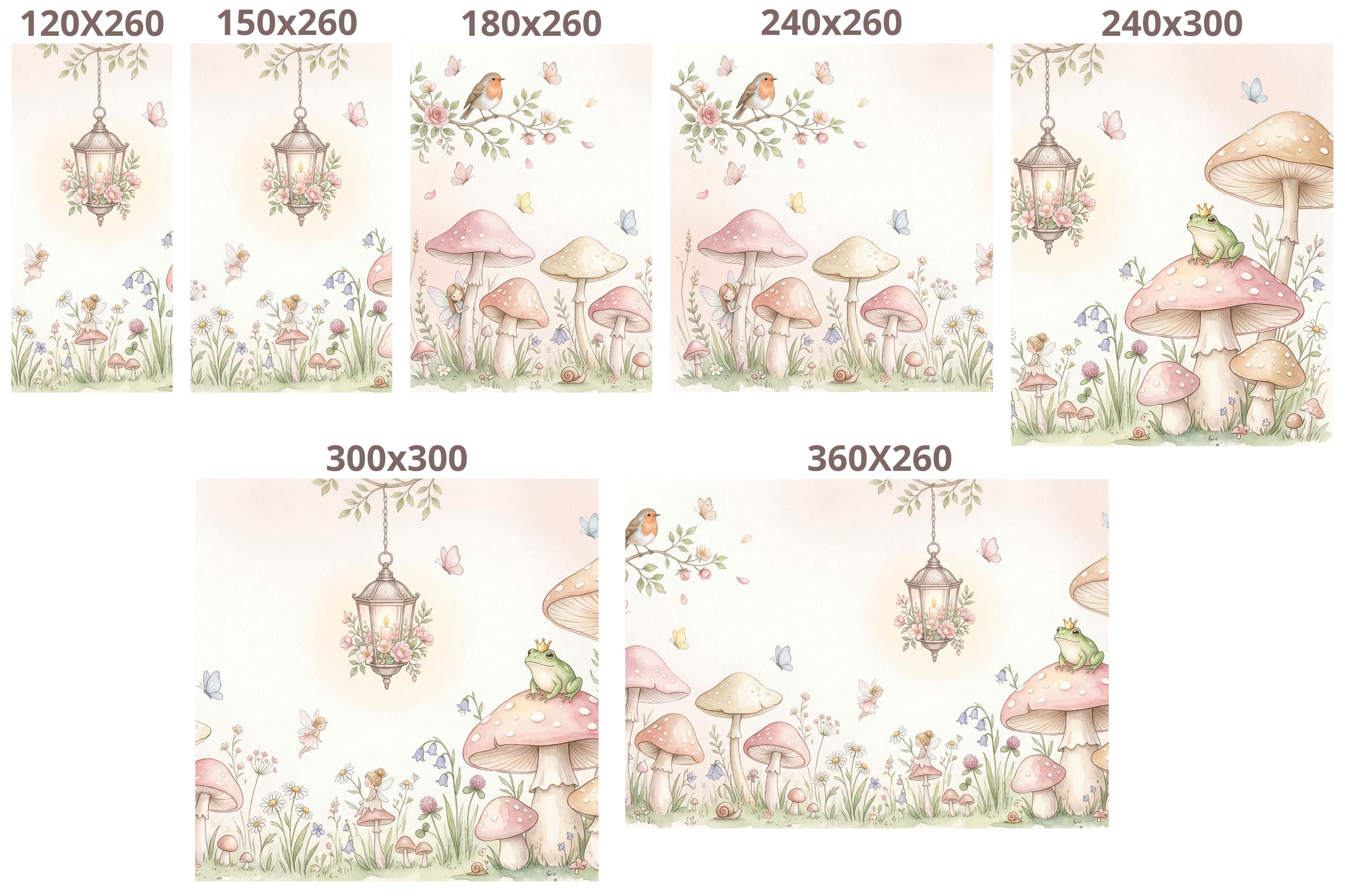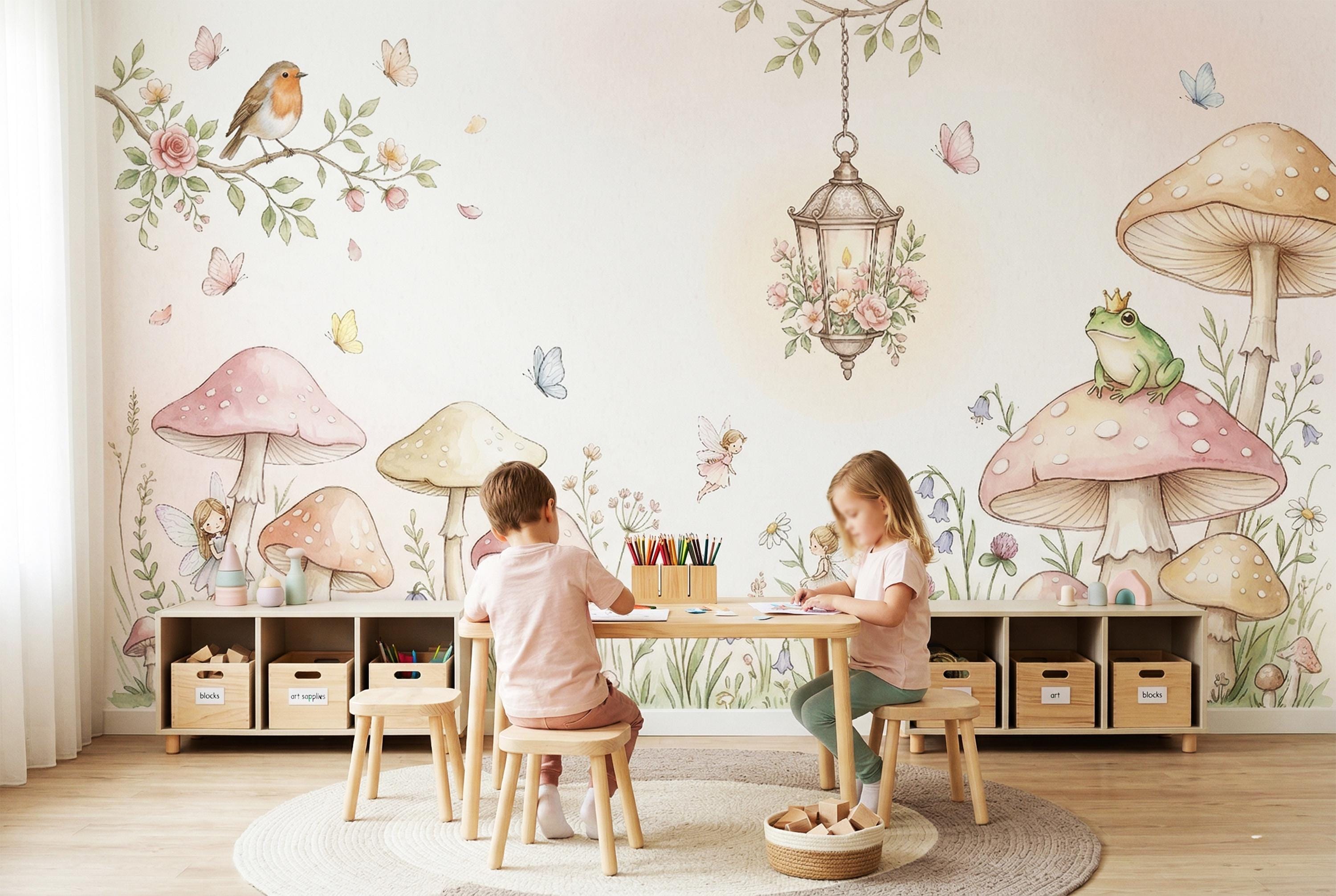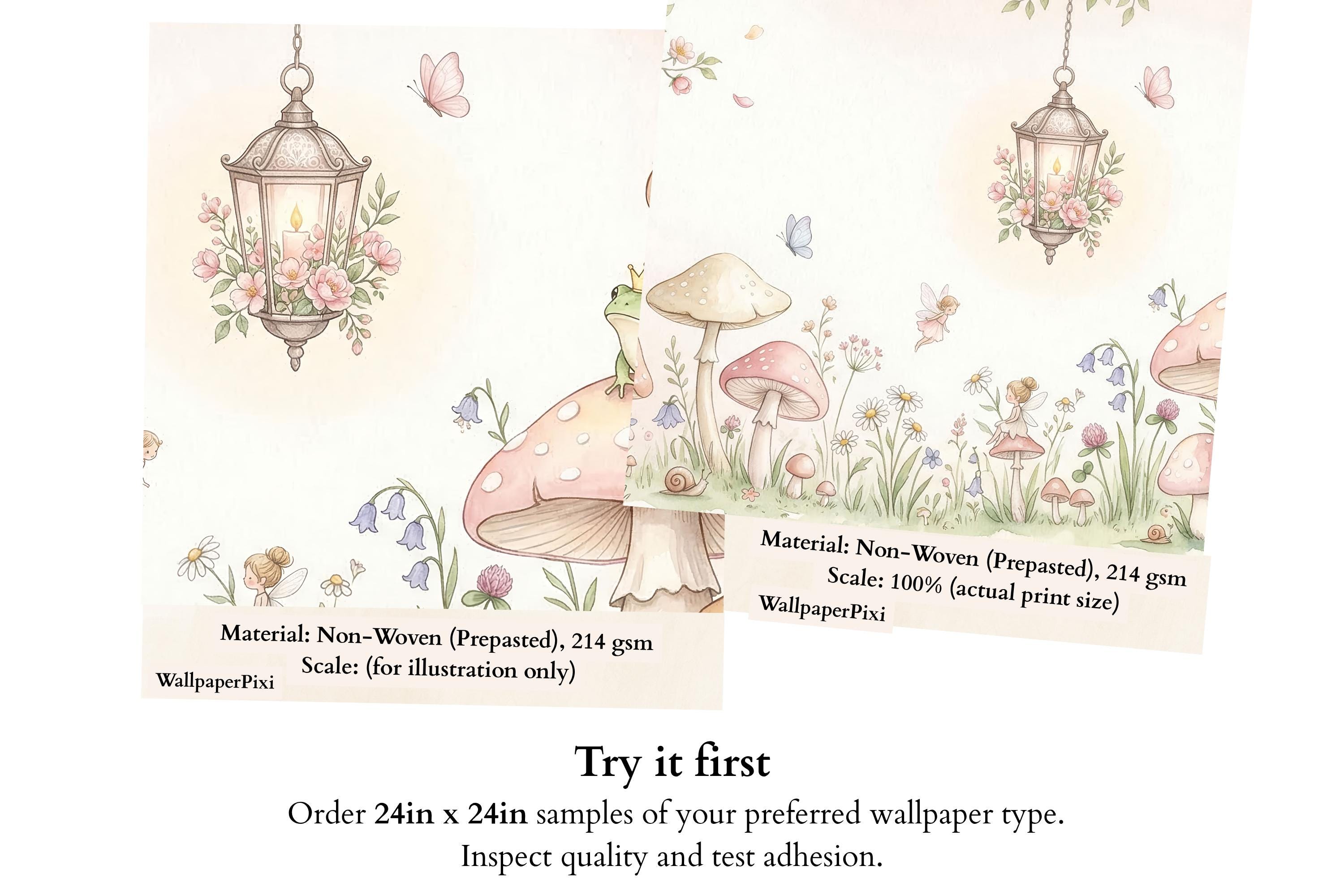 This cottage fairy wallpaper is drawn in the most tender, precise watercolour style — every petal, every wing vein, every mushroom spot rendered with storybook care. As a fairy woods wallpaper it captures the magic of a secret woodland clearing at the exact moment when everything in it is quietly, perfectly alive. As a whimsical baby nursery wallpaper it is unmatched for detail, warmth, and the ability to make a child believe — truly believe — that the world behind the wall is real.