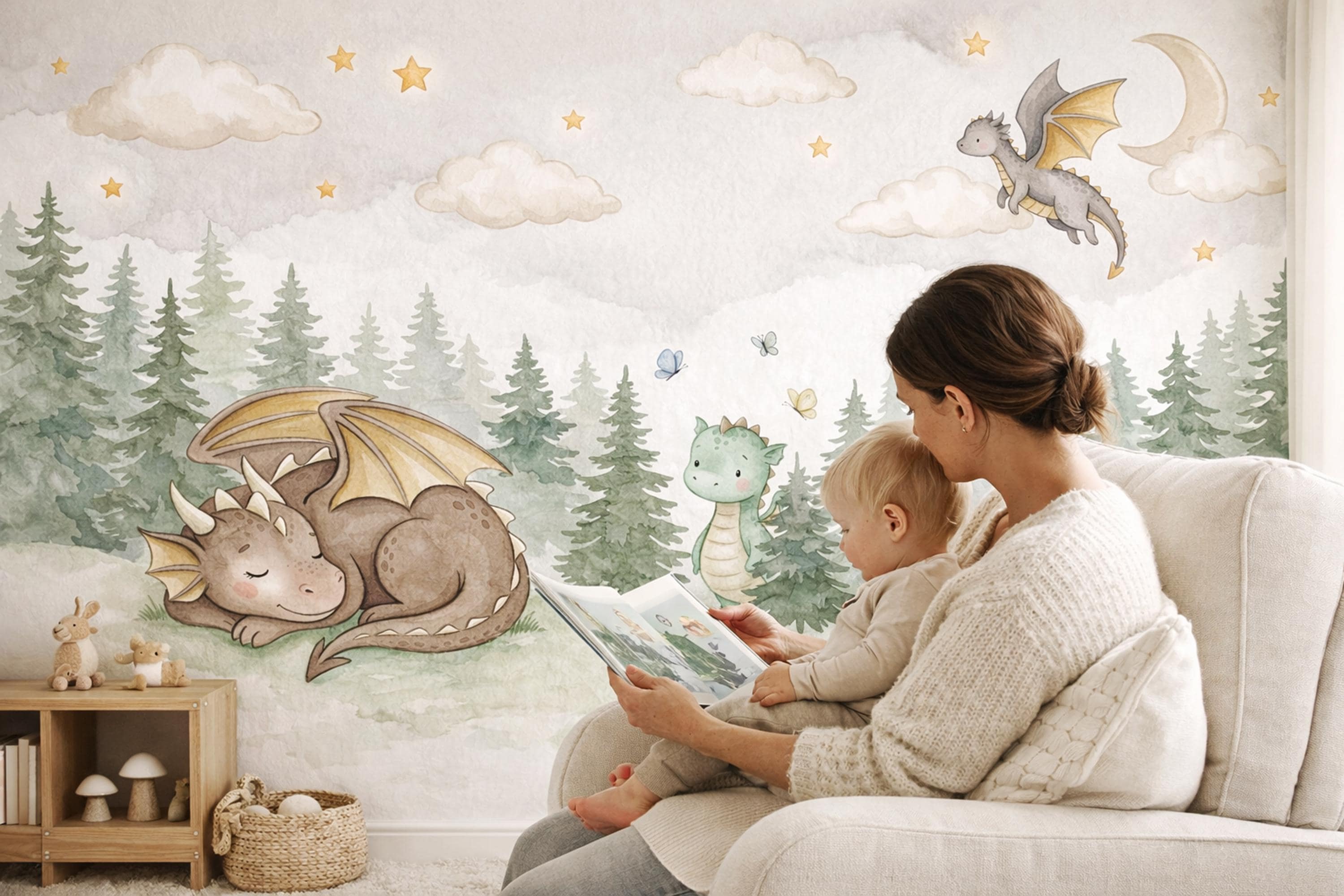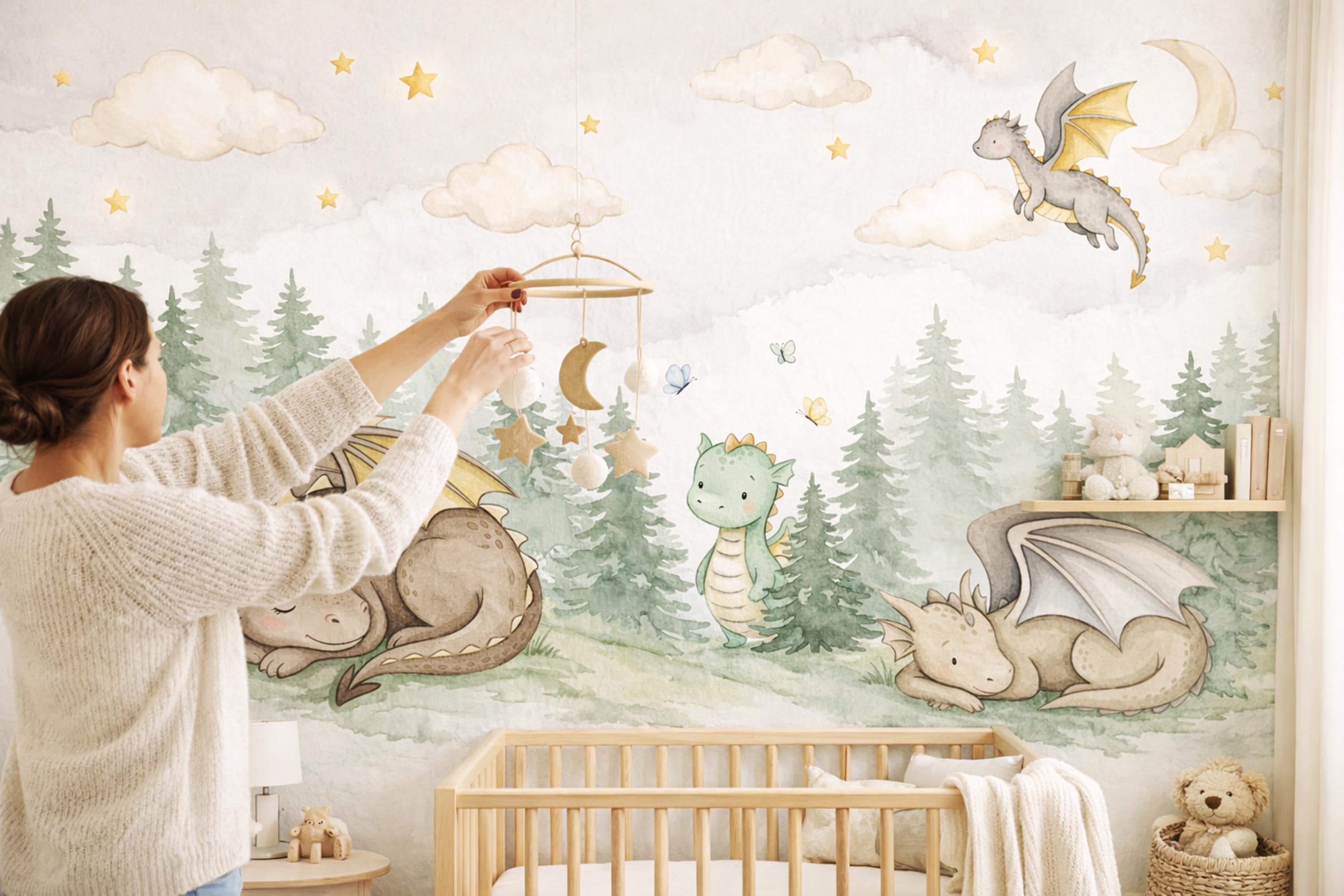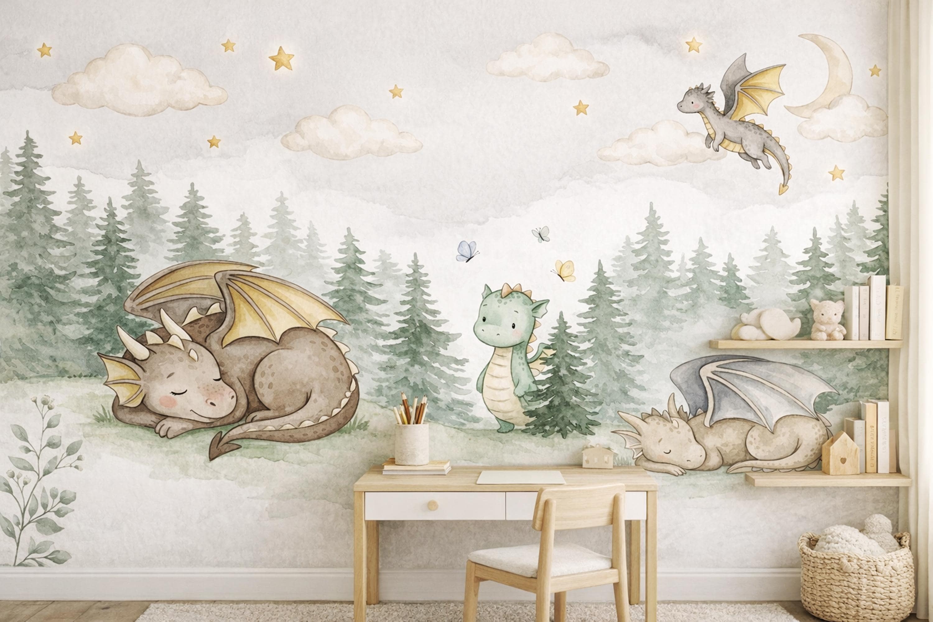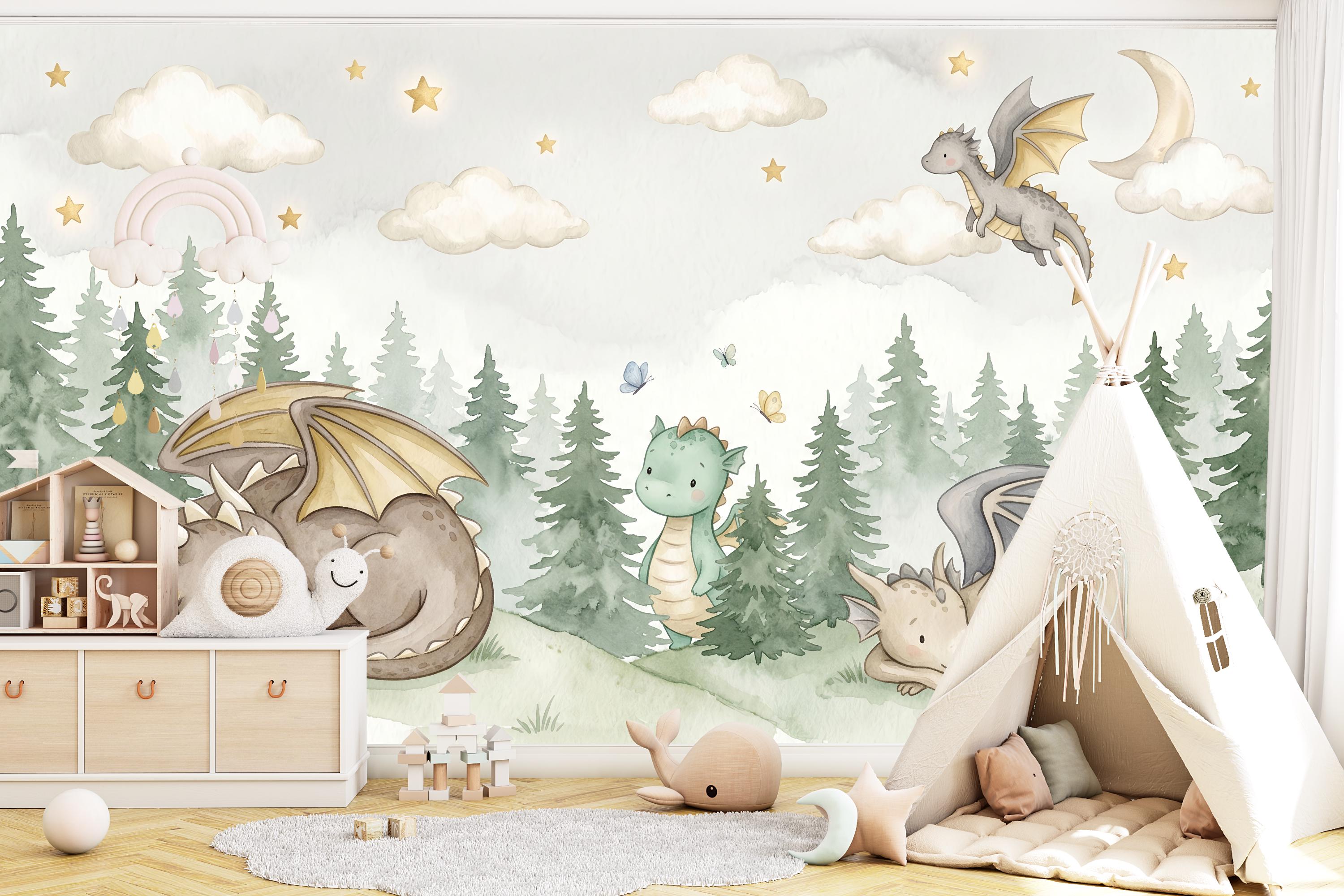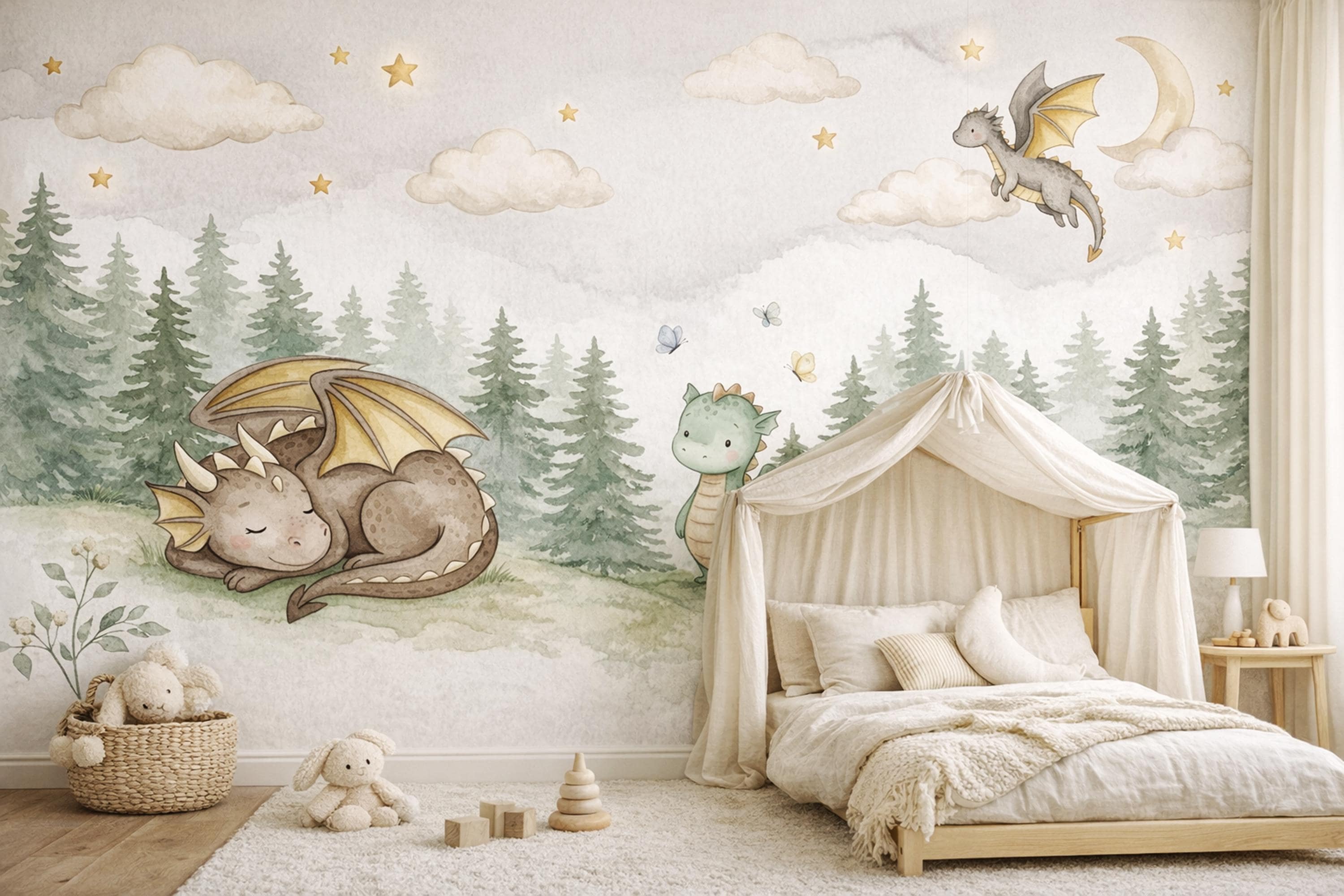 This dragon kids wallpaper is rendered in the most tender watercolour style: sage green pine trees, warm ivory clouds, golden stars, and a muted earth-tone palette that is as soothing as it is imaginative. As a fantasy mural for kids it is completely unique — there is nothing else in the nursery category that combines gentle dragons with this level of storybook artistry.