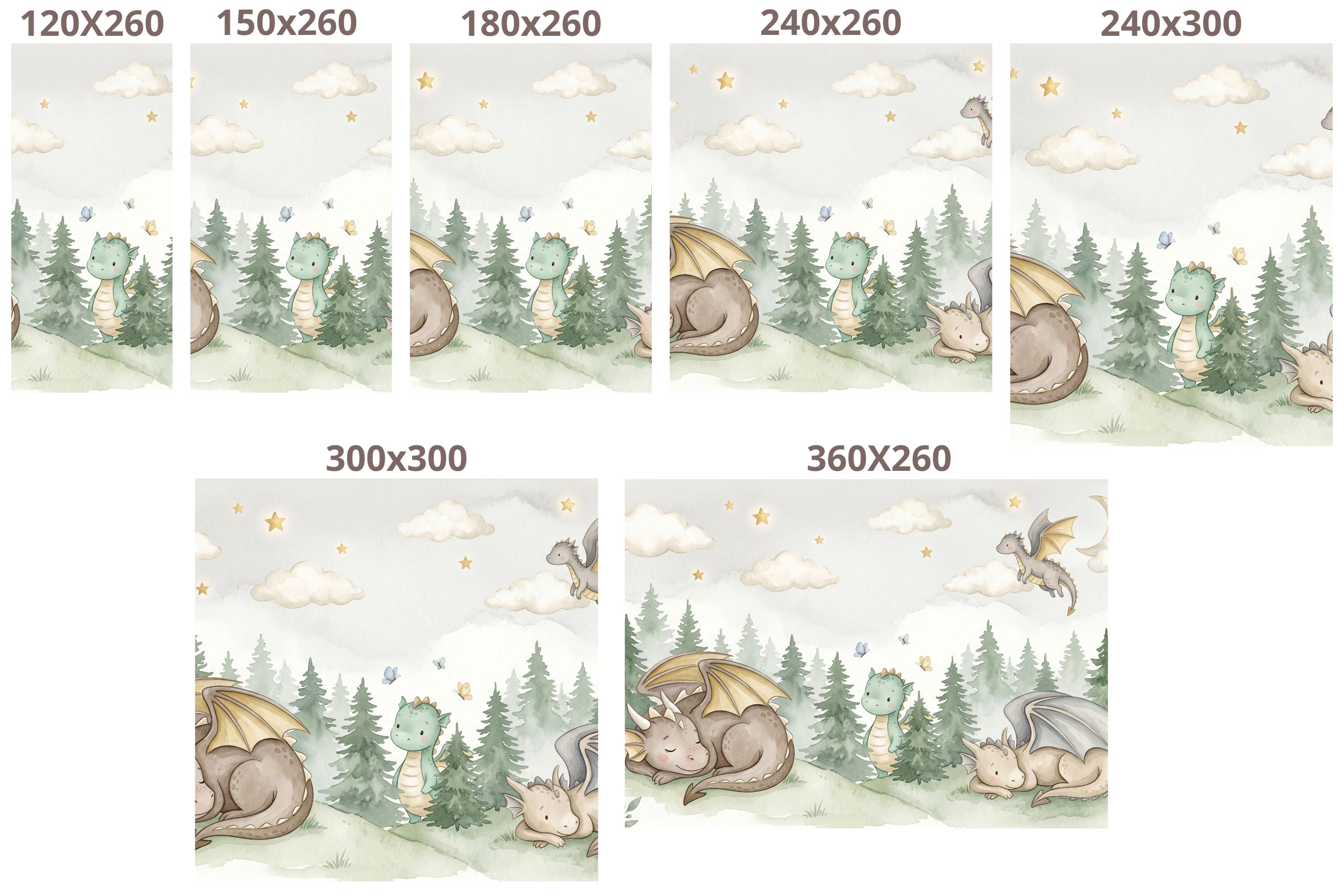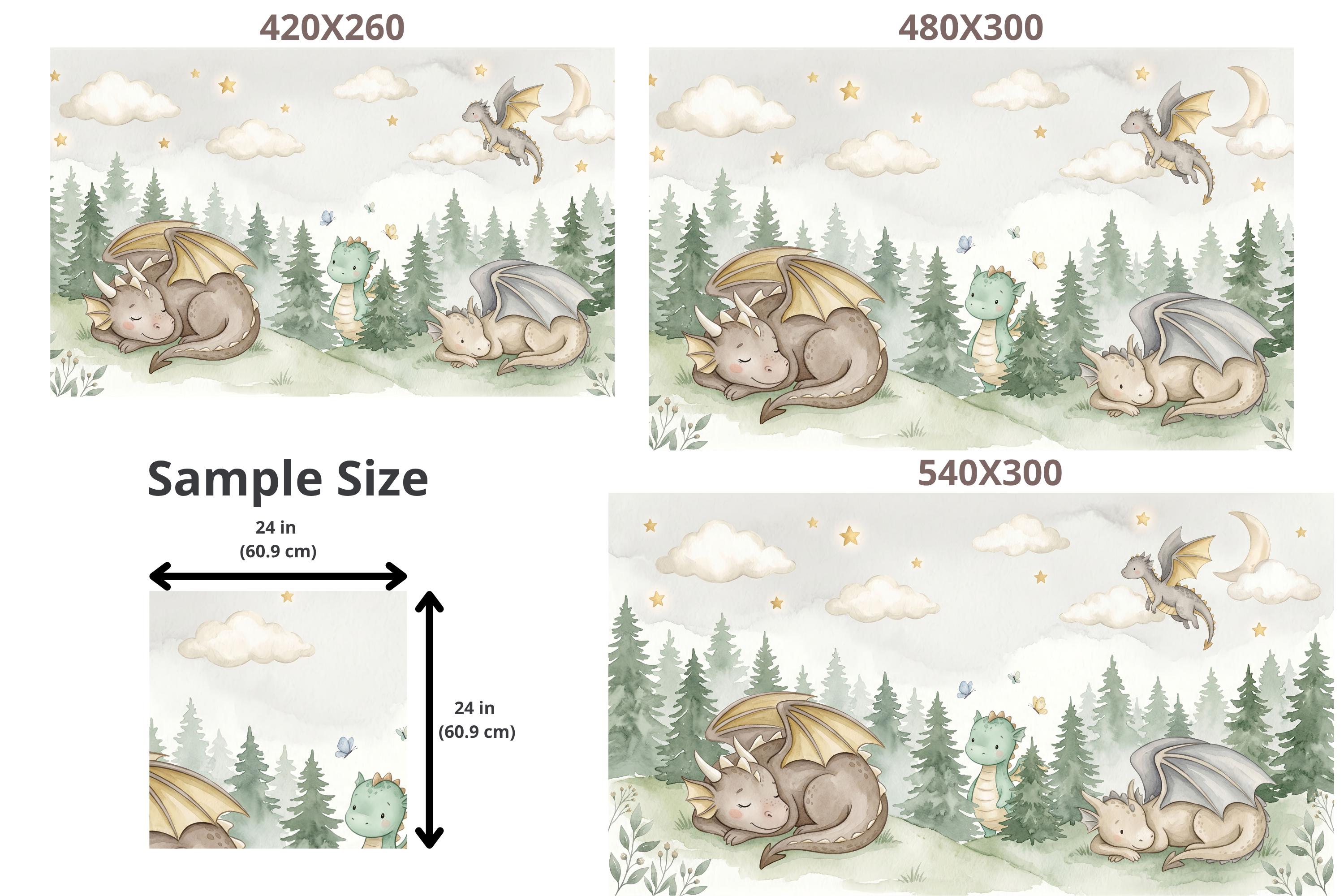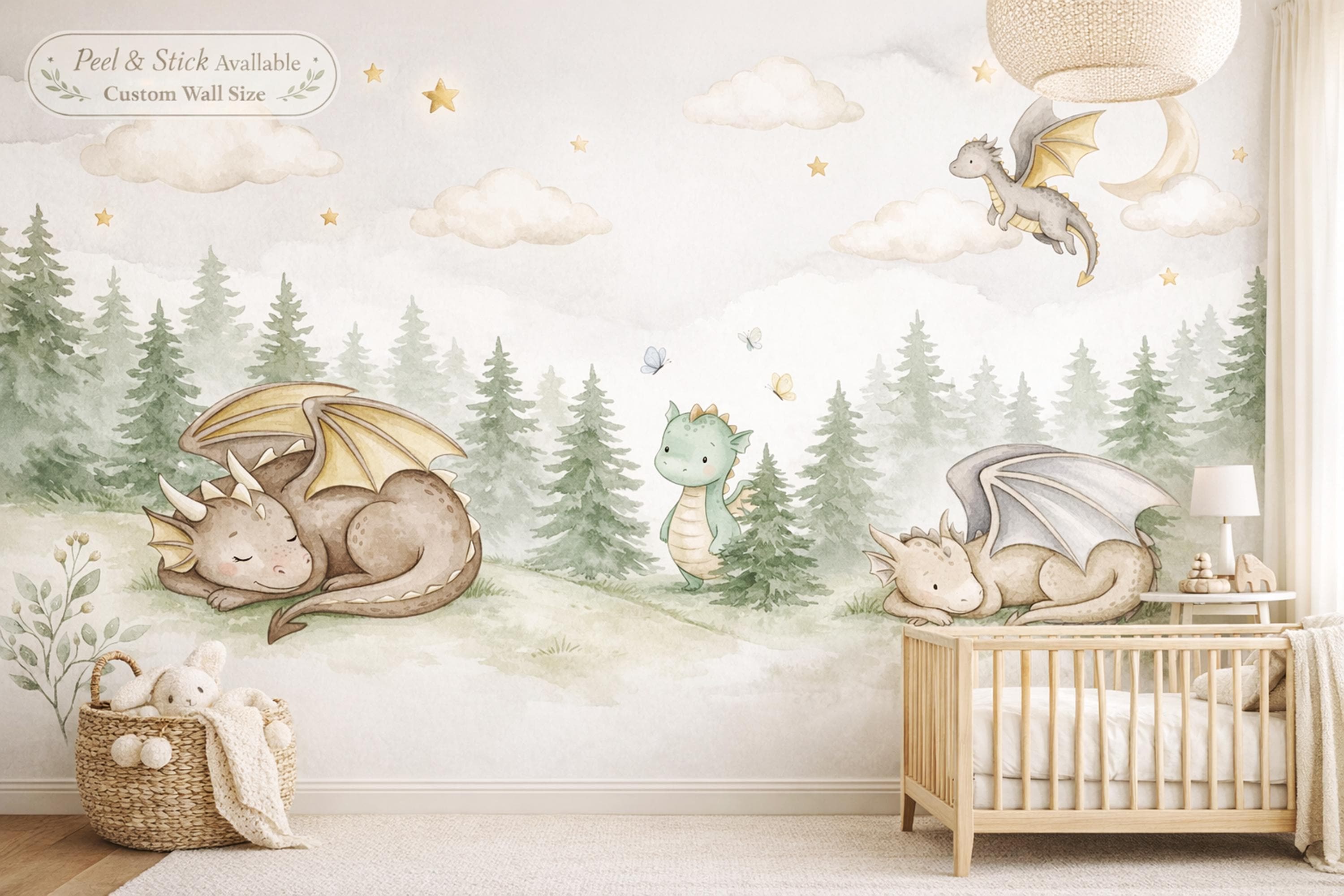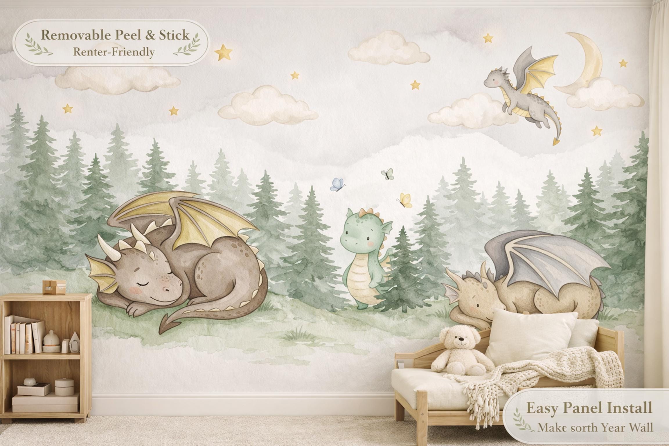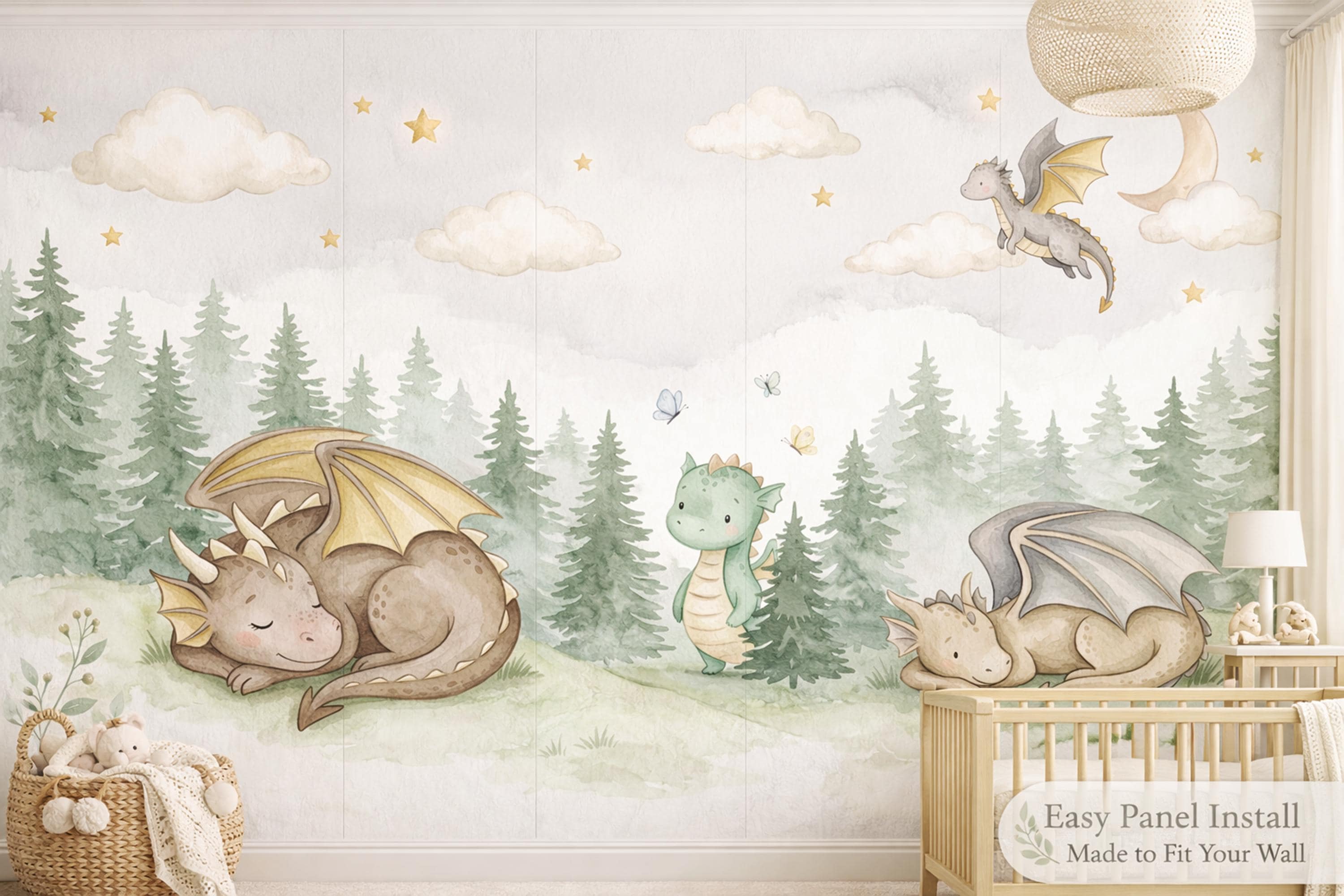 This dragon kids wallpaper is rendered in the most tender watercolour style: sage green pine trees, warm ivory clouds, golden stars, and a muted earth-tone palette that is as soothing as it is imaginative. As a fantasy mural for kids it is completely unique — there is nothing else in the nursery category that combines gentle dragons with this level of storybook artistry.