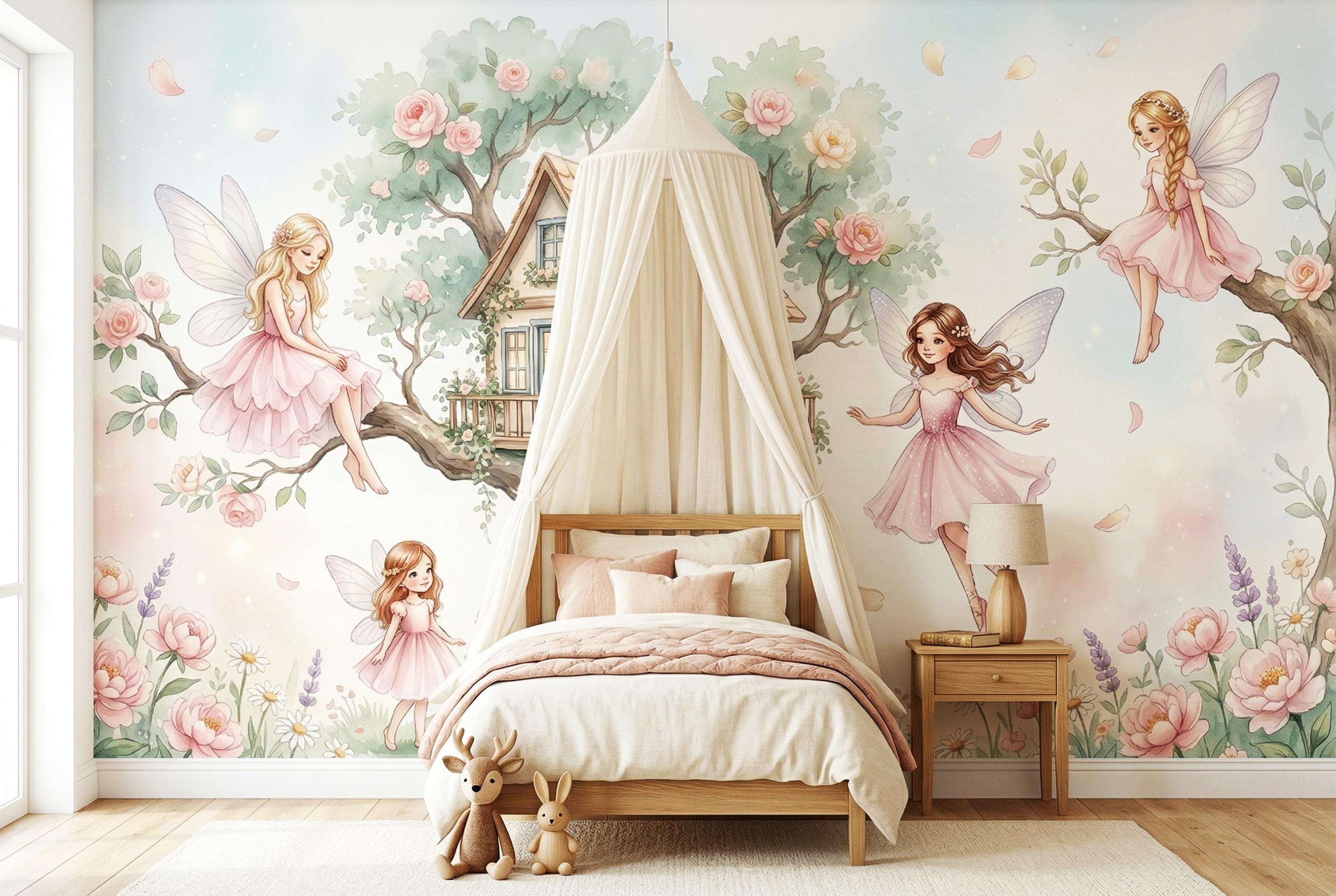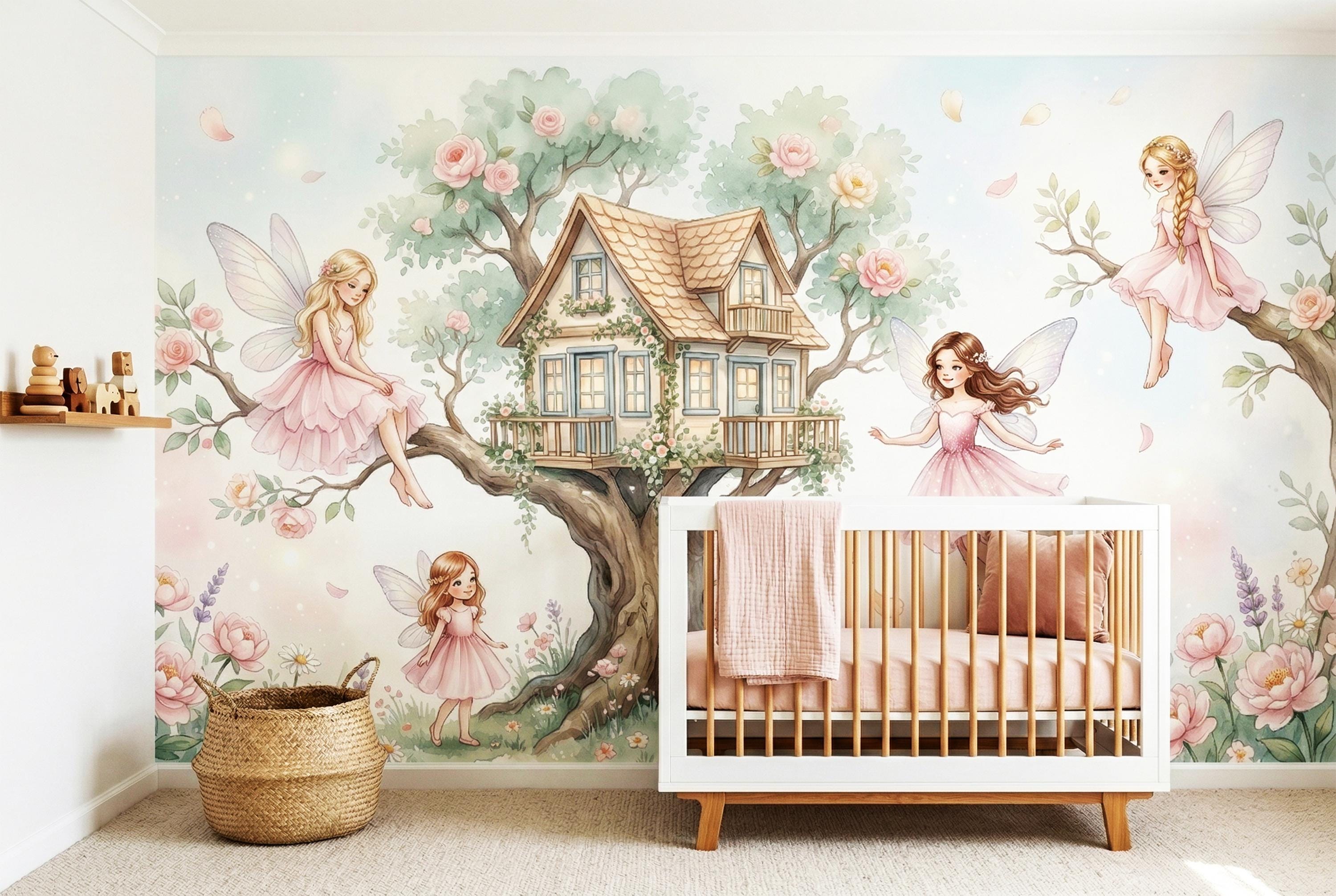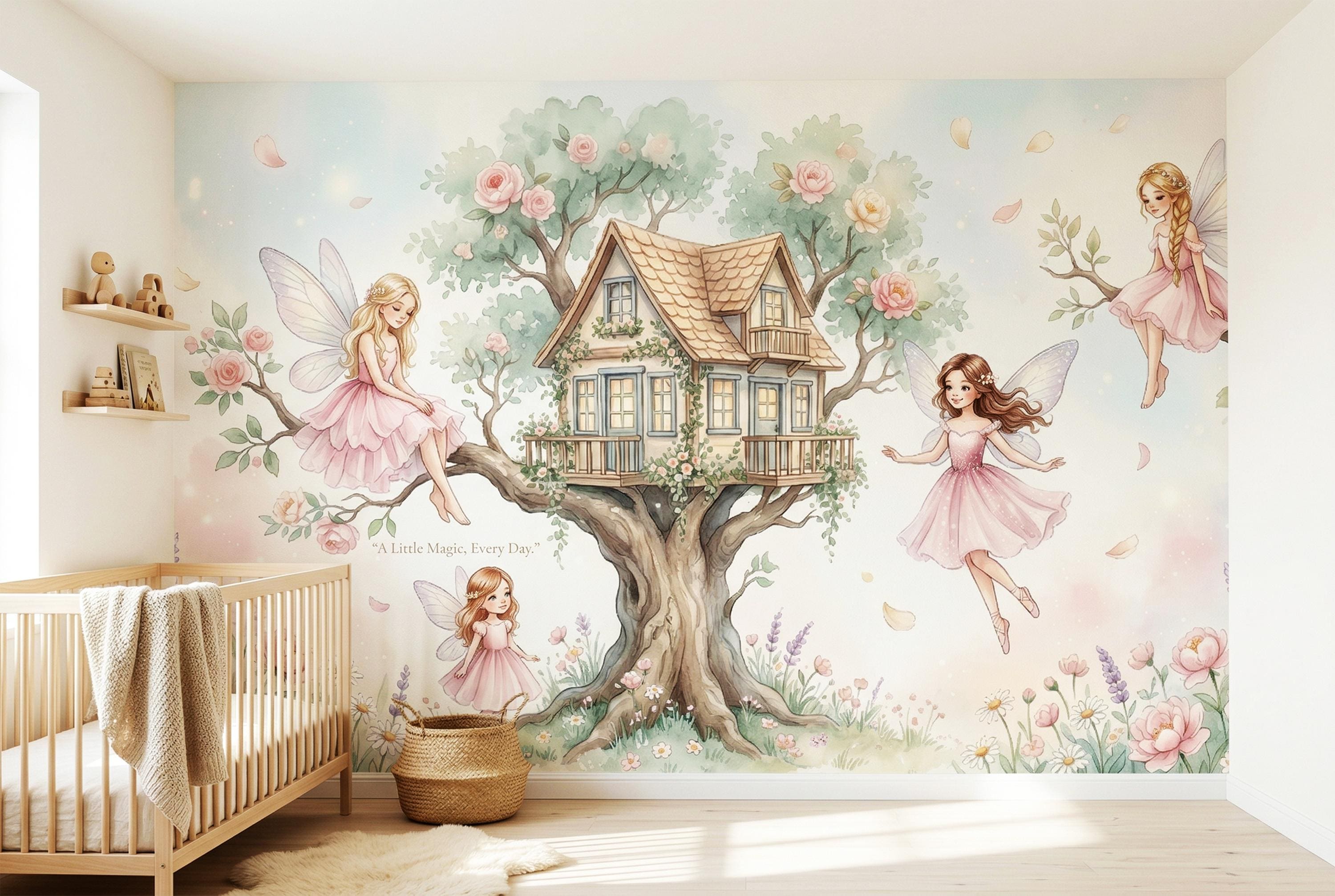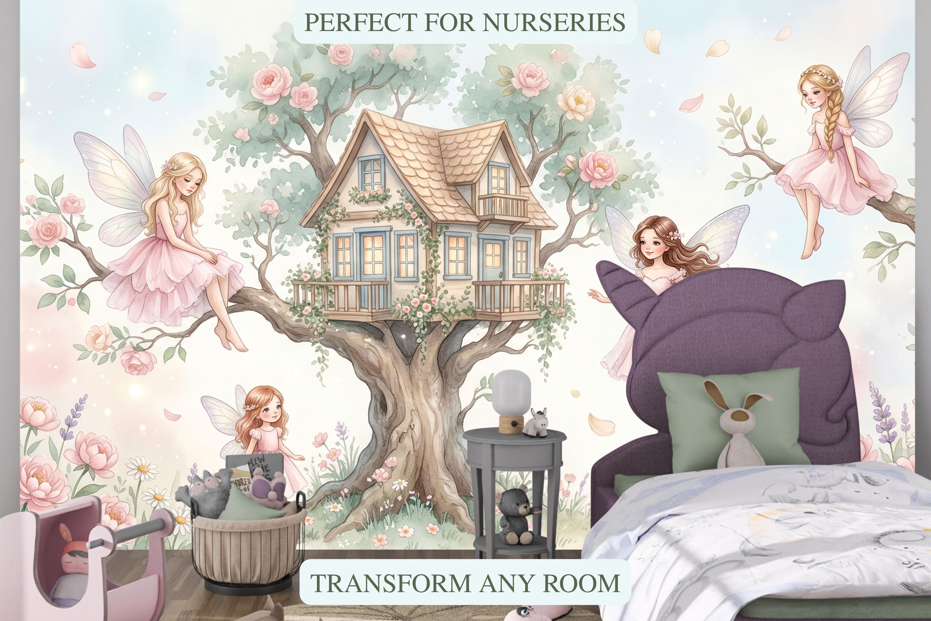 As a cottage fairy wallpaper it is exquisitely detailed and endlessly warm. As a fairy forest mural it captures the most intimate, domestic side of the fairy world — not a dark wood, but a sunny garden where fairies actually live. As an enchanted forest removable wallpaper it works from newborn nursery right through to a school-age bedroom, ageing gracefully with its owner.