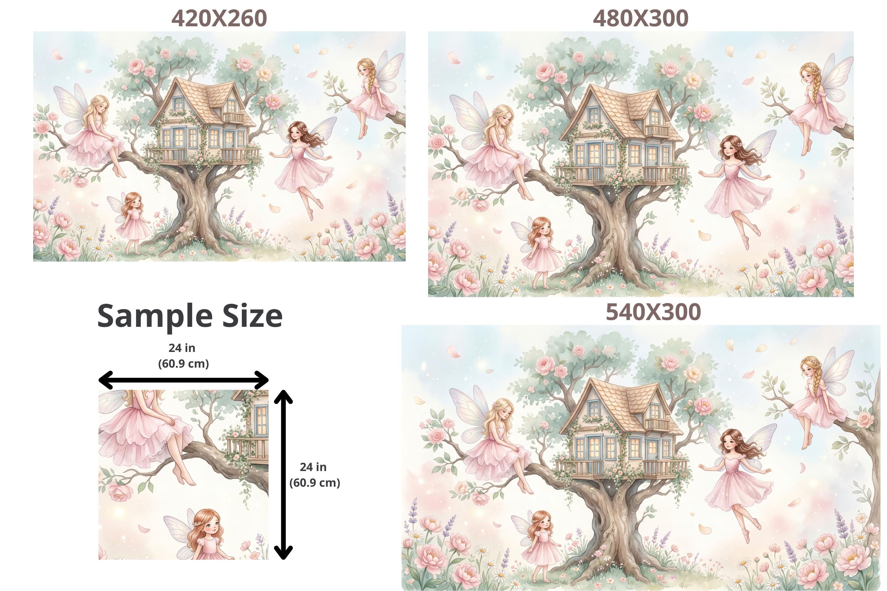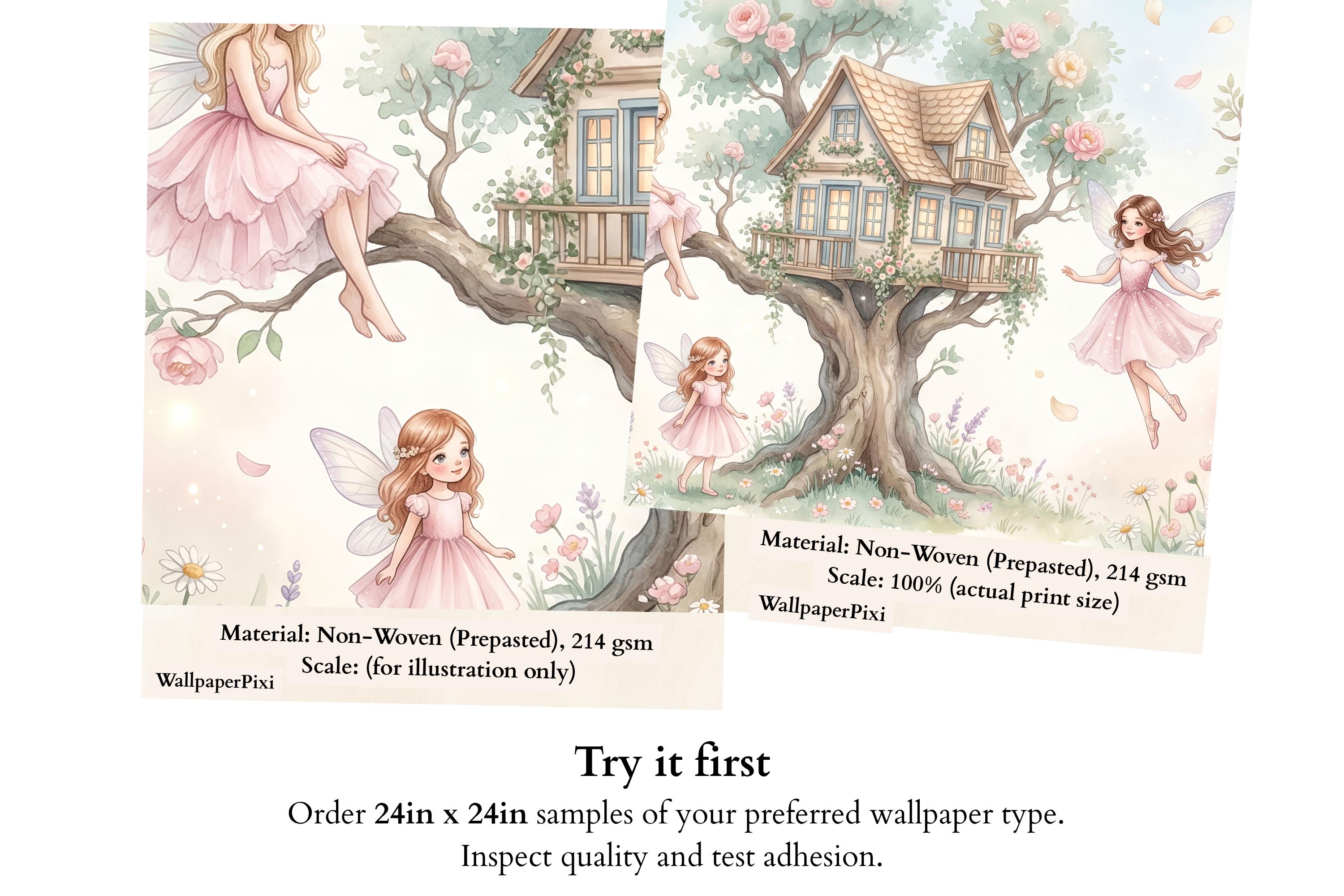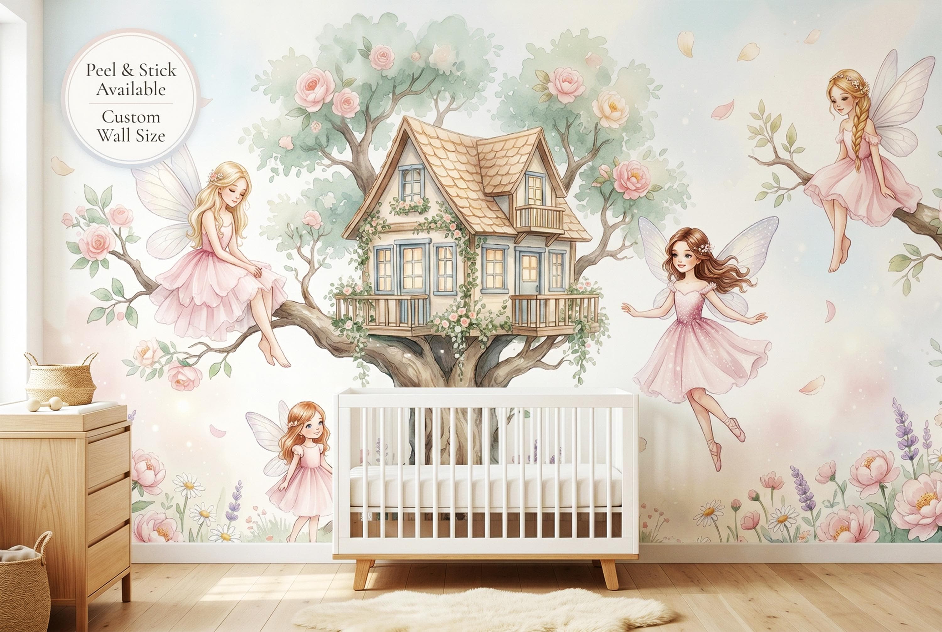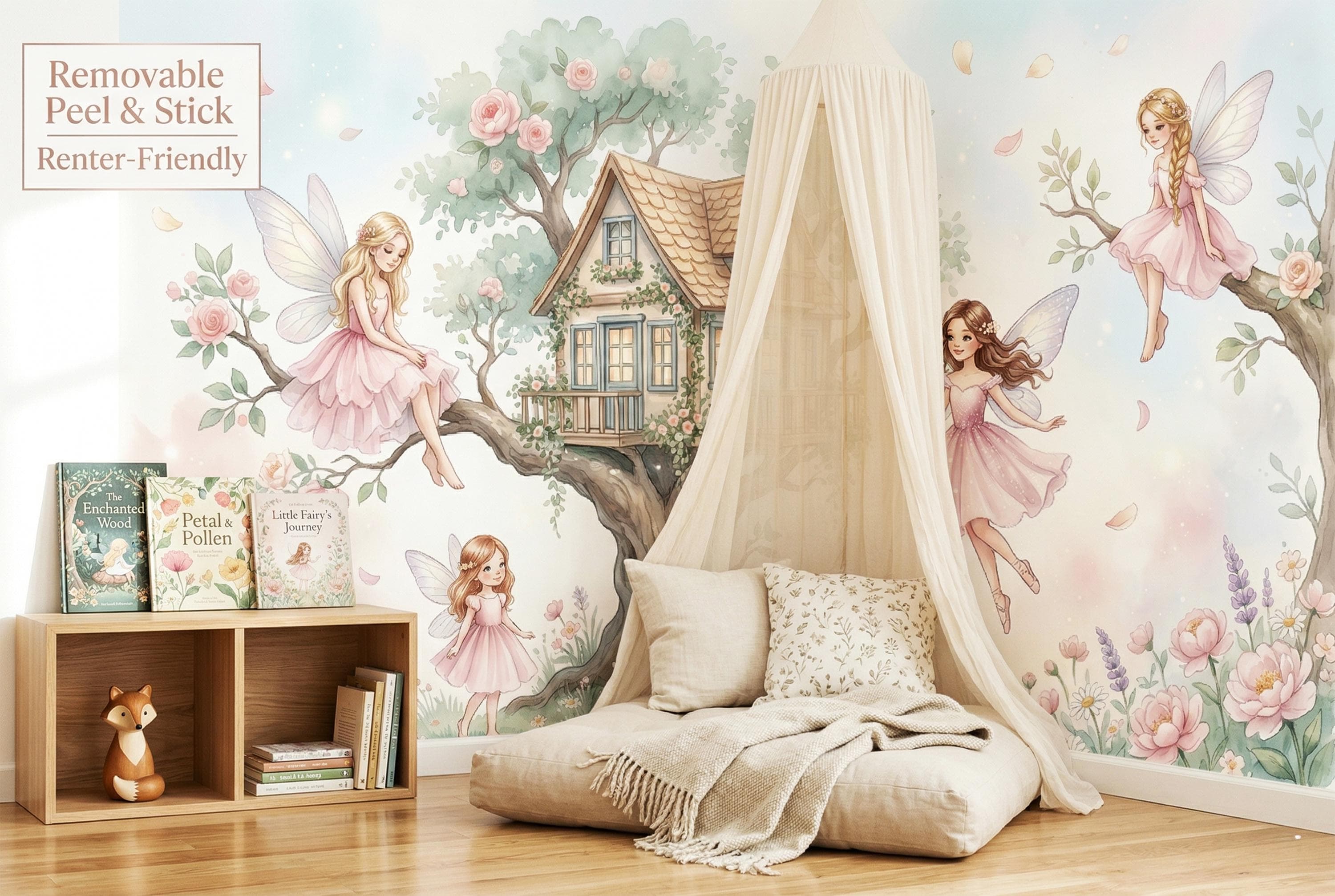 As a cottage fairy wallpaper it is exquisitely detailed and endlessly warm. As a fairy forest mural it captures the most intimate, domestic side of the fairy world — not a dark wood, but a sunny garden where fairies actually live. As an enchanted forest removable wallpaper it works from newborn nursery right through to a school-age bedroom, ageing gracefully with its owner.