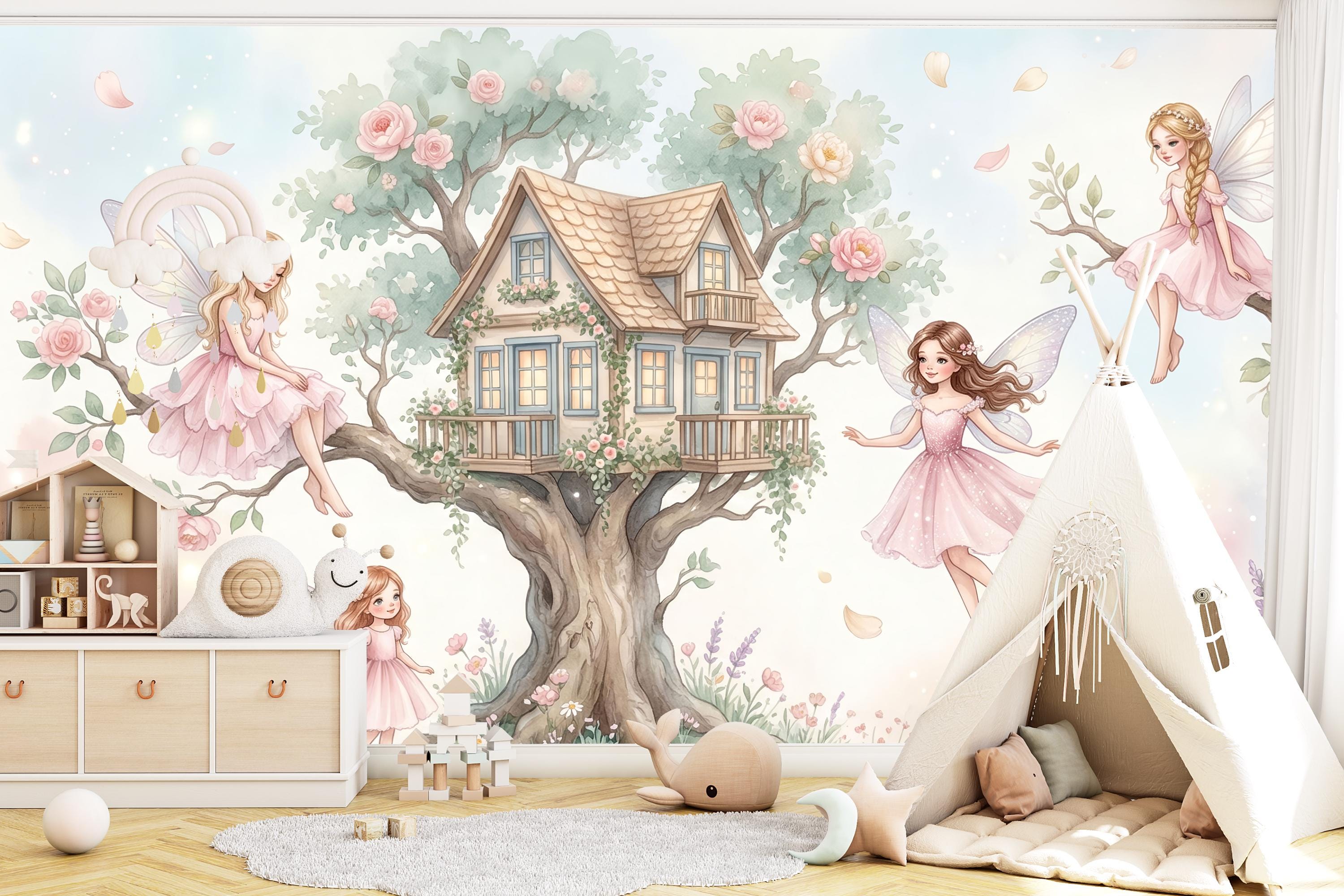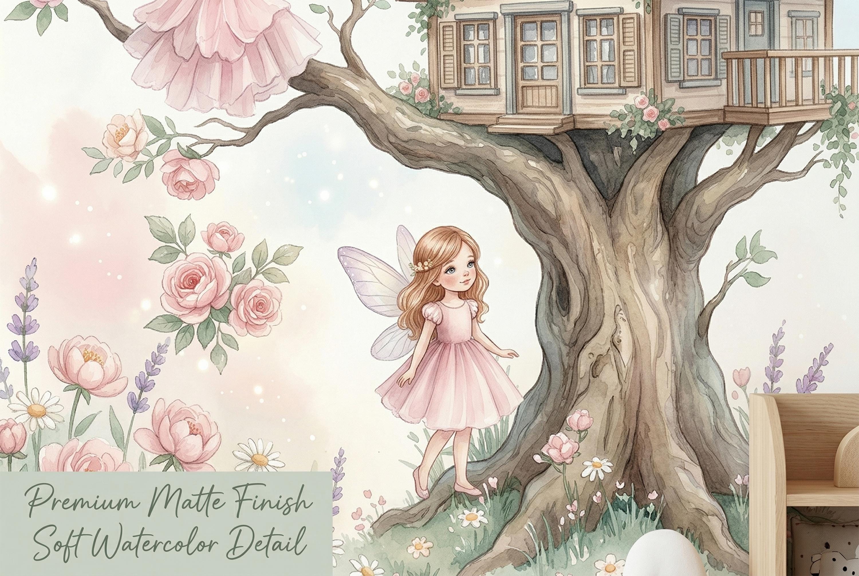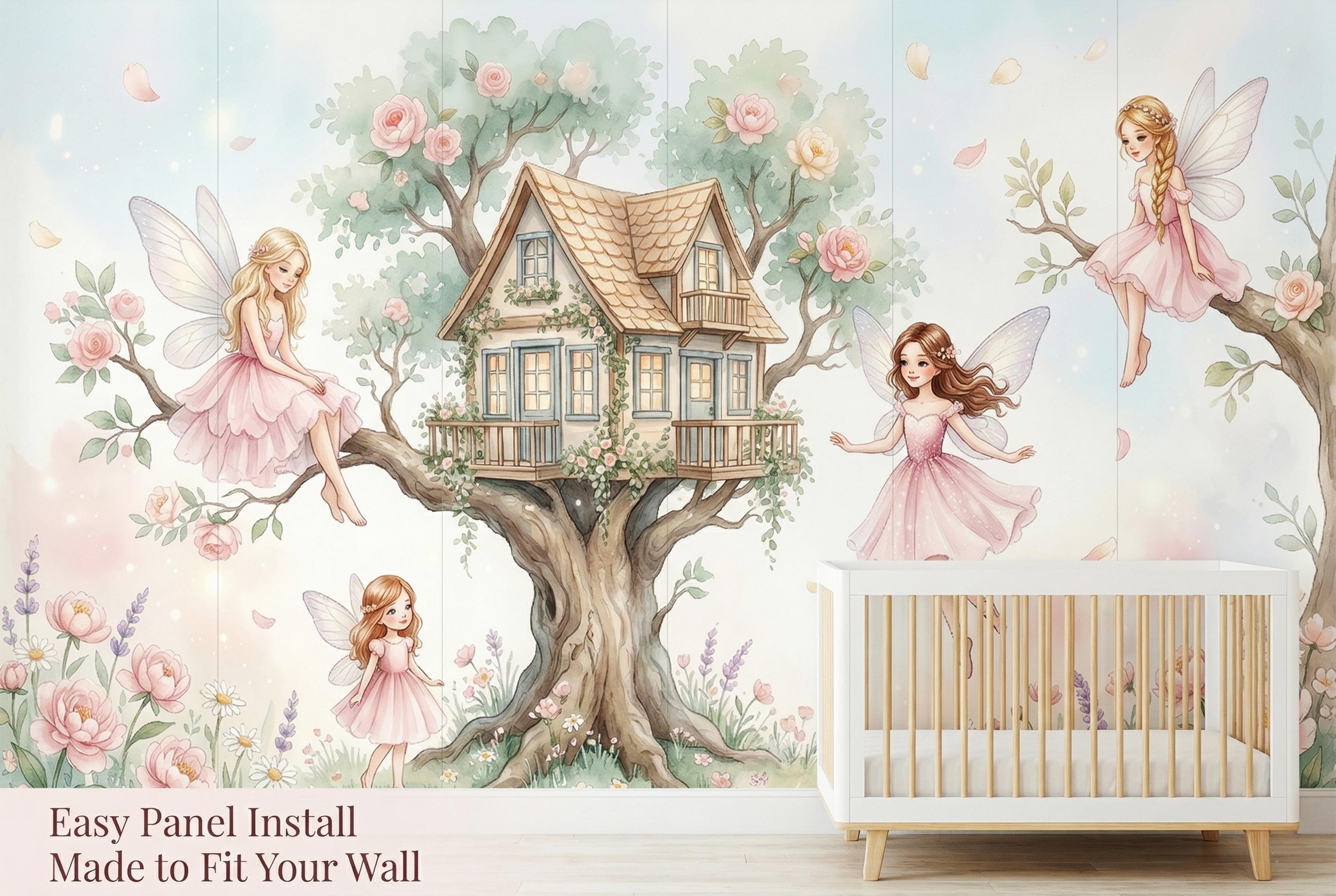 This fairy treehouse peel and stick mural by WallpaperPixi is one of our most adored girls room designs — a complete fairy tale world centred on a charming two-storey oak treehouse with a tiled roof, lit blue windows, an ivy-draped balcony, and climbing roses winding up the trunk.