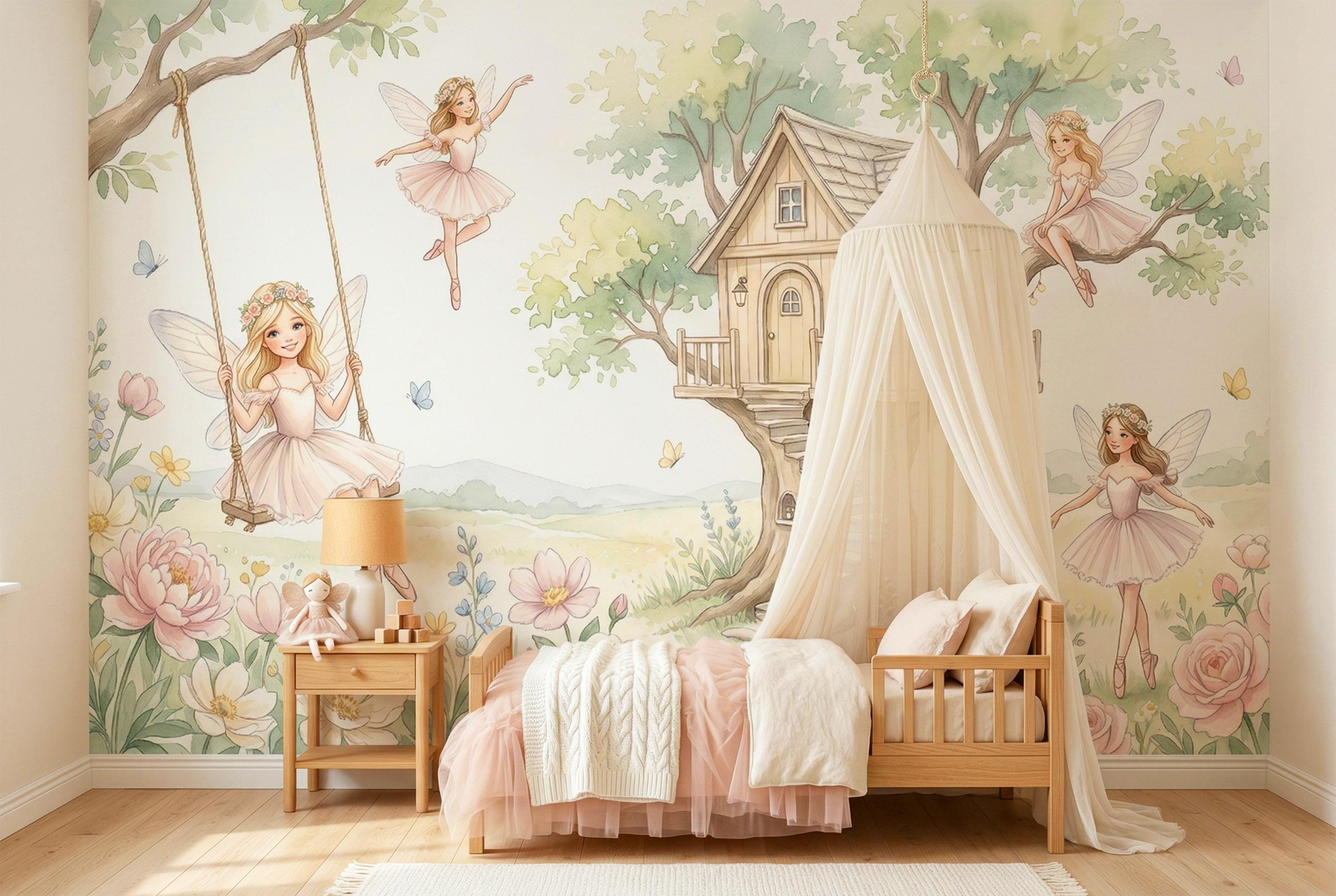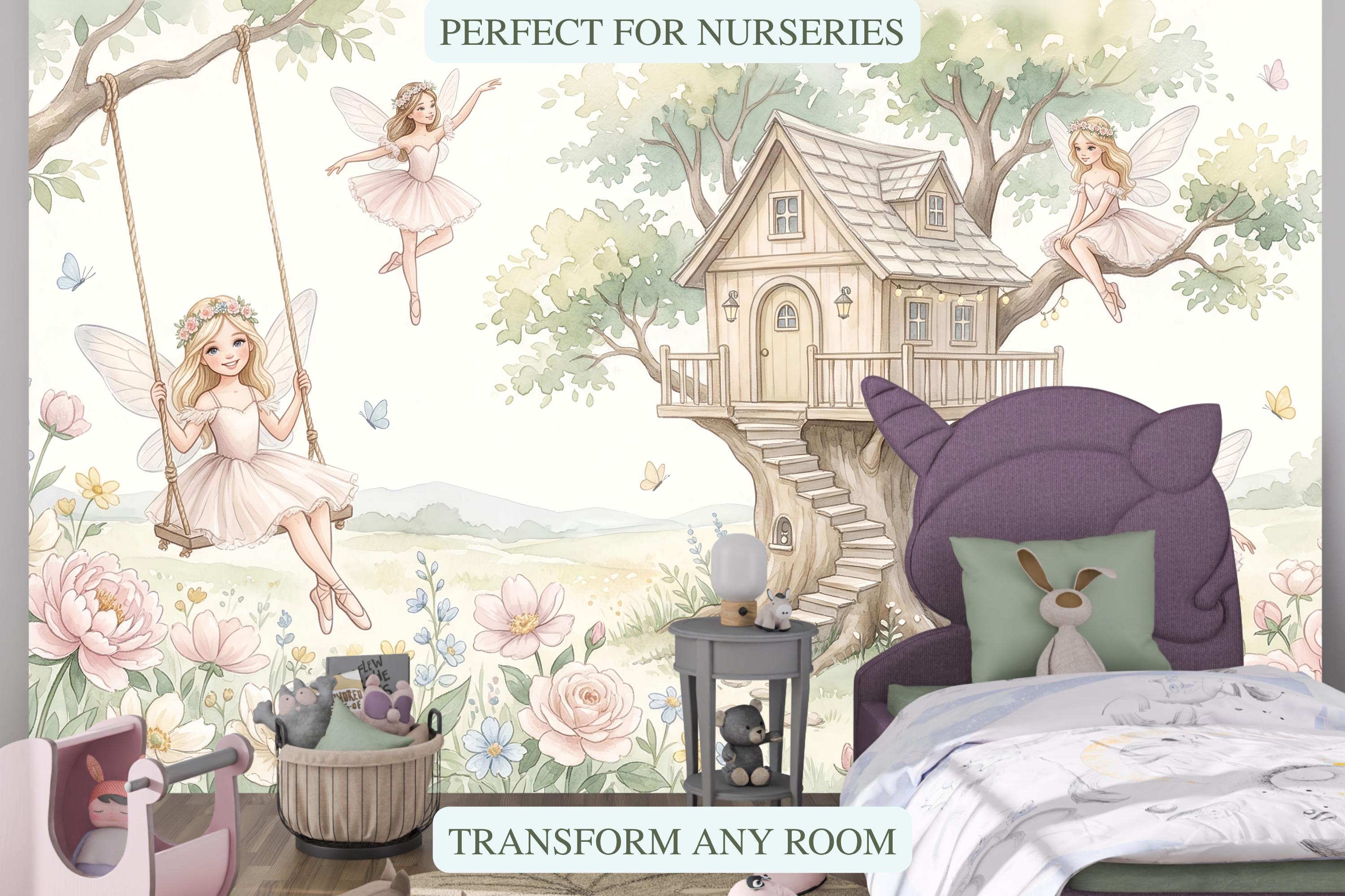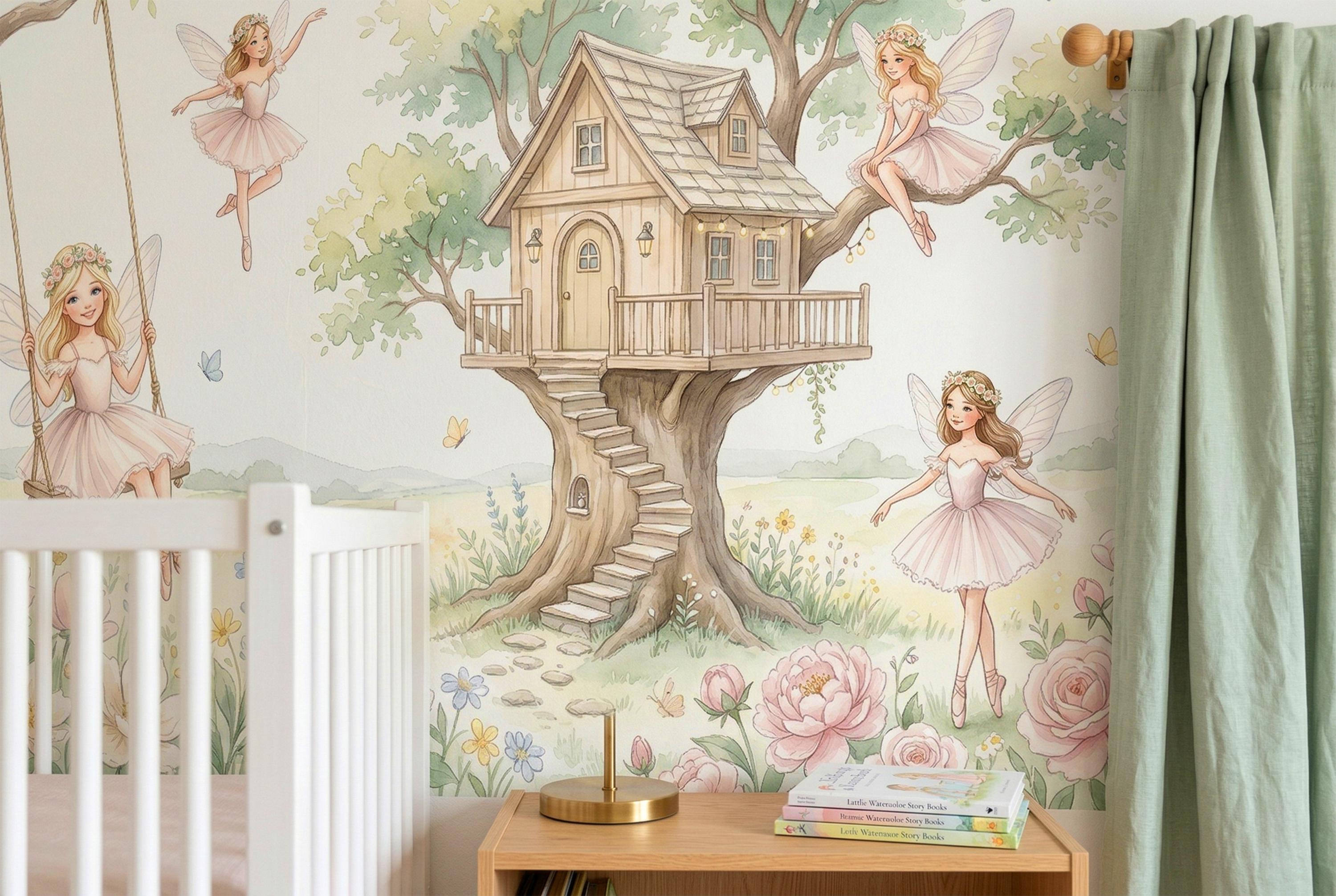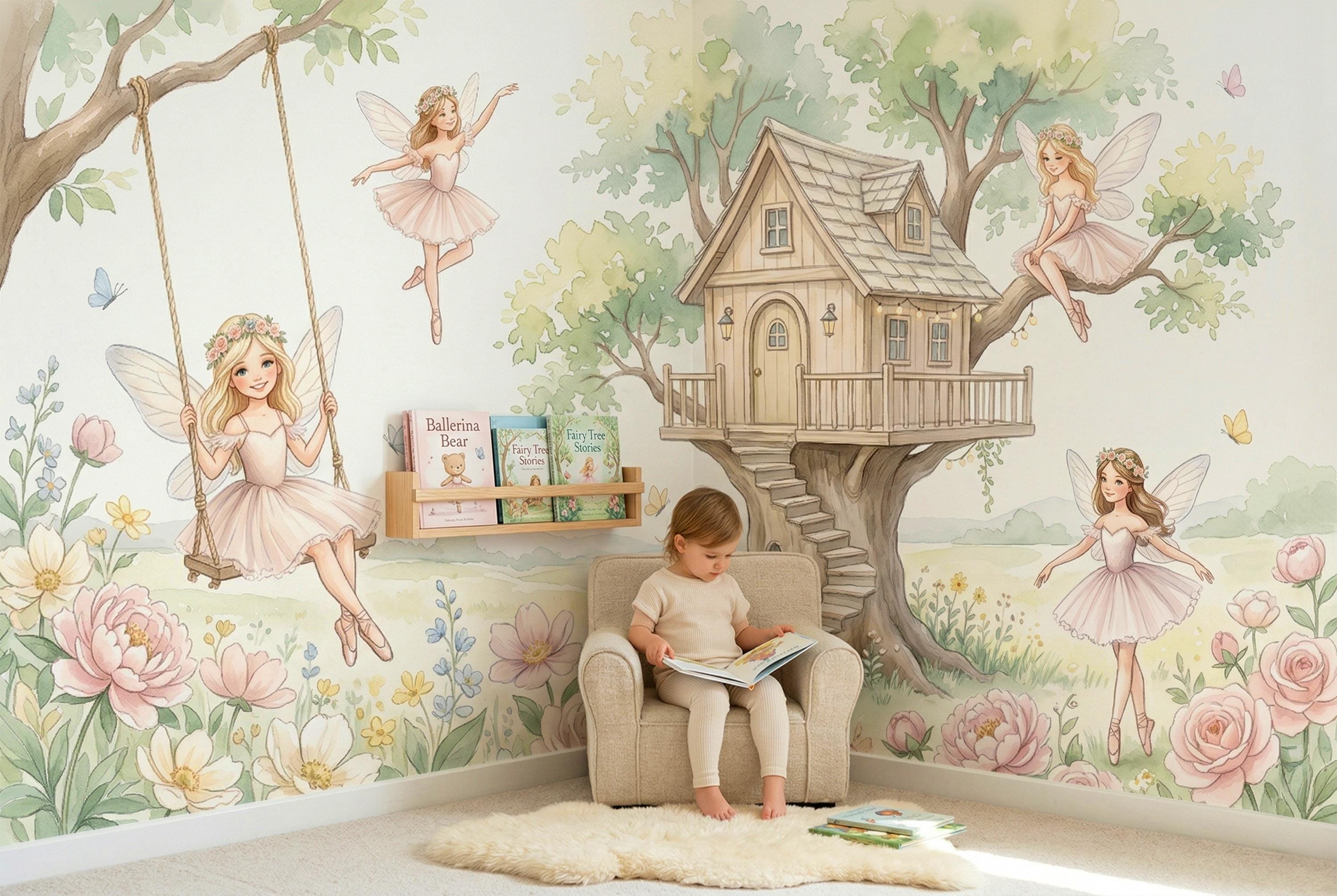 As a cottage fairy wallpaper it is warm, intimate, and full of personality — four distinct characters, each with her own relationship to the garden around her. As a fairy wall mural for a girls room it bridges ballet and fairy tale in a way no other design in the category does. As a woodland fairy wallpaper it captures the outdoor, sun-drenched quality of a real enchanted garden rather than a dark forest.