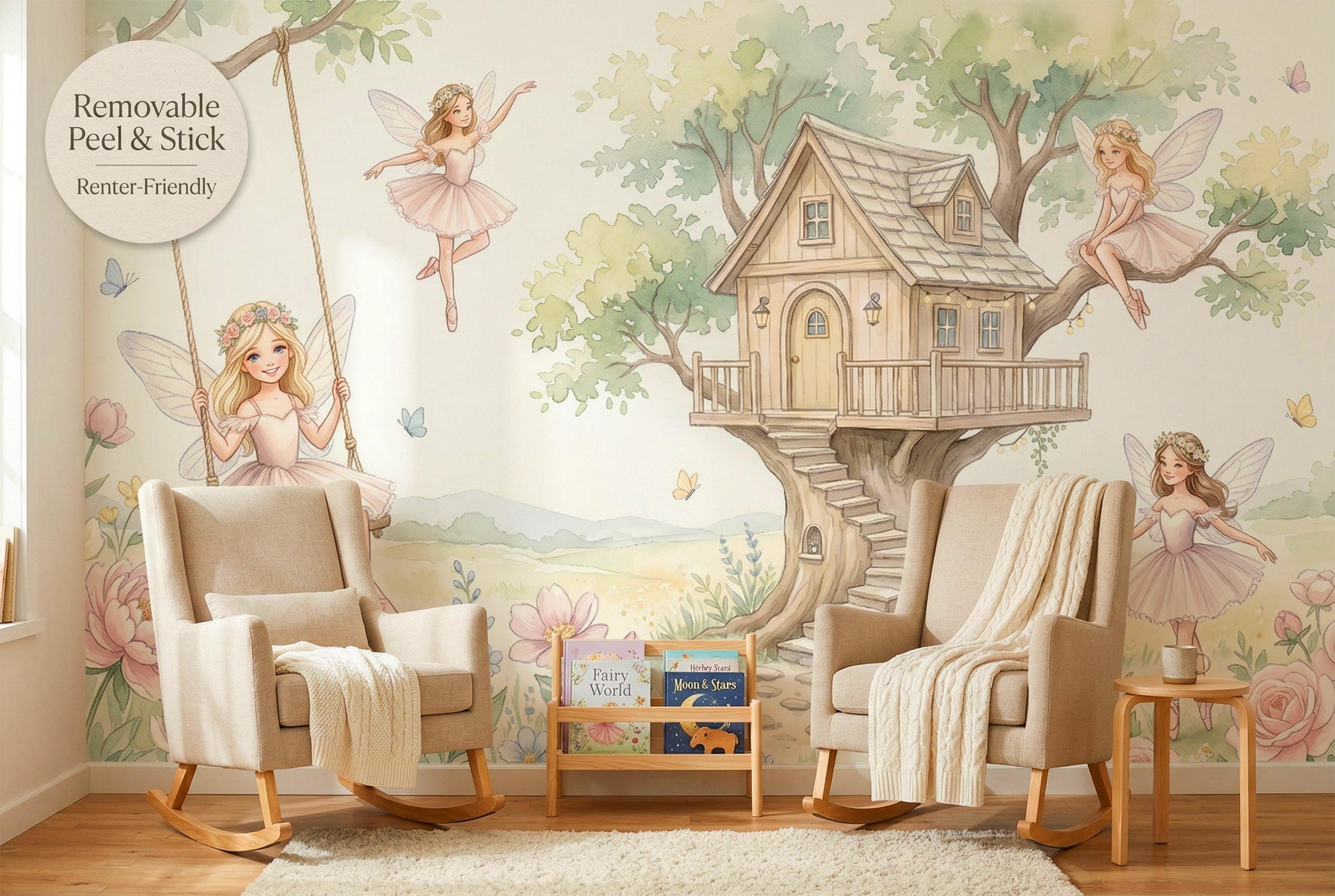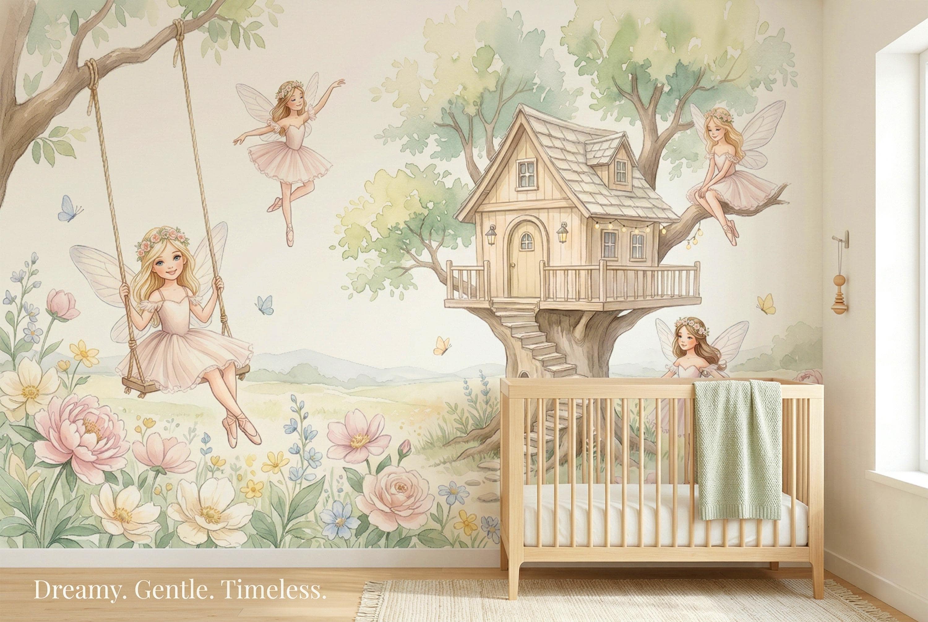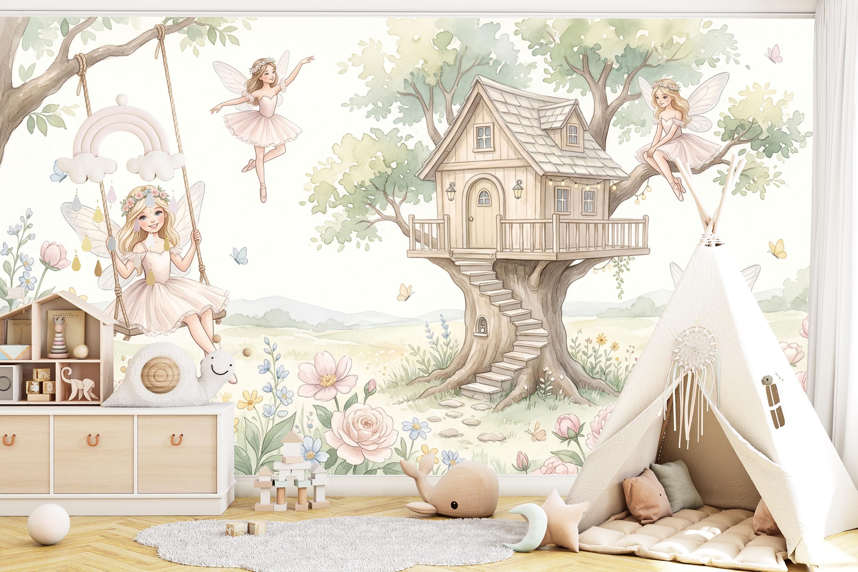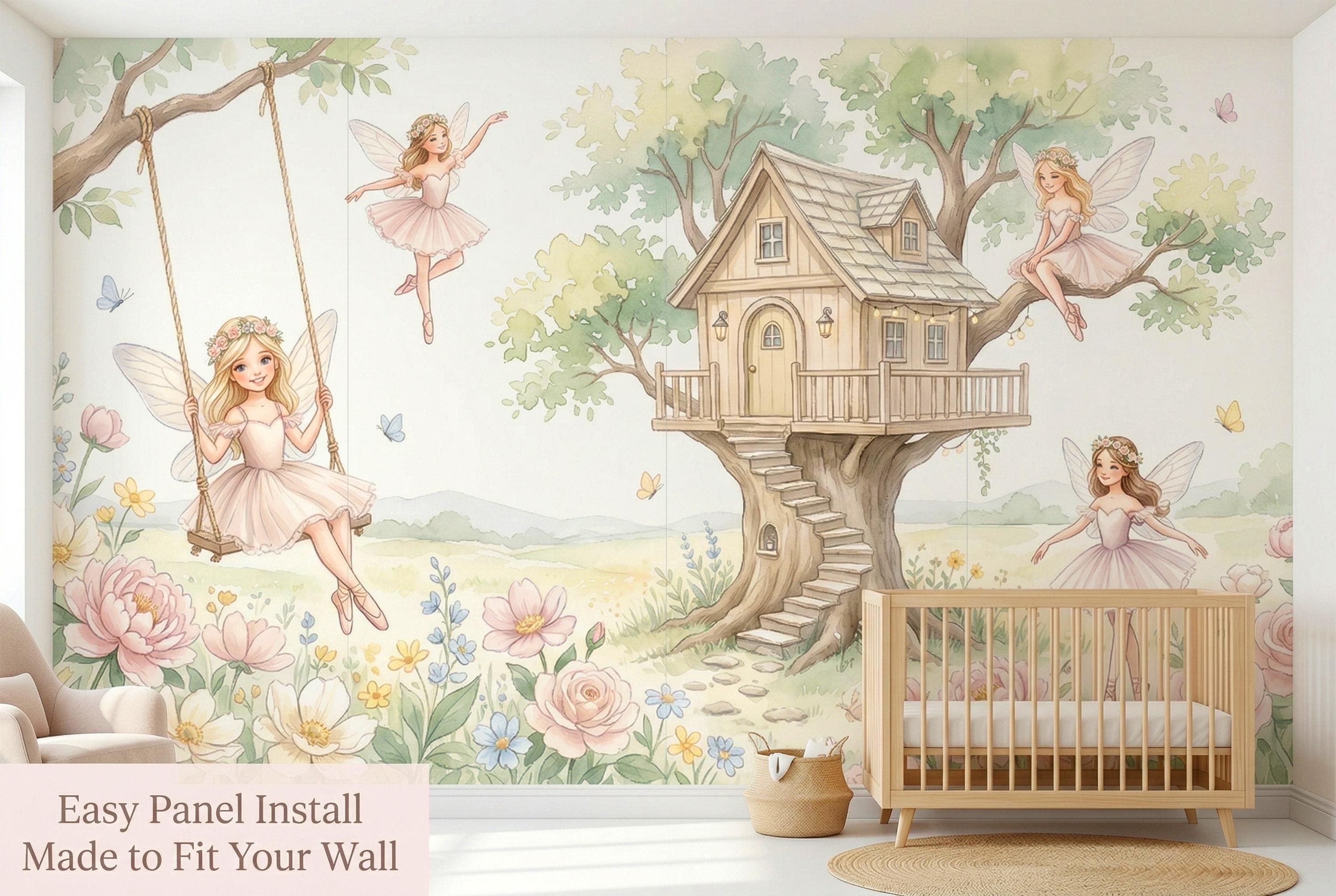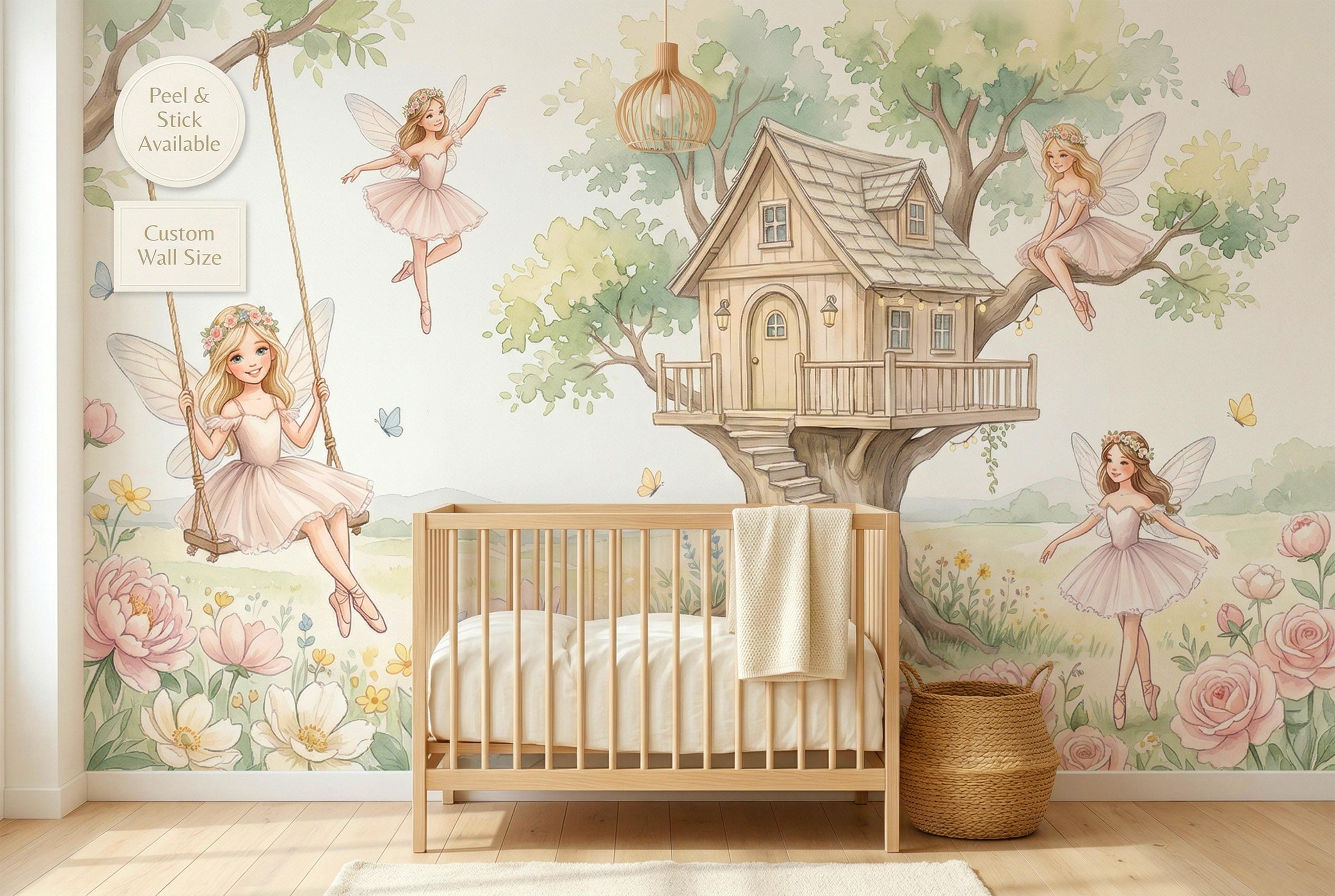 As a cottage fairy wallpaper it is warm, intimate, and full of personality — four distinct characters, each with her own relationship to the garden around her. As a fairy wall mural for a girls room it bridges ballet and fairy tale in a way no other design in the category does. As a woodland fairy wallpaper it captures the outdoor, sun-drenched quality of a real enchanted garden rather than a dark forest.