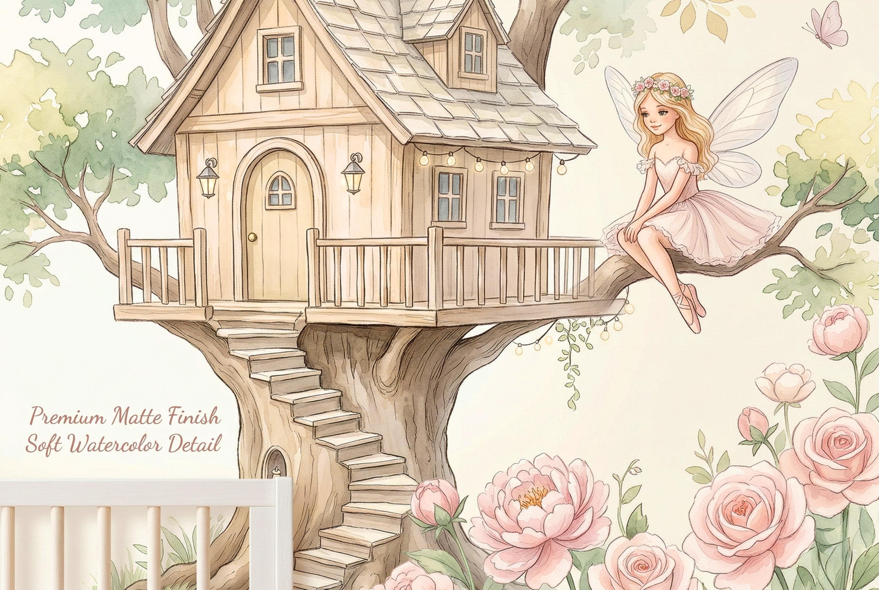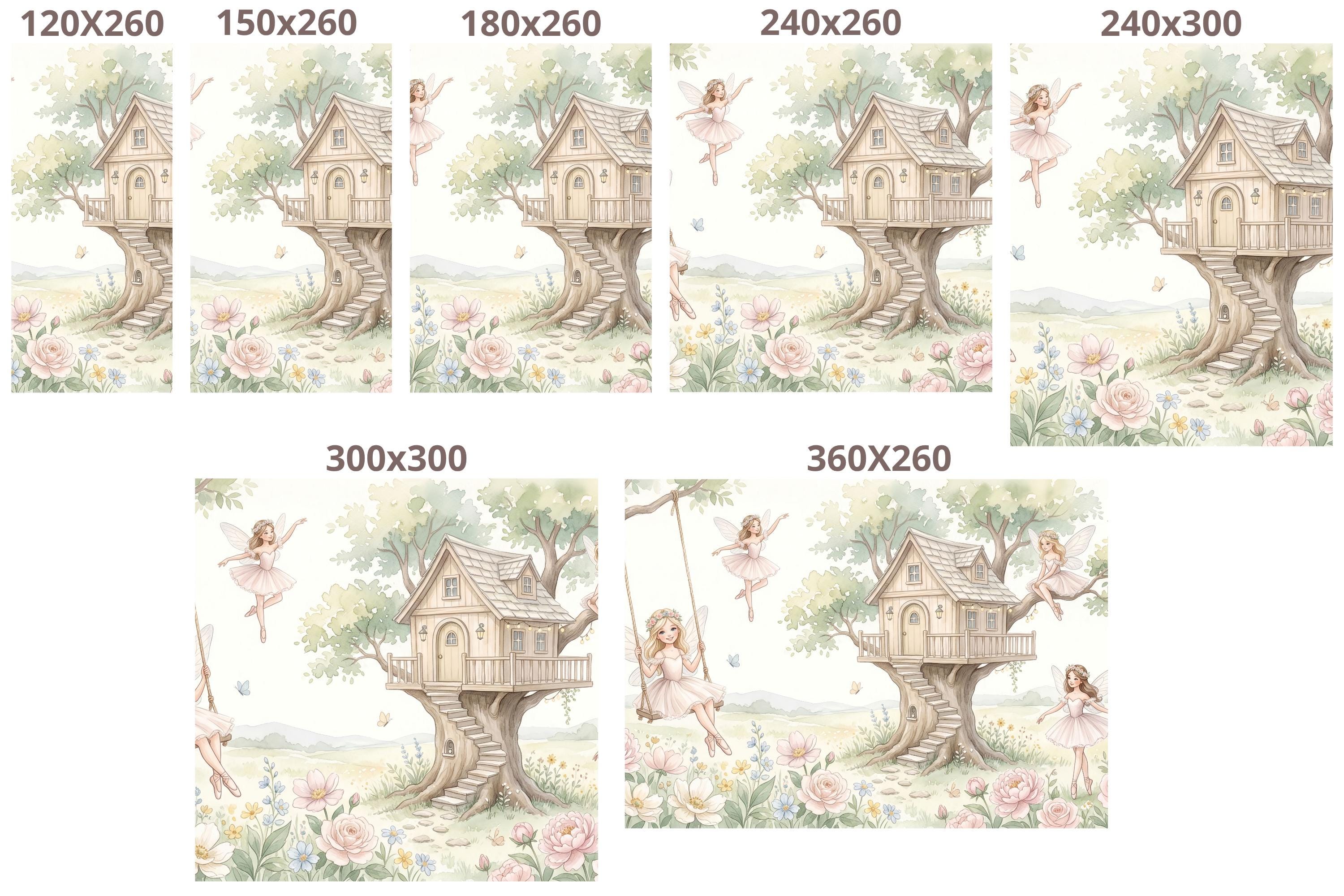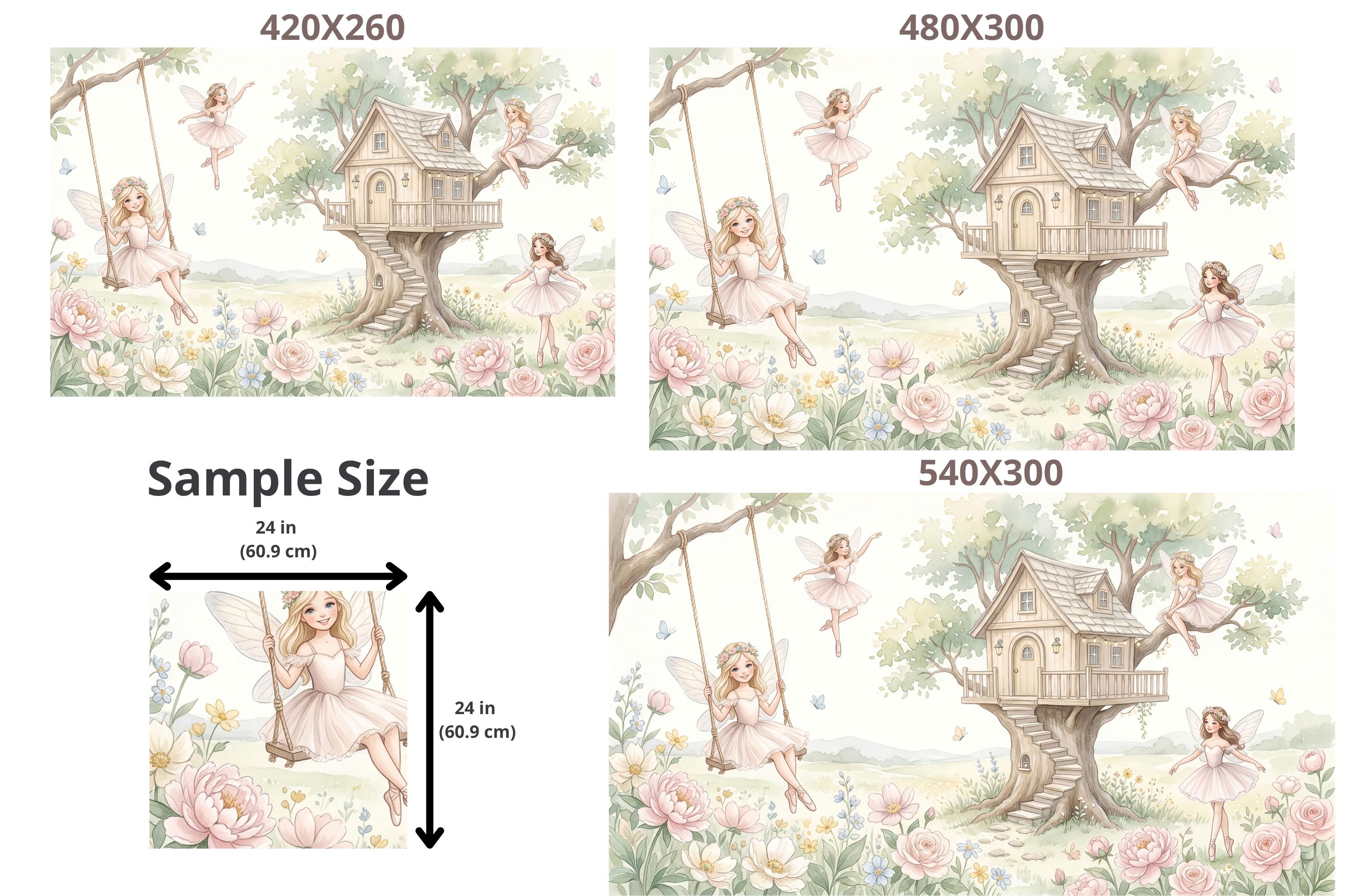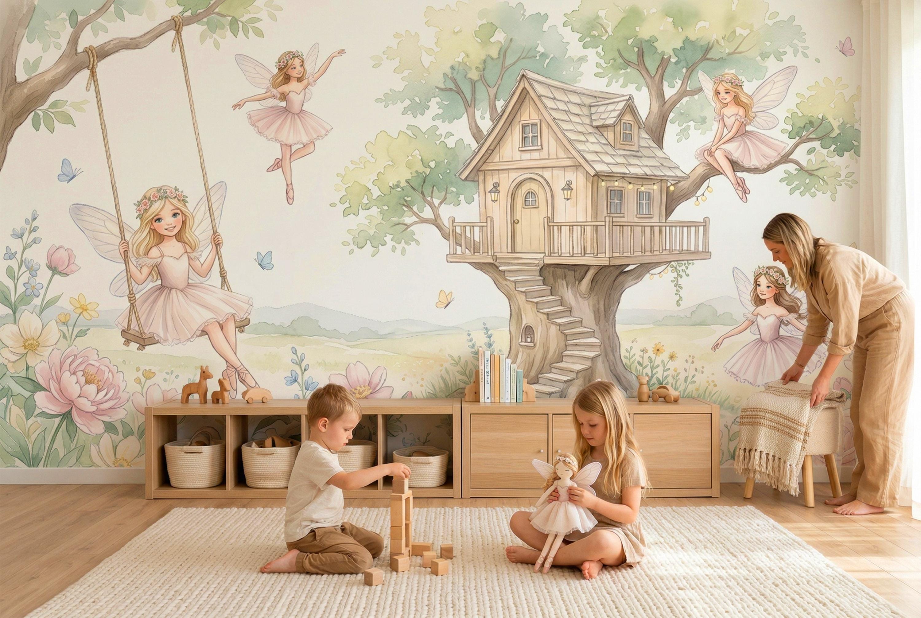 As a cottage fairy wallpaper it is warm, intimate, and full of personality — four distinct characters, each with her own relationship to the garden around her. As a fairy wall mural for a girls room it bridges ballet and fairy tale in a way no other design in the category does. As a woodland fairy wallpaper it captures the outdoor, sun-drenched quality of a real enchanted garden rather than a dark forest.