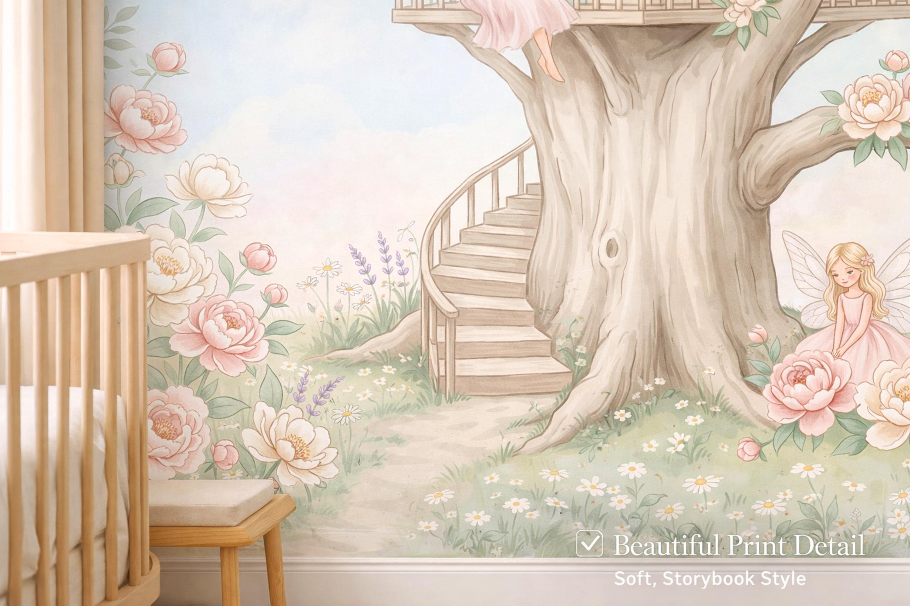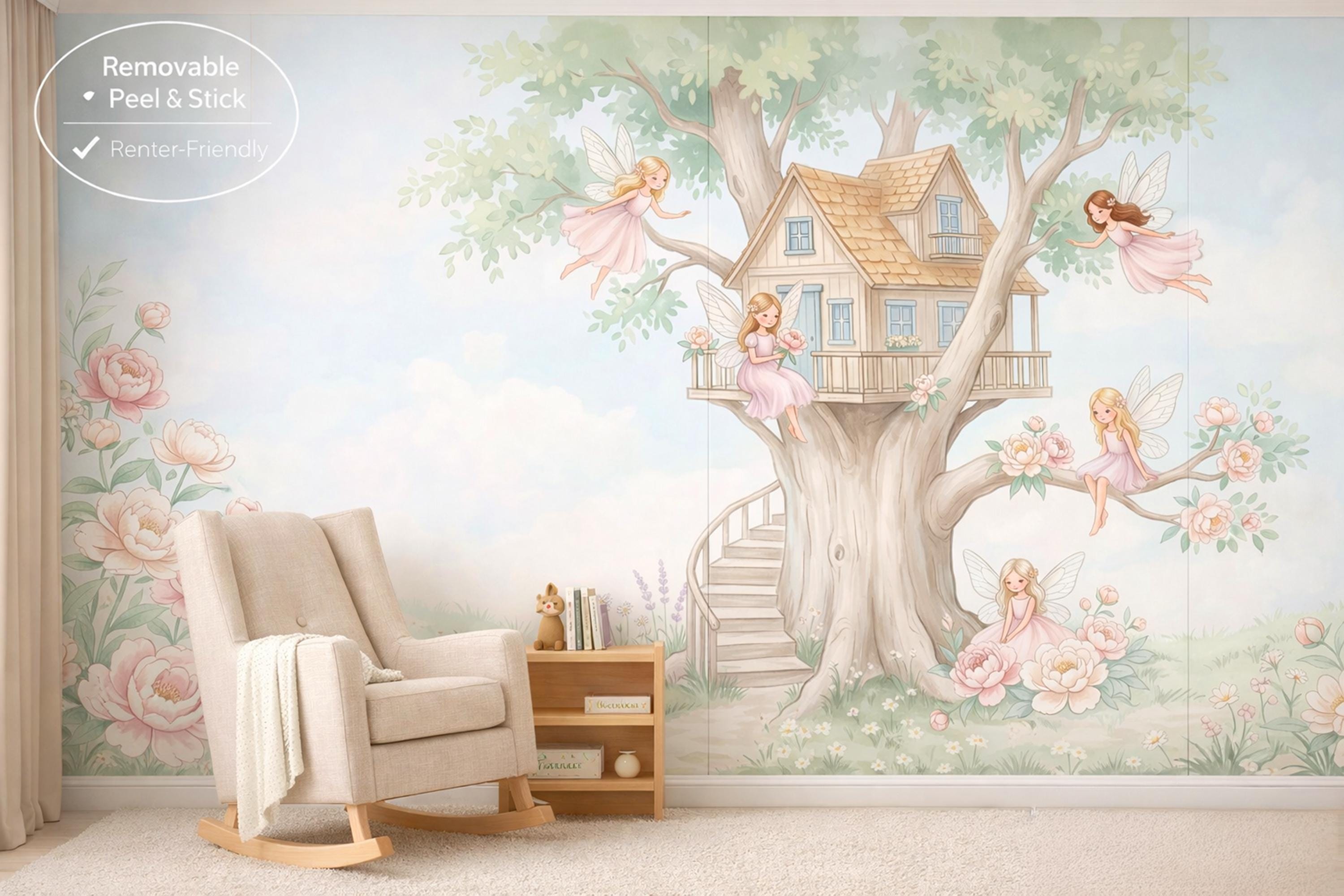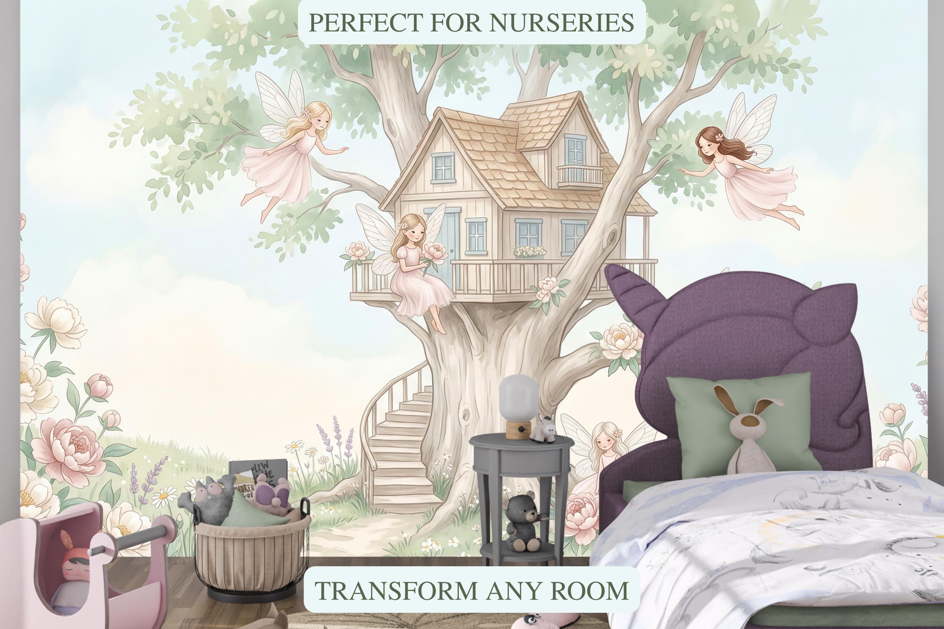 As a cottage fairy wallpaper this design has five characters, five stories, and enough detail to keep a child discovering new things for years. As a fairy forest mural it is the warmest, most welcoming interpretation of that theme — not dark or mysterious, but luminous and safe. As a nursery wallpaper fairytale piece it works from day one in a newborn nursery through to a school-age bedroom.
