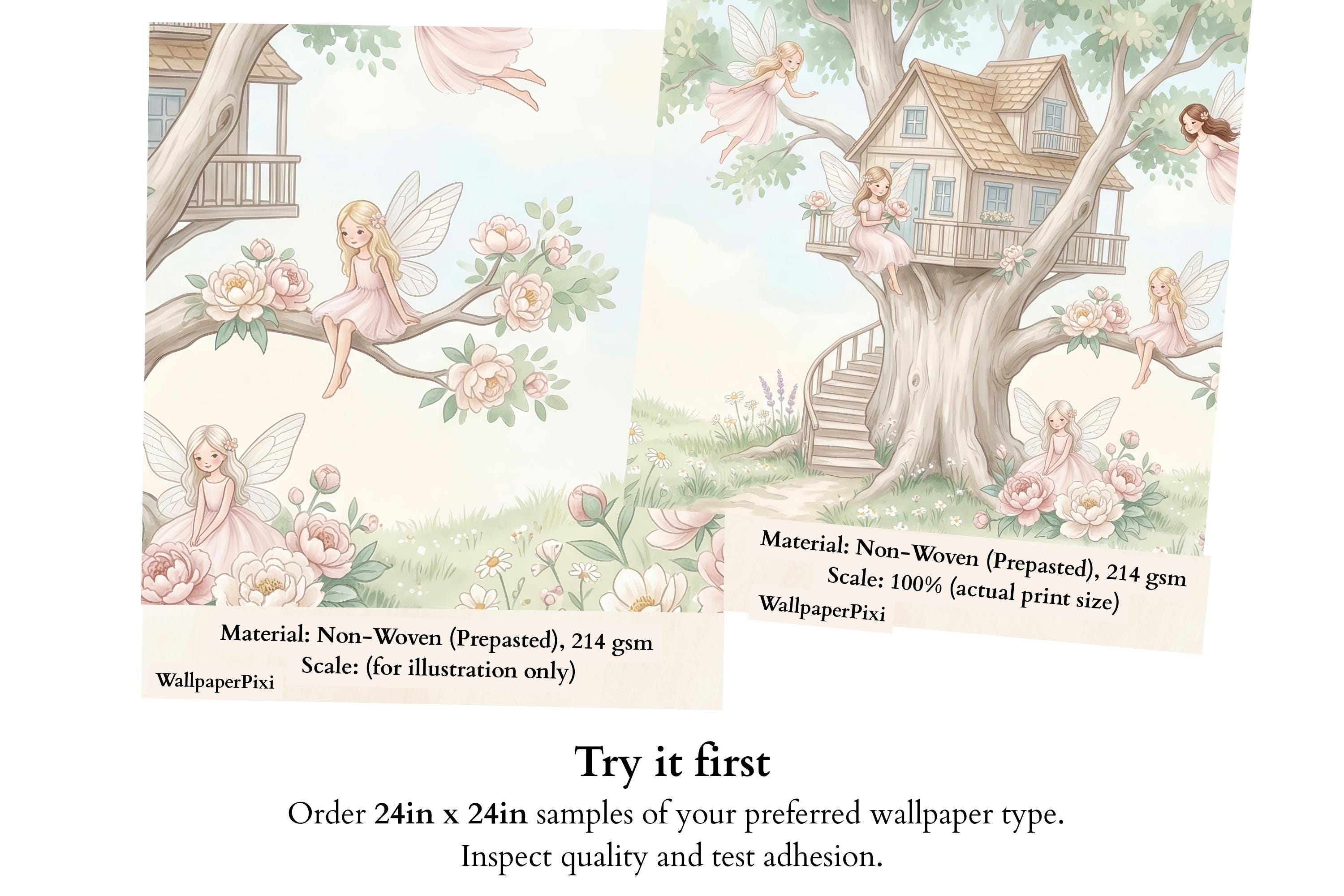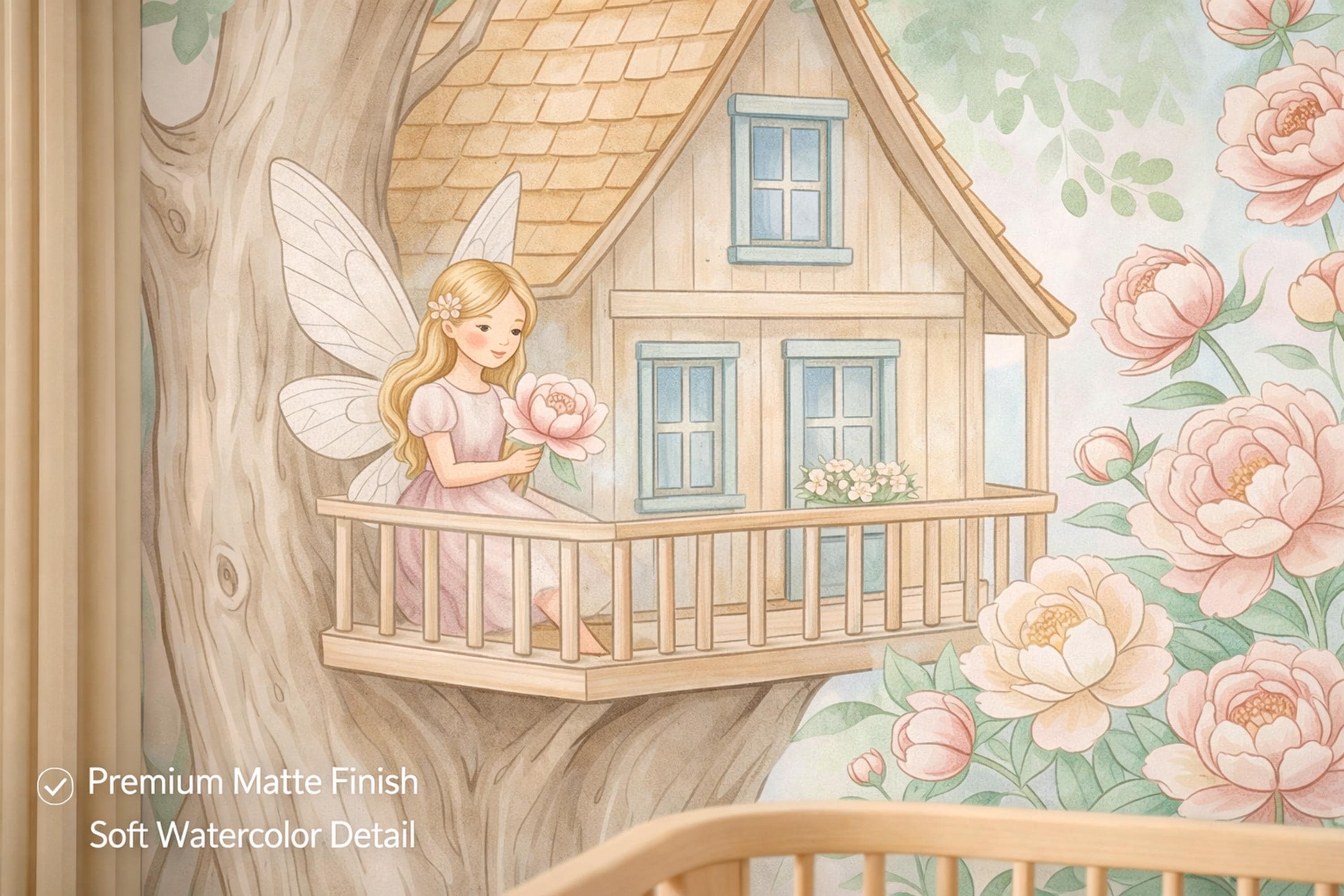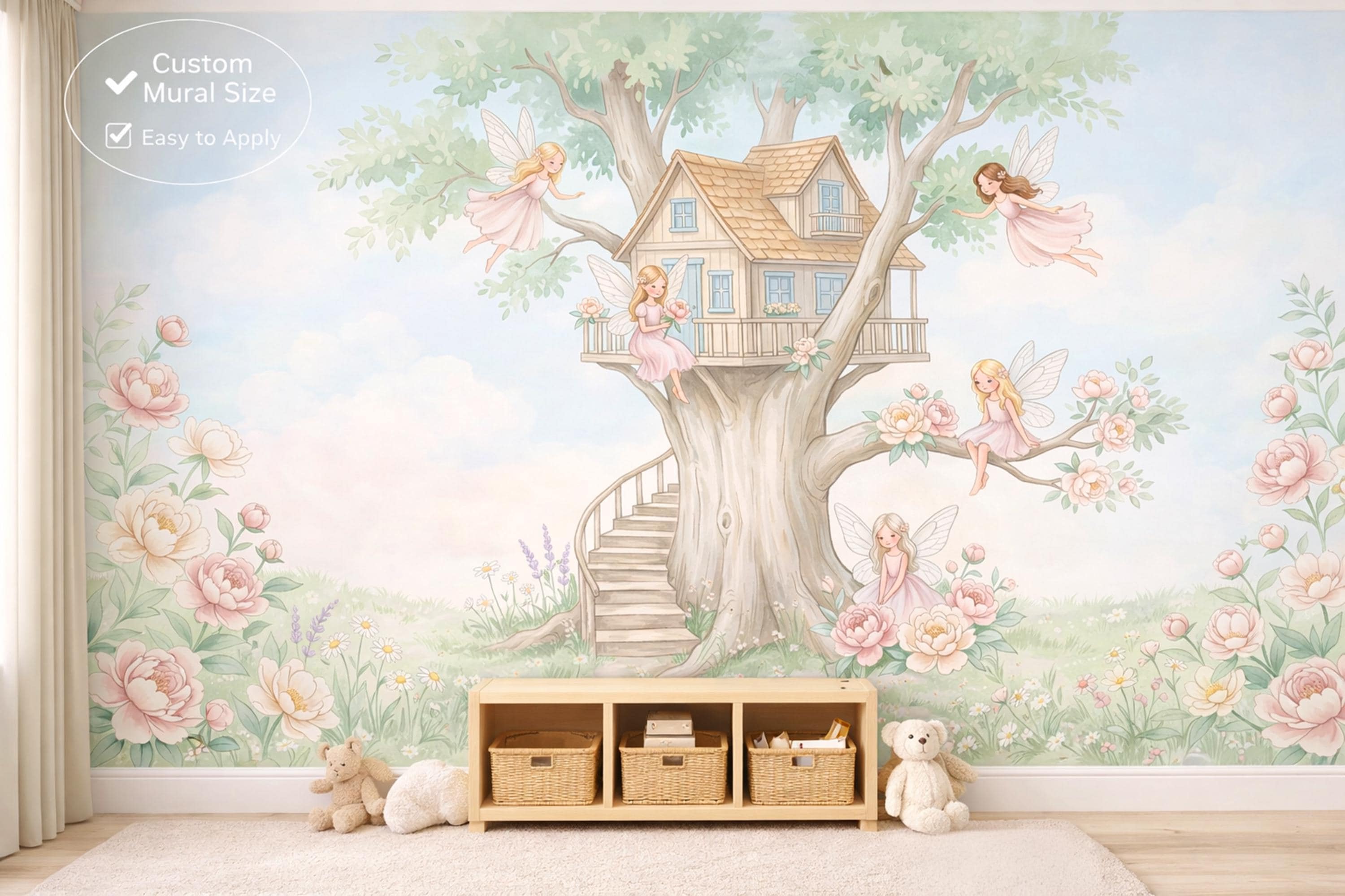 As a cottage fairy wallpaper this design has five characters, five stories, and enough detail to keep a child discovering new things for years. As a fairy forest mural it is the warmest, most welcoming interpretation of that theme — not dark or mysterious, but luminous and safe. As a nursery wallpaper fairytale piece it works from day one in a newborn nursery through to a school-age bedroom.