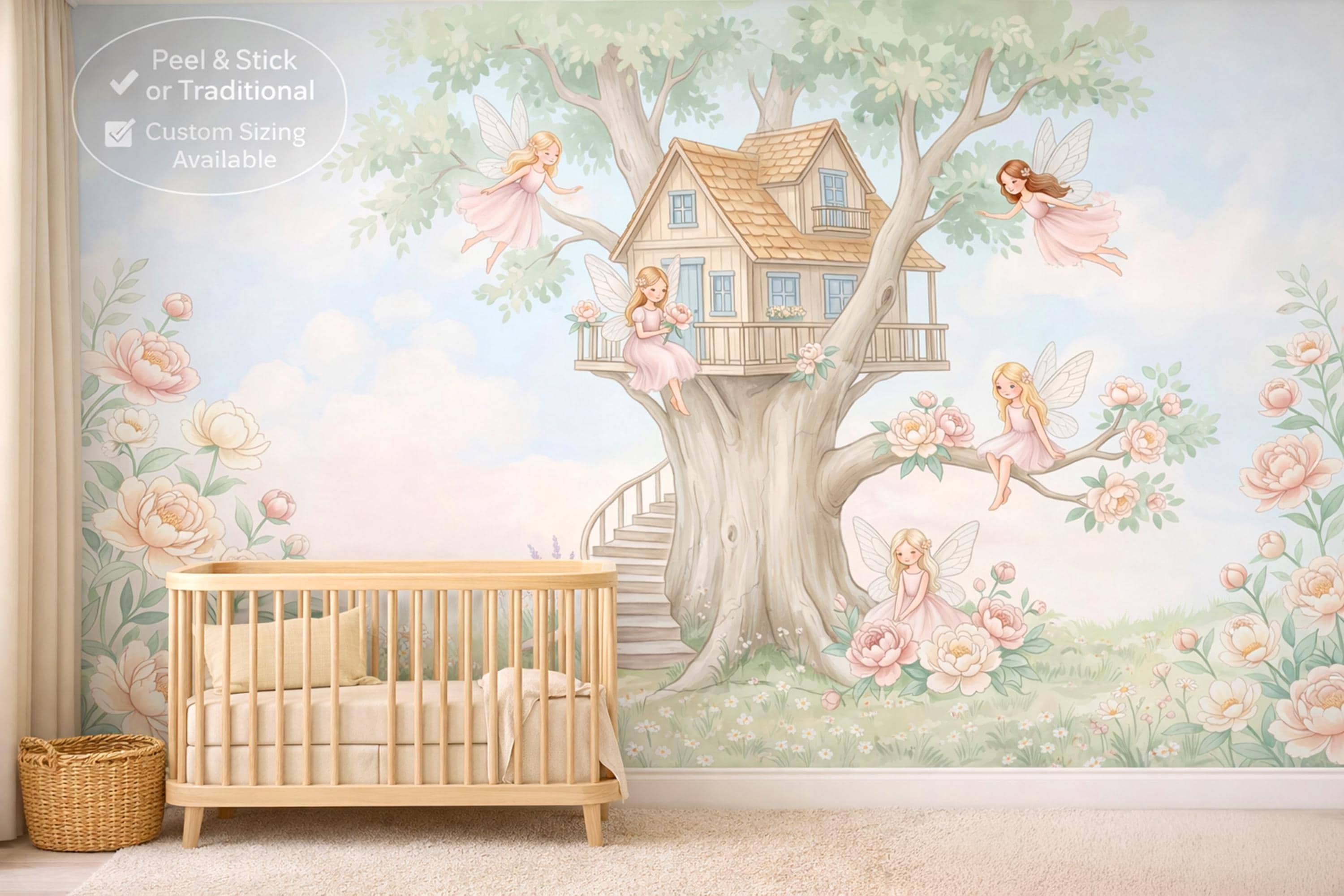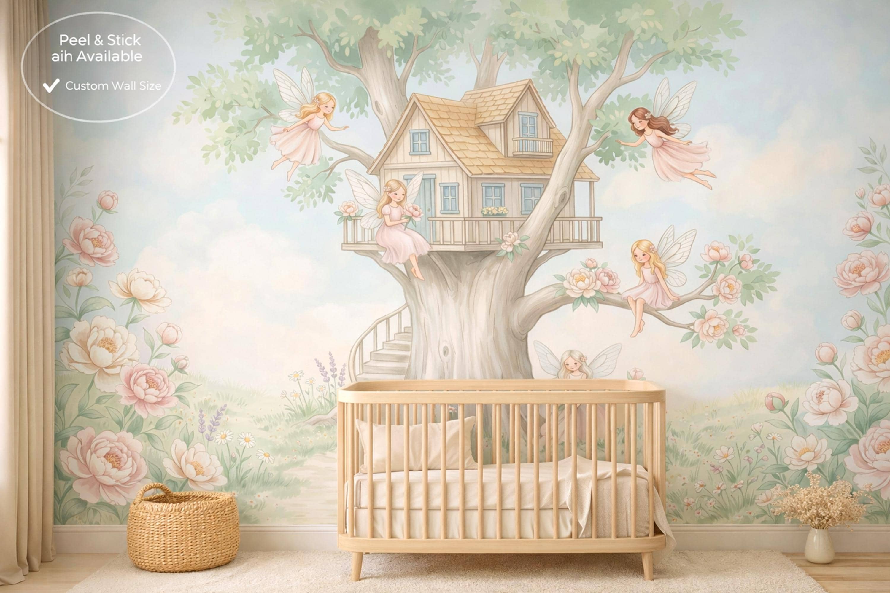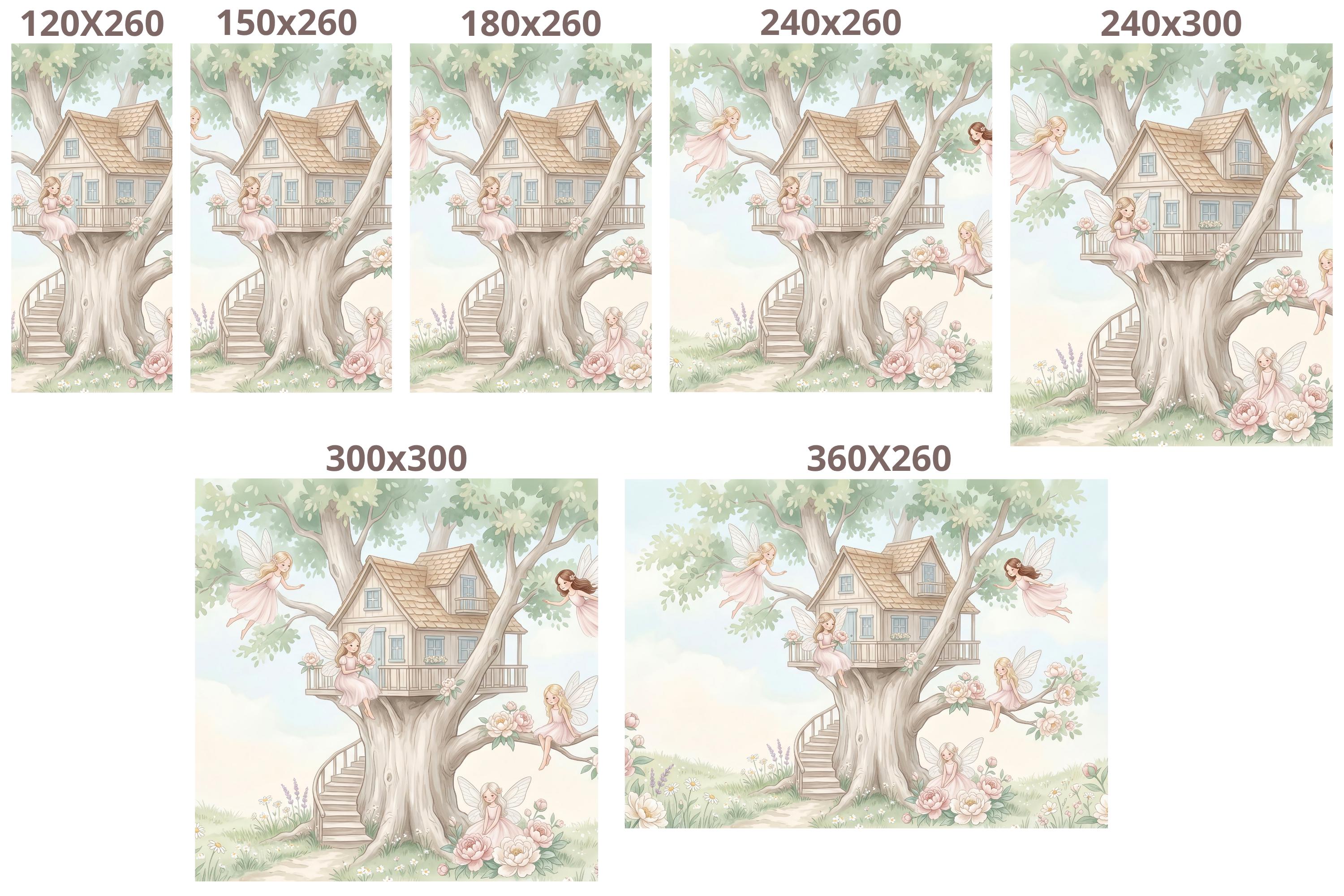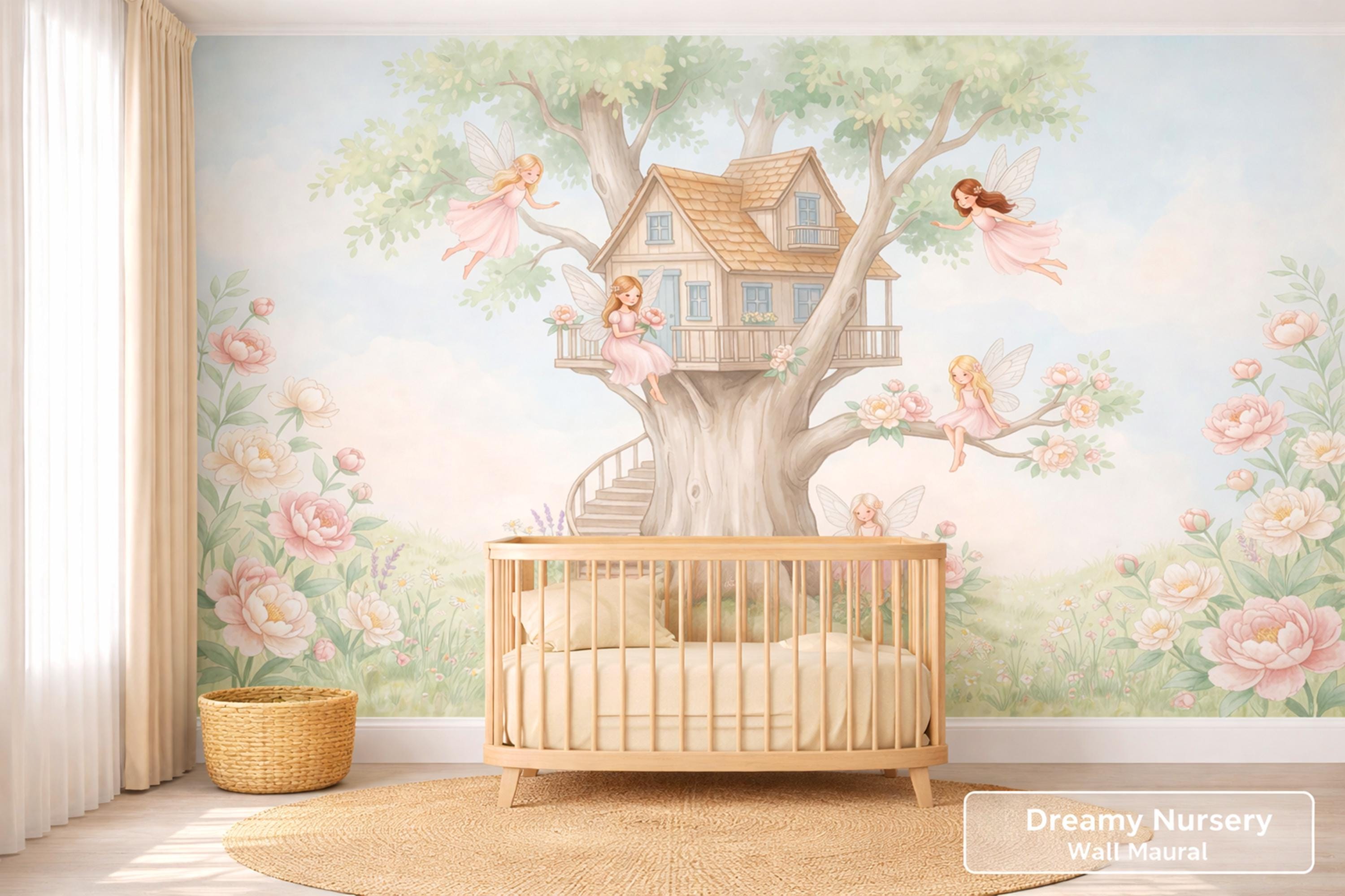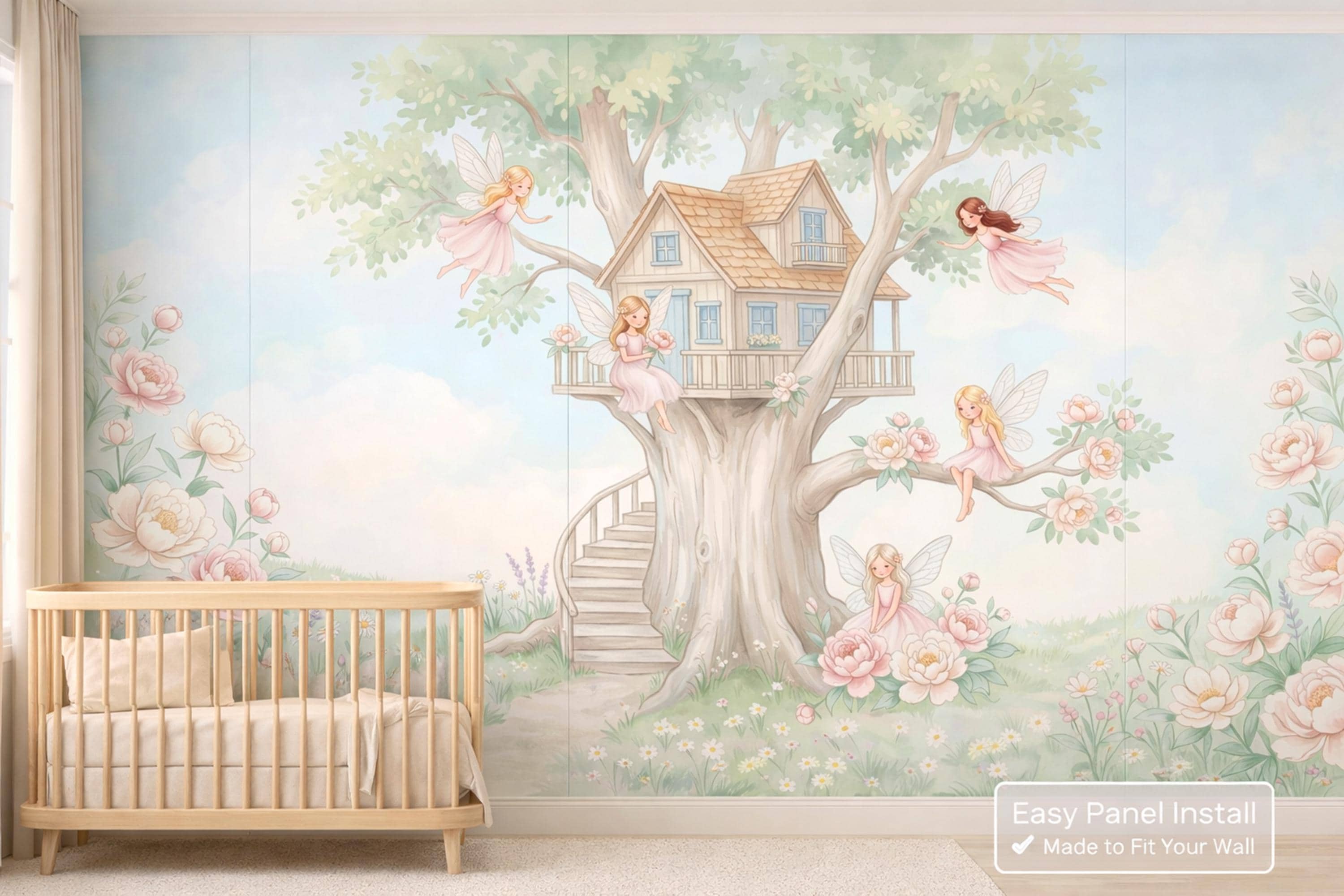 This fairy oak treehouse peel and stick mural by WallpaperPixi is the definitive fairy treehouse nursery design — five distinct blush-pink fairy girls with delicate sheer dragonfly wings inhabit every level of a magnificent grand oak treehouse with beautiful blue-paned windows, a tiled pitched roof, a wrap-around balcony porch, and an elegant spiral staircase leading to the arched front door.