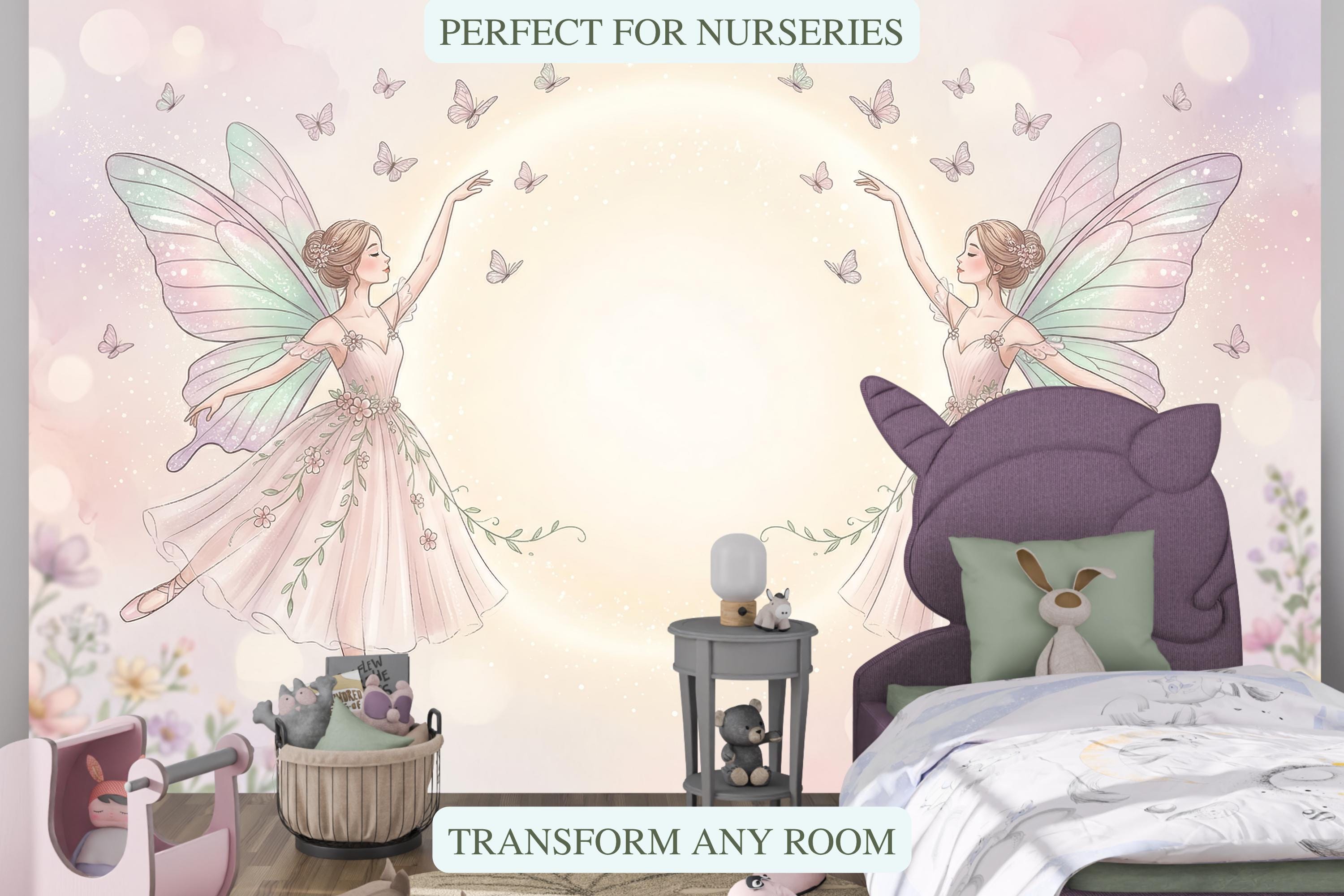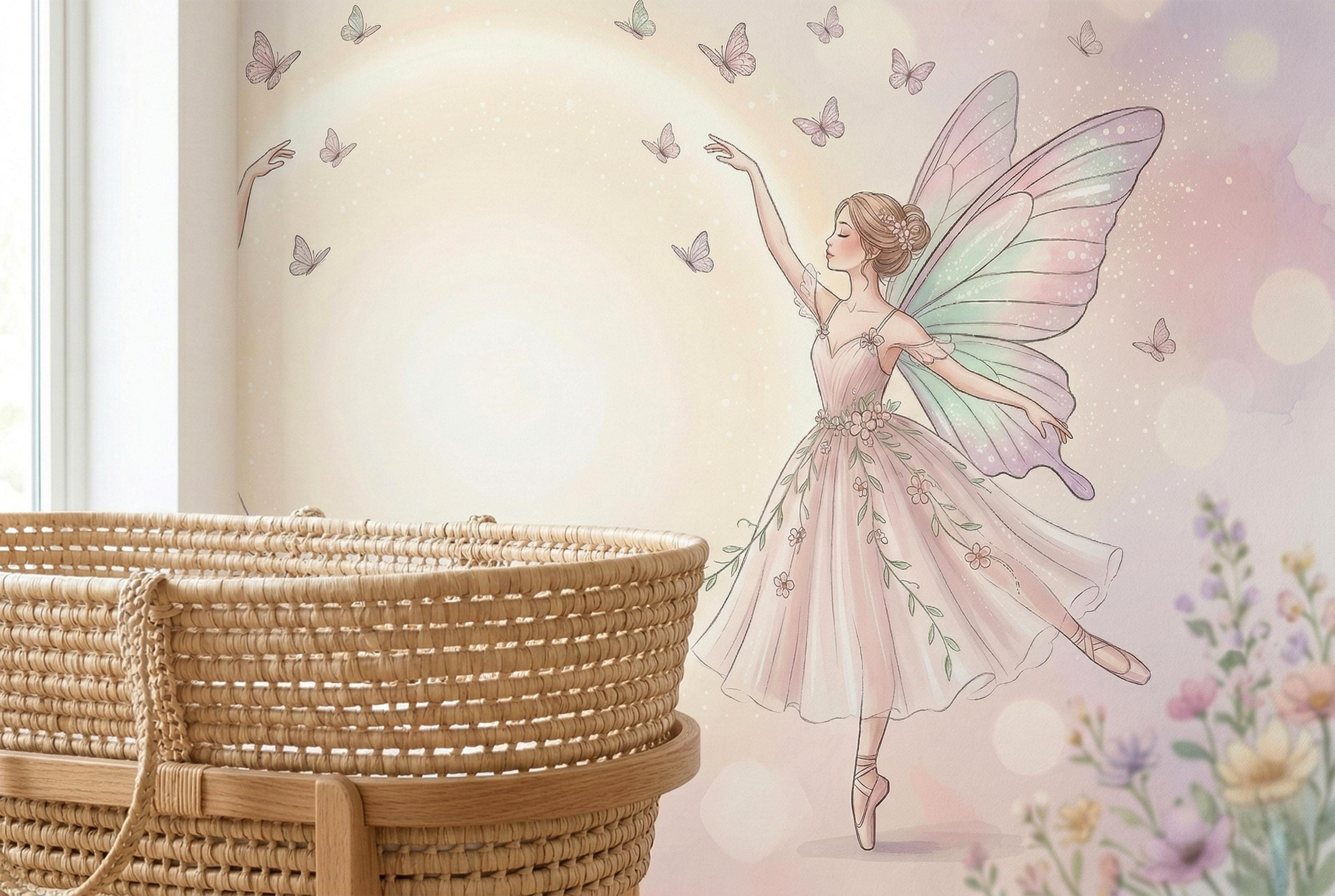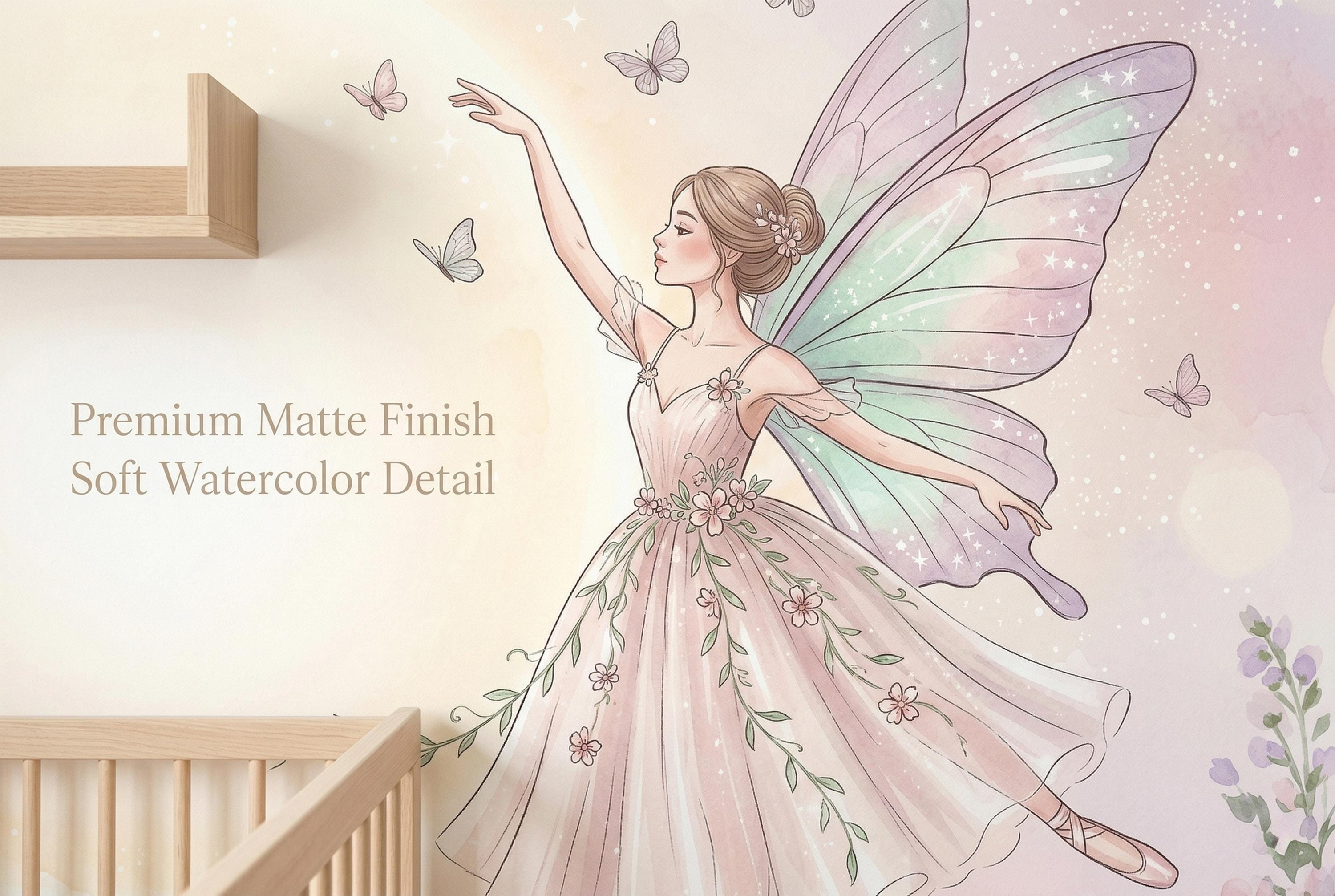 As a magical fairy wallpaper it has no equal in the ballet-fairy niche. As a fairy nursery wallpaper it works from newborn to school age — never too young, never dated. As a whimsical fairy wallpaper for girls it feels less like children's decor and more like fine art.