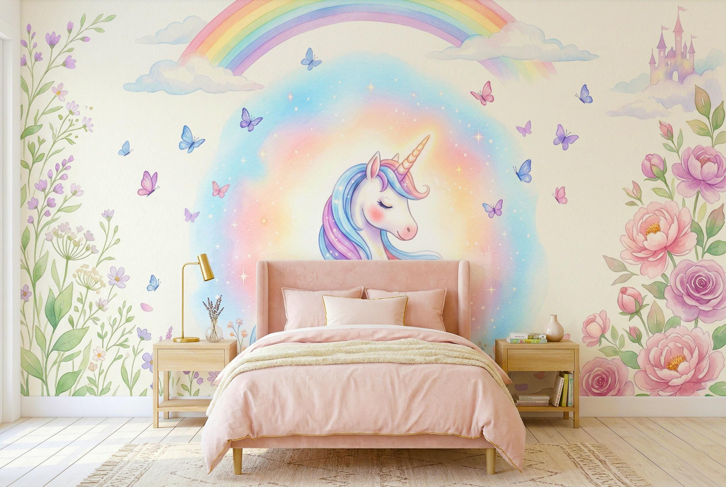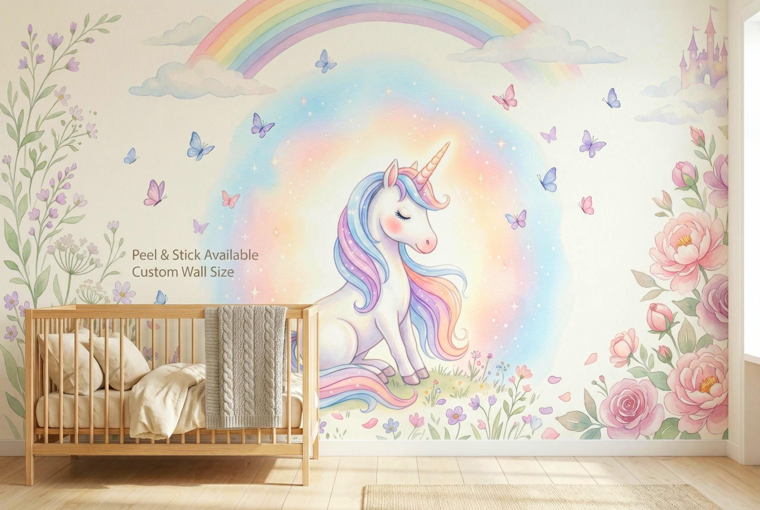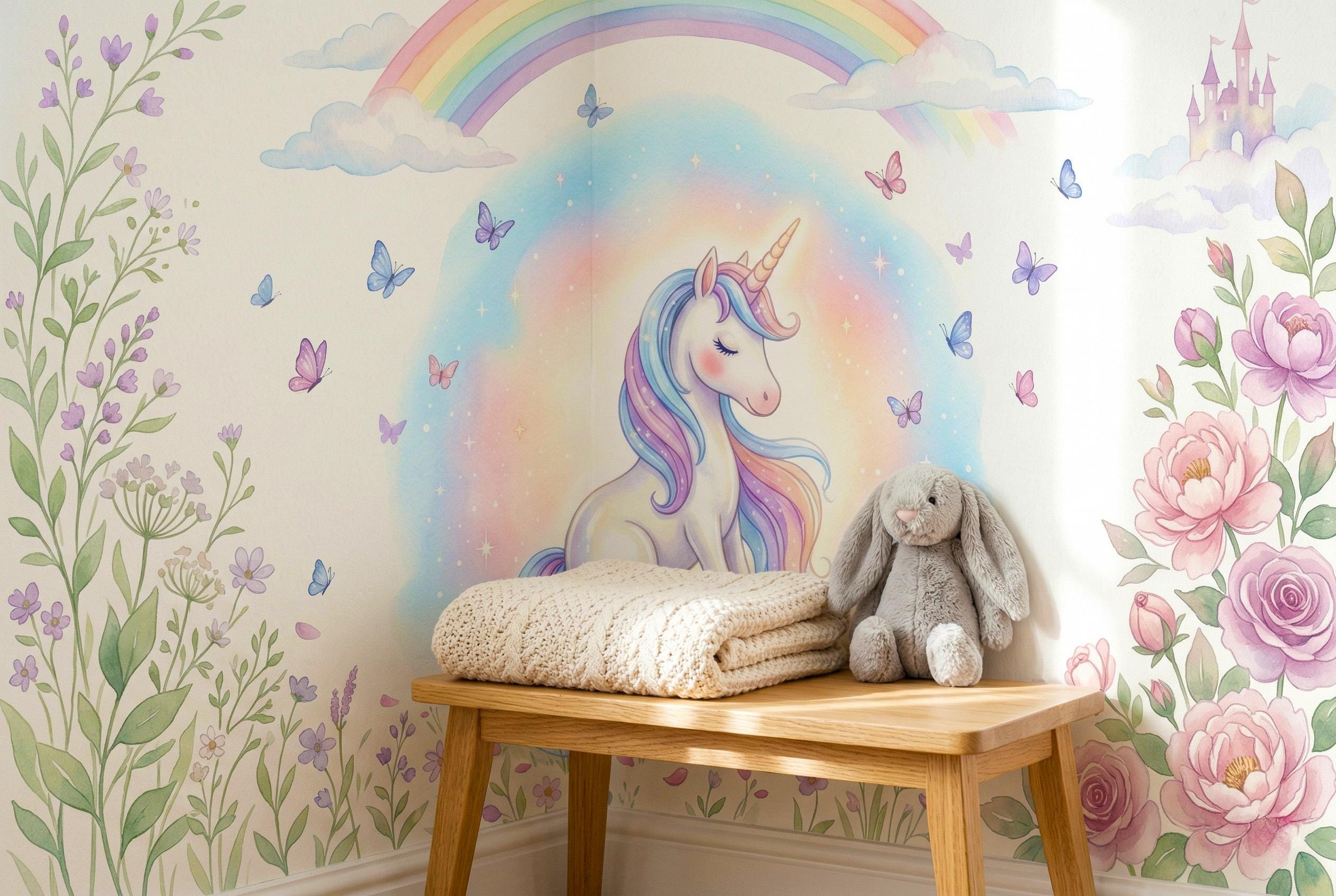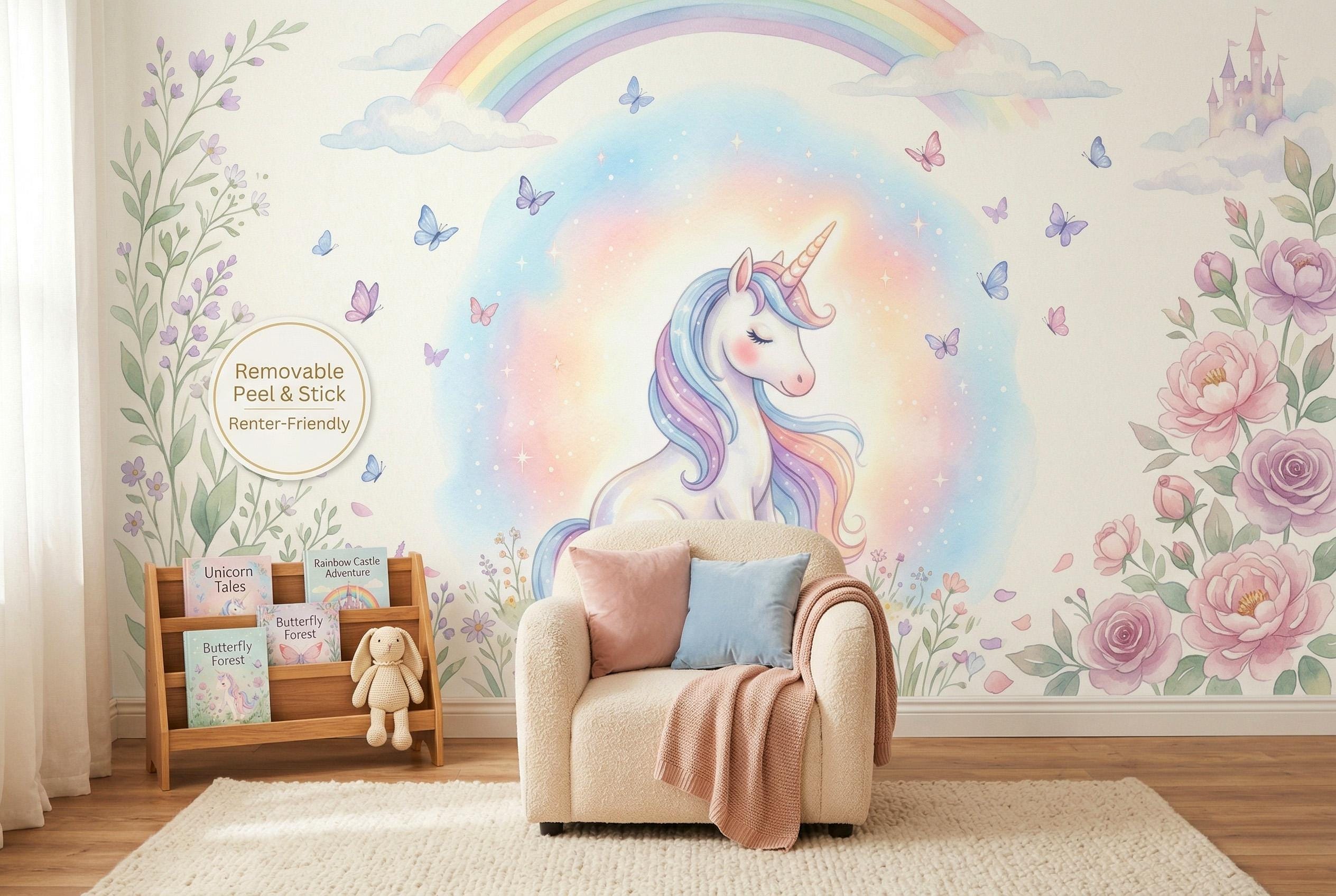 As a watercolor pastel rose girls nursery wallpaper it is refined enough for newborns and engaging enough for school-age girls. As a whimsical unicorn wall mural it covers every element that matters: unicorn, rainbow, butterflies, roses, castle, and a soft glowing centre. As a peel and stick nursery option it is fully renter-friendly and repositionable.