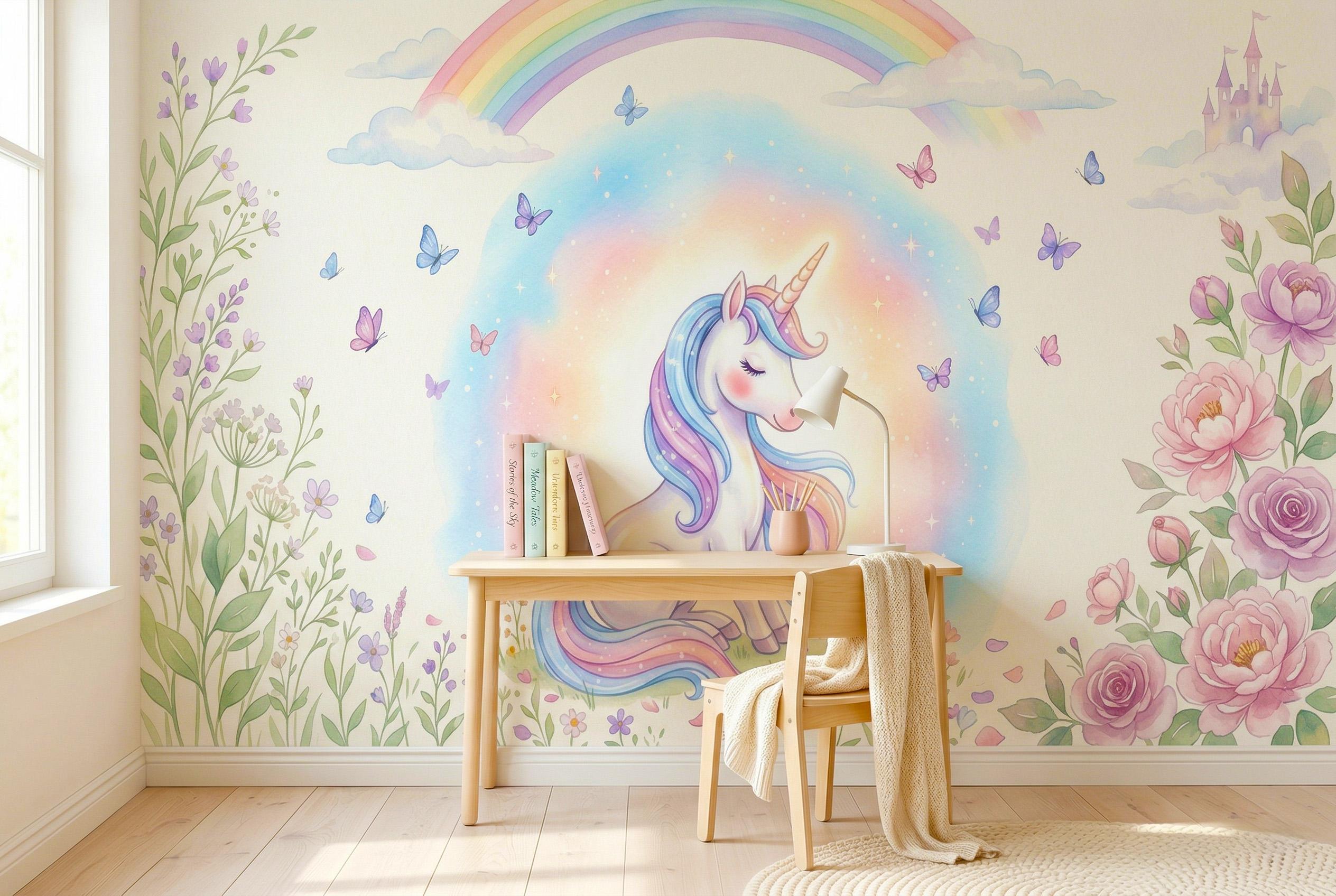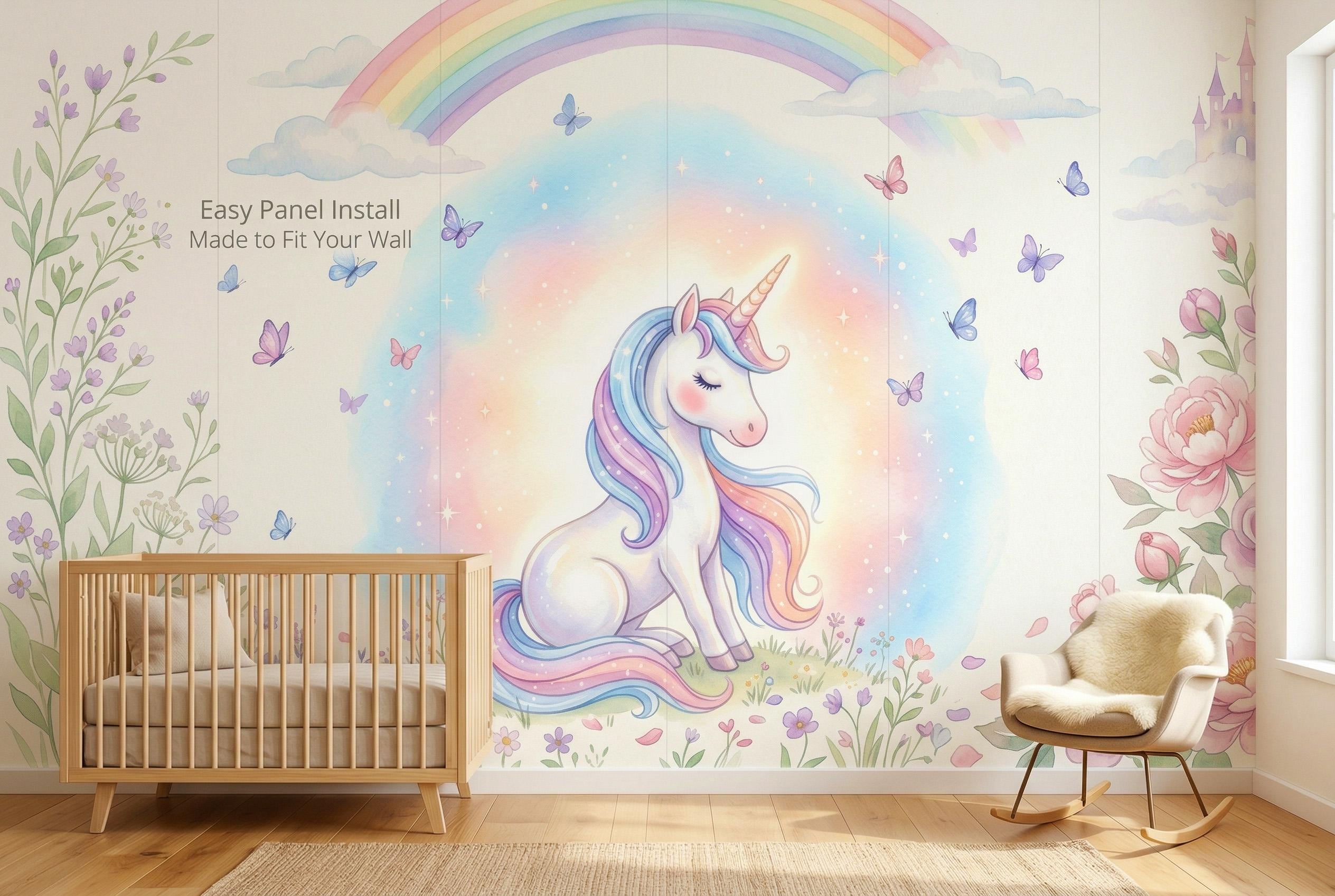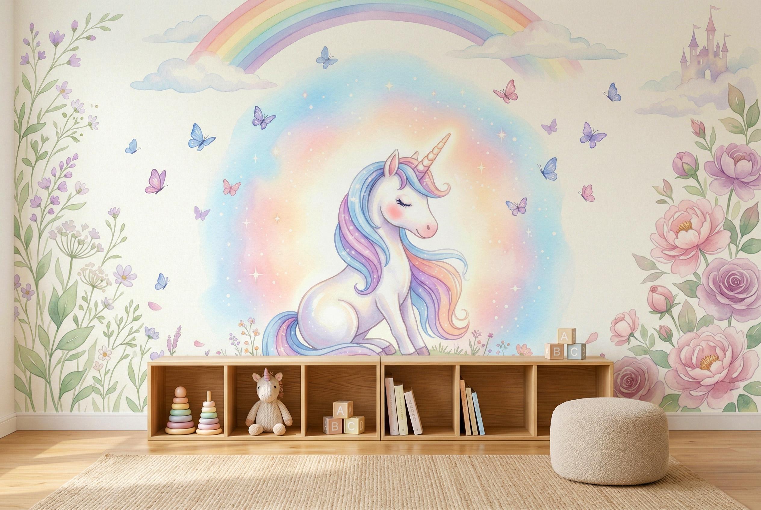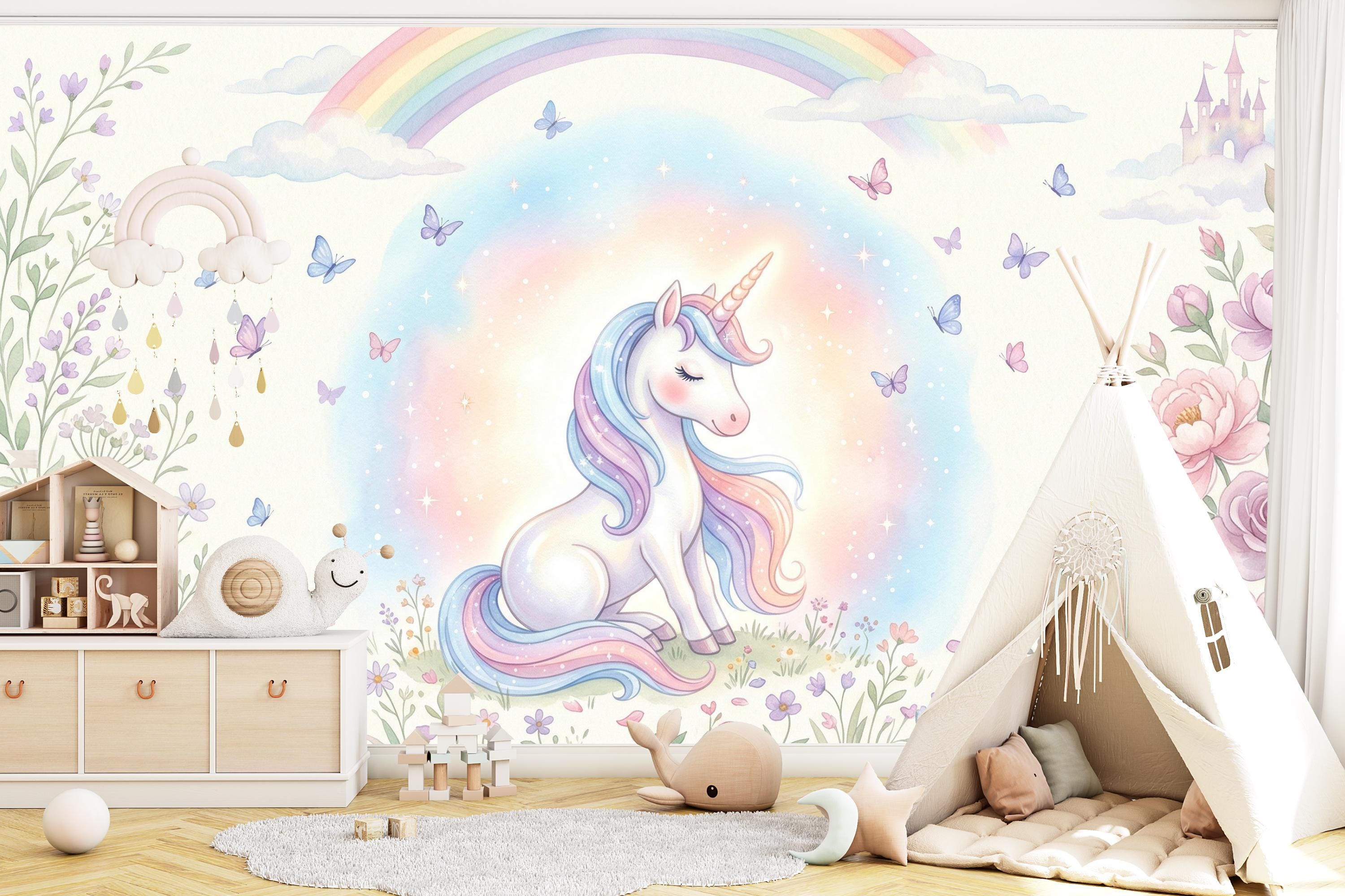 As a watercolor pastel rose girls nursery wallpaper it is refined enough for newborns and engaging enough for school-age girls. As a whimsical unicorn wall mural it covers every element that matters: unicorn, rainbow, butterflies, roses, castle, and a soft glowing centre. As a peel and stick nursery option it is fully renter-friendly and repositionable.