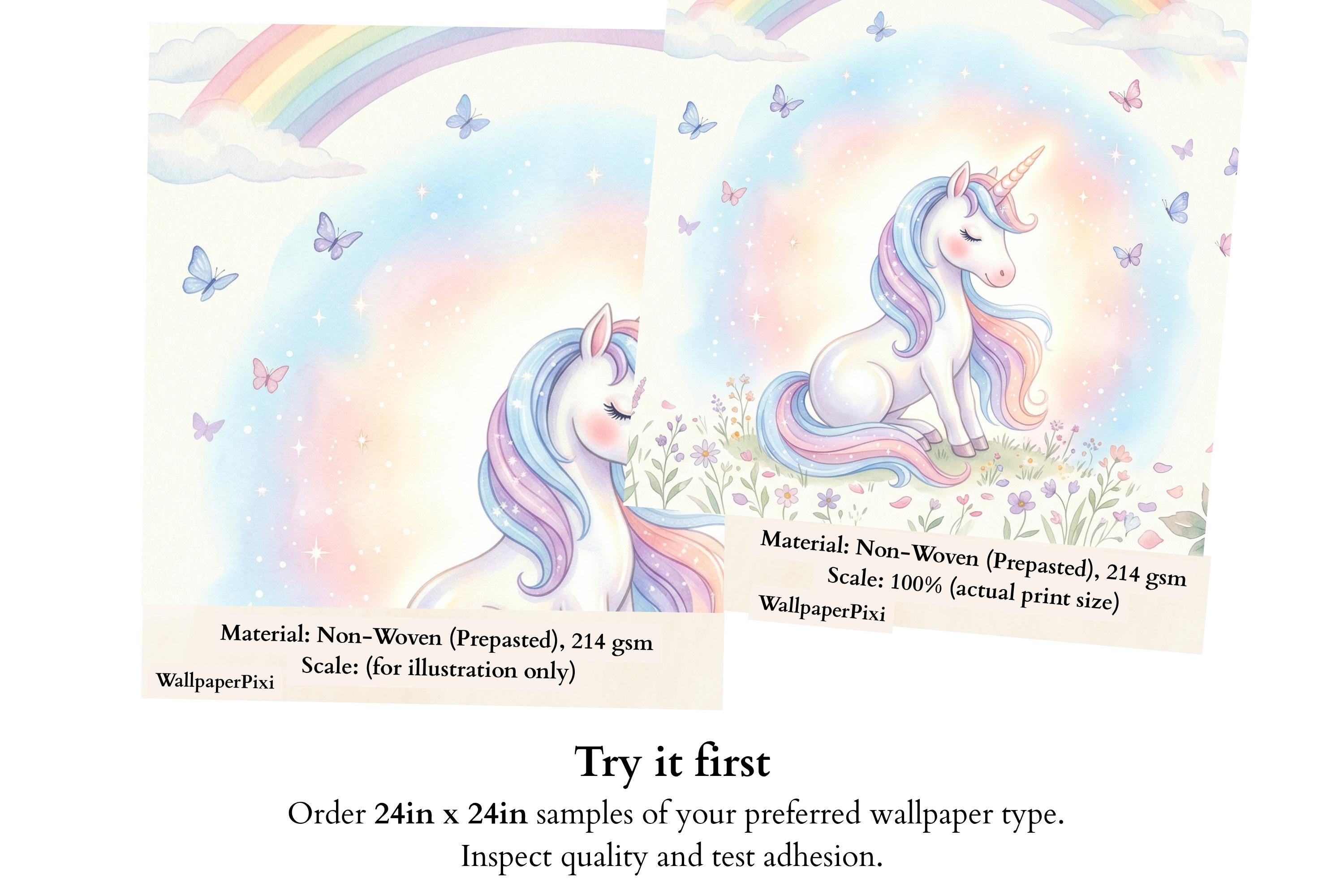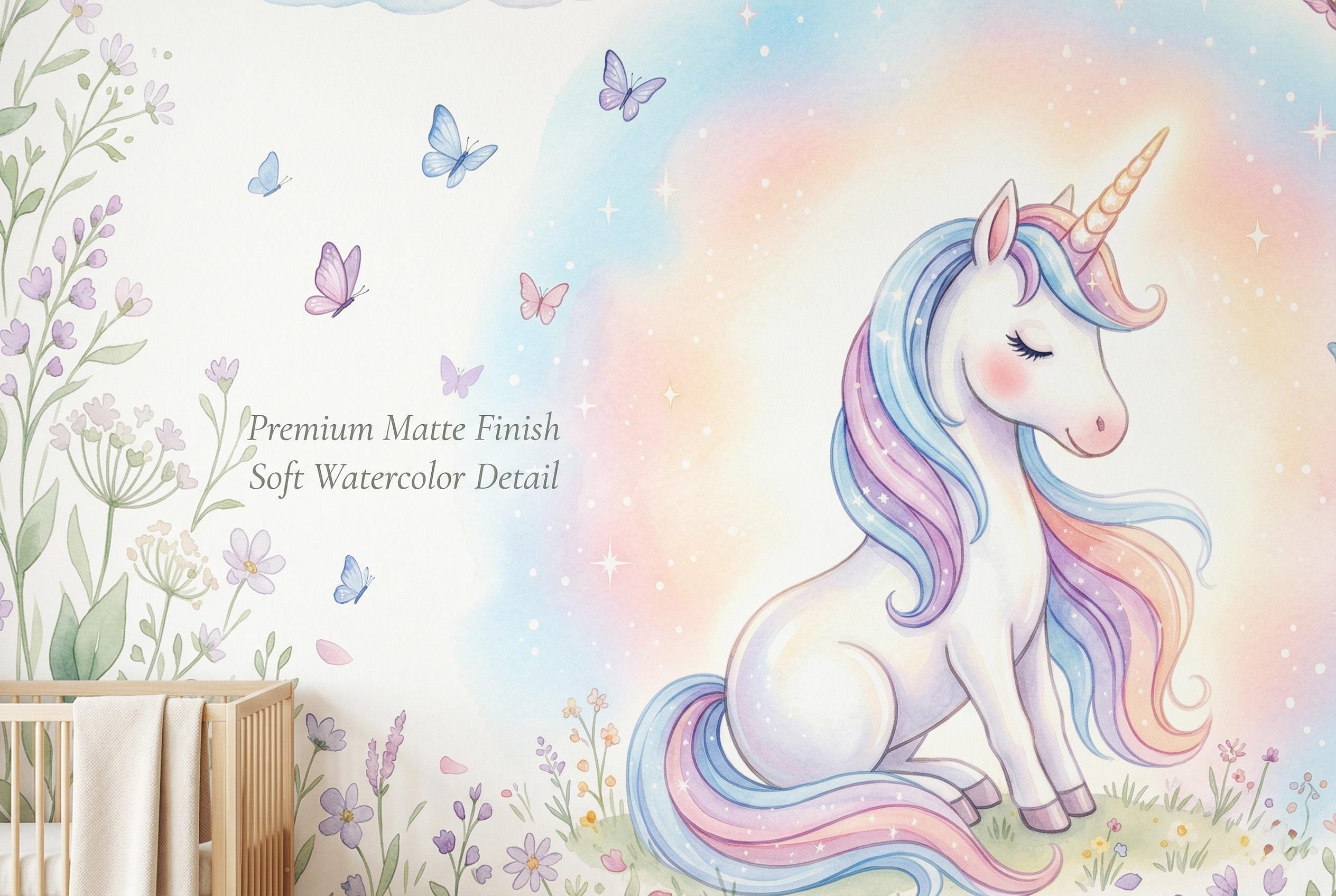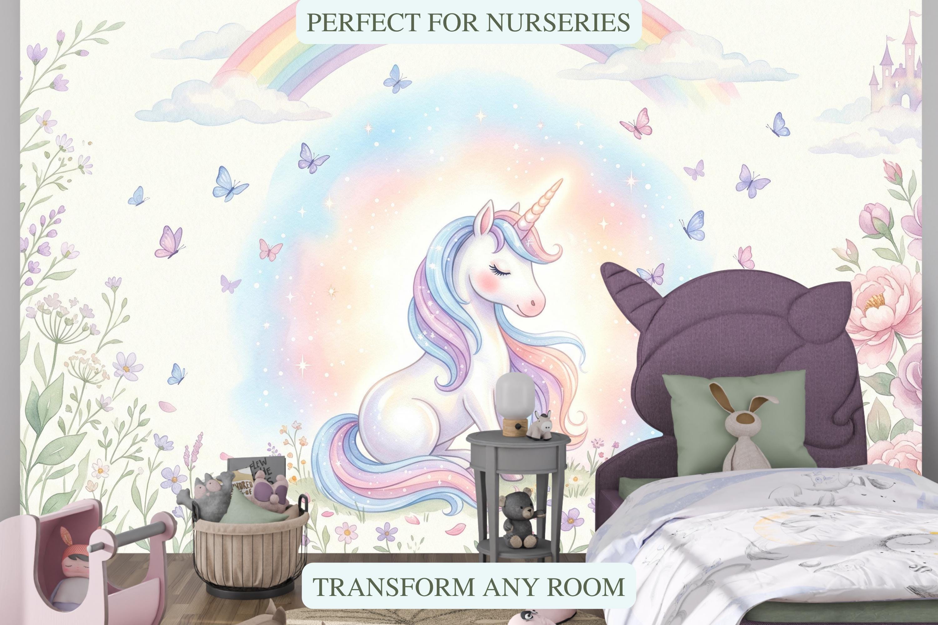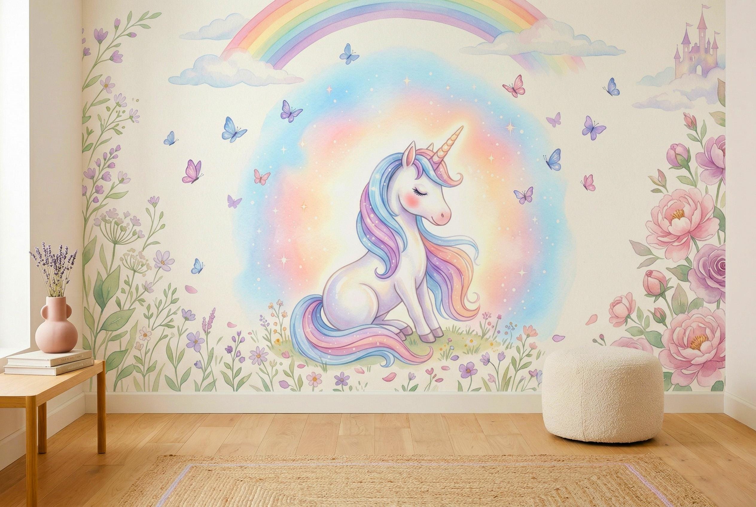 As a watercolor pastel rose girls nursery wallpaper it is refined enough for newborns and engaging enough for school-age girls. As a whimsical unicorn wall mural it covers every element that matters: unicorn, rainbow, butterflies, roses, castle, and a soft glowing centre. As a peel and stick nursery option it is fully renter-friendly and repositionable.