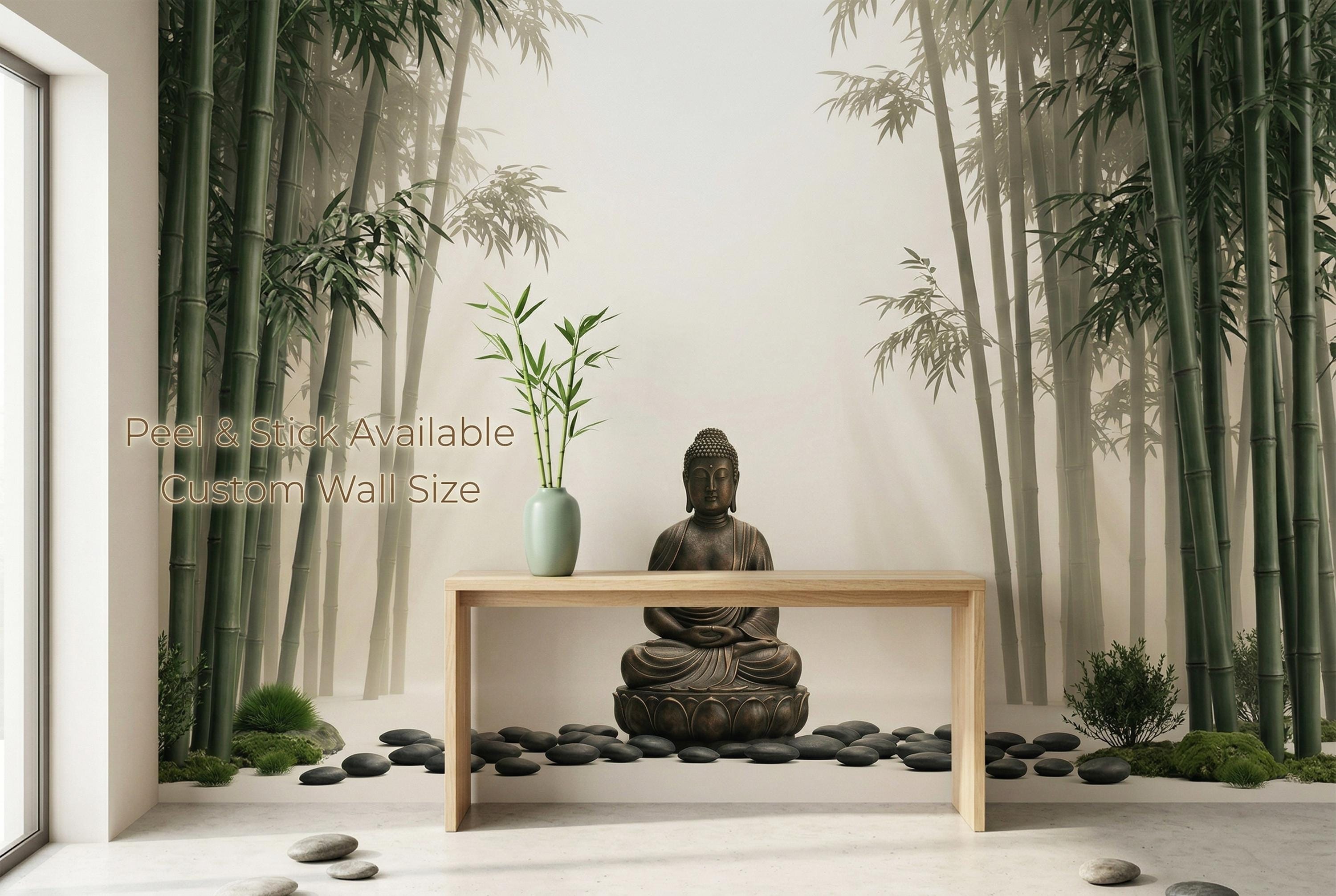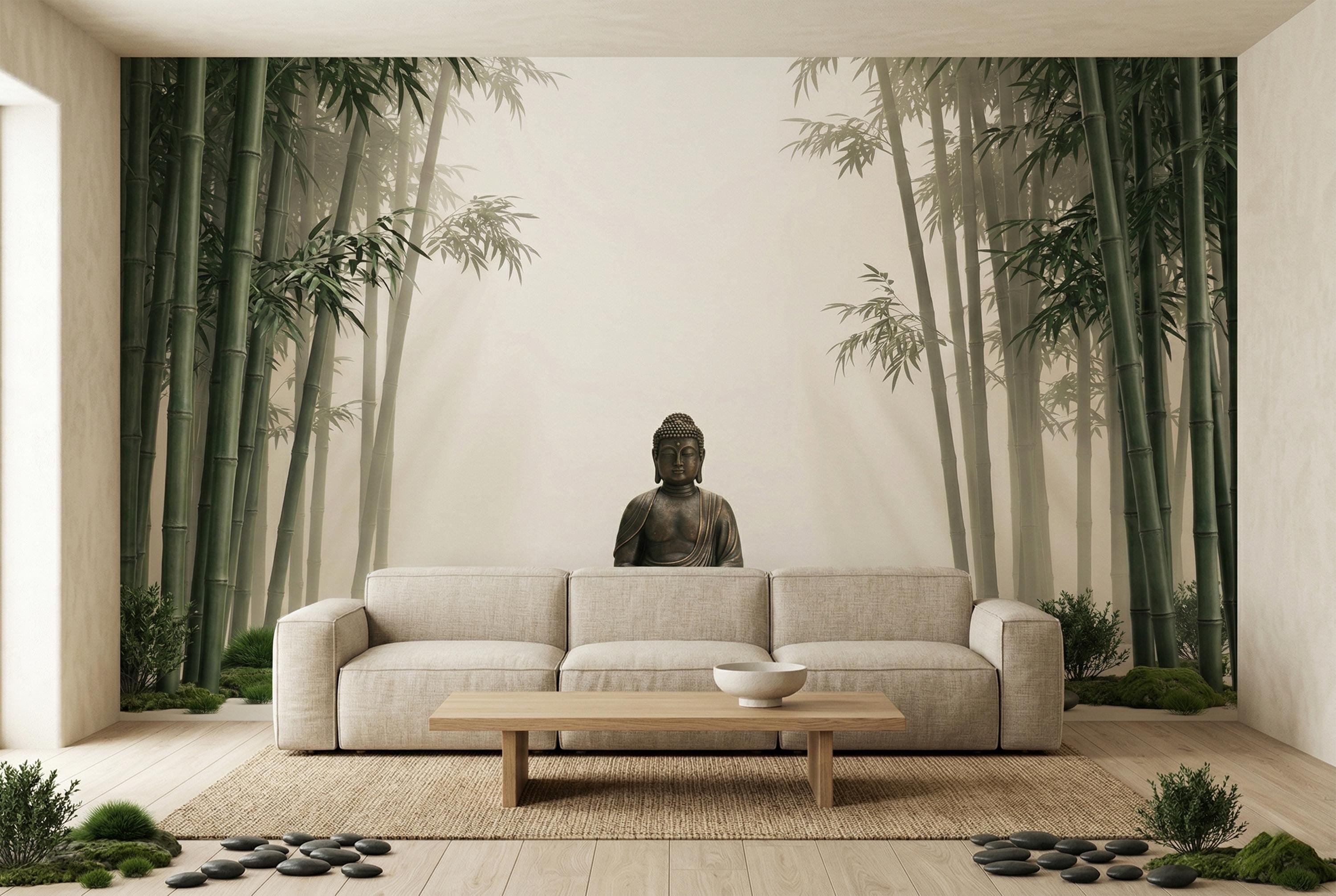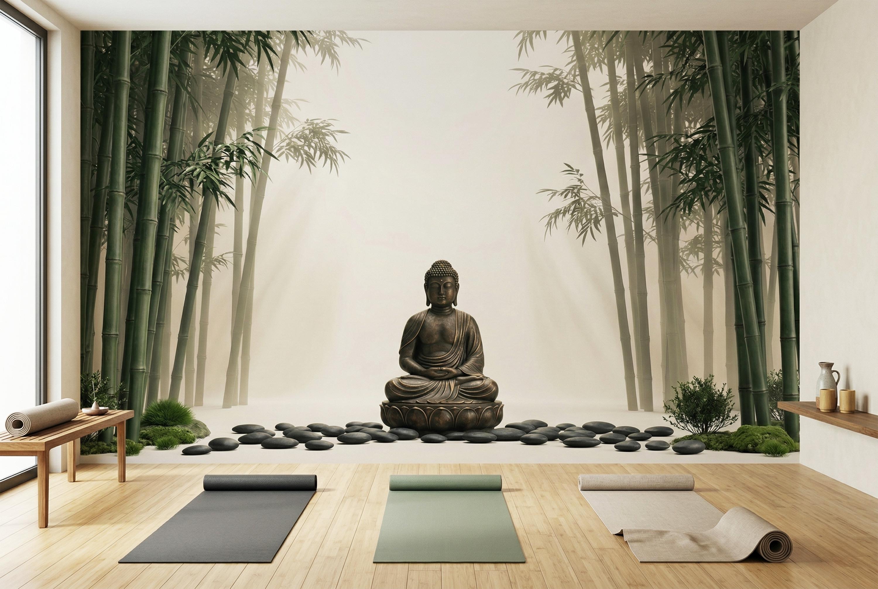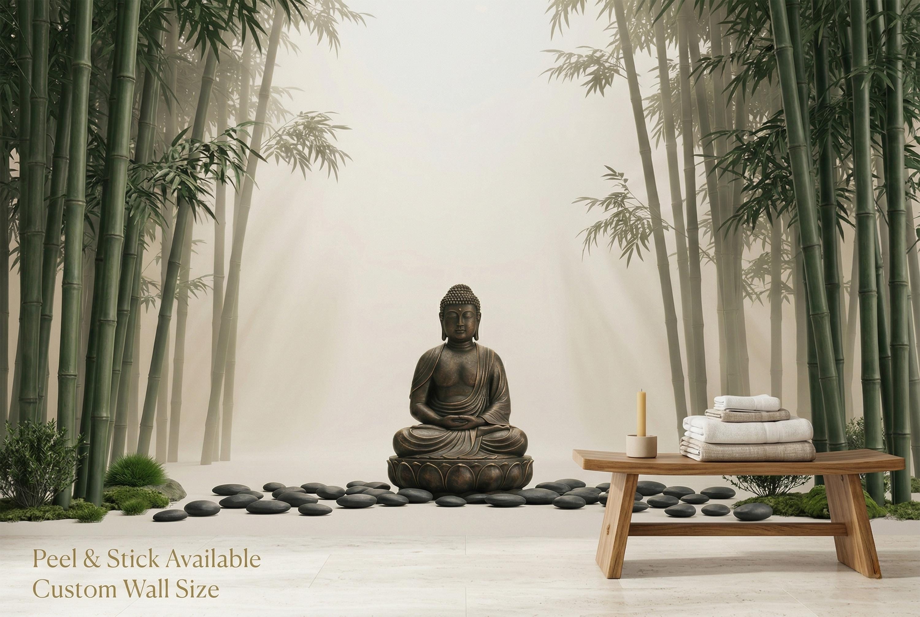 As a zen wallpaper mural it creates a meditative atmosphere with immediate, effortless impact. As a bamboo forest wall mural it brings the calm of a Japanese garden indoors. As a Buddha wall decor feature it works in living rooms, bedrooms, yoga studios, spas, home offices, and hospitality spaces.