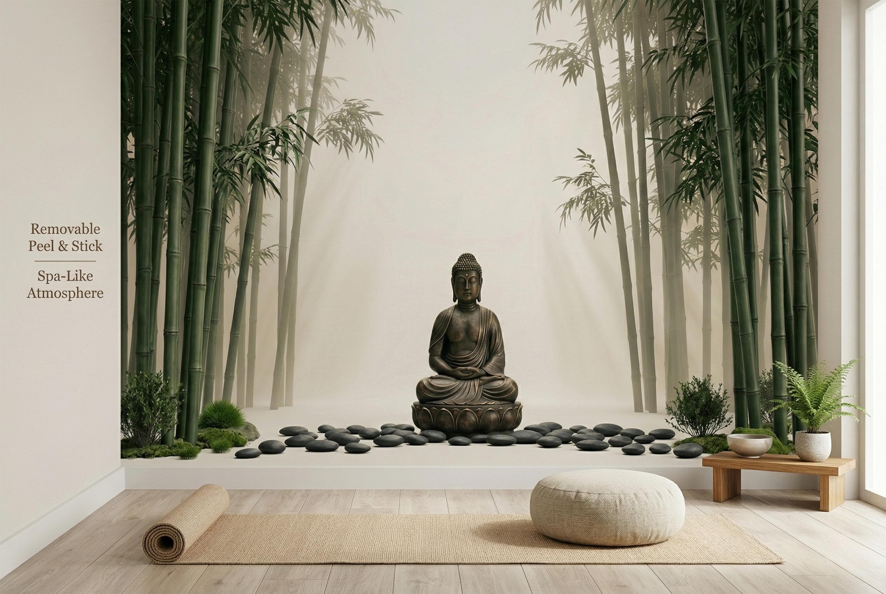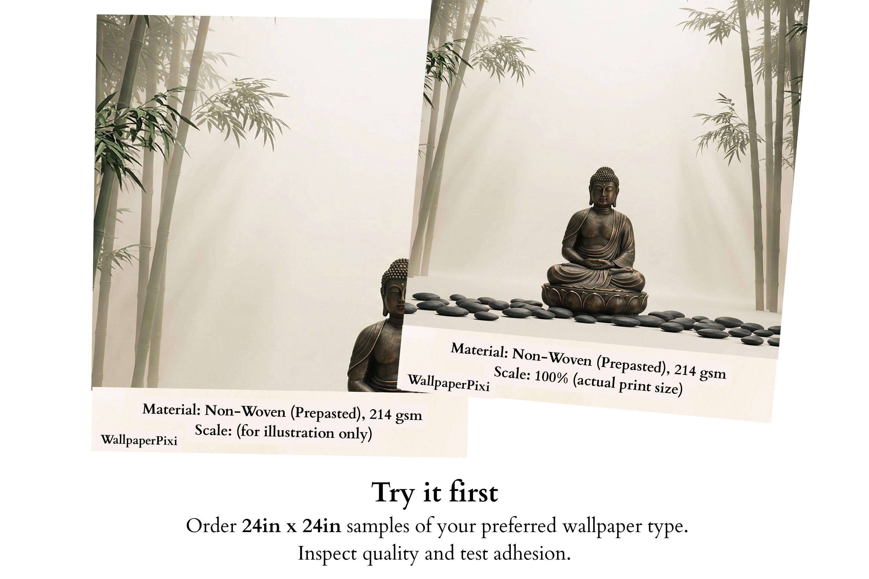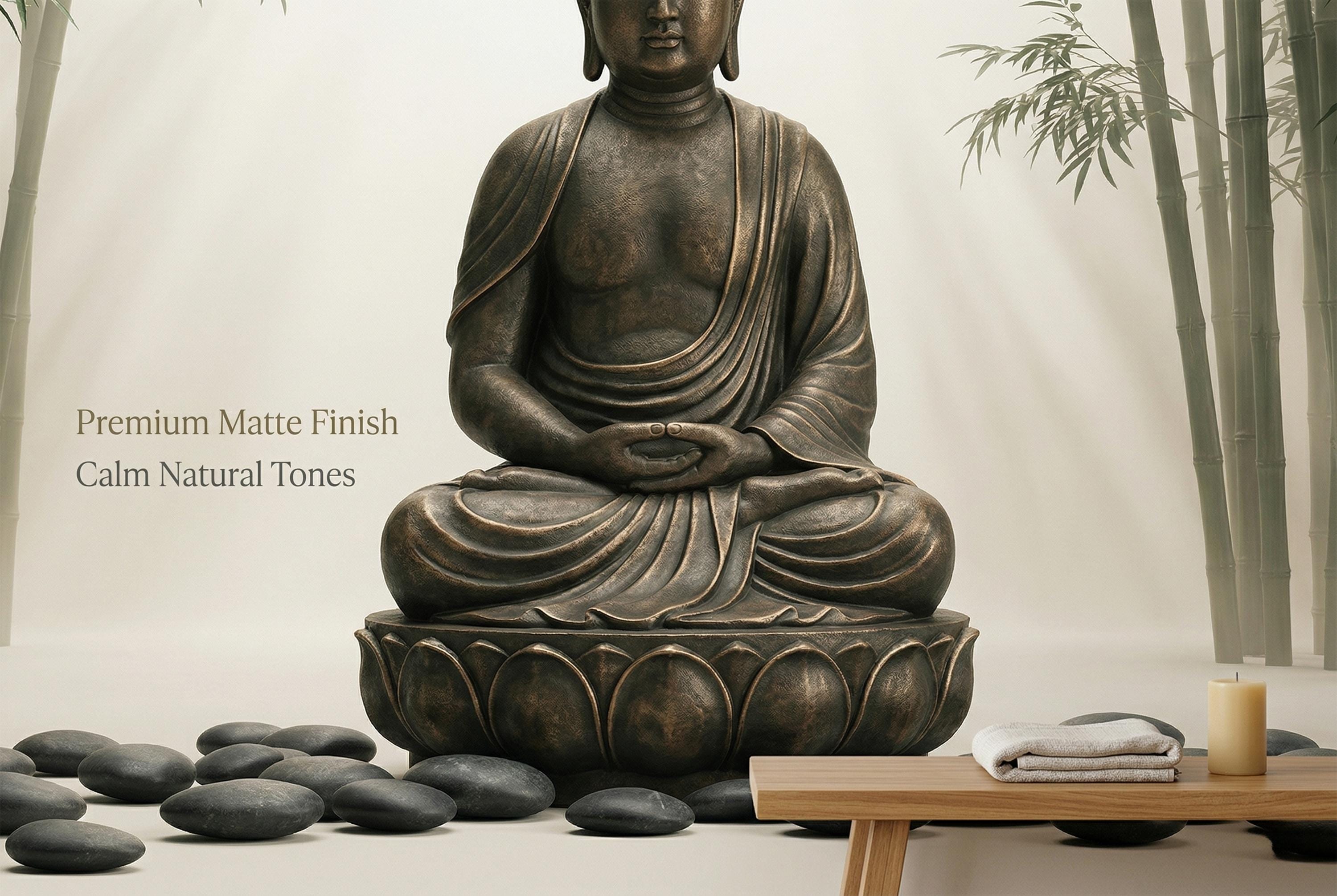 As a zen wallpaper mural it creates a meditative atmosphere with immediate, effortless impact. As a bamboo forest wall mural it brings the calm of a Japanese garden indoors. As a Buddha wall decor feature it works in living rooms, bedrooms, yoga studios, spas, home offices, and hospitality spaces.