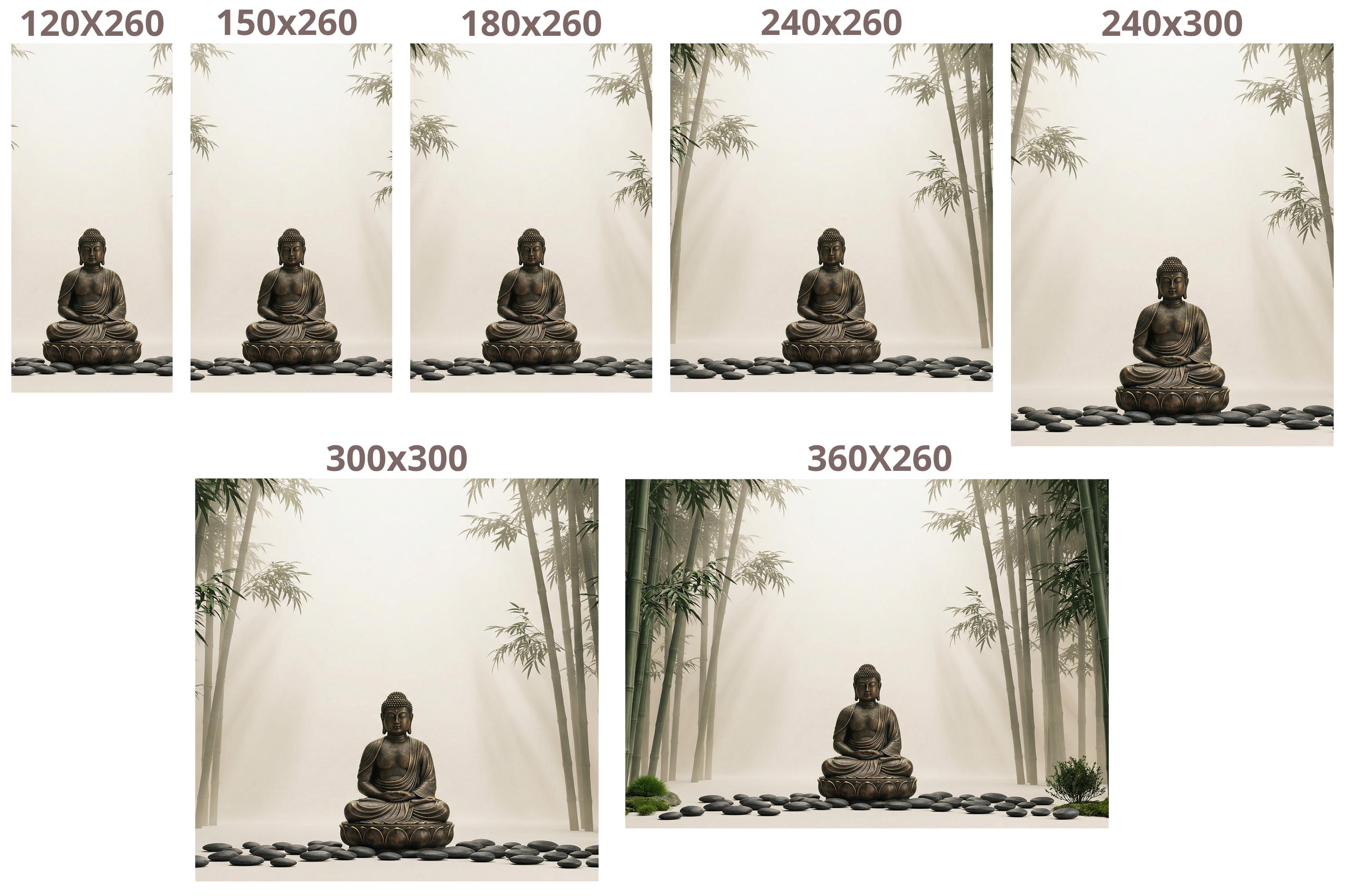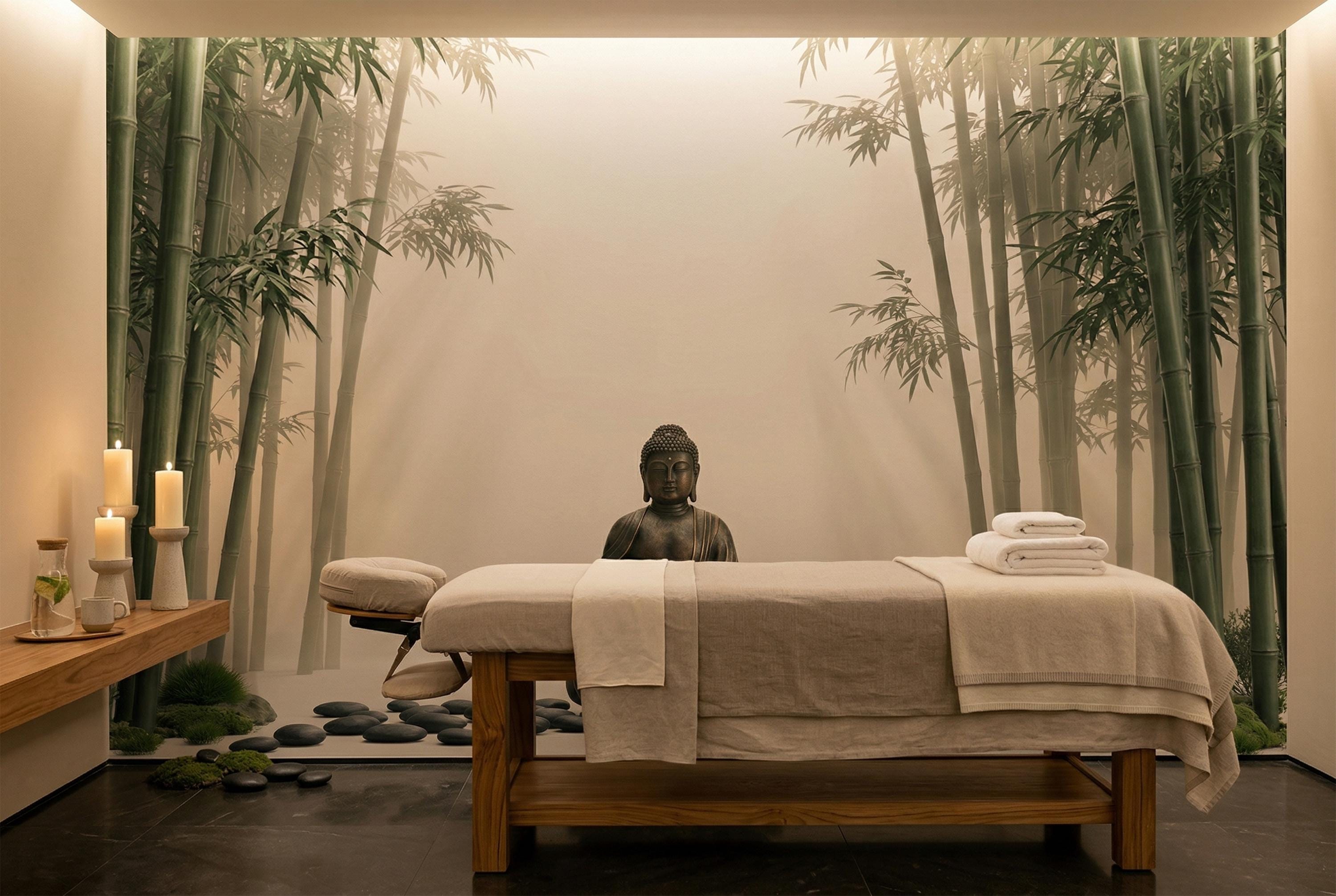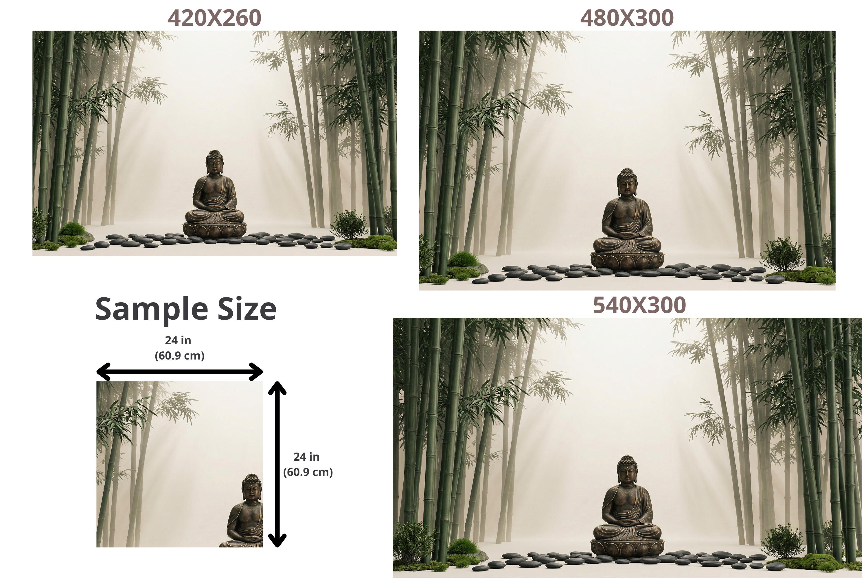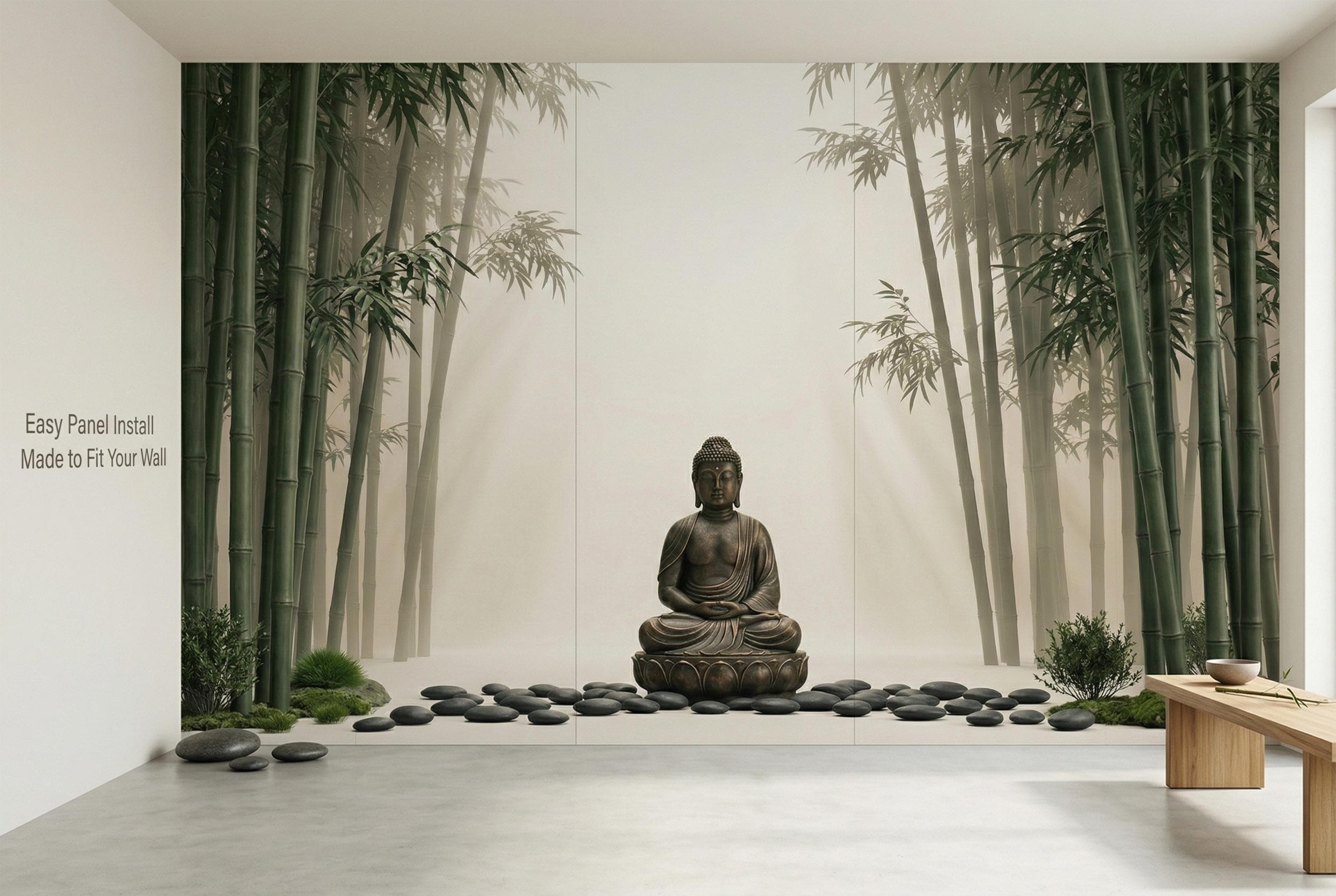 As a zen wallpaper mural it creates a meditative atmosphere with immediate, effortless impact. As a bamboo forest wall mural it brings the calm of a Japanese garden indoors. As a Buddha wall decor feature it works in living rooms, bedrooms, yoga studios, spas, home offices, and hospitality spaces.
